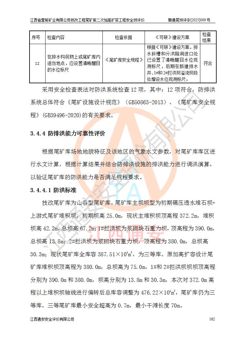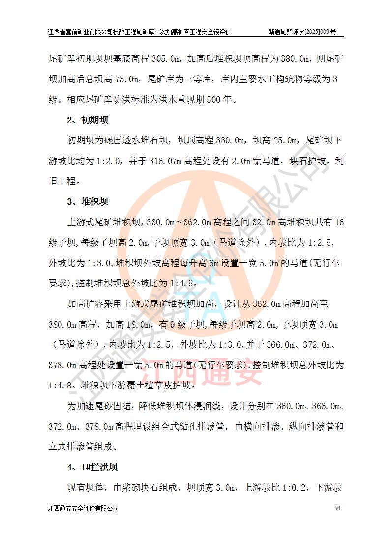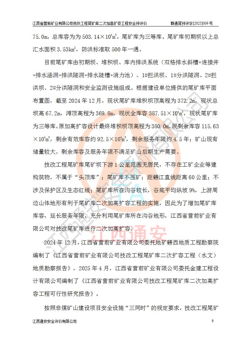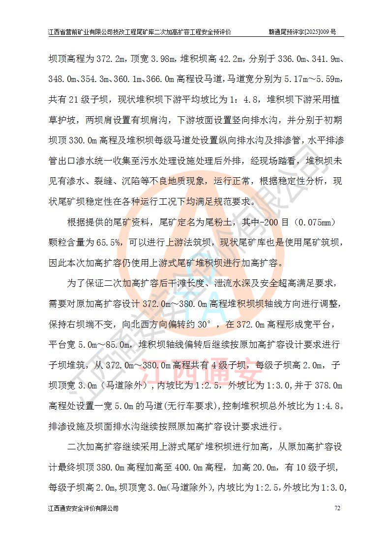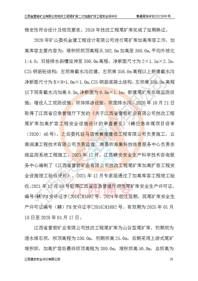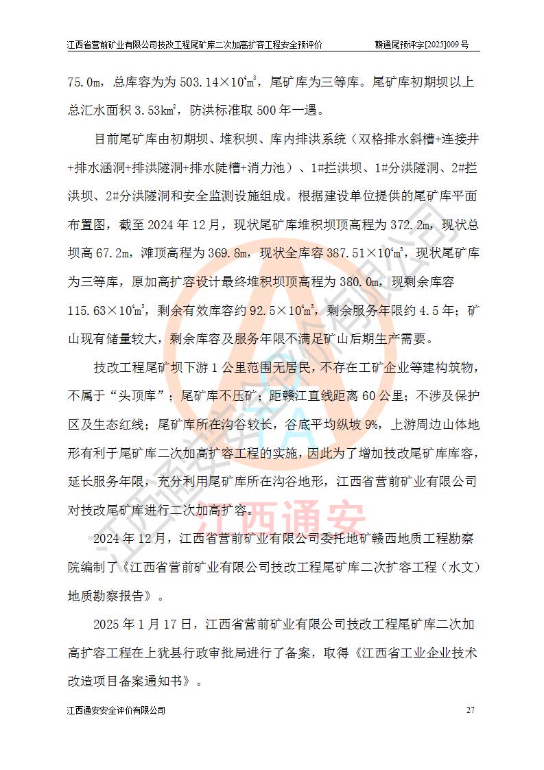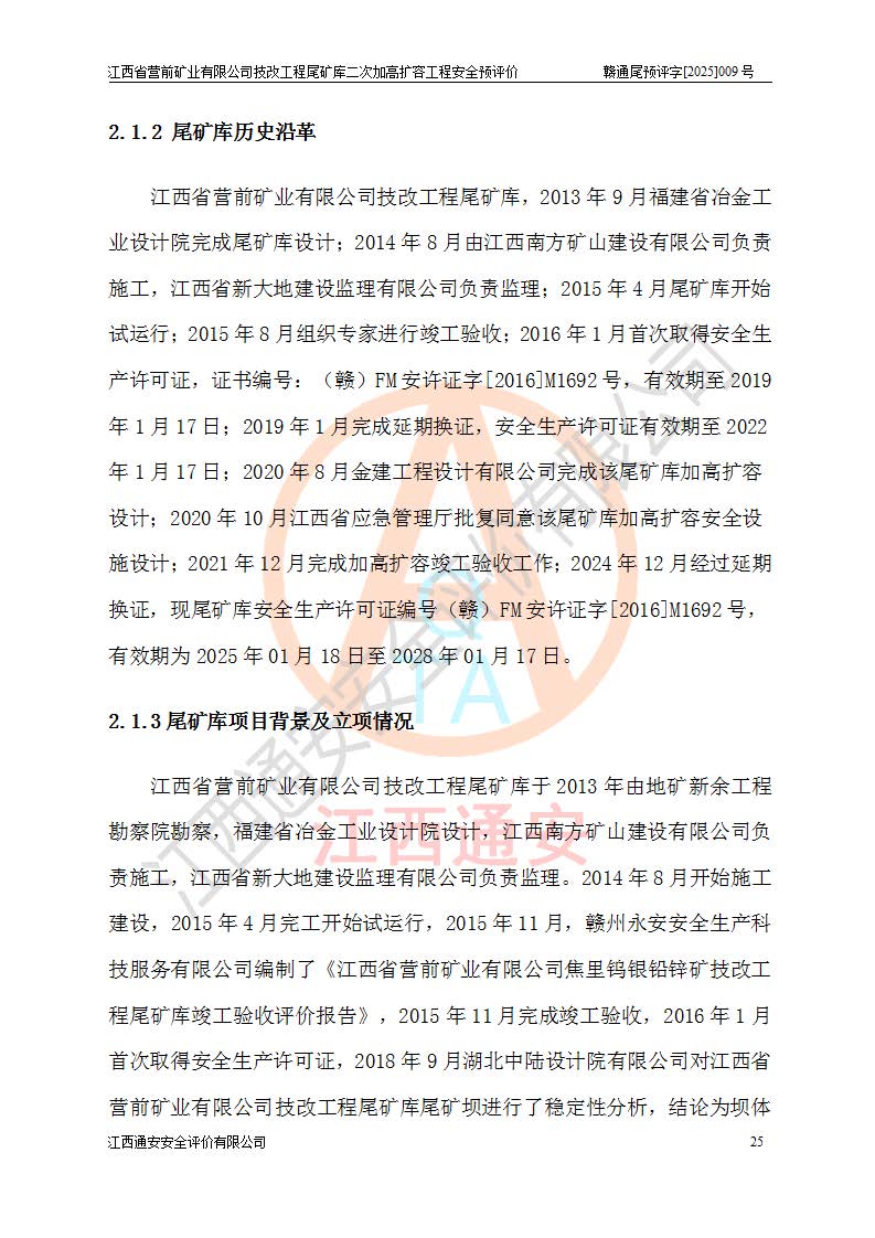 江西省营前矿业有限公司于2003年12月16日成立,位于赣州市上犹县营前镇焦里村境内,公司注册资本10000万元,法定**人陈雅博,矿区地理坐标:东经114°18′30″~114°19′00″,北纬25°52′35″~25°53′47″。公司经营范围包括:铅矿、锌、钨、银地下开采、销售。 江西省营前矿业有限公司技改工程尾矿库位于焦里钨银铅锌矿区,处于上犹县水岩乡井子村坑尾自然村境内,为山谷型尾矿库。 江西省营前矿业有限公司技改工程尾矿库于2013年由福建省冶金工业设计院设计,2014年8月开始施工建设,2015年4月竣工开始试运行,2015年11月完成竣工验收,2016年1月首次取得安全生产许可证,2019年1月完成延期换证,2020年8月委托金建工程设计有限公司进行尾矿库加高扩容工作,2020年10月21日取得了江西省应急管理厅下发的《关于江西省营前矿业有限公司技改工程尾矿库加高扩容工程安全设施设计的审查意见》(赣应急非煤项目设审〔2020〕46号),之后委托驻马店市黄淮建设工程有限公司负责施工,云南润滇工程技术有限公司负责监理,2021年12月完成加高扩容竣工验收工作,经过延期,现尾矿库安全生产许可证编号(赣)FM安许证字[2016]M1692号,**期为2025年01月18日至2028年01月17日。 江西省营前矿业有限公司技改工程尾矿库为山谷型尾矿库,初期坝为透水堆石坝,坝顶高程为330.0m,初期坝高25.0m,后期采用上游式尾矿堆积坝,加高扩容后*终坝顶高程为380.0m,堆积坝高50.0m,总坝高为75.0m,总库容为为503.14×104m3,尾矿库为三等库。尾矿库初期坝以上总汇水面积3.53km2,防洪标准取500年一遇。 目前尾矿库由初期坝、堆积坝、库内排洪系统(双格排水斜槽+连接井+排水涵洞+排洪隧洞+排水陡槽+消力池)、1#拦洪坝、1#分洪隧洞、2#拦洪坝、2#分洪隧洞和安全监测设施组成。根据建设单位提供的尾矿库平面布置图,截至2024年12月,现状尾矿库堆积坝顶高程为372.2m,现状总坝高67.2m,滩顶高程为369.8m,现状全库容387.51×104m3,现状尾矿库为三等库,原加高扩容设计*终堆积坝顶高程为380.0m,现剩余库容115.63×104m3,剩余**库容约92.5×104m3,剩余服务年限约4.5年;矿山现有储量较大,剩余库容及服务年限不满足矿山后期生产需要。 技改工程尾矿库尾矿坝下游1**范围无居民,不存在工矿企业等建构筑物,不属于“头顶库”;尾矿库不压矿;距赣江直线距离60**;不涉及保护区及生态红线;尾矿库所在沟谷较长,谷底平均纵坡9%,上游周边山体地形有利于尾矿库二次加高扩容工程的实施,因此为了增加尾矿库库容,延长服务年限,充分利用尾矿库所在沟谷地形,江西省营前矿业有限公司对技改尾矿库进行二次加高扩容。 2024年12月,江西省营前矿业有限公司委托地矿赣西地质工程勘察院编制了《江西省营前矿业有限公司技改工程尾矿库二次扩容工程(水文)地质勘察报告》,2025年4月,江西省营前矿业有限公司委托金建工程设计有限公司编制了《江西省营前矿业有限公司技改工程尾矿库二次加高扩容工程可行性研究报告》。 按照非煤矿山建设项目安全设施“三同时”的规定要求,技改工程尾矿库为二次加高扩容工程,**进行安全预评价;江西省营前矿业有限公司委托我公司承担技改工程尾矿库二次加高扩容工程建设项目的安全预评价工作。 |