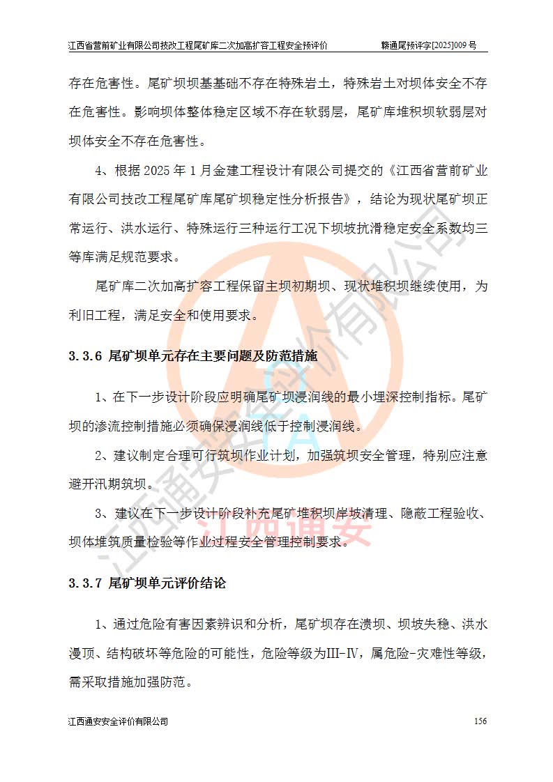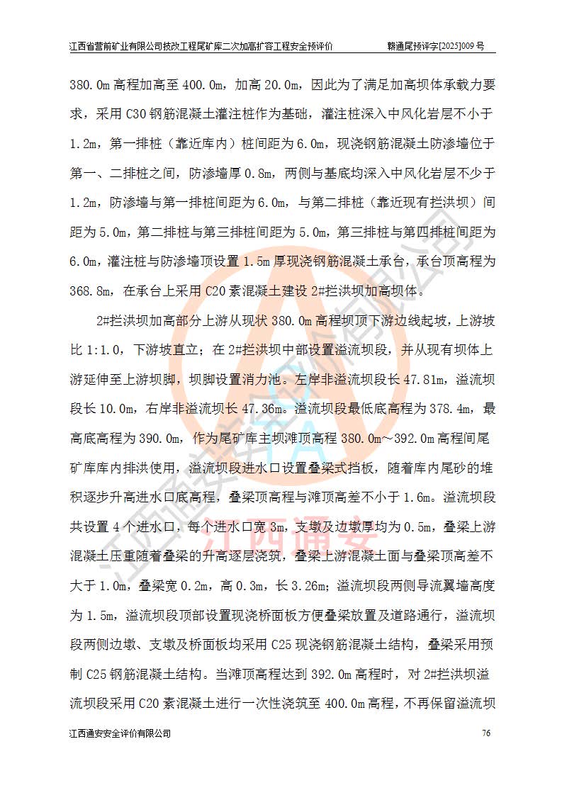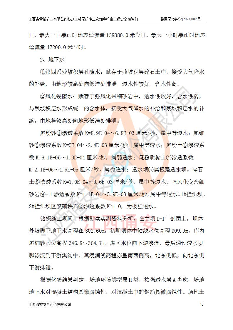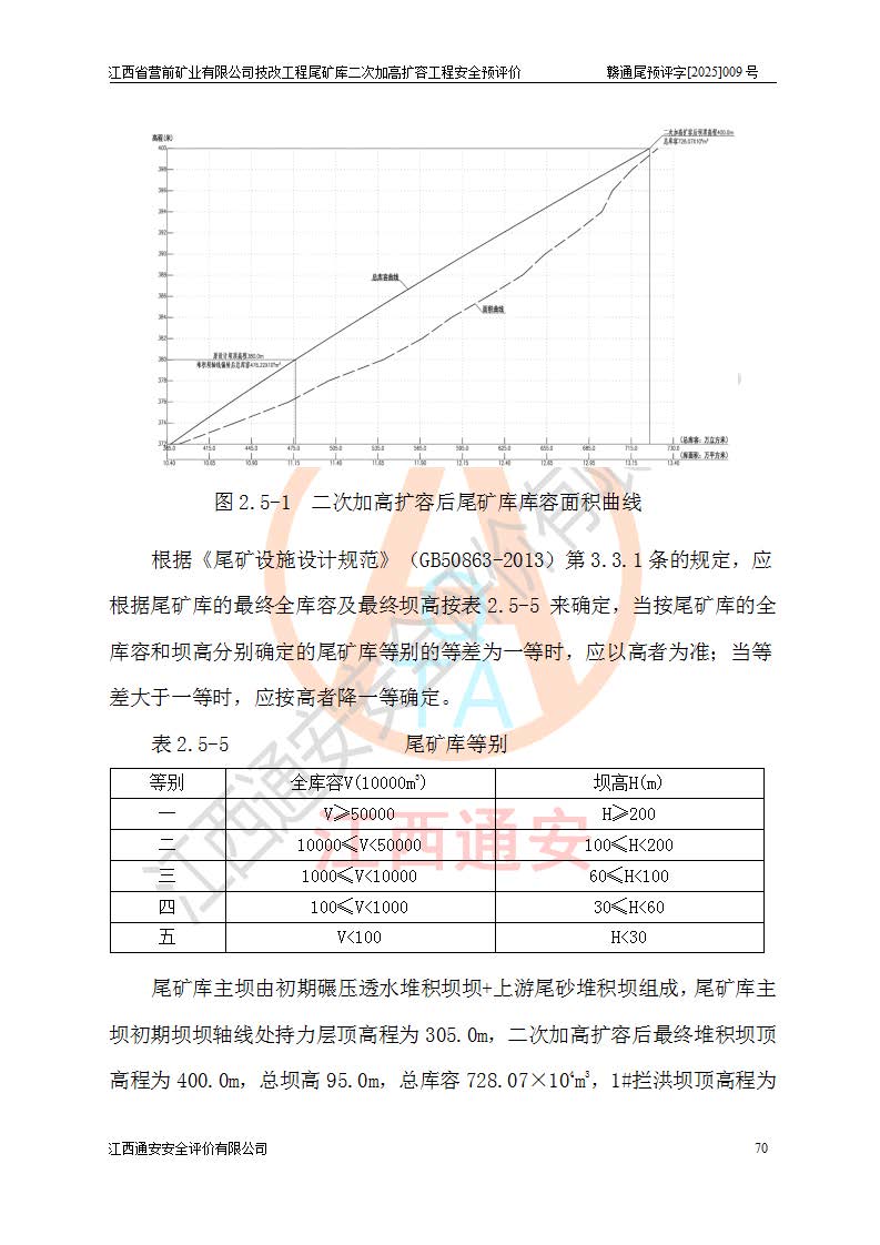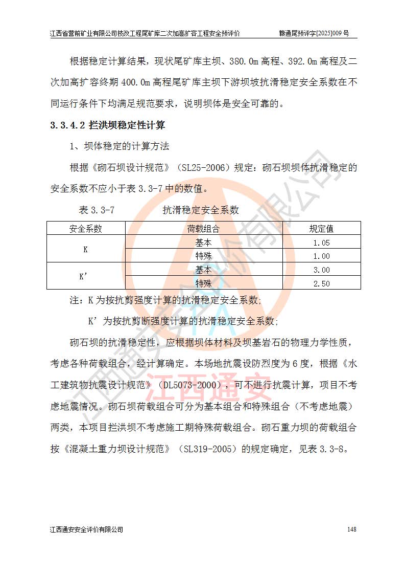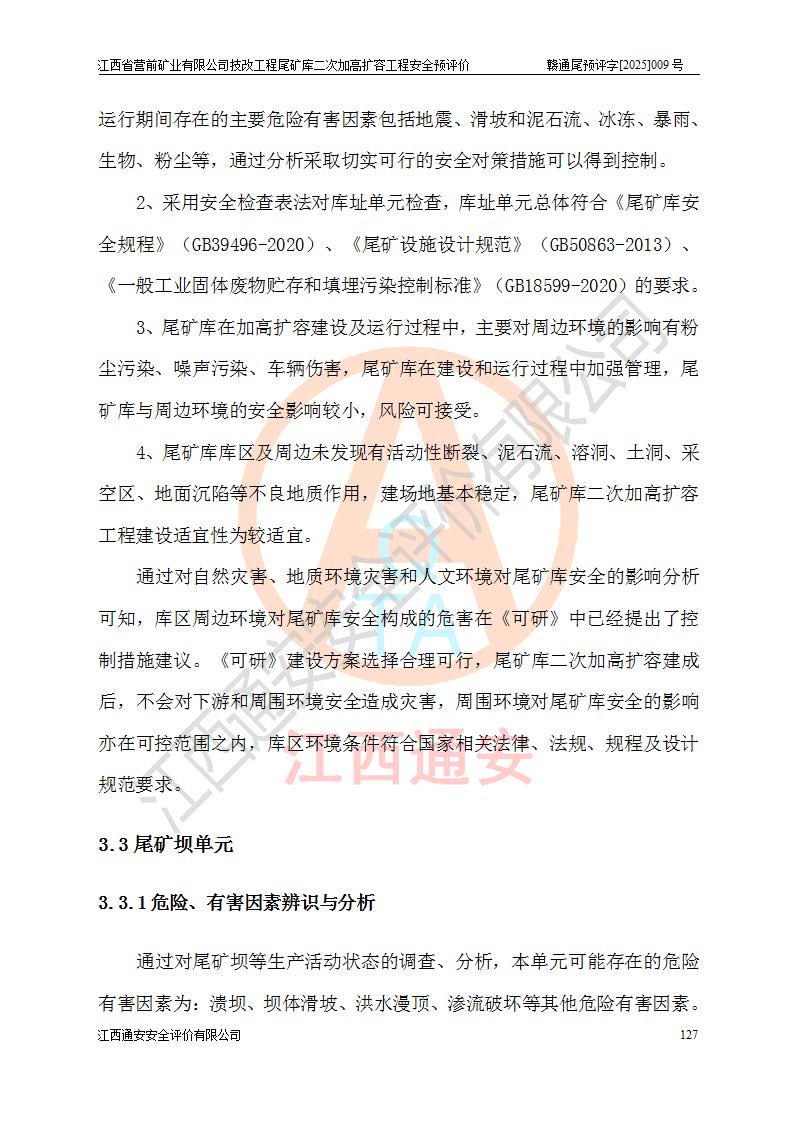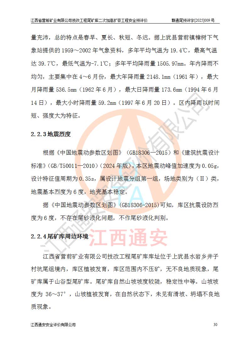 江西省营前矿业有限公司于2003年12月16日成立,位于赣州市上犹县营前镇焦里村境内,公司注册资本10000万元,法定**人陈雅博,矿区地理坐标:东经114°18′30″~114°19′00″,北纬25°52′35″~25°53′47″。公司经营范围包括:铅矿、锌、钨、银地下开采、销售。 江西省营前矿业有限公司技改工程尾矿库位于焦里钨银铅锌矿区,处于上犹县水岩乡井子村坑尾自然村境内,为山谷型尾矿库。 江西省营前矿业有限公司技改工程尾矿库于2013年由福建省冶金工业设计院设计,2014年8月开始施工建设,2015年4月竣工开始试运行,2015年11月完成竣工验收,2016年1月首次取得安全生产许可证,2019年1月完成延期换证,2020年8月委托金建工程设计有限公司进行尾矿库加高扩容工作,2020年10月21日取得了江西省应急管理厅下发的《关于江西省营前矿业有限公司技改工程尾矿库加高扩容工程安全设施设计的审查意见》(赣应急非煤项目设审〔2020〕46号),之后委托驻马店市黄淮建设工程有限公司负责施工,云南润滇工程技术有限公司负责监理,2021年12月完成加高扩容竣工验收工作,经过延期,现尾矿库安全生产许可证编号(赣)FM安许证字[2016]M1692号,**期为2025年01月18日至2028年01月17日。 江西省营前矿业有限公司技改工程尾矿库为山谷型尾矿库,初期坝为透水堆石坝,坝顶高程为330.0m,初期坝高25.0m,后期采用上游式尾矿堆积坝,加高扩容后*终坝顶高程为380.0m,堆积坝高50.0m,总坝高为75.0m,总库容为为503.14×104m3,尾矿库为三等库。尾矿库初期坝以上总汇水面积3.53km2,防洪标准取500年一遇。 目前尾矿库由初期坝、堆积坝、库内排洪系统(双格排水斜槽+连接井+排水涵洞+排洪隧洞+排水陡槽+消力池)、1#拦洪坝、1#分洪隧洞、2#拦洪坝、2#分洪隧洞和安全监测设施组成。根据建设单位提供的尾矿库平面布置图,截至2024年12月,现状尾矿库堆积坝顶高程为372.2m,现状总坝高67.2m,滩顶高程为369.8m,现状全库容387.51×104m3,现状尾矿库为三等库,原加高扩容设计*终堆积坝顶高程为380.0m,现剩余库容115.63×104m3,剩余**库容约92.5×104m3,剩余服务年限约4.5年;矿山现有储量较大,剩余库容及服务年限不满足矿山后期生产需要。 技改工程尾矿库尾矿坝下游1**范围无居民,不存在工矿企业等建构筑物,不属于“头顶库”;尾矿库不压矿;距赣江直线距离60**;不涉及保护区及生态红线;尾矿库所在沟谷较长,谷底平均纵坡9%,上游周边山体地形有利于尾矿库二次加高扩容工程的实施,因此为了增加尾矿库库容,延长服务年限,充分利用尾矿库所在沟谷地形,江西省营前矿业有限公司对技改尾矿库进行二次加高扩容。 2024年12月,江西省营前矿业有限公司委托地矿赣西地质工程勘察院编制了《江西省营前矿业有限公司技改工程尾矿库二次扩容工程(水文)地质勘察报告》,2025年4月,江西省营前矿业有限公司委托金建工程设计有限公司编制了《江西省营前矿业有限公司技改工程尾矿库二次加高扩容工程可行性研究报告》。 按照非煤矿山建设项目安全设施“三同时”的规定要求,技改工程尾矿库为二次加高扩容工程,**进行安全预评价;江西省营前矿业有限公司委托我公司承担技改工程尾矿库二次加高扩容工程建设项目的安全预评价工作。 |