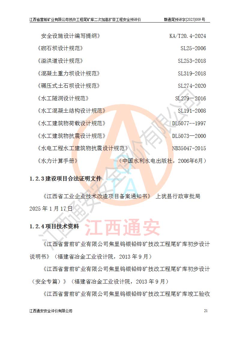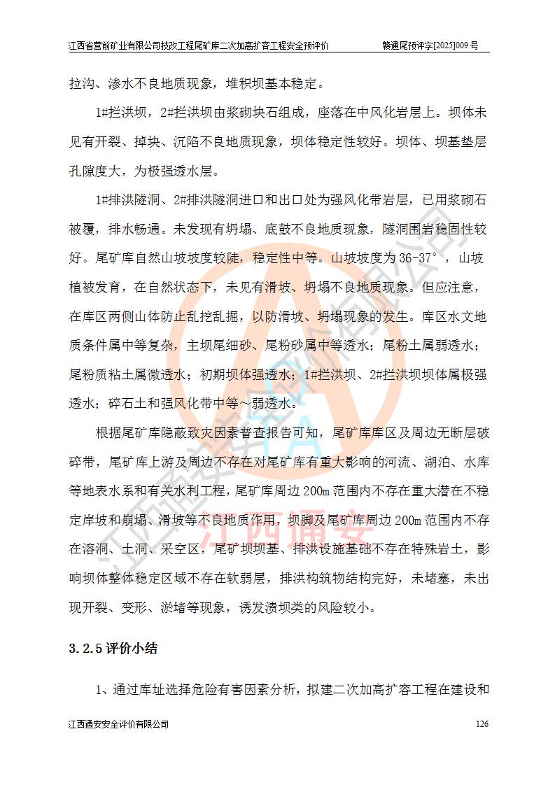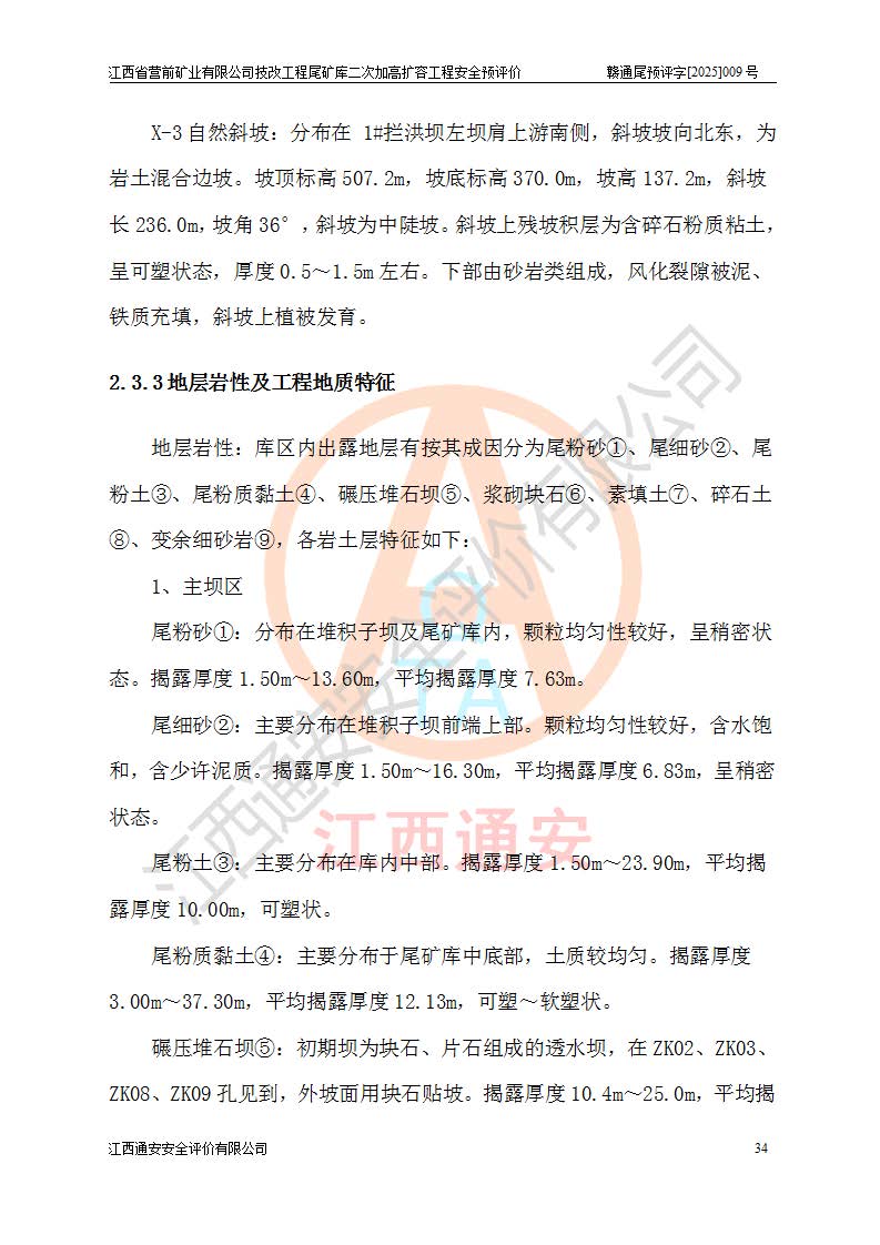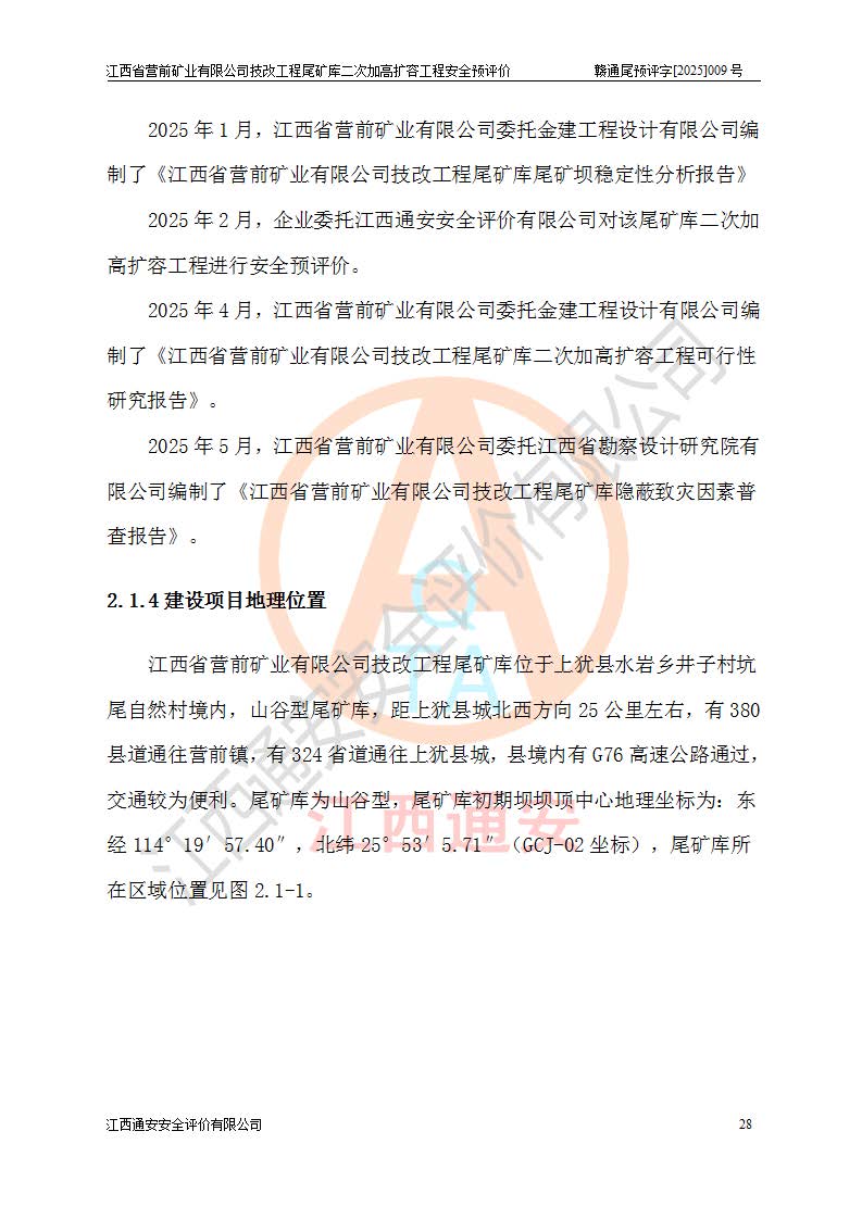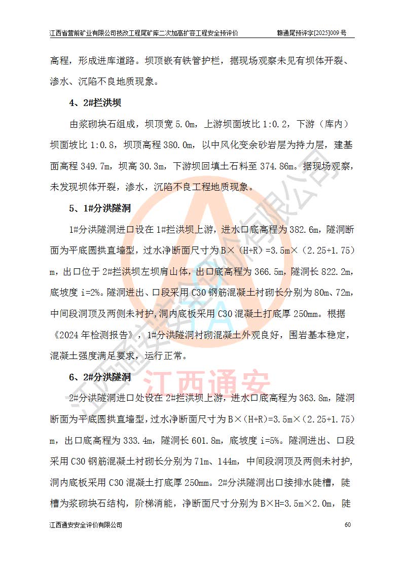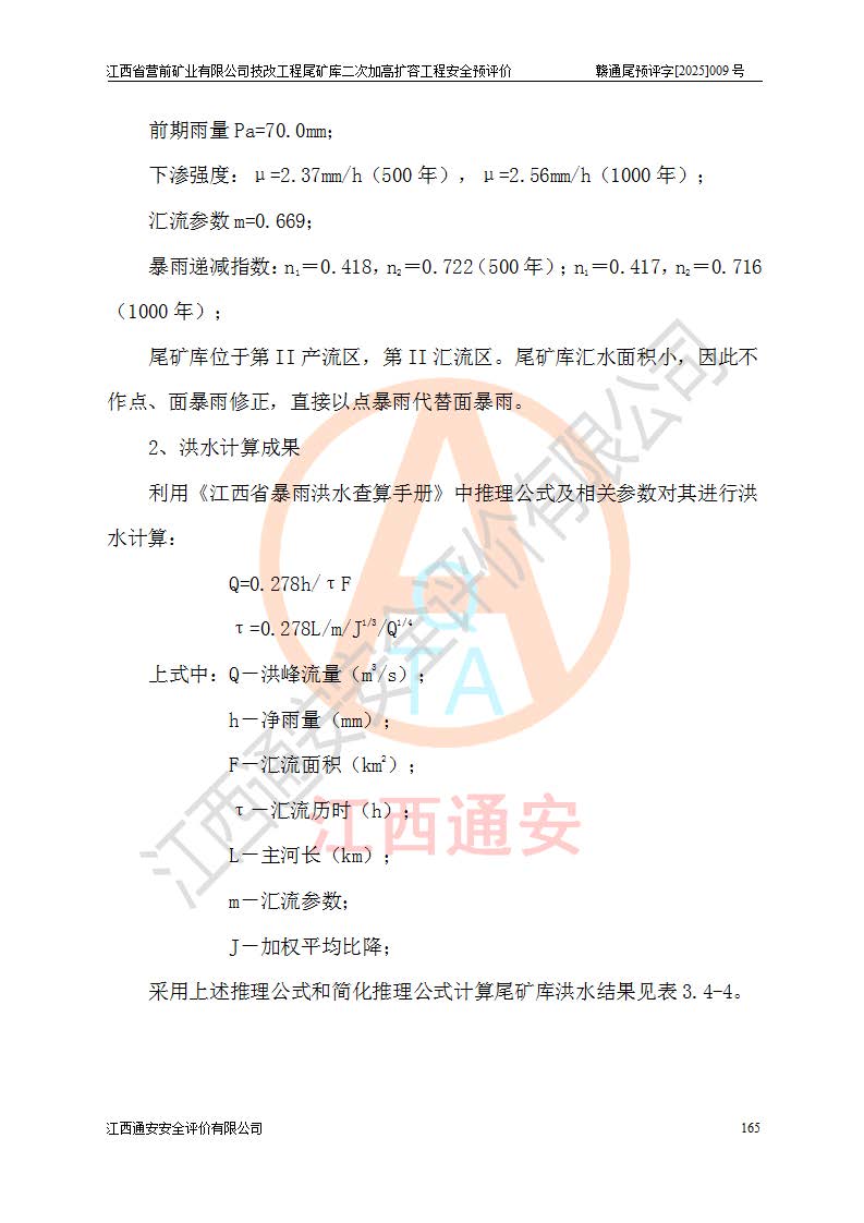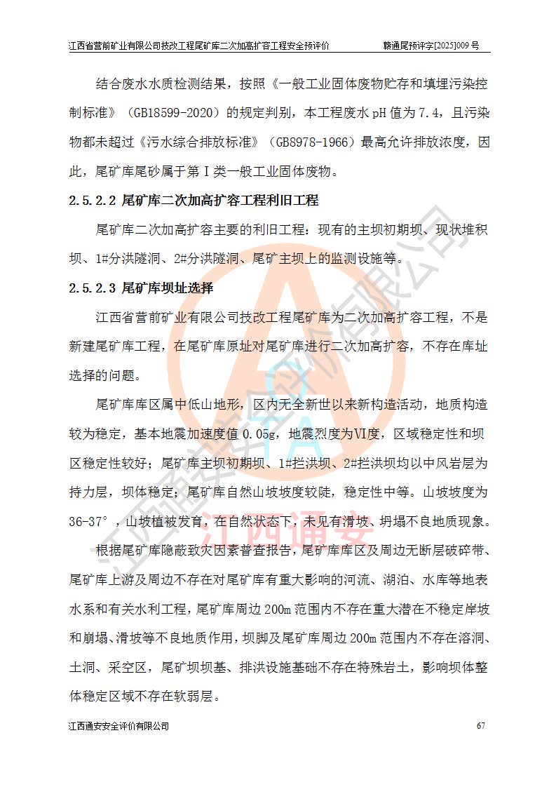 江西省营前矿业有限公司于2003年12月16日成立,位于赣州市上犹县营前镇焦里村境内,公司注册资本10000万元,法定**人陈雅博,矿区地理坐标:东经114°18′30″~114°19′00″,北纬25°52′35″~25°53′47″。公司经营范围包括:铅矿、锌、钨、银地下开采、销售。 江西省营前矿业有限公司技改工程尾矿库位于焦里钨银铅锌矿区,处于上犹县水岩乡井子村坑尾自然村境内,为山谷型尾矿库。 江西省营前矿业有限公司技改工程尾矿库于2013年由福建省冶金工业设计院设计,2014年8月开始施工建设,2015年4月竣工开始试运行,2015年11月完成竣工验收,2016年1月首次取得安全生产许可证,2019年1月完成延期换证,2020年8月委托金建工程设计有限公司进行尾矿库加高扩容工作,2020年10月21日取得了江西省应急管理厅下发的《关于江西省营前矿业有限公司技改工程尾矿库加高扩容工程安全设施设计的审查意见》(赣应急非煤项目设审〔2020〕46号),之后委托驻马店市黄淮建设工程有限公司负责施工,云南润滇工程技术有限公司负责监理,2021年12月完成加高扩容竣工验收工作,经过延期,现尾矿库安全生产许可证编号(赣)FM安许证字[2016]M1692号,**期为2025年01月18日至2028年01月17日。 江西省营前矿业有限公司技改工程尾矿库为山谷型尾矿库,初期坝为透水堆石坝,坝顶高程为330.0m,初期坝高25.0m,后期采用上游式尾矿堆积坝,加高扩容后*终坝顶高程为380.0m,堆积坝高50.0m,总坝高为75.0m,总库容为为503.14×104m3,尾矿库为三等库。尾矿库初期坝以上总汇水面积3.53km2,防洪标准取500年一遇。 目前尾矿库由初期坝、堆积坝、库内排洪系统(双格排水斜槽+连接井+排水涵洞+排洪隧洞+排水陡槽+消力池)、1#拦洪坝、1#分洪隧洞、2#拦洪坝、2#分洪隧洞和安全监测设施组成。根据建设单位提供的尾矿库平面布置图,截至2024年12月,现状尾矿库堆积坝顶高程为372.2m,现状总坝高67.2m,滩顶高程为369.8m,现状全库容387.51×104m3,现状尾矿库为三等库,原加高扩容设计*终堆积坝顶高程为380.0m,现剩余库容115.63×104m3,剩余**库容约92.5×104m3,剩余服务年限约4.5年;矿山现有储量较大,剩余库容及服务年限不满足矿山后期生产需要。 技改工程尾矿库尾矿坝下游1**范围无居民,不存在工矿企业等建构筑物,不属于“头顶库”;尾矿库不压矿;距赣江直线距离60**;不涉及保护区及生态红线;尾矿库所在沟谷较长,谷底平均纵坡9%,上游周边山体地形有利于尾矿库二次加高扩容工程的实施,因此为了增加尾矿库库容,延长服务年限,充分利用尾矿库所在沟谷地形,江西省营前矿业有限公司对技改尾矿库进行二次加高扩容。 2024年12月,江西省营前矿业有限公司委托地矿赣西地质工程勘察院编制了《江西省营前矿业有限公司技改工程尾矿库二次扩容工程(水文)地质勘察报告》,2025年4月,江西省营前矿业有限公司委托金建工程设计有限公司编制了《江西省营前矿业有限公司技改工程尾矿库二次加高扩容工程可行性研究报告》。 按照非煤矿山建设项目安全设施“三同时”的规定要求,技改工程尾矿库为二次加高扩容工程,**进行安全预评价;江西省营前矿业有限公司委托我公司承担技改工程尾矿库二次加高扩容工程建设项目的安全预评价工作。 |