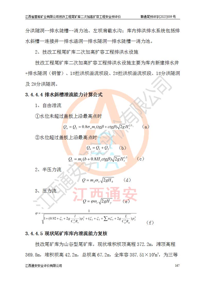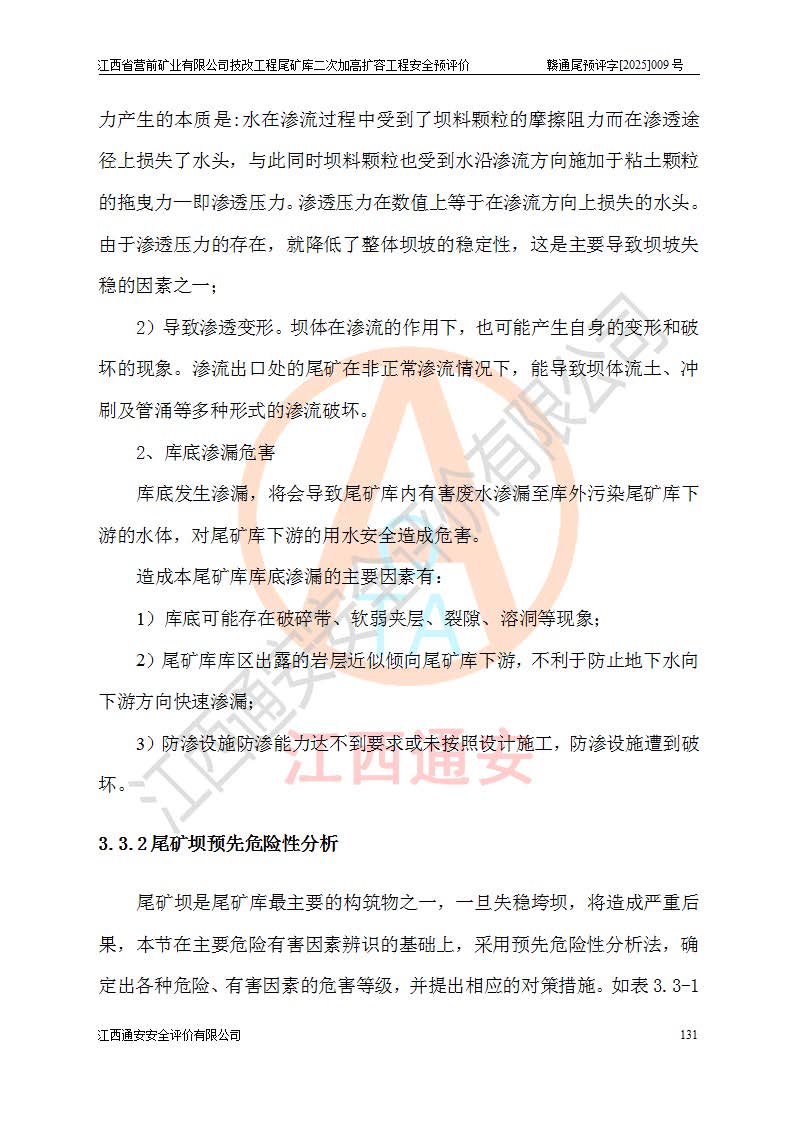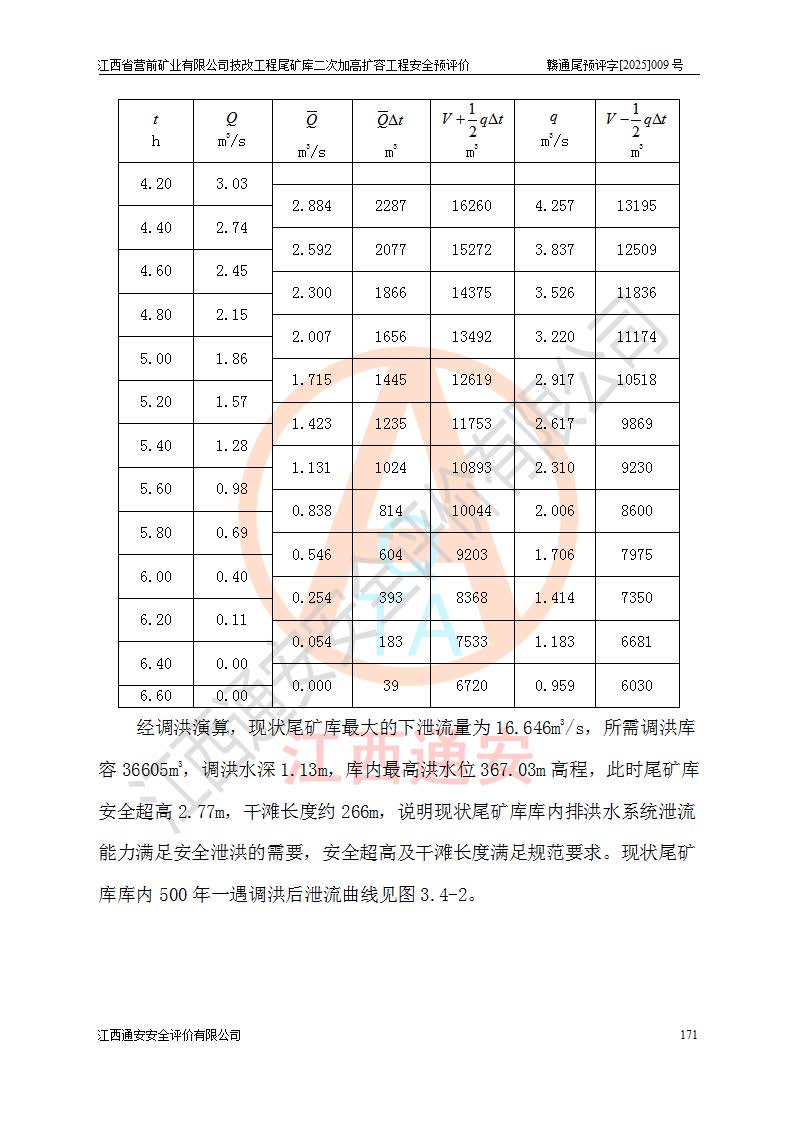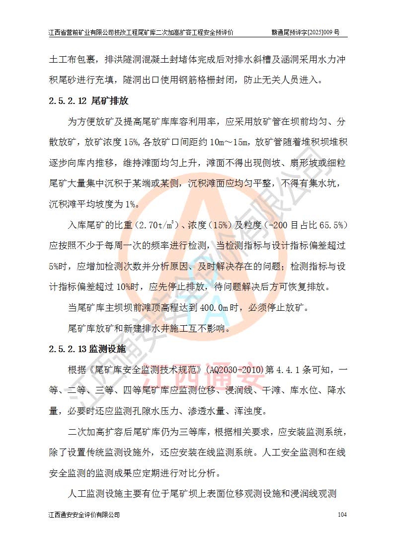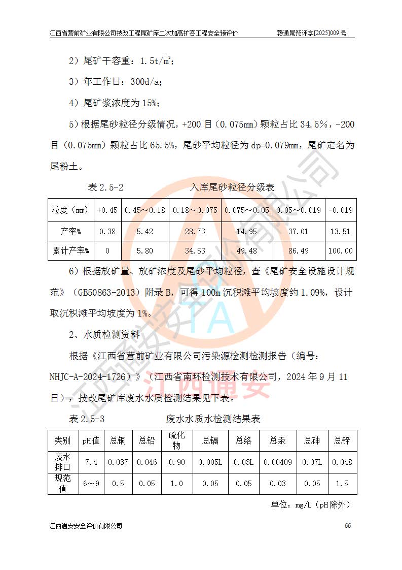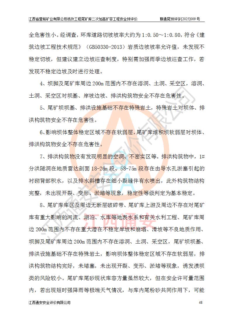 江西省营前矿业有限公司于2003年12月16日成立,位于赣州市上犹县营前镇焦里村境内,公司注册资本10000万元,法定**人陈雅博,矿区地理坐标:东经114°18′30″~114°19′00″,北纬25°52′35″~25°53′47″。公司经营范围包括:铅矿、锌、钨、银地下开采、销售。 江西省营前矿业有限公司技改工程尾矿库位于焦里钨银铅锌矿区,处于上犹县水岩乡井子村坑尾自然村境内,为山谷型尾矿库。 江西省营前矿业有限公司技改工程尾矿库于2013年由福建省冶金工业设计院设计,2014年8月开始施工建设,2015年4月竣工开始试运行,2015年11月完成竣工验收,2016年1月首次取得安全生产许可证,2019年1月完成延期换证,2020年8月委托金建工程设计有限公司进行尾矿库加高扩容工作,2020年10月21日取得了江西省应急管理厅下发的《关于江西省营前矿业有限公司技改工程尾矿库加高扩容工程安全设施设计的审查意见》(赣应急非煤项目设审〔2020〕46号),之后委托驻马店市黄淮建设工程有限公司负责施工,云南润滇工程技术有限公司负责监理,2021年12月完成加高扩容竣工验收工作,经过延期,现尾矿库安全生产许可证编号(赣)FM安许证字[2016]M1692号,**期为2025年01月18日至2028年01月17日。 江西省营前矿业有限公司技改工程尾矿库为山谷型尾矿库,初期坝为透水堆石坝,坝顶高程为330.0m,初期坝高25.0m,后期采用上游式尾矿堆积坝,加高扩容后*终坝顶高程为380.0m,堆积坝高50.0m,总坝高为75.0m,总库容为为503.14×104m3,尾矿库为三等库。尾矿库初期坝以上总汇水面积3.53km2,防洪标准取500年一遇。 目前尾矿库由初期坝、堆积坝、库内排洪系统(双格排水斜槽+连接井+排水涵洞+排洪隧洞+排水陡槽+消力池)、1#拦洪坝、1#分洪隧洞、2#拦洪坝、2#分洪隧洞和安全监测设施组成。根据建设单位提供的尾矿库平面布置图,截至2024年12月,现状尾矿库堆积坝顶高程为372.2m,现状总坝高67.2m,滩顶高程为369.8m,现状全库容387.51×104m3,现状尾矿库为三等库,原加高扩容设计*终堆积坝顶高程为380.0m,现剩余库容115.63×104m3,剩余**库容约92.5×104m3,剩余服务年限约4.5年;矿山现有储量较大,剩余库容及服务年限不满足矿山后期生产需要。 技改工程尾矿库尾矿坝下游1**范围无居民,不存在工矿企业等建构筑物,不属于“头顶库”;尾矿库不压矿;距赣江直线距离60**;不涉及保护区及生态红线;尾矿库所在沟谷较长,谷底平均纵坡9%,上游周边山体地形有利于尾矿库二次加高扩容工程的实施,因此为了增加尾矿库库容,延长服务年限,充分利用尾矿库所在沟谷地形,江西省营前矿业有限公司对技改尾矿库进行二次加高扩容。 2024年12月,江西省营前矿业有限公司委托地矿赣西地质工程勘察院编制了《江西省营前矿业有限公司技改工程尾矿库二次扩容工程(水文)地质勘察报告》,2025年4月,江西省营前矿业有限公司委托金建工程设计有限公司编制了《江西省营前矿业有限公司技改工程尾矿库二次加高扩容工程可行性研究报告》。 按照非煤矿山建设项目安全设施“三同时”的规定要求,技改工程尾矿库为二次加高扩容工程,**进行安全预评价;江西省营前矿业有限公司委托我公司承担技改工程尾矿库二次加高扩容工程建设项目的安全预评价工作。 |