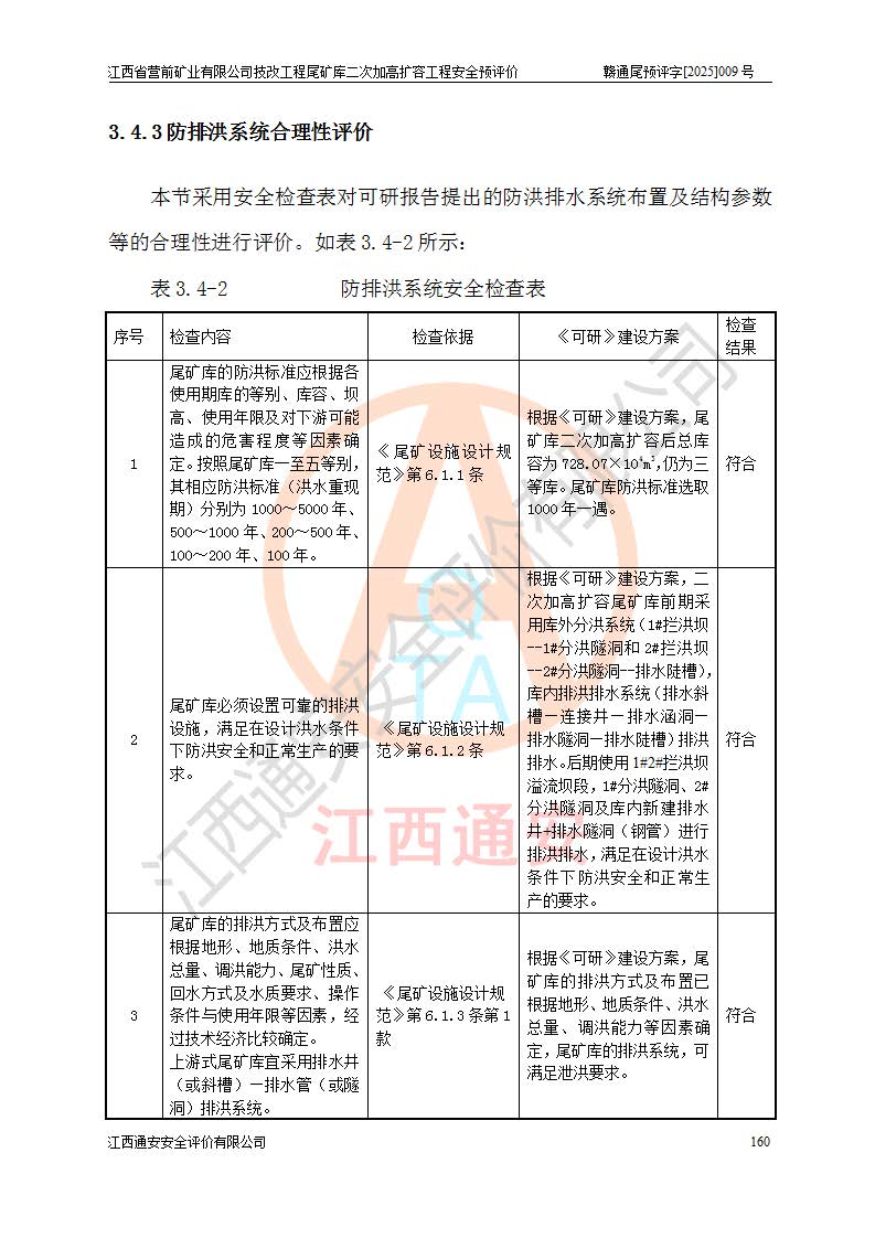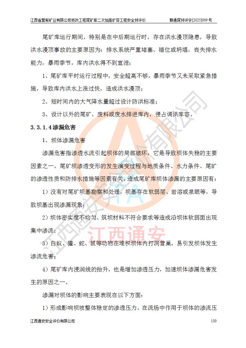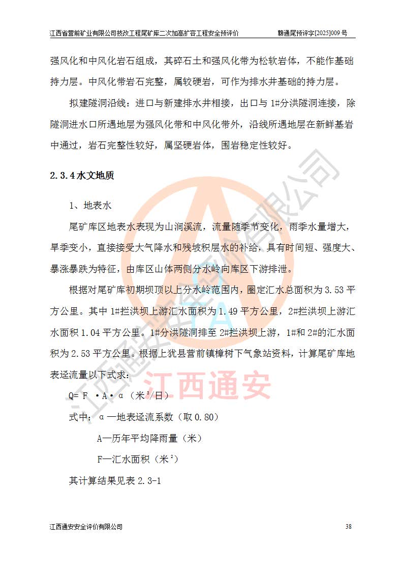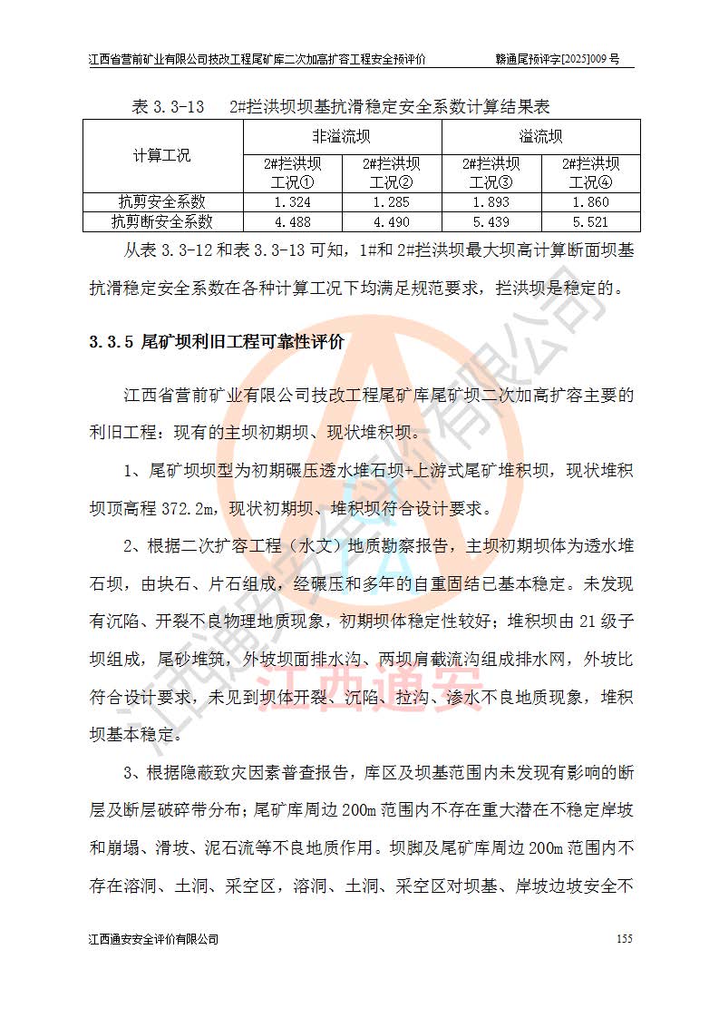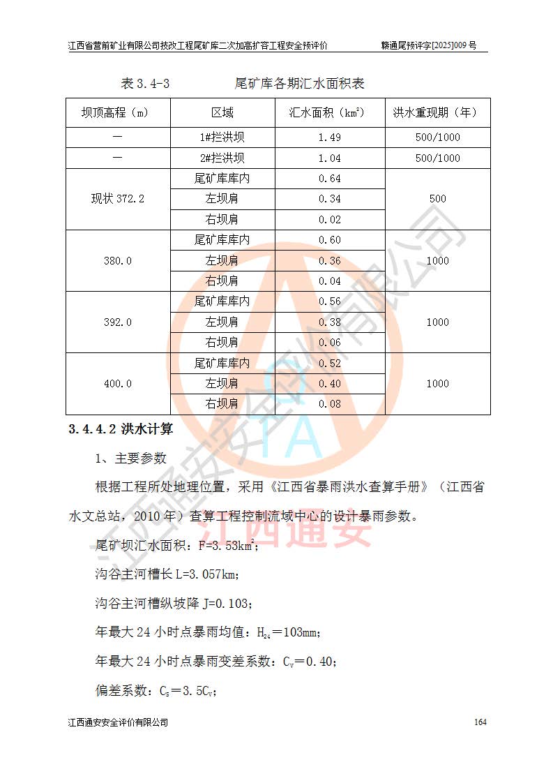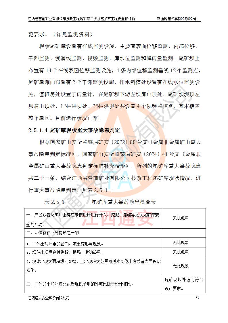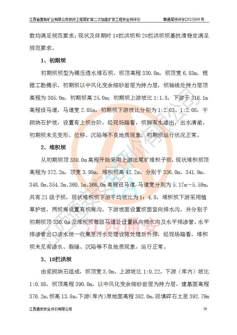 江西省营前矿业有限公司于2003年12月16日成立,位于赣州市上犹县营前镇焦里村境内,公司注册资本10000万元,法定**人陈雅博,矿区地理坐标:东经114°18′30″~114°19′00″,北纬25°52′35″~25°53′47″。公司经营范围包括:铅矿、锌、钨、银地下开采、销售。 江西省营前矿业有限公司技改工程尾矿库位于焦里钨银铅锌矿区,处于上犹县水岩乡井子村坑尾自然村境内,为山谷型尾矿库。 江西省营前矿业有限公司技改工程尾矿库于2013年由福建省冶金工业设计院设计,2014年8月开始施工建设,2015年4月竣工开始试运行,2015年11月完成竣工验收,2016年1月首次取得安全生产许可证,2019年1月完成延期换证,2020年8月委托金建工程设计有限公司进行尾矿库加高扩容工作,2020年10月21日取得了江西省应急管理厅下发的《关于江西省营前矿业有限公司技改工程尾矿库加高扩容工程安全设施设计的审查意见》(赣应急非煤项目设审〔2020〕46号),之后委托驻马店市黄淮建设工程有限公司负责施工,云南润滇工程技术有限公司负责监理,2021年12月完成加高扩容竣工验收工作,经过延期,现尾矿库安全生产许可证编号(赣)FM安许证字[2016]M1692号,**期为2025年01月18日至2028年01月17日。 江西省营前矿业有限公司技改工程尾矿库为山谷型尾矿库,初期坝为透水堆石坝,坝顶高程为330.0m,初期坝高25.0m,后期采用上游式尾矿堆积坝,加高扩容后*终坝顶高程为380.0m,堆积坝高50.0m,总坝高为75.0m,总库容为为503.14×104m3,尾矿库为三等库。尾矿库初期坝以上总汇水面积3.53km2,防洪标准取500年一遇。 目前尾矿库由初期坝、堆积坝、库内排洪系统(双格排水斜槽+连接井+排水涵洞+排洪隧洞+排水陡槽+消力池)、1#拦洪坝、1#分洪隧洞、2#拦洪坝、2#分洪隧洞和安全监测设施组成。根据建设单位提供的尾矿库平面布置图,截至2024年12月,现状尾矿库堆积坝顶高程为372.2m,现状总坝高67.2m,滩顶高程为369.8m,现状全库容387.51×104m3,现状尾矿库为三等库,原加高扩容设计*终堆积坝顶高程为380.0m,现剩余库容115.63×104m3,剩余**库容约92.5×104m3,剩余服务年限约4.5年;矿山现有储量较大,剩余库容及服务年限不满足矿山后期生产需要。 技改工程尾矿库尾矿坝下游1**范围无居民,不存在工矿企业等建构筑物,不属于“头顶库”;尾矿库不压矿;距赣江直线距离60**;不涉及保护区及生态红线;尾矿库所在沟谷较长,谷底平均纵坡9%,上游周边山体地形有利于尾矿库二次加高扩容工程的实施,因此为了增加尾矿库库容,延长服务年限,充分利用尾矿库所在沟谷地形,江西省营前矿业有限公司对技改尾矿库进行二次加高扩容。 2024年12月,江西省营前矿业有限公司委托地矿赣西地质工程勘察院编制了《江西省营前矿业有限公司技改工程尾矿库二次扩容工程(水文)地质勘察报告》,2025年4月,江西省营前矿业有限公司委托金建工程设计有限公司编制了《江西省营前矿业有限公司技改工程尾矿库二次加高扩容工程可行性研究报告》。 按照非煤矿山建设项目安全设施“三同时”的规定要求,技改工程尾矿库为二次加高扩容工程,**进行安全预评价;江西省营前矿业有限公司委托我公司承担技改工程尾矿库二次加高扩容工程建设项目的安全预评价工作。 |