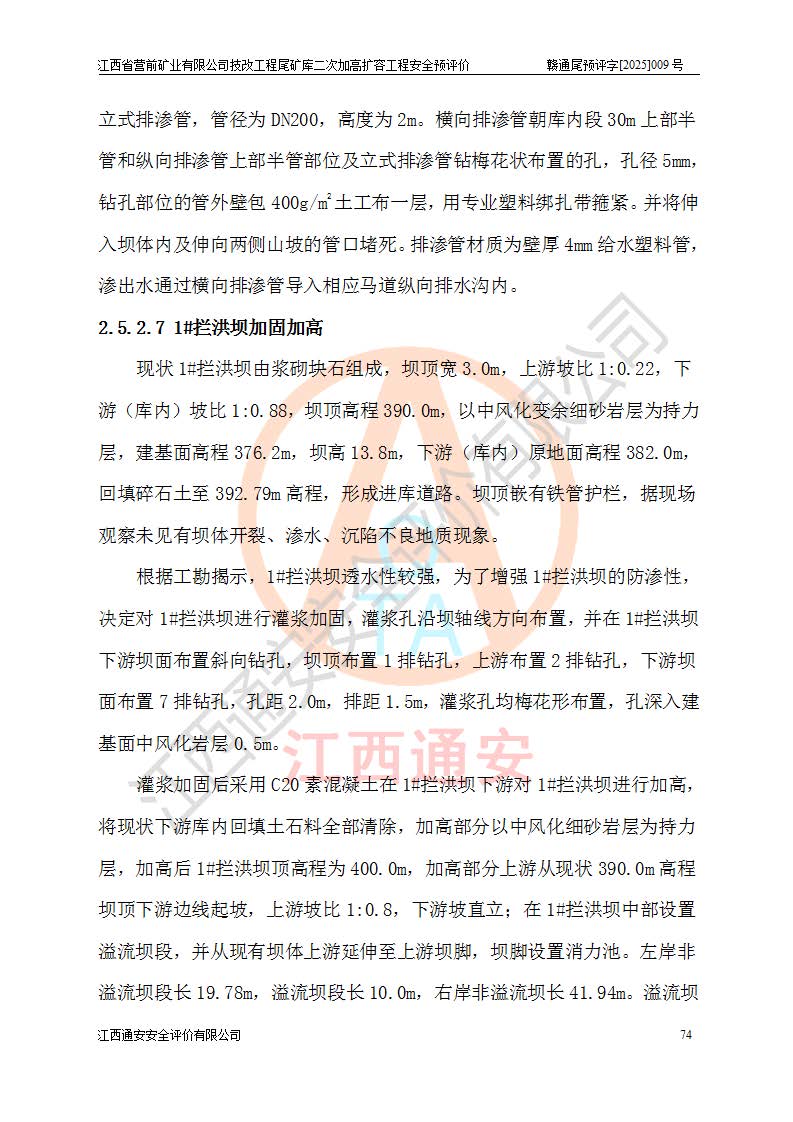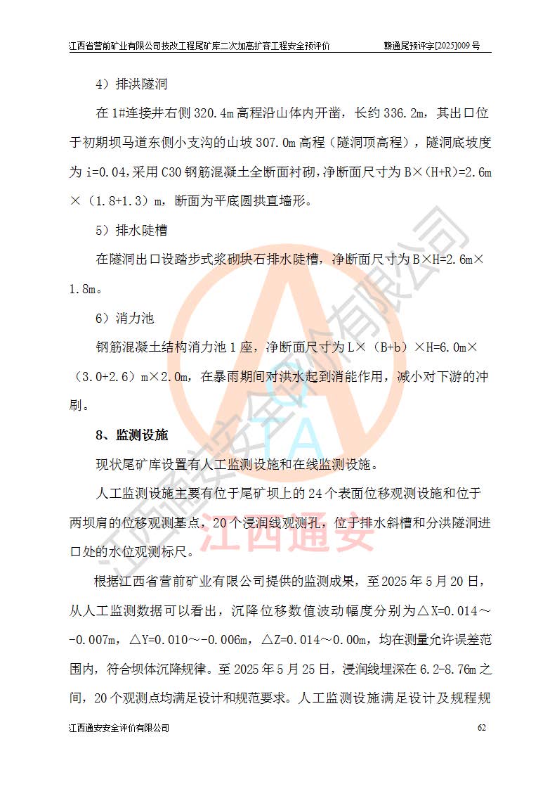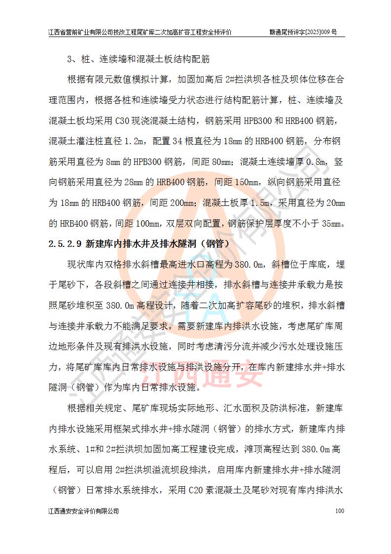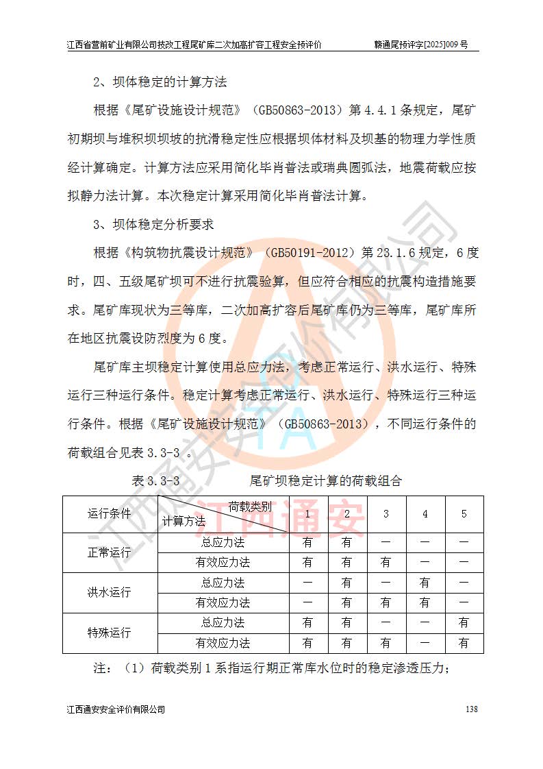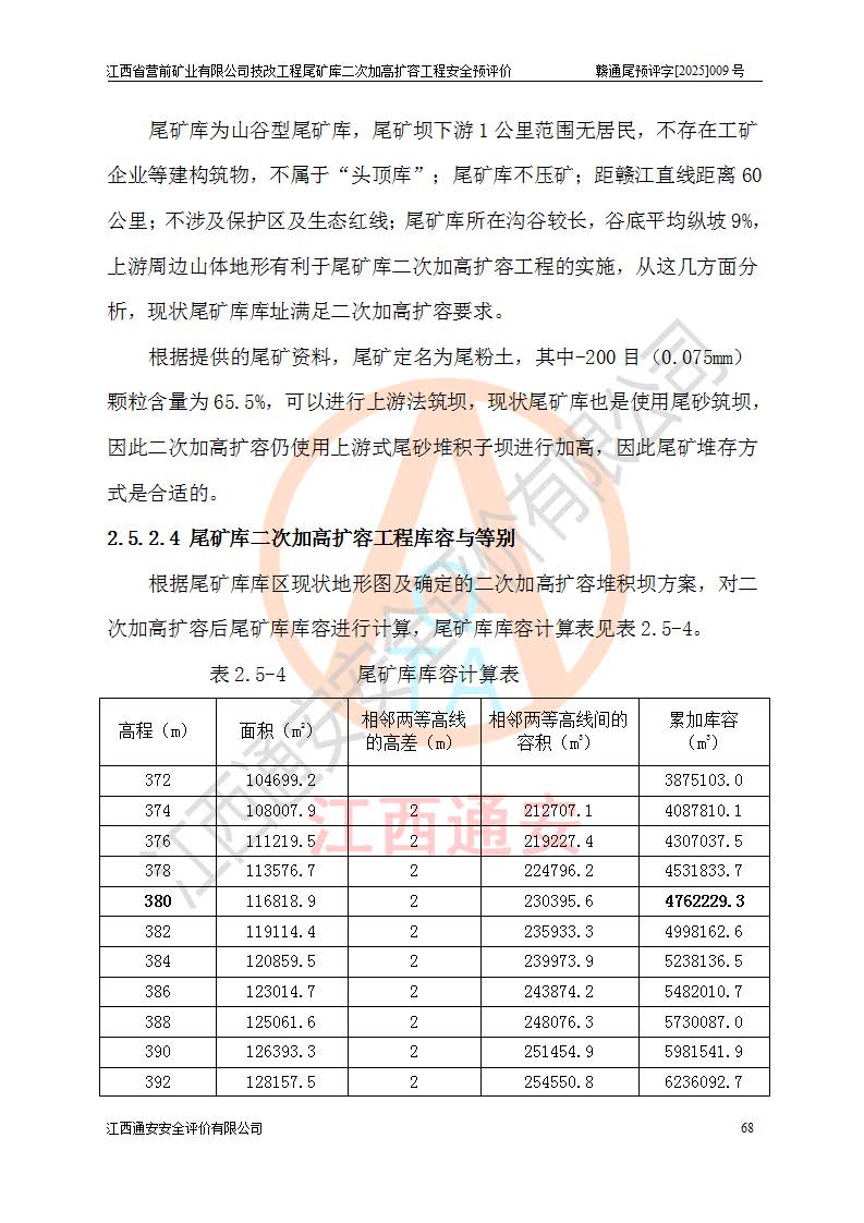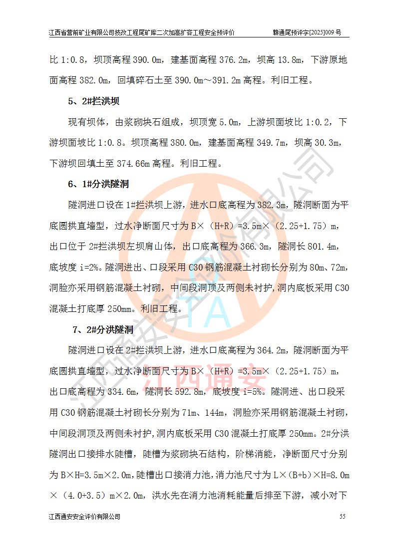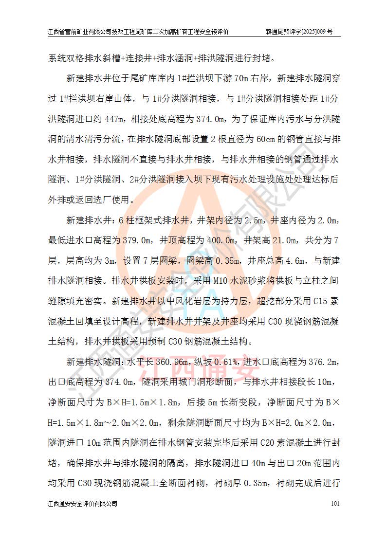 江西省营前矿业有限公司于2003年12月16日成立,位于赣州市上犹县营前镇焦里村境内,公司注册资本10000万元,法定**人陈雅博,矿区地理坐标:东经114°18′30″~114°19′00″,北纬25°52′35″~25°53′47″。公司经营范围包括:铅矿、锌、钨、银地下开采、销售。 江西省营前矿业有限公司技改工程尾矿库位于焦里钨银铅锌矿区,处于上犹县水岩乡井子村坑尾自然村境内,为山谷型尾矿库。 江西省营前矿业有限公司技改工程尾矿库于2013年由福建省冶金工业设计院设计,2014年8月开始施工建设,2015年4月竣工开始试运行,2015年11月完成竣工验收,2016年1月首次取得安全生产许可证,2019年1月完成延期换证,2020年8月委托金建工程设计有限公司进行尾矿库加高扩容工作,2020年10月21日取得了江西省应急管理厅下发的《关于江西省营前矿业有限公司技改工程尾矿库加高扩容工程安全设施设计的审查意见》(赣应急非煤项目设审〔2020〕46号),之后委托驻马店市黄淮建设工程有限公司负责施工,云南润滇工程技术有限公司负责监理,2021年12月完成加高扩容竣工验收工作,经过延期,现尾矿库安全生产许可证编号(赣)FM安许证字[2016]M1692号,**期为2025年01月18日至2028年01月17日。 江西省营前矿业有限公司技改工程尾矿库为山谷型尾矿库,初期坝为透水堆石坝,坝顶高程为330.0m,初期坝高25.0m,后期采用上游式尾矿堆积坝,加高扩容后*终坝顶高程为380.0m,堆积坝高50.0m,总坝高为75.0m,总库容为为503.14×104m3,尾矿库为三等库。尾矿库初期坝以上总汇水面积3.53km2,防洪标准取500年一遇。 目前尾矿库由初期坝、堆积坝、库内排洪系统(双格排水斜槽+连接井+排水涵洞+排洪隧洞+排水陡槽+消力池)、1#拦洪坝、1#分洪隧洞、2#拦洪坝、2#分洪隧洞和安全监测设施组成。根据建设单位提供的尾矿库平面布置图,截至2024年12月,现状尾矿库堆积坝顶高程为372.2m,现状总坝高67.2m,滩顶高程为369.8m,现状全库容387.51×104m3,现状尾矿库为三等库,原加高扩容设计*终堆积坝顶高程为380.0m,现剩余库容115.63×104m3,剩余**库容约92.5×104m3,剩余服务年限约4.5年;矿山现有储量较大,剩余库容及服务年限不满足矿山后期生产需要。 技改工程尾矿库尾矿坝下游1**范围无居民,不存在工矿企业等建构筑物,不属于“头顶库”;尾矿库不压矿;距赣江直线距离60**;不涉及保护区及生态红线;尾矿库所在沟谷较长,谷底平均纵坡9%,上游周边山体地形有利于尾矿库二次加高扩容工程的实施,因此为了增加尾矿库库容,延长服务年限,充分利用尾矿库所在沟谷地形,江西省营前矿业有限公司对技改尾矿库进行二次加高扩容。 2024年12月,江西省营前矿业有限公司委托地矿赣西地质工程勘察院编制了《江西省营前矿业有限公司技改工程尾矿库二次扩容工程(水文)地质勘察报告》,2025年4月,江西省营前矿业有限公司委托金建工程设计有限公司编制了《江西省营前矿业有限公司技改工程尾矿库二次加高扩容工程可行性研究报告》。 按照非煤矿山建设项目安全设施“三同时”的规定要求,技改工程尾矿库为二次加高扩容工程,**进行安全预评价;江西省营前矿业有限公司委托我公司承担技改工程尾矿库二次加高扩容工程建设项目的安全预评价工作。 |
