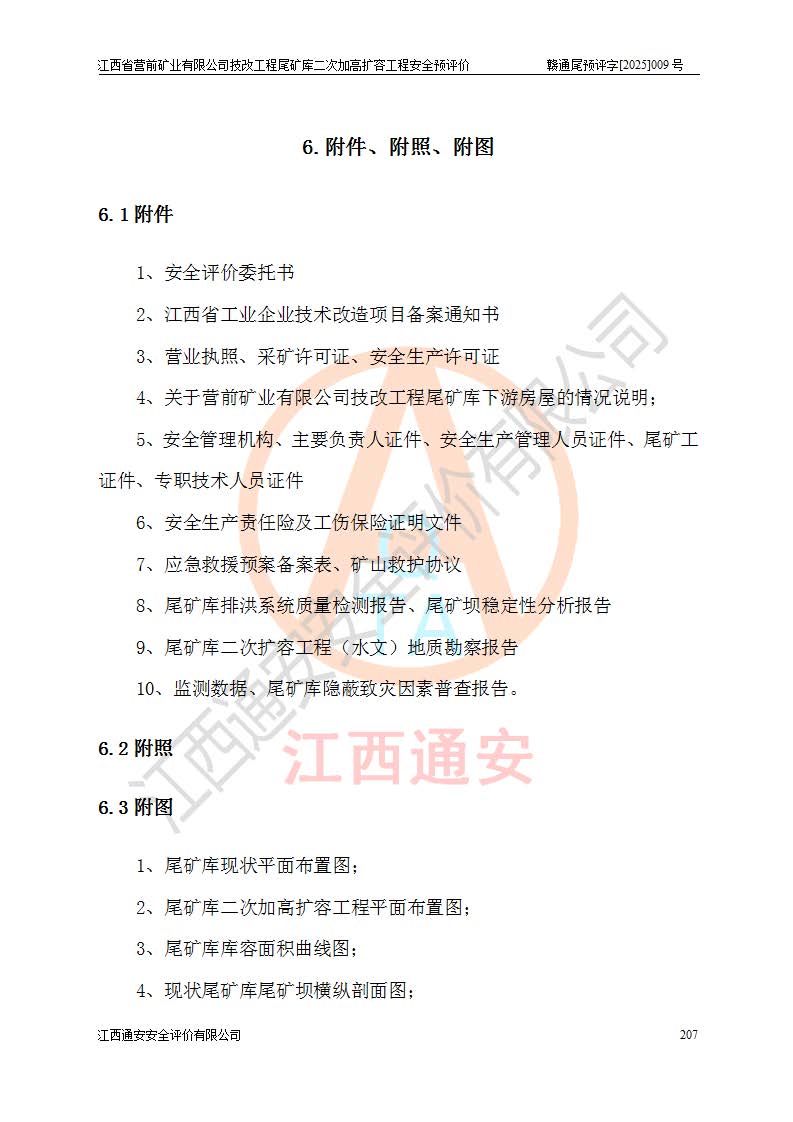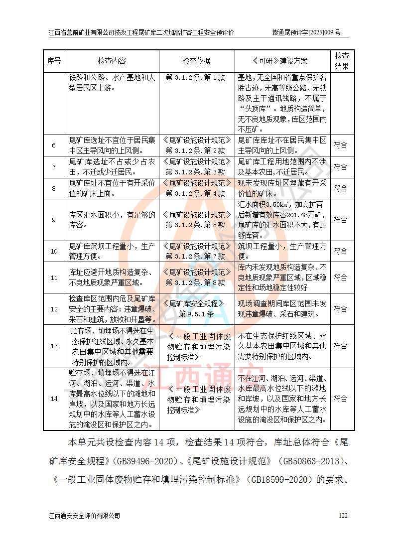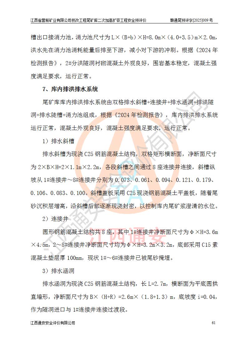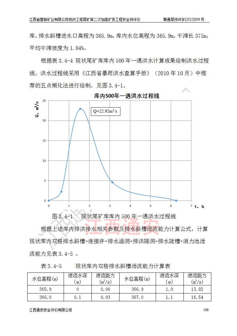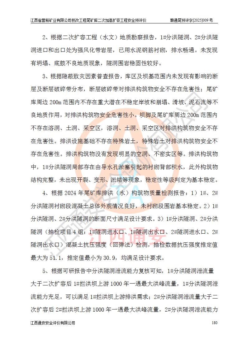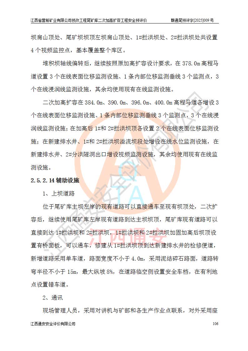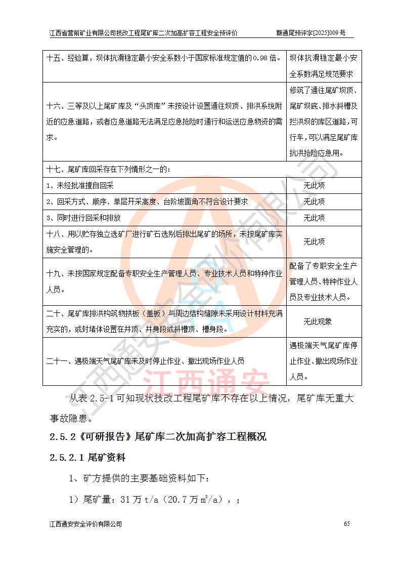 江西省营前矿业有限公司于2003年12月16日成立,位于赣州市上犹县营前镇焦里村境内,公司注册资本10000万元,法定**人陈雅博,矿区地理坐标:东经114°18′30″~114°19′00″,北纬25°52′35″~25°53′47″。公司经营范围包括:铅矿、锌、钨、银地下开采、销售。 江西省营前矿业有限公司技改工程尾矿库位于焦里钨银铅锌矿区,处于上犹县水岩乡井子村坑尾自然村境内,为山谷型尾矿库。 江西省营前矿业有限公司技改工程尾矿库于2013年由福建省冶金工业设计院设计,2014年8月开始施工建设,2015年4月竣工开始试运行,2015年11月完成竣工验收,2016年1月首次取得安全生产许可证,2019年1月完成延期换证,2020年8月委托金建工程设计有限公司进行尾矿库加高扩容工作,2020年10月21日取得了江西省应急管理厅下发的《关于江西省营前矿业有限公司技改工程尾矿库加高扩容工程安全设施设计的审查意见》(赣应急非煤项目设审〔2020〕46号),之后委托驻马店市黄淮建设工程有限公司负责施工,云南润滇工程技术有限公司负责监理,2021年12月完成加高扩容竣工验收工作,经过延期,现尾矿库安全生产许可证编号(赣)FM安许证字[2016]M1692号,**期为2025年01月18日至2028年01月17日。 江西省营前矿业有限公司技改工程尾矿库为山谷型尾矿库,初期坝为透水堆石坝,坝顶高程为330.0m,初期坝高25.0m,后期采用上游式尾矿堆积坝,加高扩容后*终坝顶高程为380.0m,堆积坝高50.0m,总坝高为75.0m,总库容为为503.14×104m3,尾矿库为三等库。尾矿库初期坝以上总汇水面积3.53km2,防洪标准取500年一遇。 目前尾矿库由初期坝、堆积坝、库内排洪系统(双格排水斜槽+连接井+排水涵洞+排洪隧洞+排水陡槽+消力池)、1#拦洪坝、1#分洪隧洞、2#拦洪坝、2#分洪隧洞和安全监测设施组成。根据建设单位提供的尾矿库平面布置图,截至2024年12月,现状尾矿库堆积坝顶高程为372.2m,现状总坝高67.2m,滩顶高程为369.8m,现状全库容387.51×104m3,现状尾矿库为三等库,原加高扩容设计*终堆积坝顶高程为380.0m,现剩余库容115.63×104m3,剩余**库容约92.5×104m3,剩余服务年限约4.5年;矿山现有储量较大,剩余库容及服务年限不满足矿山后期生产需要。 技改工程尾矿库尾矿坝下游1**范围无居民,不存在工矿企业等建构筑物,不属于“头顶库”;尾矿库不压矿;距赣江直线距离60**;不涉及保护区及生态红线;尾矿库所在沟谷较长,谷底平均纵坡9%,上游周边山体地形有利于尾矿库二次加高扩容工程的实施,因此为了增加尾矿库库容,延长服务年限,充分利用尾矿库所在沟谷地形,江西省营前矿业有限公司对技改尾矿库进行二次加高扩容。 2024年12月,江西省营前矿业有限公司委托地矿赣西地质工程勘察院编制了《江西省营前矿业有限公司技改工程尾矿库二次扩容工程(水文)地质勘察报告》,2025年4月,江西省营前矿业有限公司委托金建工程设计有限公司编制了《江西省营前矿业有限公司技改工程尾矿库二次加高扩容工程可行性研究报告》。 按照非煤矿山建设项目安全设施“三同时”的规定要求,技改工程尾矿库为二次加高扩容工程,**进行安全预评价;江西省营前矿业有限公司委托我公司承担技改工程尾矿库二次加高扩容工程建设项目的安全预评价工作。 |
