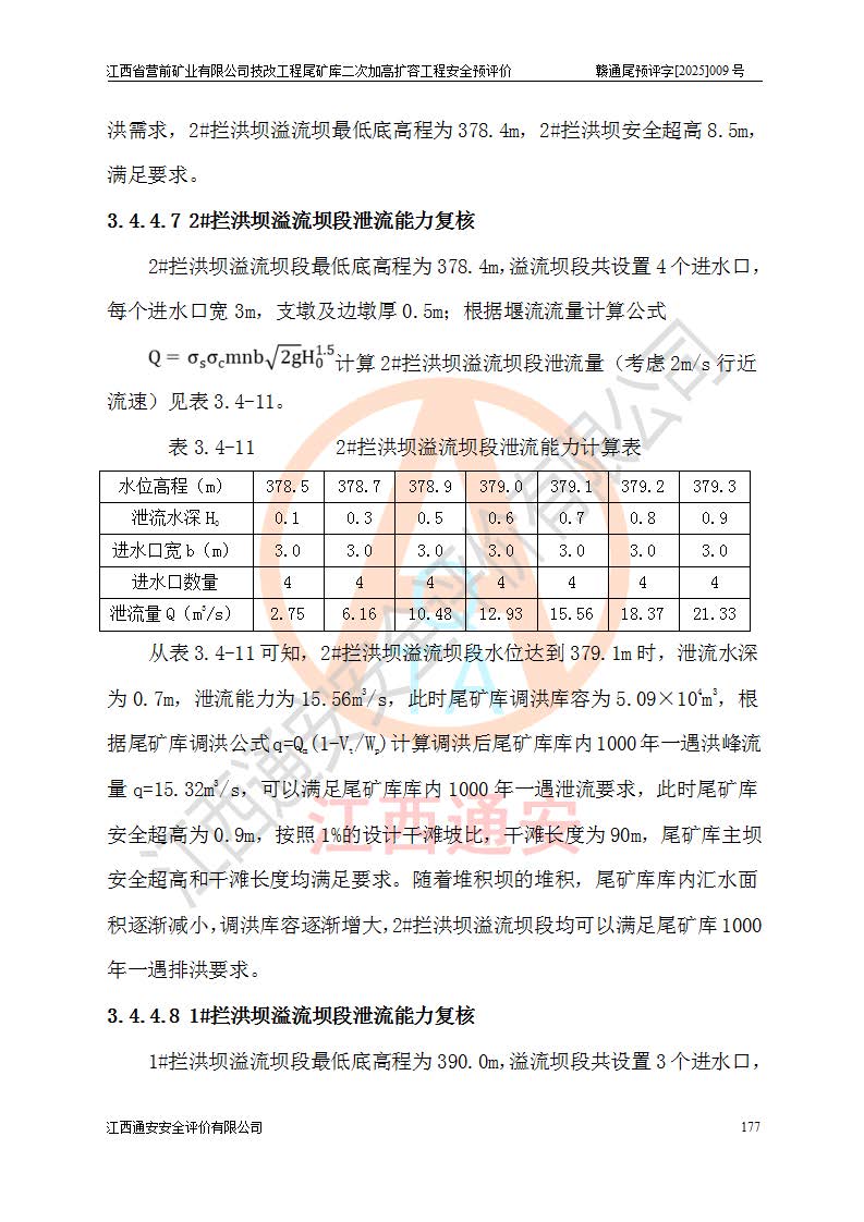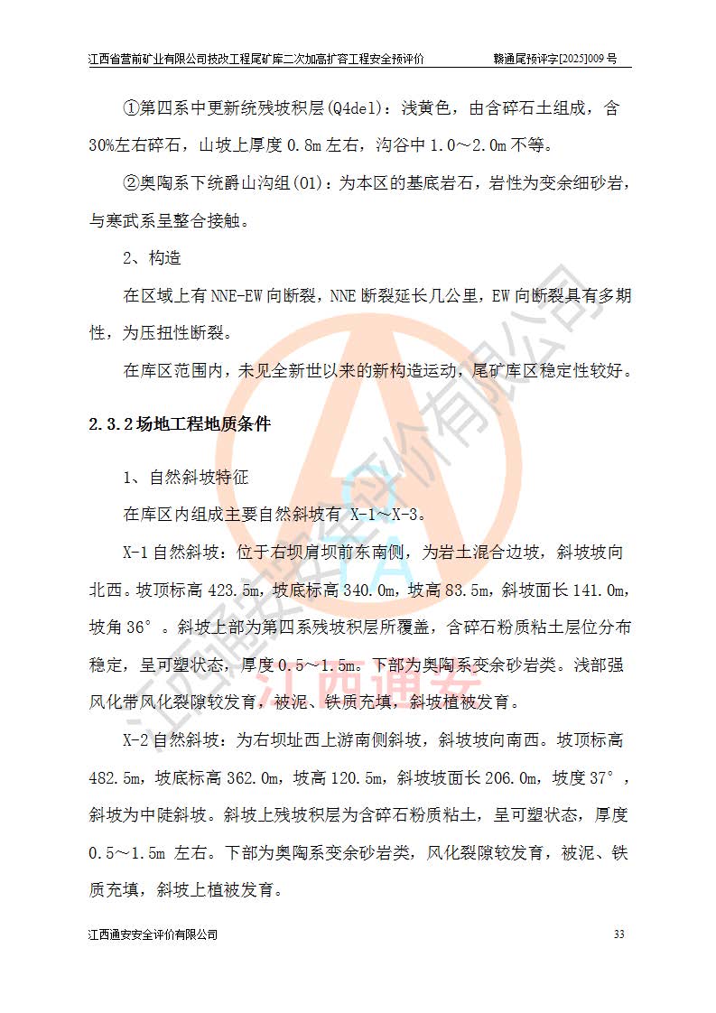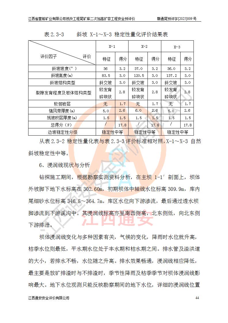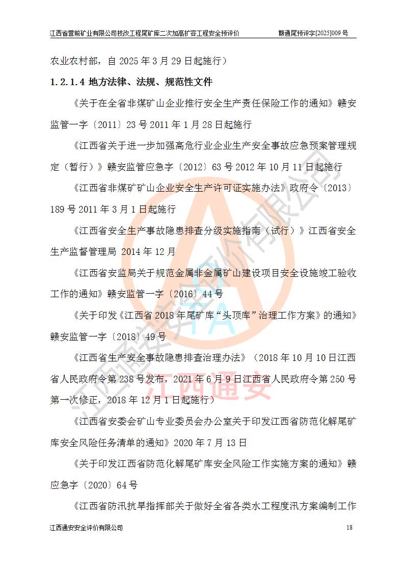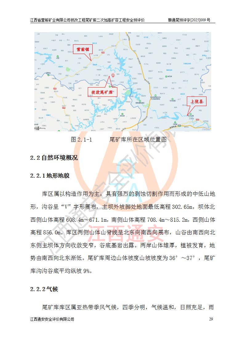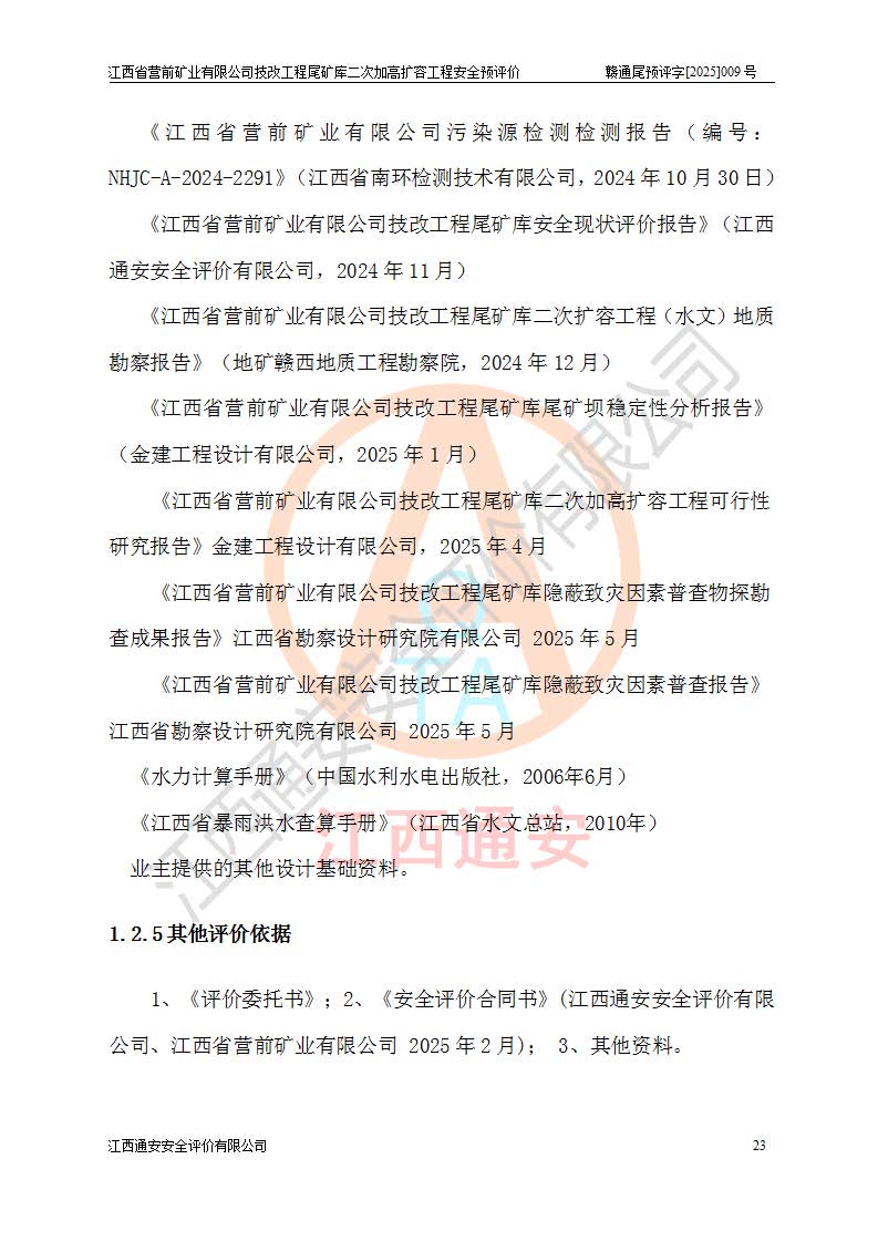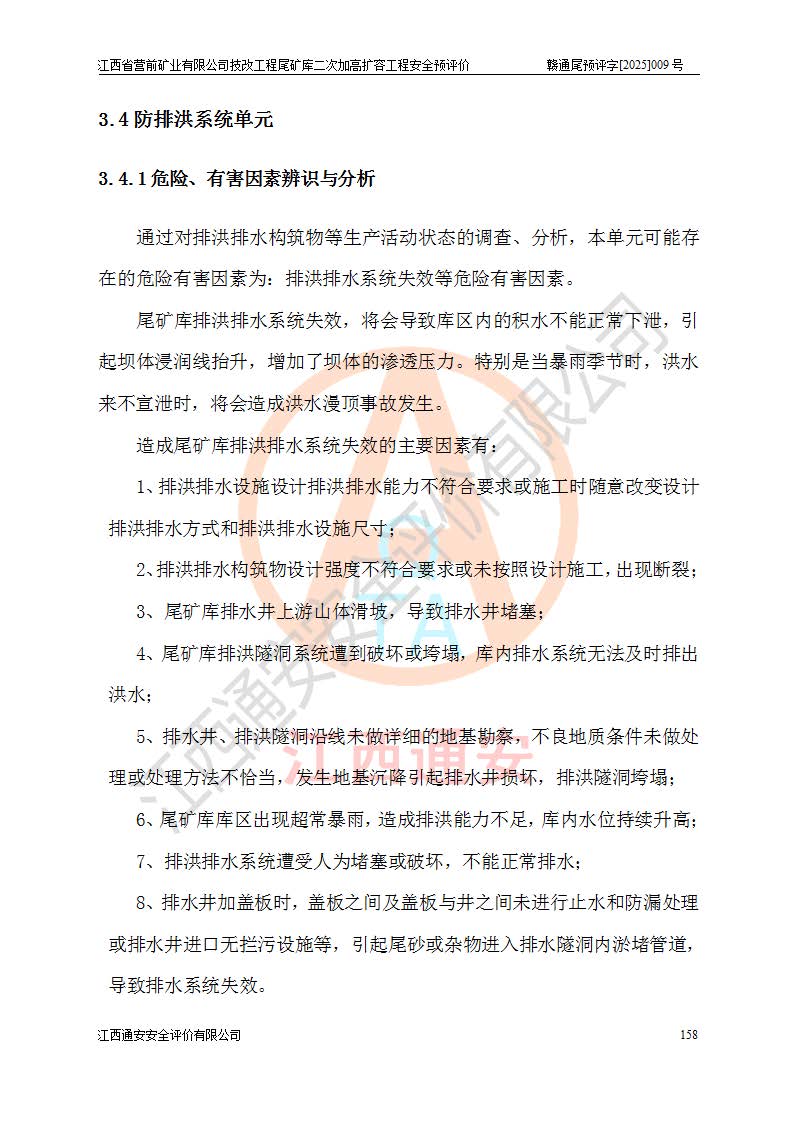 江西省营前矿业有限公司于2003年12月16日成立,位于赣州市上犹县营前镇焦里村境内,公司注册资本10000万元,法定**人陈雅博,矿区地理坐标:东经114°18′30″~114°19′00″,北纬25°52′35″~25°53′47″。公司经营范围包括:铅矿、锌、钨、银地下开采、销售。 江西省营前矿业有限公司技改工程尾矿库位于焦里钨银铅锌矿区,处于上犹县水岩乡井子村坑尾自然村境内,为山谷型尾矿库。 江西省营前矿业有限公司技改工程尾矿库于2013年由福建省冶金工业设计院设计,2014年8月开始施工建设,2015年4月竣工开始试运行,2015年11月完成竣工验收,2016年1月首次取得安全生产许可证,2019年1月完成延期换证,2020年8月委托金建工程设计有限公司进行尾矿库加高扩容工作,2020年10月21日取得了江西省应急管理厅下发的《关于江西省营前矿业有限公司技改工程尾矿库加高扩容工程安全设施设计的审查意见》(赣应急非煤项目设审〔2020〕46号),之后委托驻马店市黄淮建设工程有限公司负责施工,云南润滇工程技术有限公司负责监理,2021年12月完成加高扩容竣工验收工作,经过延期,现尾矿库安全生产许可证编号(赣)FM安许证字[2016]M1692号,**期为2025年01月18日至2028年01月17日。 江西省营前矿业有限公司技改工程尾矿库为山谷型尾矿库,初期坝为透水堆石坝,坝顶高程为330.0m,初期坝高25.0m,后期采用上游式尾矿堆积坝,加高扩容后*终坝顶高程为380.0m,堆积坝高50.0m,总坝高为75.0m,总库容为为503.14×104m3,尾矿库为三等库。尾矿库初期坝以上总汇水面积3.53km2,防洪标准取500年一遇。 目前尾矿库由初期坝、堆积坝、库内排洪系统(双格排水斜槽+连接井+排水涵洞+排洪隧洞+排水陡槽+消力池)、1#拦洪坝、1#分洪隧洞、2#拦洪坝、2#分洪隧洞和安全监测设施组成。根据建设单位提供的尾矿库平面布置图,截至2024年12月,现状尾矿库堆积坝顶高程为372.2m,现状总坝高67.2m,滩顶高程为369.8m,现状全库容387.51×104m3,现状尾矿库为三等库,原加高扩容设计*终堆积坝顶高程为380.0m,现剩余库容115.63×104m3,剩余**库容约92.5×104m3,剩余服务年限约4.5年;矿山现有储量较大,剩余库容及服务年限不满足矿山后期生产需要。 技改工程尾矿库尾矿坝下游1**范围无居民,不存在工矿企业等建构筑物,不属于“头顶库”;尾矿库不压矿;距赣江直线距离60**;不涉及保护区及生态红线;尾矿库所在沟谷较长,谷底平均纵坡9%,上游周边山体地形有利于尾矿库二次加高扩容工程的实施,因此为了增加尾矿库库容,延长服务年限,充分利用尾矿库所在沟谷地形,江西省营前矿业有限公司对技改尾矿库进行二次加高扩容。 2024年12月,江西省营前矿业有限公司委托地矿赣西地质工程勘察院编制了《江西省营前矿业有限公司技改工程尾矿库二次扩容工程(水文)地质勘察报告》,2025年4月,江西省营前矿业有限公司委托金建工程设计有限公司编制了《江西省营前矿业有限公司技改工程尾矿库二次加高扩容工程可行性研究报告》。 按照非煤矿山建设项目安全设施“三同时”的规定要求,技改工程尾矿库为二次加高扩容工程,**进行安全预评价;江西省营前矿业有限公司委托我公司承担技改工程尾矿库二次加高扩容工程建设项目的安全预评价工作。 |