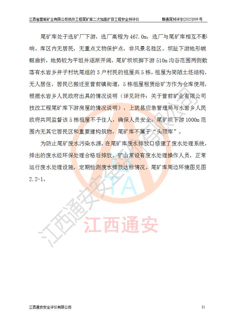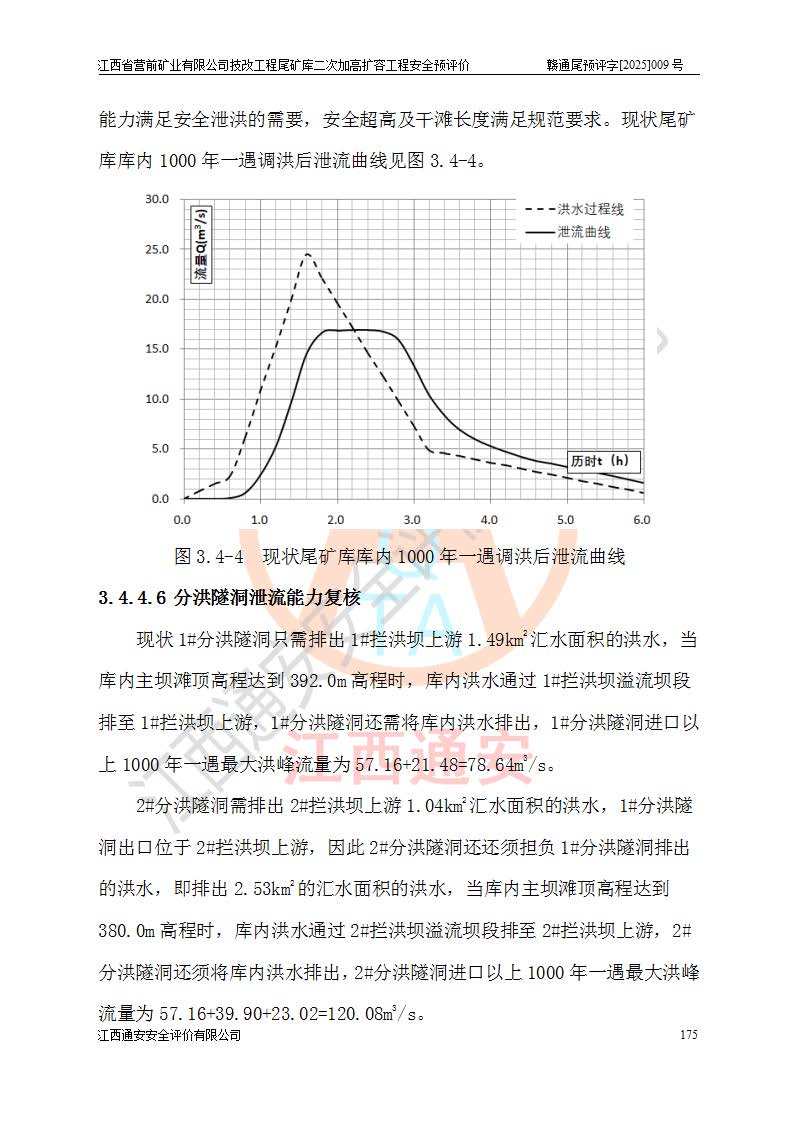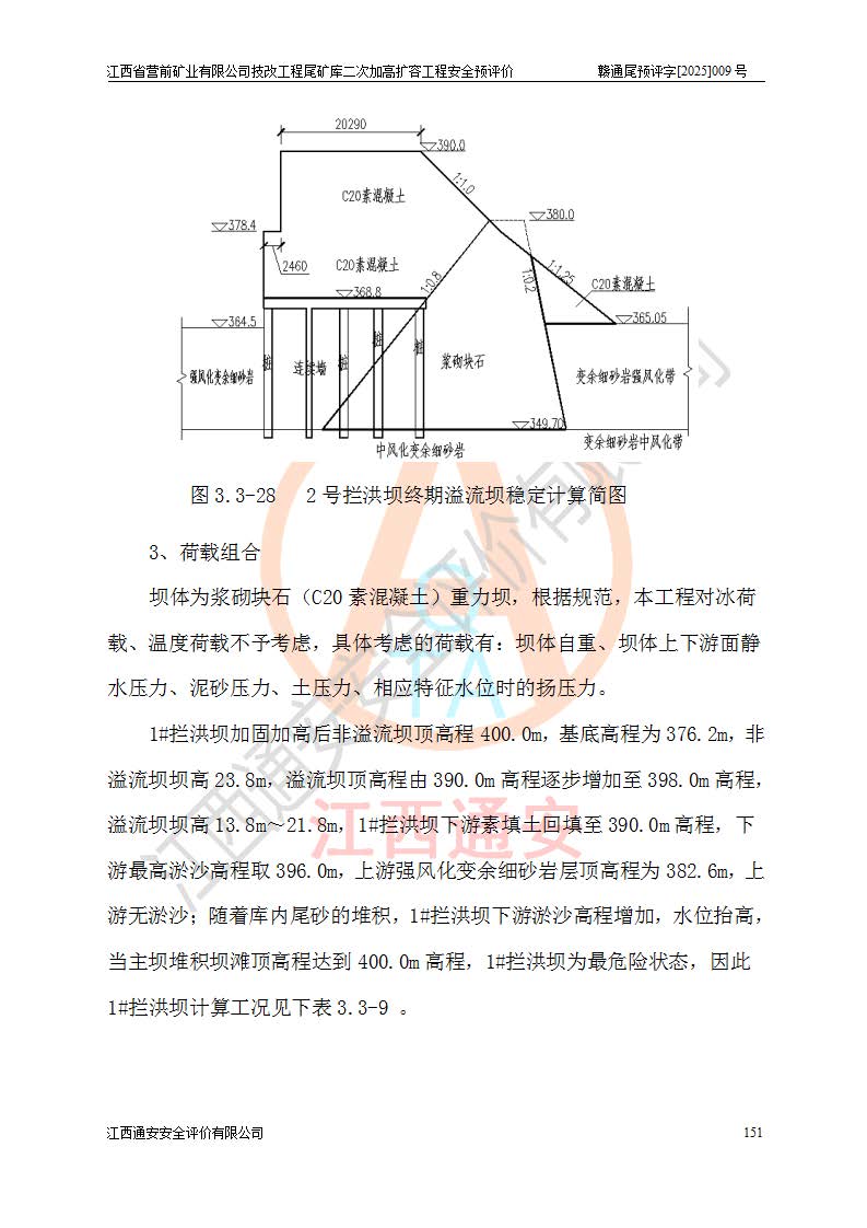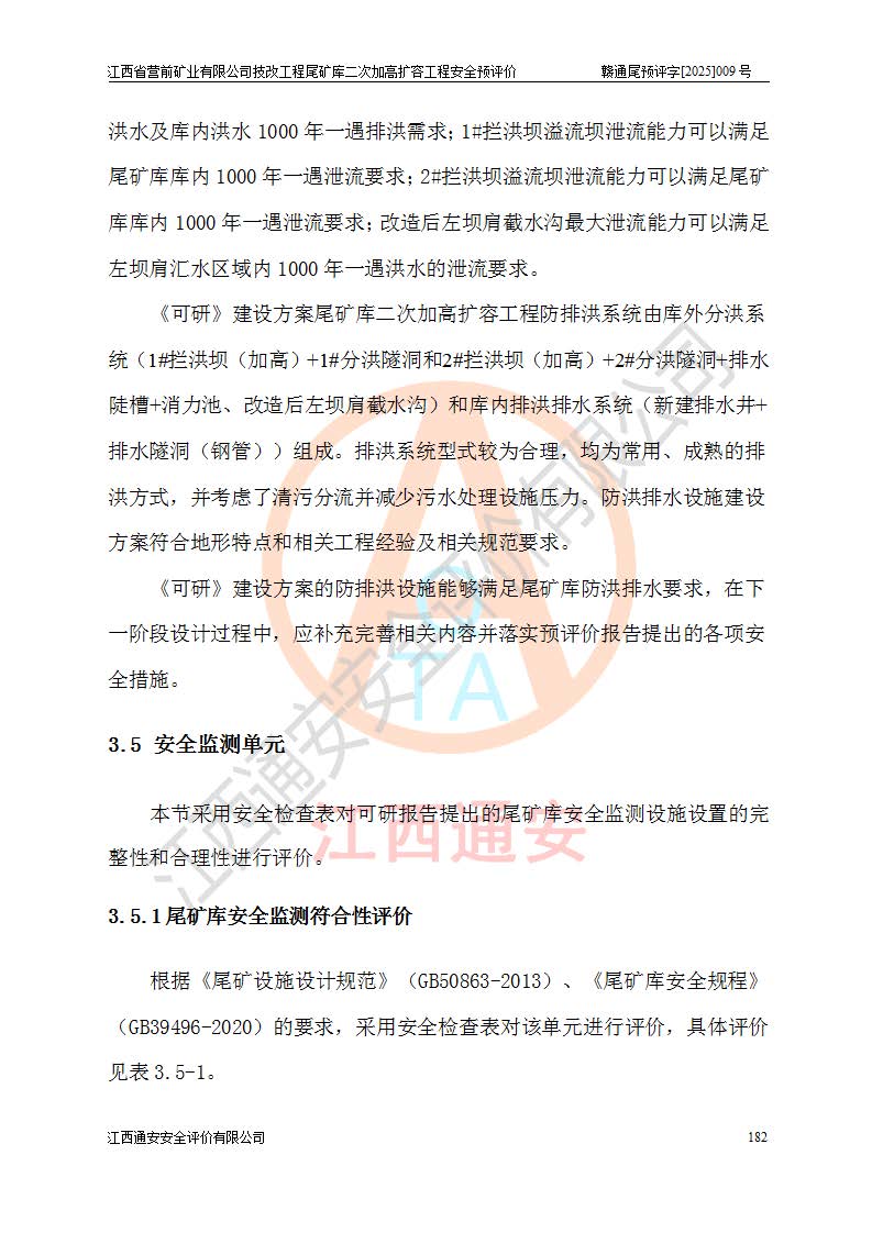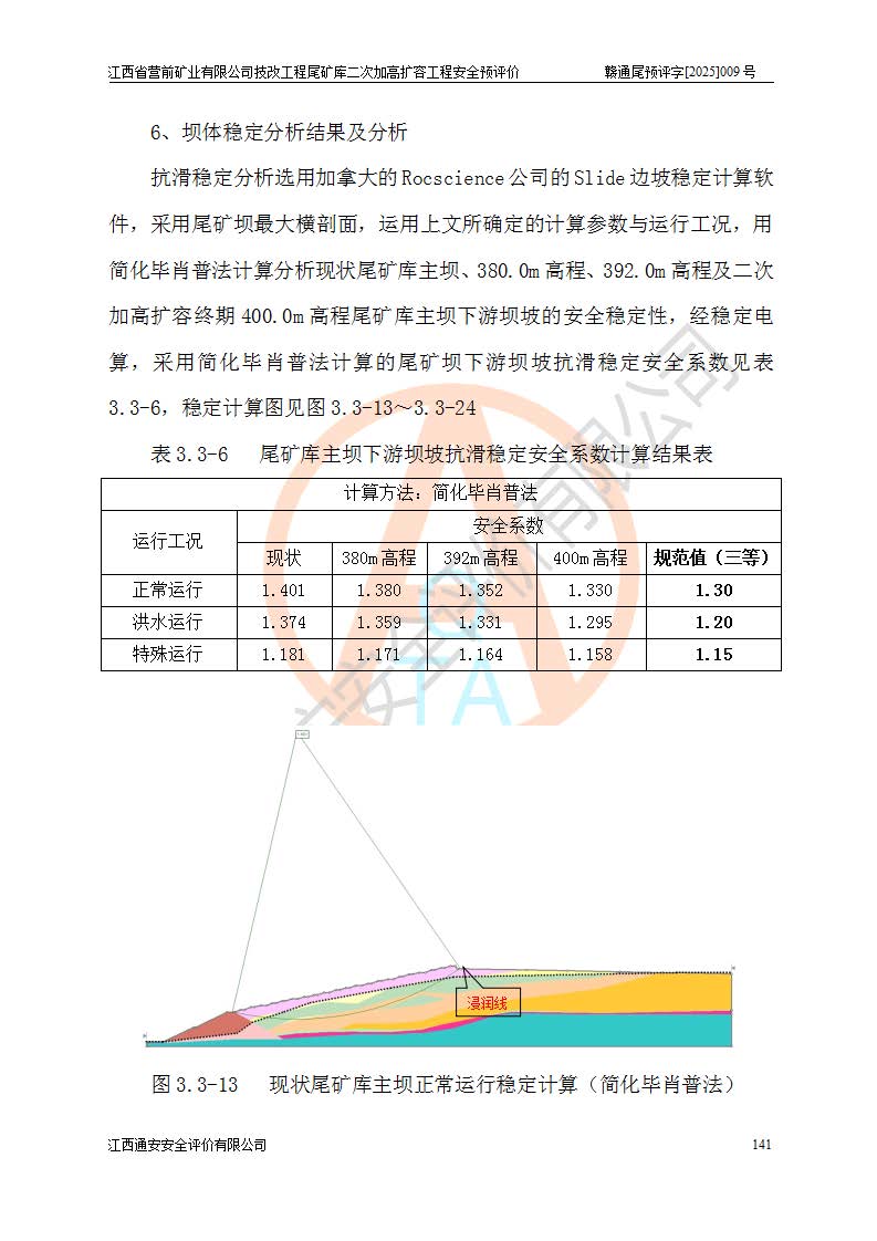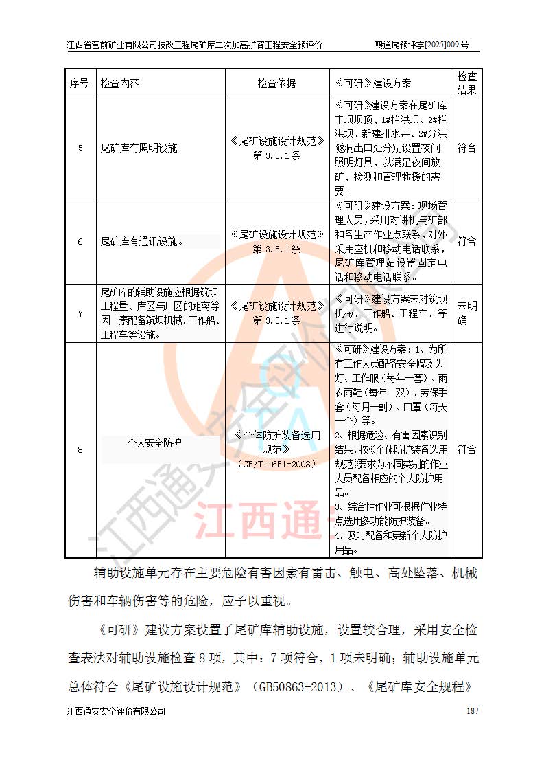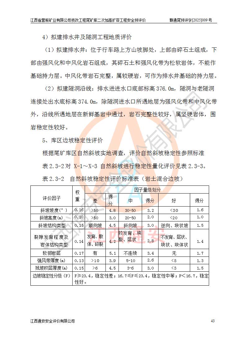 江西省营前矿业有限公司于2003年12月16日成立,位于赣州市上犹县营前镇焦里村境内,公司注册资本10000万元,法定**人陈雅博,矿区地理坐标:东经114°18′30″~114°19′00″,北纬25°52′35″~25°53′47″。公司经营范围包括:铅矿、锌、钨、银地下开采、销售。 江西省营前矿业有限公司技改工程尾矿库位于焦里钨银铅锌矿区,处于上犹县水岩乡井子村坑尾自然村境内,为山谷型尾矿库。 江西省营前矿业有限公司技改工程尾矿库于2013年由福建省冶金工业设计院设计,2014年8月开始施工建设,2015年4月竣工开始试运行,2015年11月完成竣工验收,2016年1月首次取得安全生产许可证,2019年1月完成延期换证,2020年8月委托金建工程设计有限公司进行尾矿库加高扩容工作,2020年10月21日取得了江西省应急管理厅下发的《关于江西省营前矿业有限公司技改工程尾矿库加高扩容工程安全设施设计的审查意见》(赣应急非煤项目设审〔2020〕46号),之后委托驻马店市黄淮建设工程有限公司负责施工,云南润滇工程技术有限公司负责监理,2021年12月完成加高扩容竣工验收工作,经过延期,现尾矿库安全生产许可证编号(赣)FM安许证字[2016]M1692号,**期为2025年01月18日至2028年01月17日。 江西省营前矿业有限公司技改工程尾矿库为山谷型尾矿库,初期坝为透水堆石坝,坝顶高程为330.0m,初期坝高25.0m,后期采用上游式尾矿堆积坝,加高扩容后*终坝顶高程为380.0m,堆积坝高50.0m,总坝高为75.0m,总库容为为503.14×104m3,尾矿库为三等库。尾矿库初期坝以上总汇水面积3.53km2,防洪标准取500年一遇。 目前尾矿库由初期坝、堆积坝、库内排洪系统(双格排水斜槽+连接井+排水涵洞+排洪隧洞+排水陡槽+消力池)、1#拦洪坝、1#分洪隧洞、2#拦洪坝、2#分洪隧洞和安全监测设施组成。根据建设单位提供的尾矿库平面布置图,截至2024年12月,现状尾矿库堆积坝顶高程为372.2m,现状总坝高67.2m,滩顶高程为369.8m,现状全库容387.51×104m3,现状尾矿库为三等库,原加高扩容设计*终堆积坝顶高程为380.0m,现剩余库容115.63×104m3,剩余**库容约92.5×104m3,剩余服务年限约4.5年;矿山现有储量较大,剩余库容及服务年限不满足矿山后期生产需要。 技改工程尾矿库尾矿坝下游1**范围无居民,不存在工矿企业等建构筑物,不属于“头顶库”;尾矿库不压矿;距赣江直线距离60**;不涉及保护区及生态红线;尾矿库所在沟谷较长,谷底平均纵坡9%,上游周边山体地形有利于尾矿库二次加高扩容工程的实施,因此为了增加尾矿库库容,延长服务年限,充分利用尾矿库所在沟谷地形,江西省营前矿业有限公司对技改尾矿库进行二次加高扩容。 2024年12月,江西省营前矿业有限公司委托地矿赣西地质工程勘察院编制了《江西省营前矿业有限公司技改工程尾矿库二次扩容工程(水文)地质勘察报告》,2025年4月,江西省营前矿业有限公司委托金建工程设计有限公司编制了《江西省营前矿业有限公司技改工程尾矿库二次加高扩容工程可行性研究报告》。 按照非煤矿山建设项目安全设施“三同时”的规定要求,技改工程尾矿库为二次加高扩容工程,**进行安全预评价;江西省营前矿业有限公司委托我公司承担技改工程尾矿库二次加高扩容工程建设项目的安全预评价工作。 |