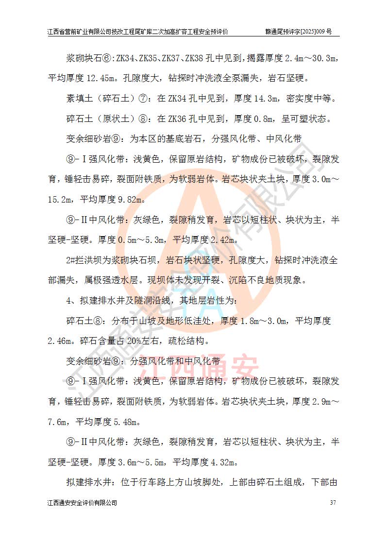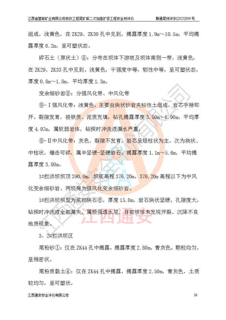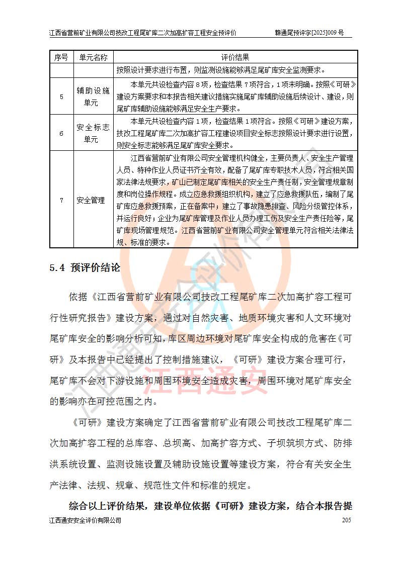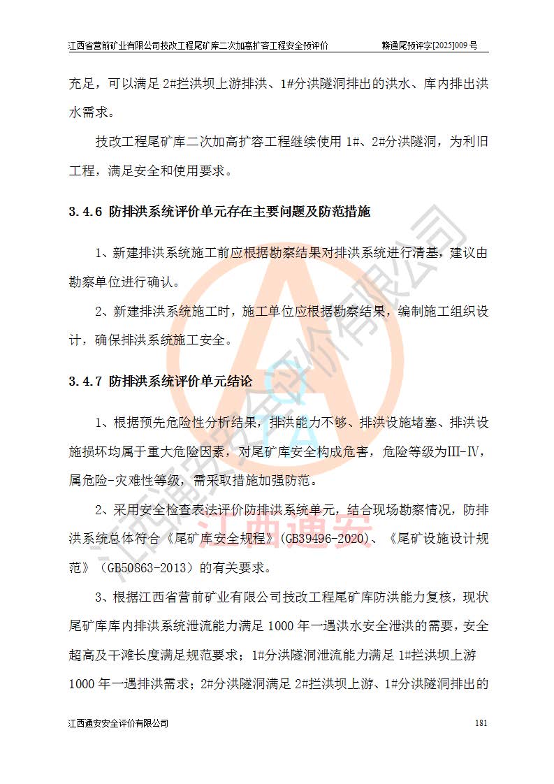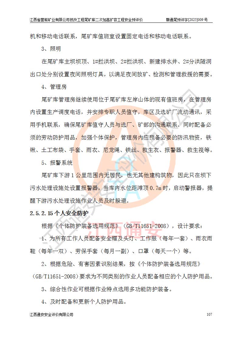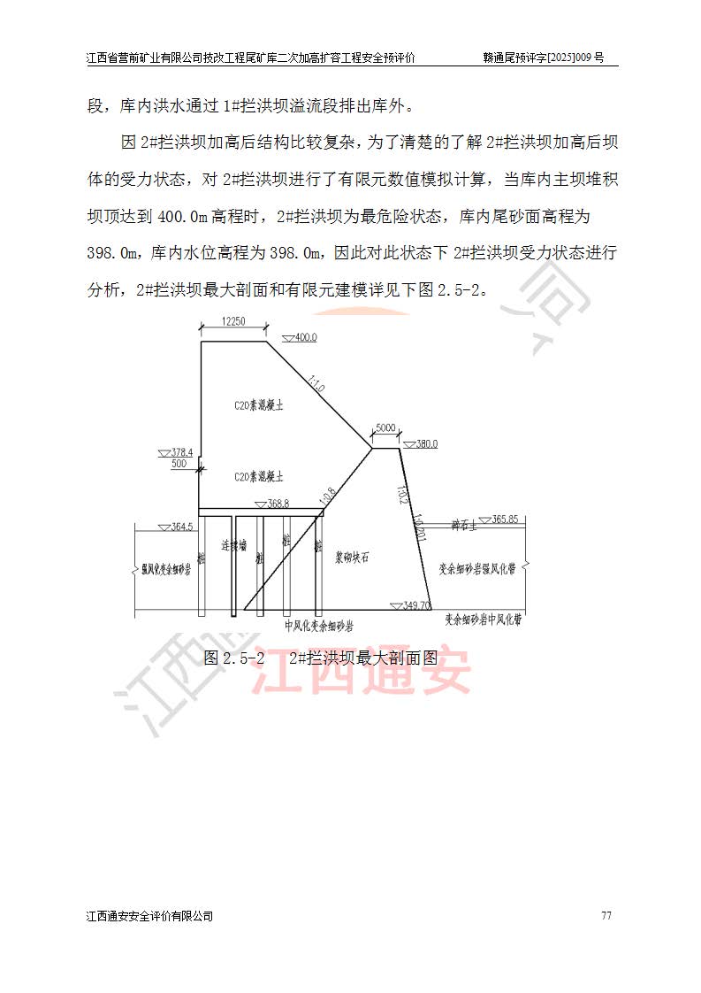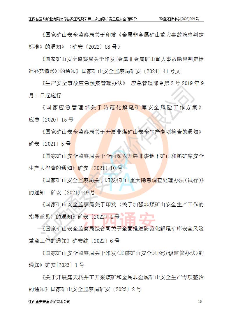 江西省营前矿业有限公司于2003年12月16日成立,位于赣州市上犹县营前镇焦里村境内,公司注册资本10000万元,法定**人陈雅博,矿区地理坐标:东经114°18′30″~114°19′00″,北纬25°52′35″~25°53′47″。公司经营范围包括:铅矿、锌、钨、银地下开采、销售。 江西省营前矿业有限公司技改工程尾矿库位于焦里钨银铅锌矿区,处于上犹县水岩乡井子村坑尾自然村境内,为山谷型尾矿库。 江西省营前矿业有限公司技改工程尾矿库于2013年由福建省冶金工业设计院设计,2014年8月开始施工建设,2015年4月竣工开始试运行,2015年11月完成竣工验收,2016年1月首次取得安全生产许可证,2019年1月完成延期换证,2020年8月委托金建工程设计有限公司进行尾矿库加高扩容工作,2020年10月21日取得了江西省应急管理厅下发的《关于江西省营前矿业有限公司技改工程尾矿库加高扩容工程安全设施设计的审查意见》(赣应急非煤项目设审〔2020〕46号),之后委托驻马店市黄淮建设工程有限公司负责施工,云南润滇工程技术有限公司负责监理,2021年12月完成加高扩容竣工验收工作,经过延期,现尾矿库安全生产许可证编号(赣)FM安许证字[2016]M1692号,**期为2025年01月18日至2028年01月17日。 江西省营前矿业有限公司技改工程尾矿库为山谷型尾矿库,初期坝为透水堆石坝,坝顶高程为330.0m,初期坝高25.0m,后期采用上游式尾矿堆积坝,加高扩容后*终坝顶高程为380.0m,堆积坝高50.0m,总坝高为75.0m,总库容为为503.14×104m3,尾矿库为三等库。尾矿库初期坝以上总汇水面积3.53km2,防洪标准取500年一遇。 目前尾矿库由初期坝、堆积坝、库内排洪系统(双格排水斜槽+连接井+排水涵洞+排洪隧洞+排水陡槽+消力池)、1#拦洪坝、1#分洪隧洞、2#拦洪坝、2#分洪隧洞和安全监测设施组成。根据建设单位提供的尾矿库平面布置图,截至2024年12月,现状尾矿库堆积坝顶高程为372.2m,现状总坝高67.2m,滩顶高程为369.8m,现状全库容387.51×104m3,现状尾矿库为三等库,原加高扩容设计*终堆积坝顶高程为380.0m,现剩余库容115.63×104m3,剩余**库容约92.5×104m3,剩余服务年限约4.5年;矿山现有储量较大,剩余库容及服务年限不满足矿山后期生产需要。 技改工程尾矿库尾矿坝下游1**范围无居民,不存在工矿企业等建构筑物,不属于“头顶库”;尾矿库不压矿;距赣江直线距离60**;不涉及保护区及生态红线;尾矿库所在沟谷较长,谷底平均纵坡9%,上游周边山体地形有利于尾矿库二次加高扩容工程的实施,因此为了增加尾矿库库容,延长服务年限,充分利用尾矿库所在沟谷地形,江西省营前矿业有限公司对技改尾矿库进行二次加高扩容。 2024年12月,江西省营前矿业有限公司委托地矿赣西地质工程勘察院编制了《江西省营前矿业有限公司技改工程尾矿库二次扩容工程(水文)地质勘察报告》,2025年4月,江西省营前矿业有限公司委托金建工程设计有限公司编制了《江西省营前矿业有限公司技改工程尾矿库二次加高扩容工程可行性研究报告》。 按照非煤矿山建设项目安全设施“三同时”的规定要求,技改工程尾矿库为二次加高扩容工程,**进行安全预评价;江西省营前矿业有限公司委托我公司承担技改工程尾矿库二次加高扩容工程建设项目的安全预评价工作。 |