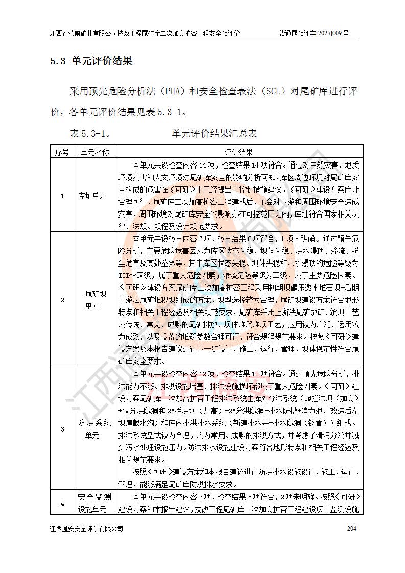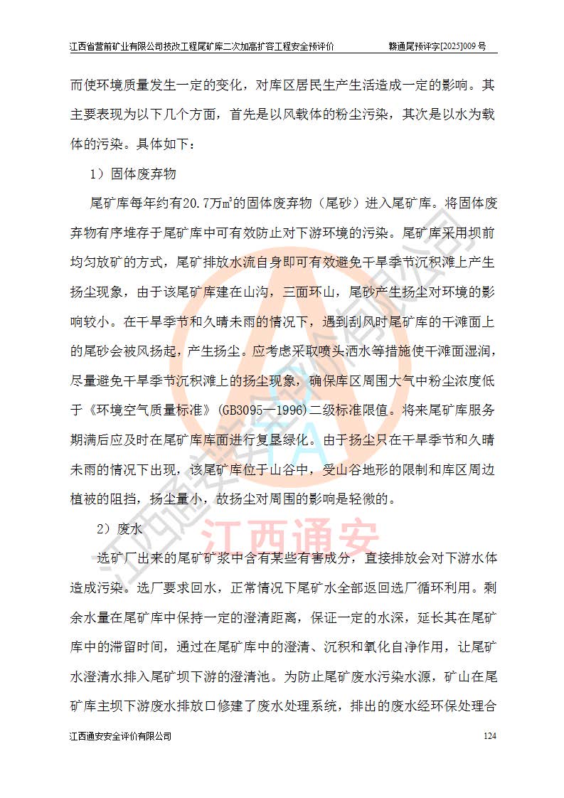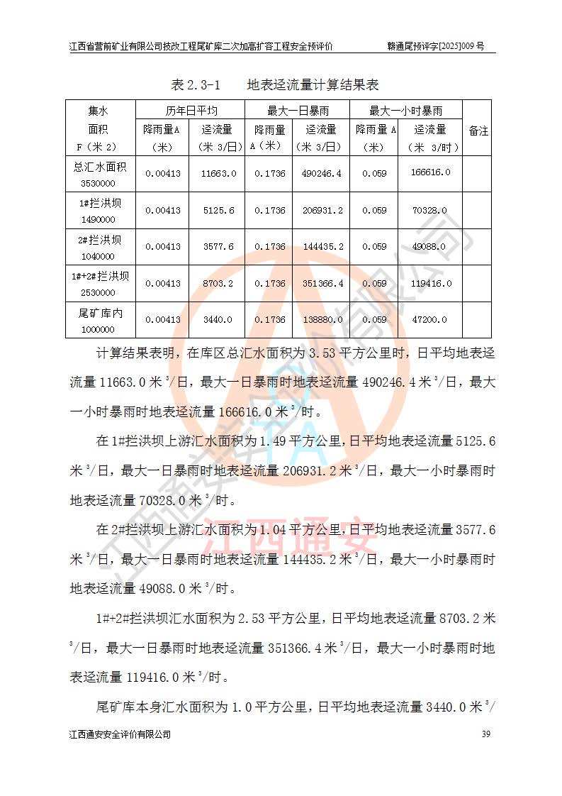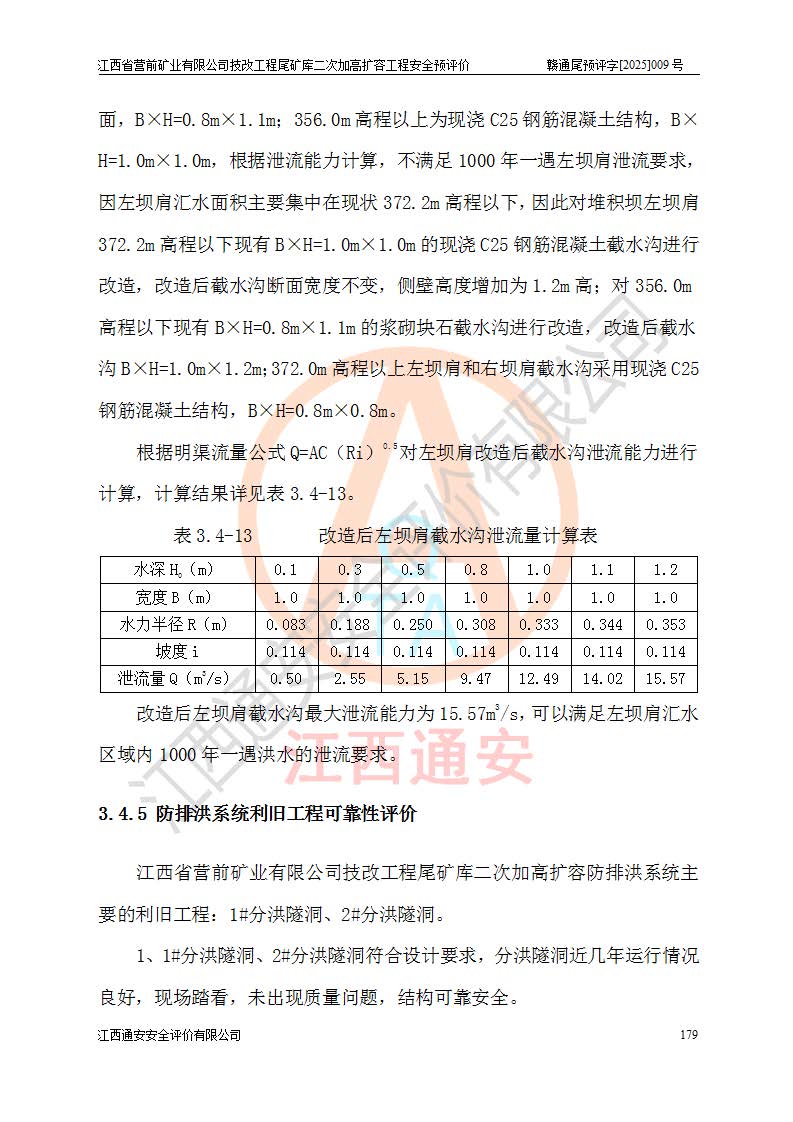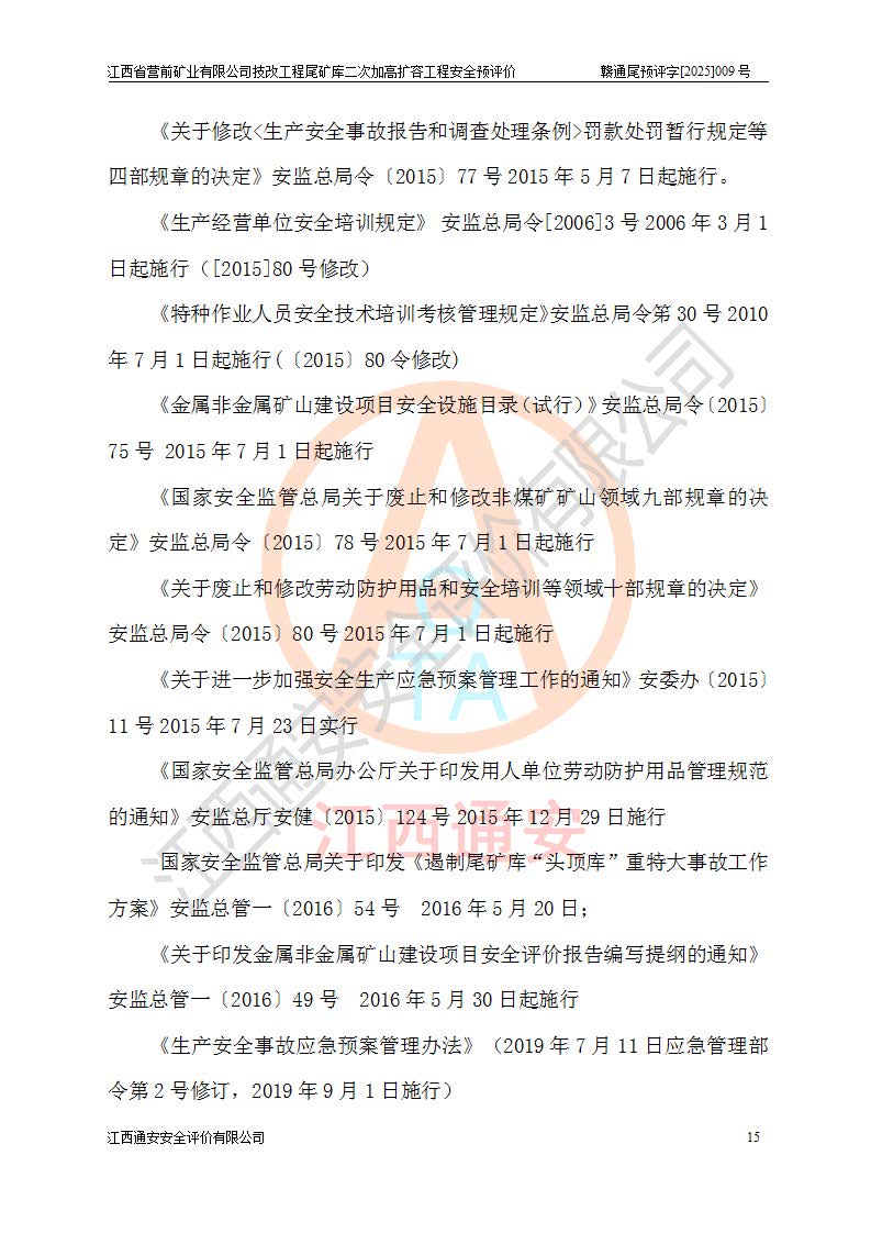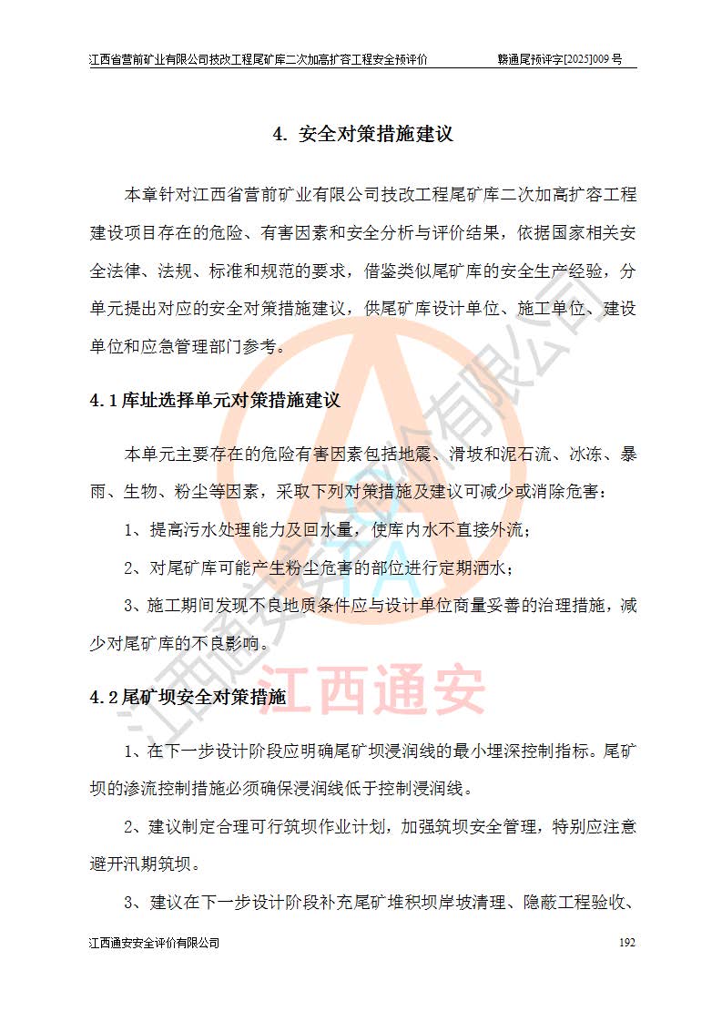江西省营前矿业有限公司于2003年12月16日成立,位于赣州市上犹县营前镇焦里村境内,公司注册资本10000万元,法定**人陈雅博,矿区地理坐标:东经114°18′30″~114°19′00″,北纬25°52′35″~25°53′47″。公司经营范围包括:铅矿、锌、钨、银地下开采、销售。 江西省营前矿业有限公司技改工程尾矿库位于焦里钨银铅锌矿区,处于上犹县水岩乡井子村坑尾自然村境内,为山谷型尾矿库。 江西省营前矿业有限公司技改工程尾矿库于2013年由福建省冶金工业设计院设计,2014年8月开始施工建设,2015年4月竣工开始试运行,2015年11月完成竣工验收,2016年1月首次取得安全生产许可证,2019年1月完成延期换证,2020年8月委托金建工程设计有限公司进行尾矿库加高扩容工作,2020年10月21日取得了江西省应急管理厅下发的《关于江西省营前矿业有限公司技改工程尾矿库加高扩容工程安全设施设计的审查意见》(赣应急非煤项目设审〔2020〕46号),之后委托驻马店市黄淮建设工程有限公司负责施工,云南润滇工程技术有限公司负责监理,2021年12月完成加高扩容竣工验收工作,经过延期,现尾矿库安全生产许可证编号(赣)FM安许证字[2016]M1692号,**期为2025年01月18日至2028年01月17日。 江西省营前矿业有限公司技改工程尾矿库为山谷型尾矿库,初期坝为透水堆石坝,坝顶高程为330.0m,初期坝高25.0m,后期采用上游式尾矿堆积坝,加高扩容后*终坝顶高程为380.0m,堆积坝高50.0m,总坝高为75.0m,总库容为为503.14×104m3,尾矿库为三等库。尾矿库初期坝以上总汇水面积3.53km2,防洪标准取500年一遇。 目前尾矿库由初期坝、堆积坝、库内排洪系统(双格排水斜槽+连接井+排水涵洞+排洪隧洞+排水陡槽+消力池)、1#拦洪坝、1#分洪隧洞、2#拦洪坝、2#分洪隧洞和安全监测设施组成。根据建设单位提供的尾矿库平面布置图,截至2024年12月,现状尾矿库堆积坝顶高程为372.2m,现状总坝高67.2m,滩顶高程为369.8m,现状全库容387.51×104m3,现状尾矿库为三等库,原加高扩容设计*终堆积坝顶高程为380.0m,现剩余库容115.63×104m3,剩余**库容约92.5×104m3,剩余服务年限约4.5年;矿山现有储量较大,剩余库容及服务年限不满足矿山后期生产需要。 技改工程尾矿库尾矿坝下游1**范围无居民,不存在工矿企业等建构筑物,不属于“头顶库”;尾矿库不压矿;距赣江直线距离60**;不涉及保护区及生态红线;尾矿库所在沟谷较长,谷底平均纵坡9%,上游周边山体地形有利于尾矿库二次加高扩容工程的实施,因此为了增加尾矿库库容,延长服务年限,充分利用尾矿库所在沟谷地形,江西省营前矿业有限公司对技改尾矿库进行二次加高扩容。 2024年12月,江西省营前矿业有限公司委托地矿赣西地质工程勘察院编制了《江西省营前矿业有限公司技改工程尾矿库二次扩容工程(水文)地质勘察报告》,2025年4月,江西省营前矿业有限公司委托金建工程设计有限公司编制了《江西省营前矿业有限公司技改工程尾矿库二次加高扩容工程可行性研究报告》。 按照非煤矿山建设项目安全设施“三同时”的规定要求,技改工程尾矿库为二次加高扩容工程,**进行安全预评价;江西省营前矿业有限公司委托我公司承担技改工程尾矿库二次加高扩容工程建设项目的安全预评价工作。 |