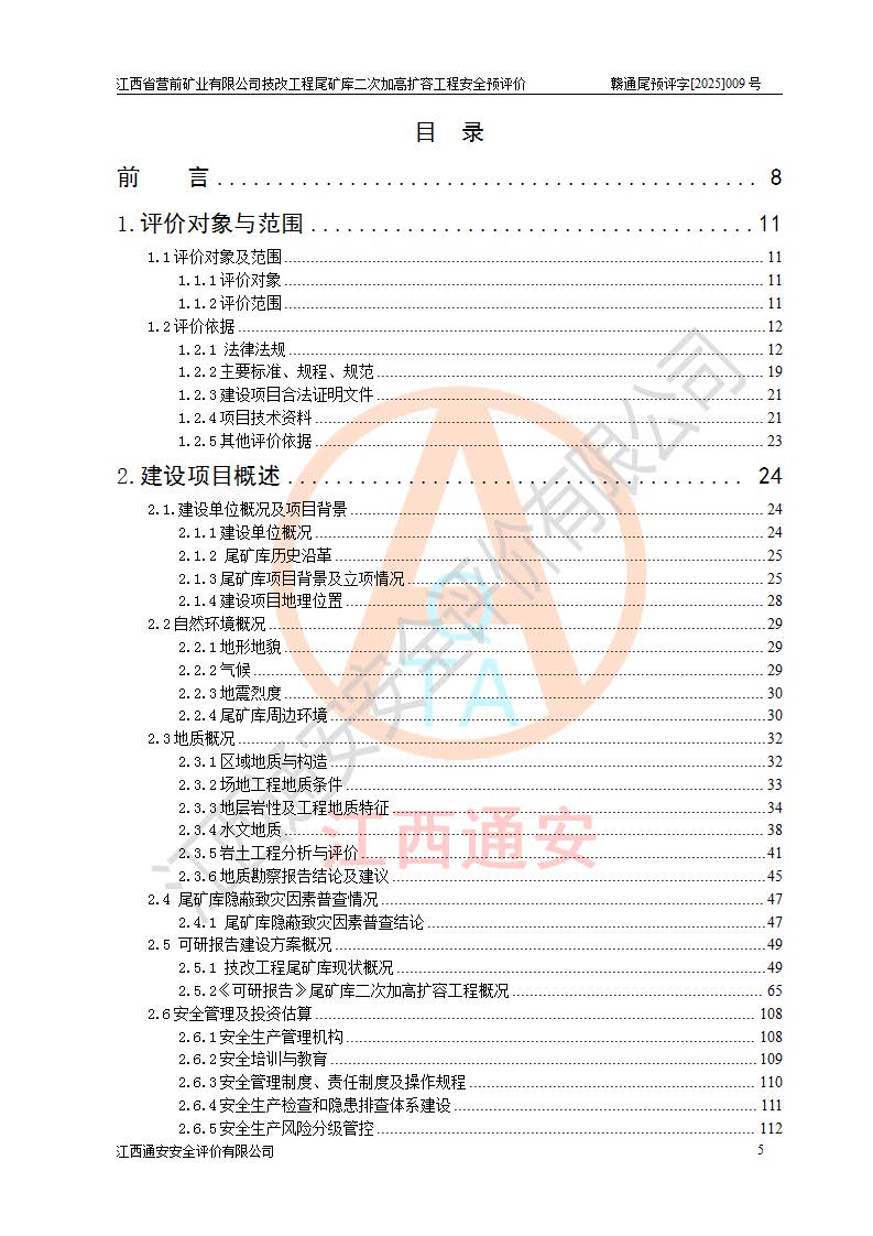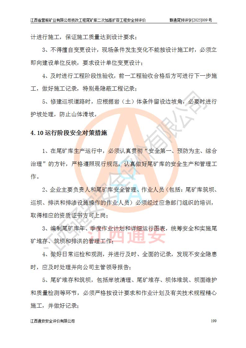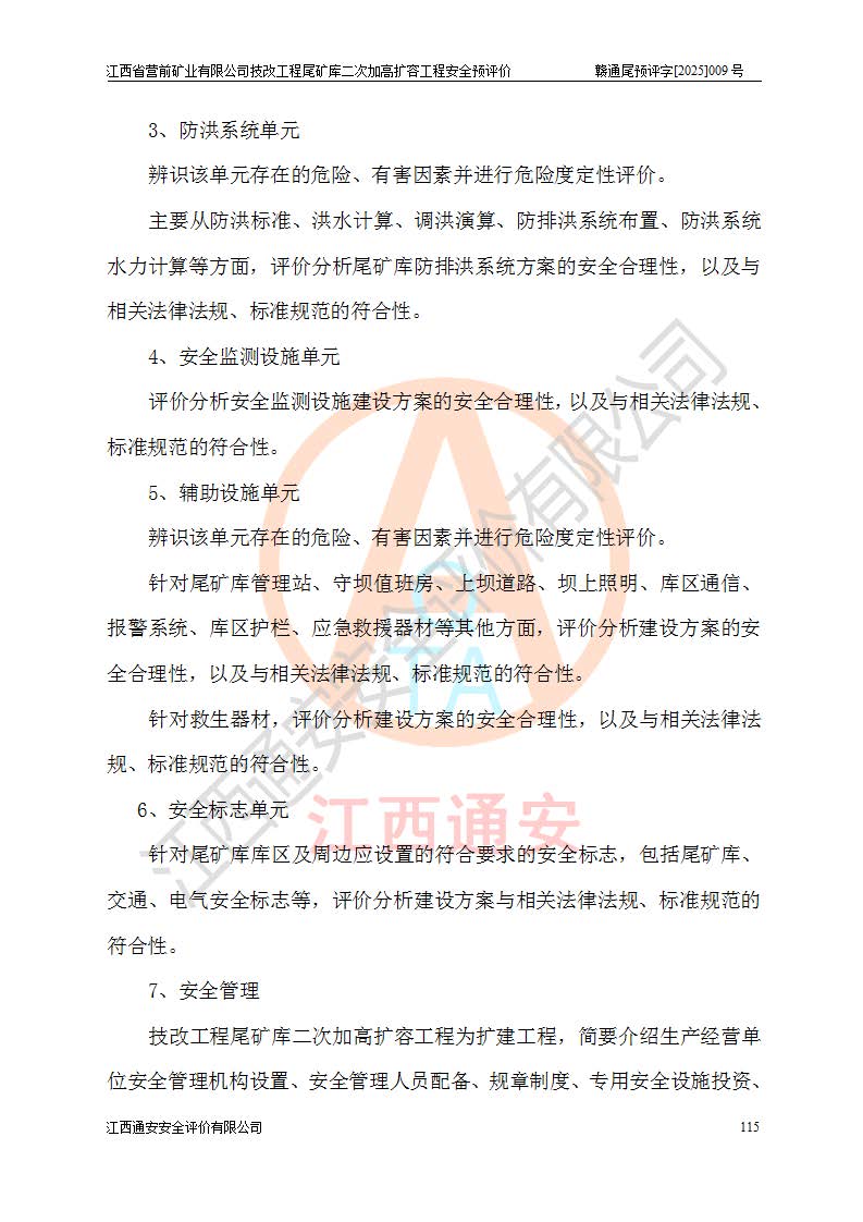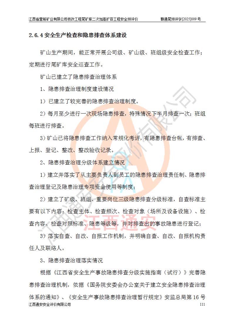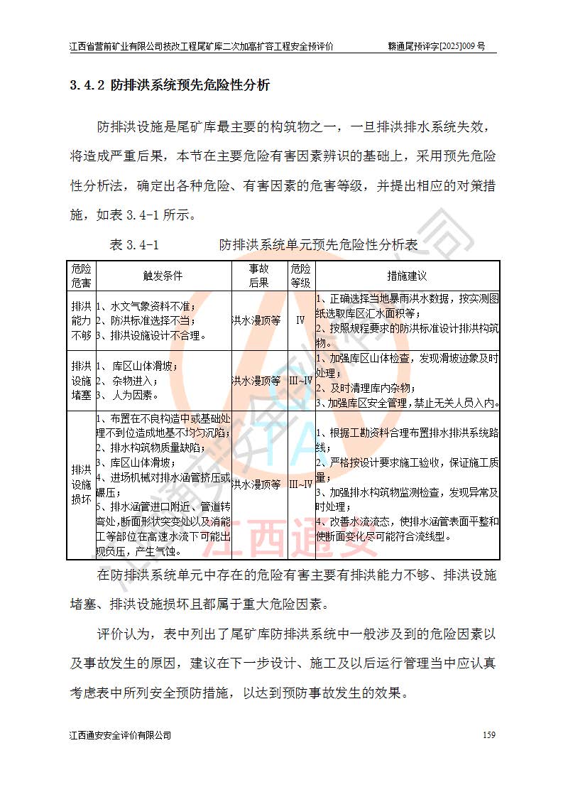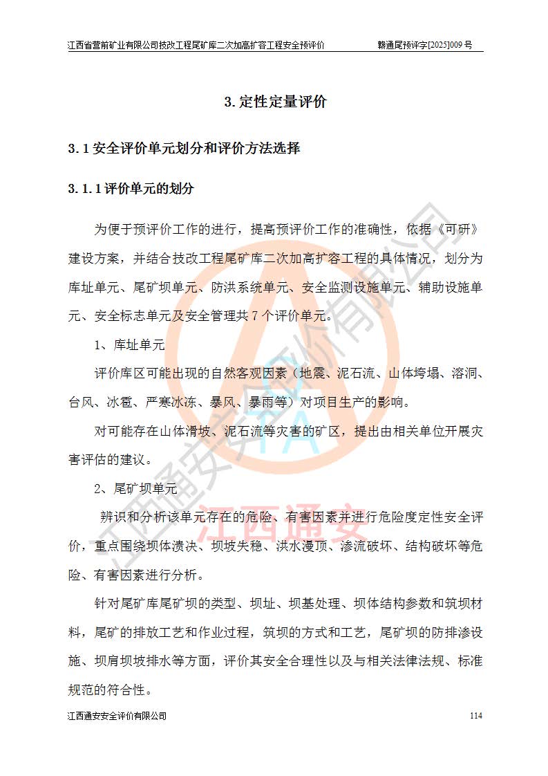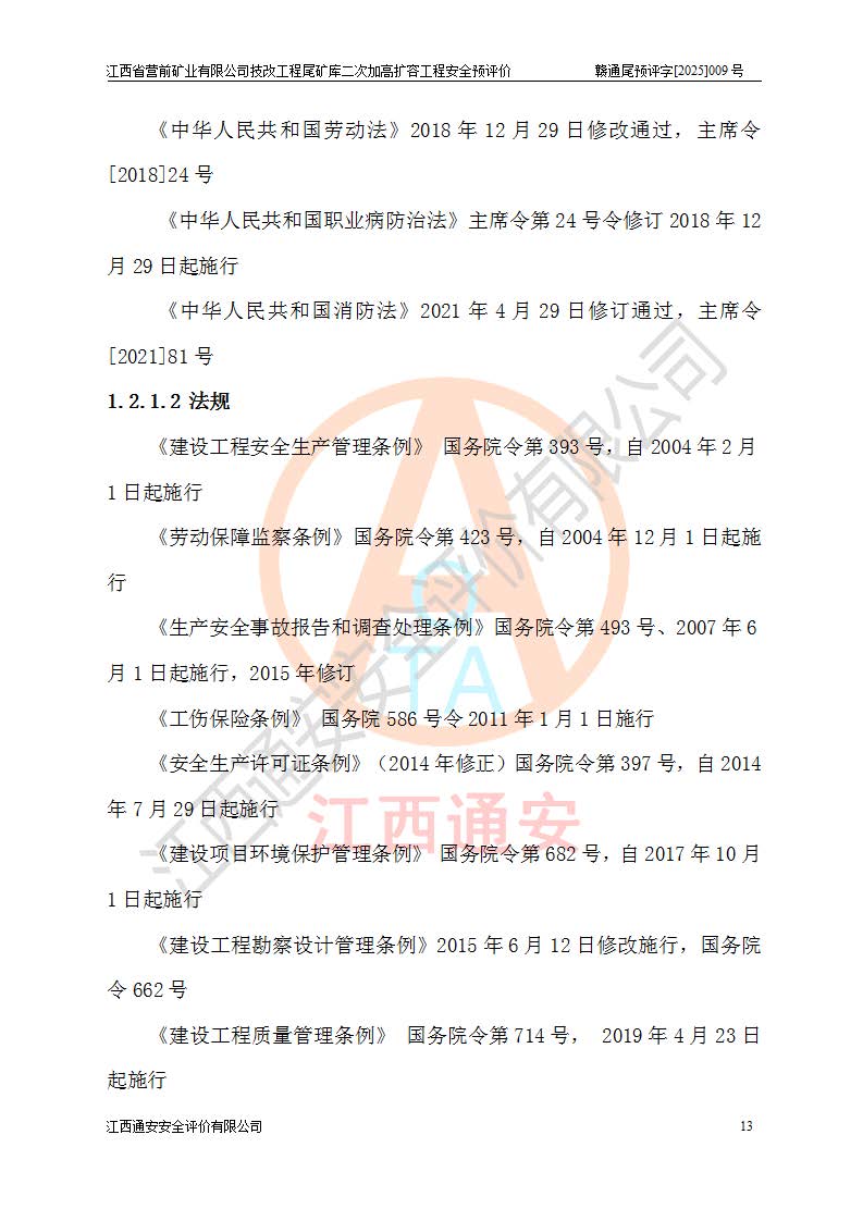 江西省营前矿业有限公司于2003年12月16日成立,位于赣州市上犹县营前镇焦里村境内,公司注册资本10000万元,法定**人陈雅博,矿区地理坐标:东经114°18′30″~114°19′00″,北纬25°52′35″~25°53′47″。公司经营范围包括:铅矿、锌、钨、银地下开采、销售。 江西省营前矿业有限公司技改工程尾矿库位于焦里钨银铅锌矿区,处于上犹县水岩乡井子村坑尾自然村境内,为山谷型尾矿库。 江西省营前矿业有限公司技改工程尾矿库于2013年由福建省冶金工业设计院设计,2014年8月开始施工建设,2015年4月竣工开始试运行,2015年11月完成竣工验收,2016年1月首次取得安全生产许可证,2019年1月完成延期换证,2020年8月委托金建工程设计有限公司进行尾矿库加高扩容工作,2020年10月21日取得了江西省应急管理厅下发的《关于江西省营前矿业有限公司技改工程尾矿库加高扩容工程安全设施设计的审查意见》(赣应急非煤项目设审〔2020〕46号),之后委托驻马店市黄淮建设工程有限公司负责施工,云南润滇工程技术有限公司负责监理,2021年12月完成加高扩容竣工验收工作,经过延期,现尾矿库安全生产许可证编号(赣)FM安许证字[2016]M1692号,**期为2025年01月18日至2028年01月17日。 江西省营前矿业有限公司技改工程尾矿库为山谷型尾矿库,初期坝为透水堆石坝,坝顶高程为330.0m,初期坝高25.0m,后期采用上游式尾矿堆积坝,加高扩容后*终坝顶高程为380.0m,堆积坝高50.0m,总坝高为75.0m,总库容为为503.14×104m3,尾矿库为三等库。尾矿库初期坝以上总汇水面积3.53km2,防洪标准取500年一遇。 目前尾矿库由初期坝、堆积坝、库内排洪系统(双格排水斜槽+连接井+排水涵洞+排洪隧洞+排水陡槽+消力池)、1#拦洪坝、1#分洪隧洞、2#拦洪坝、2#分洪隧洞和安全监测设施组成。根据建设单位提供的尾矿库平面布置图,截至2024年12月,现状尾矿库堆积坝顶高程为372.2m,现状总坝高67.2m,滩顶高程为369.8m,现状全库容387.51×104m3,现状尾矿库为三等库,原加高扩容设计*终堆积坝顶高程为380.0m,现剩余库容115.63×104m3,剩余**库容约92.5×104m3,剩余服务年限约4.5年;矿山现有储量较大,剩余库容及服务年限不满足矿山后期生产需要。 技改工程尾矿库尾矿坝下游1**范围无居民,不存在工矿企业等建构筑物,不属于“头顶库”;尾矿库不压矿;距赣江直线距离60**;不涉及保护区及生态红线;尾矿库所在沟谷较长,谷底平均纵坡9%,上游周边山体地形有利于尾矿库二次加高扩容工程的实施,因此为了增加尾矿库库容,延长服务年限,充分利用尾矿库所在沟谷地形,江西省营前矿业有限公司对技改尾矿库进行二次加高扩容。 2024年12月,江西省营前矿业有限公司委托地矿赣西地质工程勘察院编制了《江西省营前矿业有限公司技改工程尾矿库二次扩容工程(水文)地质勘察报告》,2025年4月,江西省营前矿业有限公司委托金建工程设计有限公司编制了《江西省营前矿业有限公司技改工程尾矿库二次加高扩容工程可行性研究报告》。 按照非煤矿山建设项目安全设施“三同时”的规定要求,技改工程尾矿库为二次加高扩容工程,**进行安全预评价;江西省营前矿业有限公司委托我公司承担技改工程尾矿库二次加高扩容工程建设项目的安全预评价工作。 |