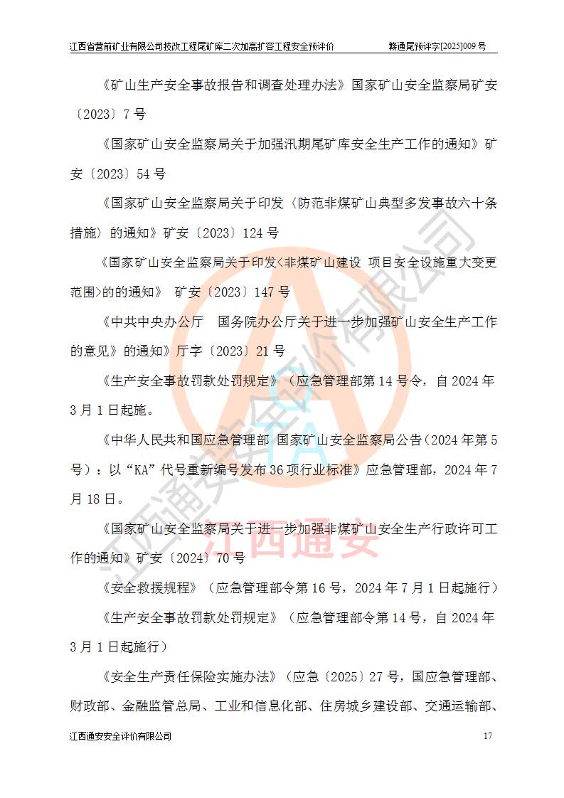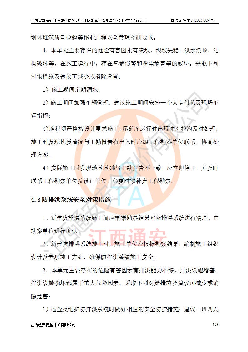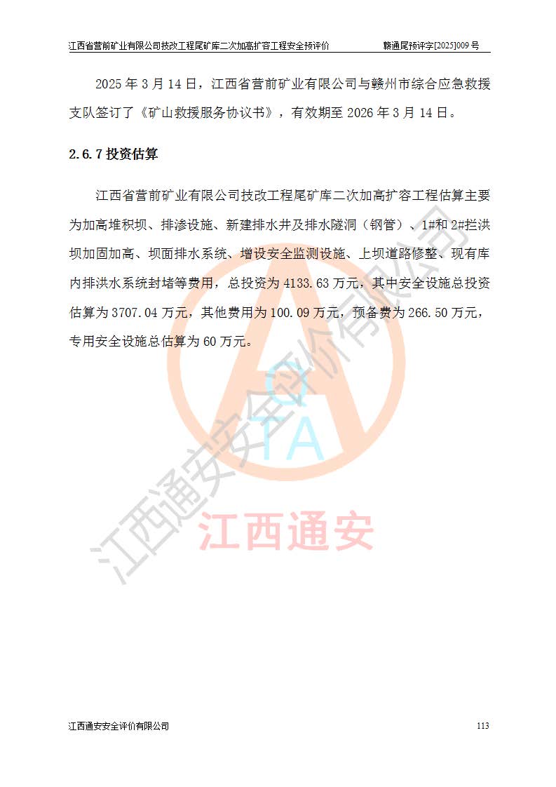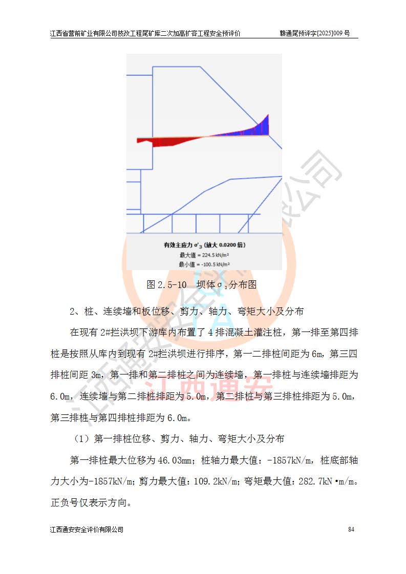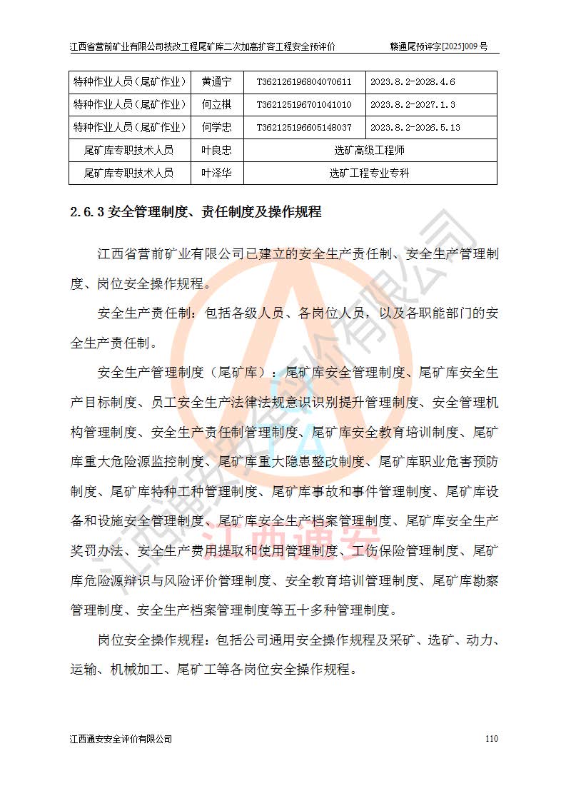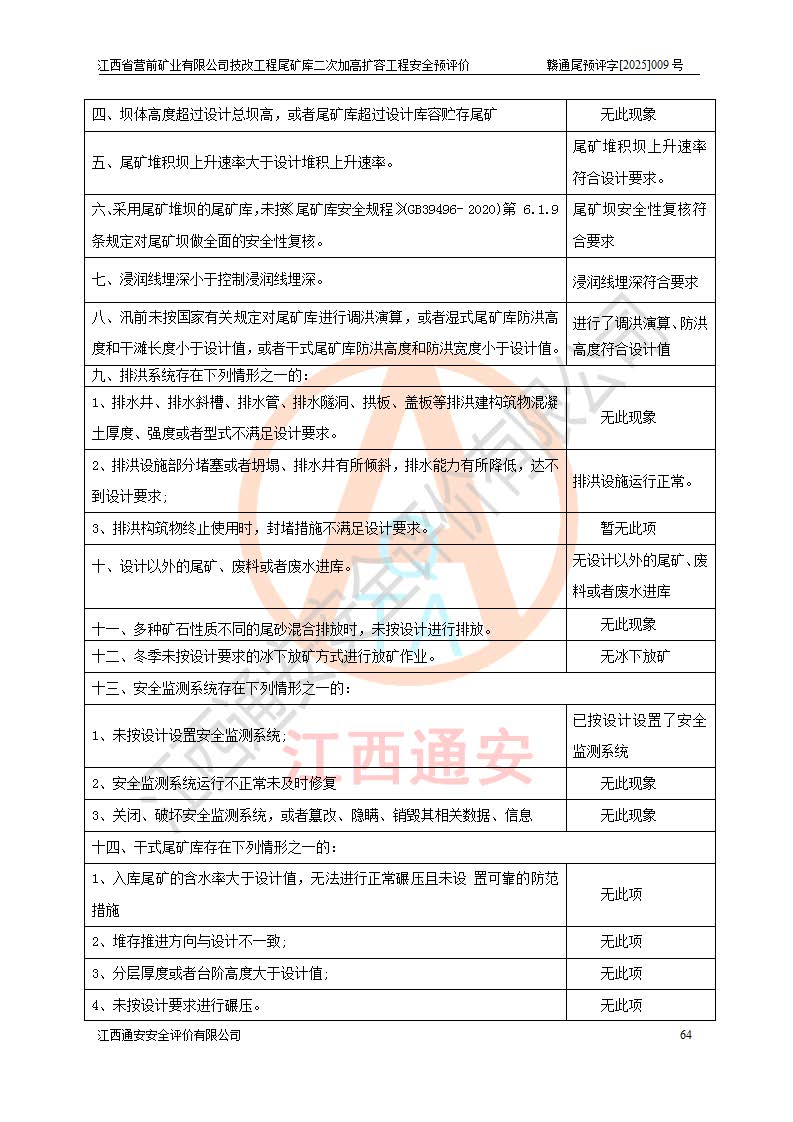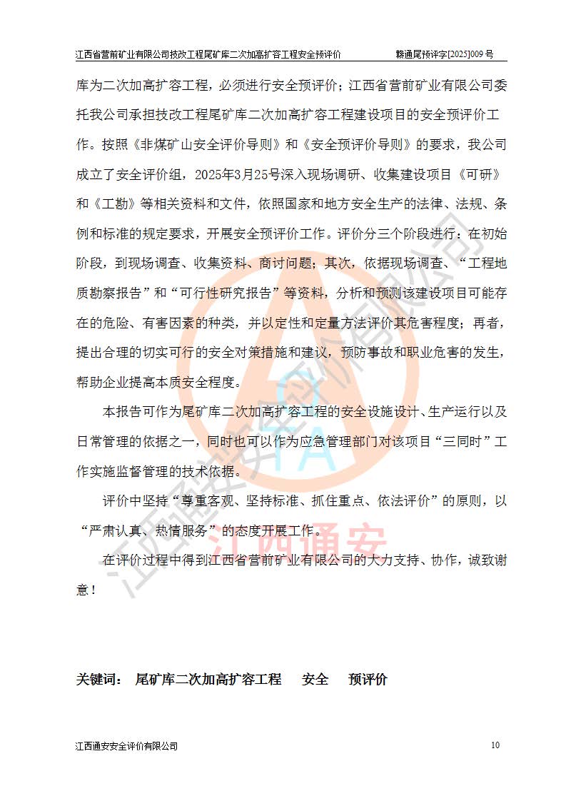江西省营前矿业有限公司于2003年12月16日成立,位于赣州市上犹县营前镇焦里村境内,公司注册资本10000万元,法定**人陈雅博,矿区地理坐标:东经114°18′30″~114°19′00″,北纬25°52′35″~25°53′47″。公司经营范围包括:铅矿、锌、钨、银地下开采、销售。 江西省营前矿业有限公司技改工程尾矿库位于焦里钨银铅锌矿区,处于上犹县水岩乡井子村坑尾自然村境内,为山谷型尾矿库。 江西省营前矿业有限公司技改工程尾矿库于2013年由福建省冶金工业设计院设计,2014年8月开始施工建设,2015年4月竣工开始试运行,2015年11月完成竣工验收,2016年1月首次取得安全生产许可证,2019年1月完成延期换证,2020年8月委托金建工程设计有限公司进行尾矿库加高扩容工作,2020年10月21日取得了江西省应急管理厅下发的《关于江西省营前矿业有限公司技改工程尾矿库加高扩容工程安全设施设计的审查意见》(赣应急非煤项目设审〔2020〕46号),之后委托驻马店市黄淮建设工程有限公司负责施工,云南润滇工程技术有限公司负责监理,2021年12月完成加高扩容竣工验收工作,经过延期,现尾矿库安全生产许可证编号(赣)FM安许证字[2016]M1692号,**期为2025年01月18日至2028年01月17日。 江西省营前矿业有限公司技改工程尾矿库为山谷型尾矿库,初期坝为透水堆石坝,坝顶高程为330.0m,初期坝高25.0m,后期采用上游式尾矿堆积坝,加高扩容后*终坝顶高程为380.0m,堆积坝高50.0m,总坝高为75.0m,总库容为为503.14×104m3,尾矿库为三等库。尾矿库初期坝以上总汇水面积3.53km2,防洪标准取500年一遇。 目前尾矿库由初期坝、堆积坝、库内排洪系统(双格排水斜槽+连接井+排水涵洞+排洪隧洞+排水陡槽+消力池)、1#拦洪坝、1#分洪隧洞、2#拦洪坝、2#分洪隧洞和安全监测设施组成。根据建设单位提供的尾矿库平面布置图,截至2024年12月,现状尾矿库堆积坝顶高程为372.2m,现状总坝高67.2m,滩顶高程为369.8m,现状全库容387.51×104m3,现状尾矿库为三等库,原加高扩容设计*终堆积坝顶高程为380.0m,现剩余库容115.63×104m3,剩余**库容约92.5×104m3,剩余服务年限约4.5年;矿山现有储量较大,剩余库容及服务年限不满足矿山后期生产需要。 技改工程尾矿库尾矿坝下游1**范围无居民,不存在工矿企业等建构筑物,不属于“头顶库”;尾矿库不压矿;距赣江直线距离60**;不涉及保护区及生态红线;尾矿库所在沟谷较长,谷底平均纵坡9%,上游周边山体地形有利于尾矿库二次加高扩容工程的实施,因此为了增加尾矿库库容,延长服务年限,充分利用尾矿库所在沟谷地形,江西省营前矿业有限公司对技改尾矿库进行二次加高扩容。 2024年12月,江西省营前矿业有限公司委托地矿赣西地质工程勘察院编制了《江西省营前矿业有限公司技改工程尾矿库二次扩容工程(水文)地质勘察报告》,2025年4月,江西省营前矿业有限公司委托金建工程设计有限公司编制了《江西省营前矿业有限公司技改工程尾矿库二次加高扩容工程可行性研究报告》。 按照非煤矿山建设项目安全设施“三同时”的规定要求,技改工程尾矿库为二次加高扩容工程,**进行安全预评价;江西省营前矿业有限公司委托我公司承担技改工程尾矿库二次加高扩容工程建设项目的安全预评价工作。 |