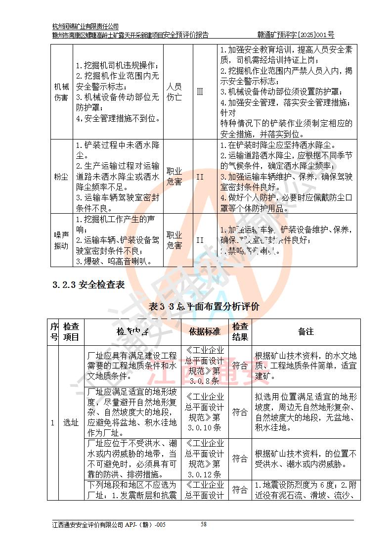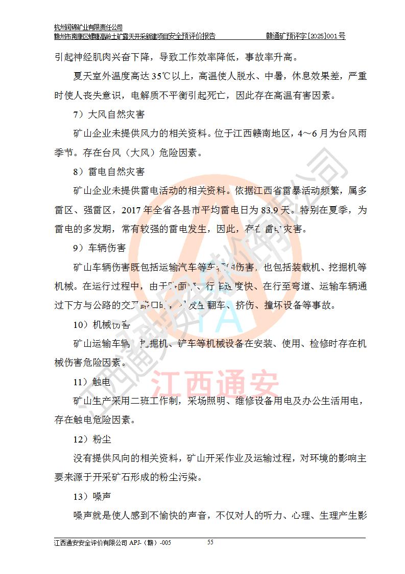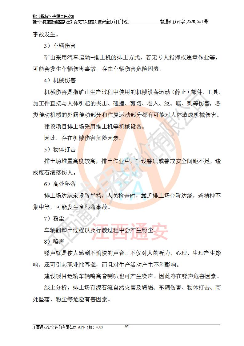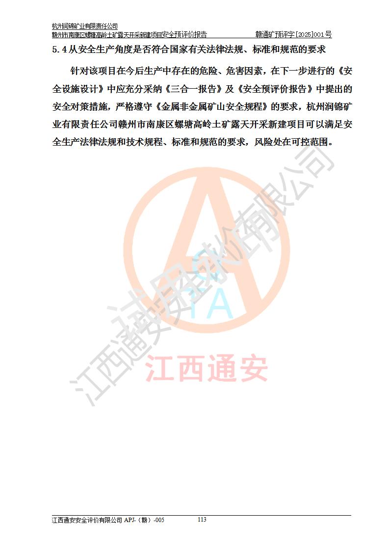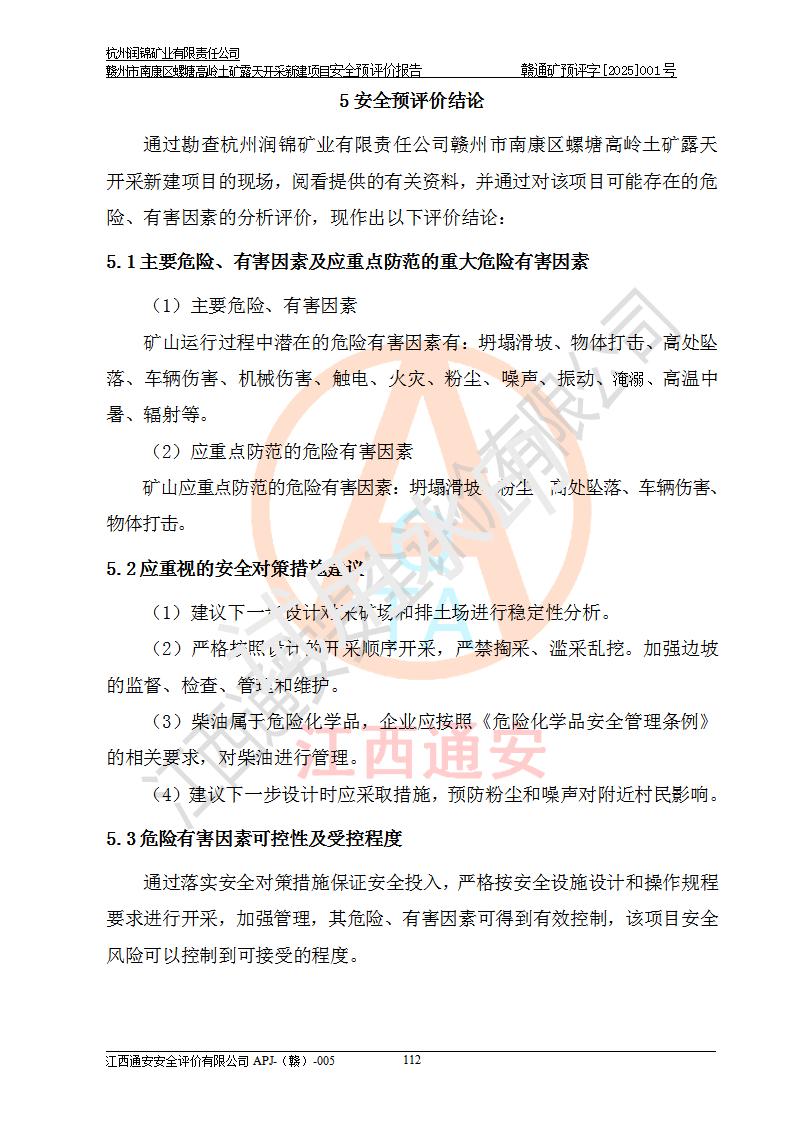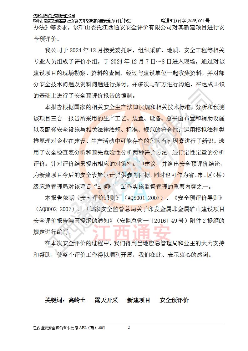 其它 | 评价范围为该新建项目《采矿许可证》划定范围内(平面范围面积:0.0839km2,垂直范围:标高+355m~+285m)拟选用的生产系统(设备设施、采矿工艺)和辅助设施的安全设施、总平面布置(包括项目选址、与周边环境的相互影响)等安全生产管理。 该公司的**问题、产品的厂外运输等不在本次评价范围内。 运用模拟法和类推原理对企业在建设、生产活动中可能存在的危险有害因素进行了辨识。 选用了安全检查表分析和预先危险性分析两种评价方法,进行定性定量的分析评价。 针对评价结果提出相应的对策措施和建议, 针对该项目在今后生产中存在的危险、危害因素,在下一步进行的《安全设施设计》中应充分采纳《三合一报告》及《安全预评价报告》中提出的安全对策措施,严格遵守《金属非金属矿山安全规程》的要求,杭州润锦矿业有限责任公司赣州市南康区螺塘高岭土矿露天开采新建项目可以满足安全生产法律法规和技术规程、标准和规范的要求,风险处在可控范围。 | ||||