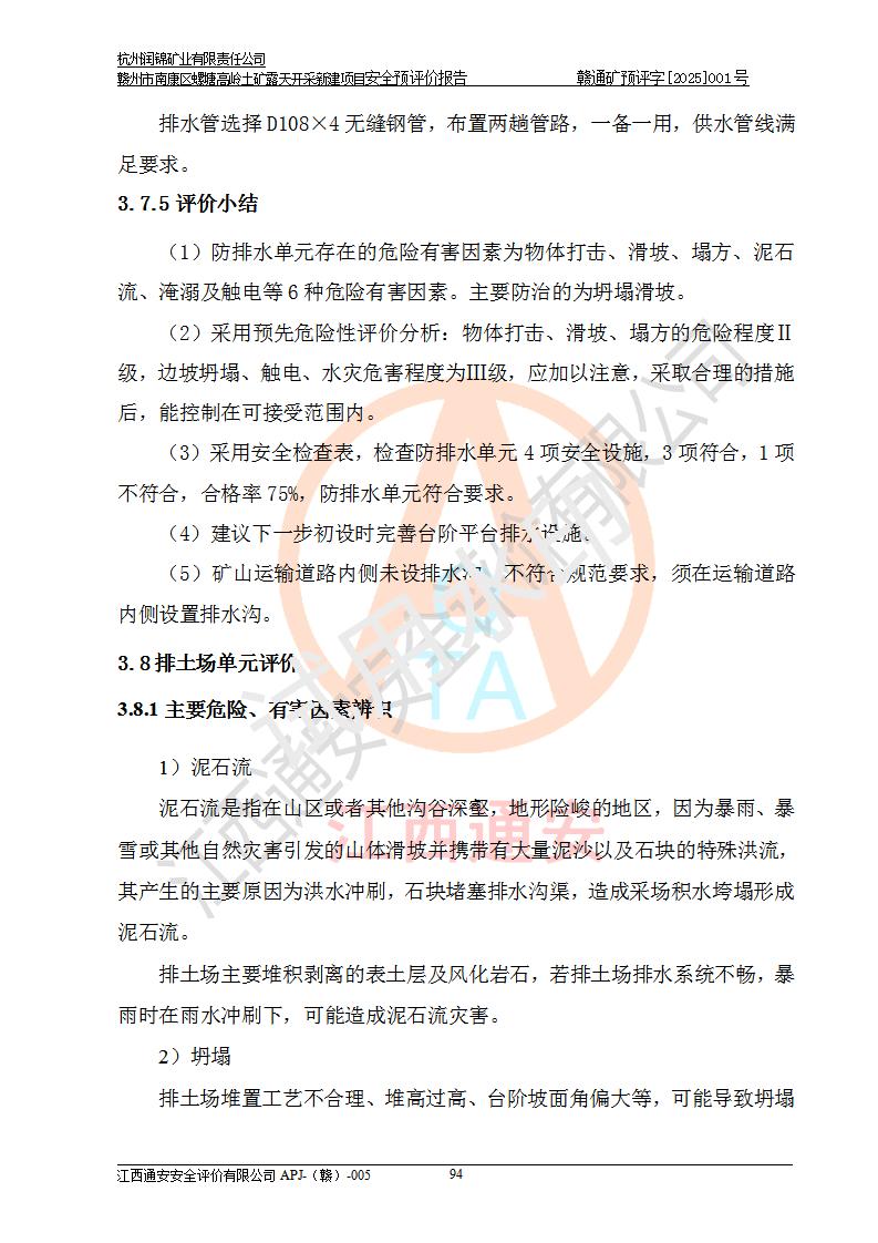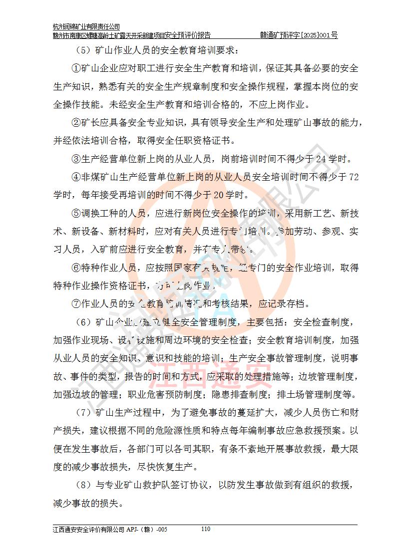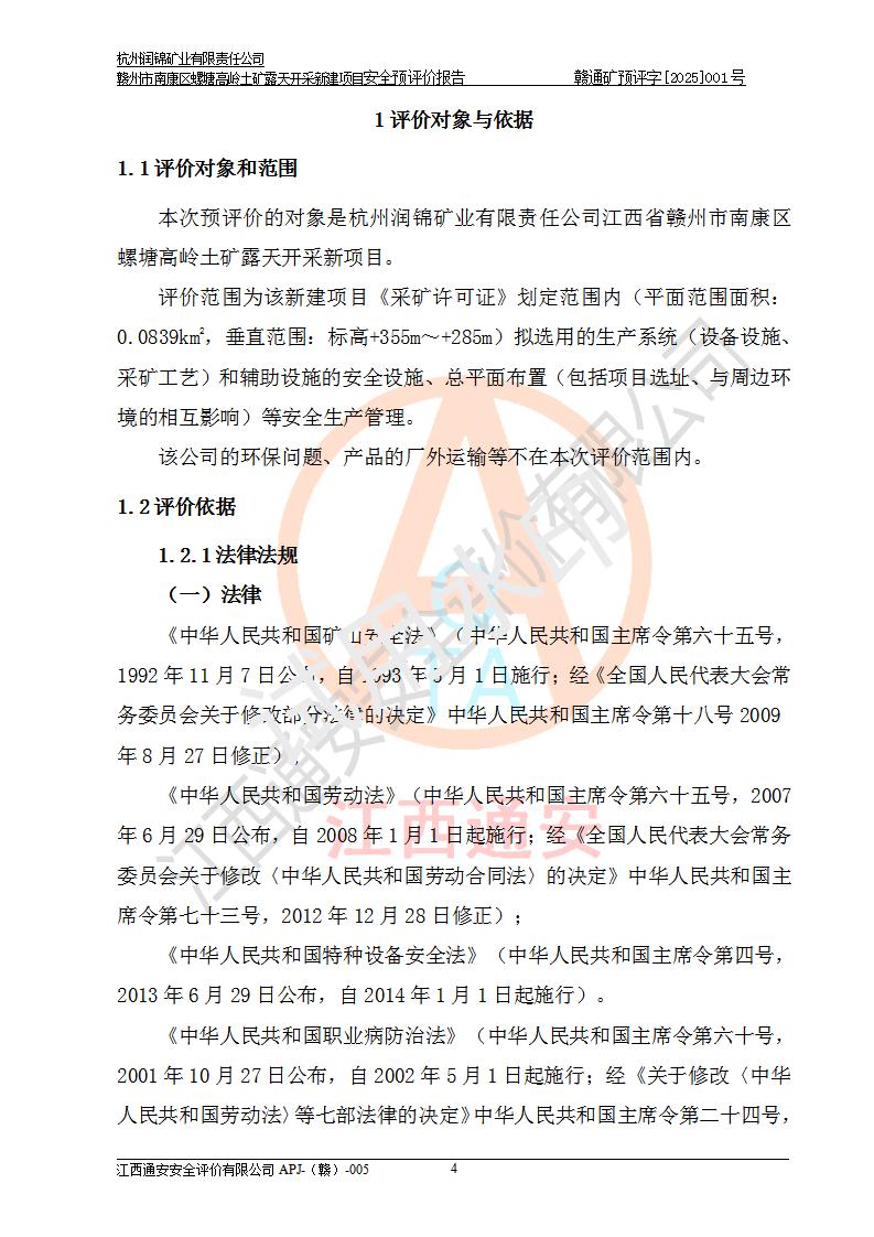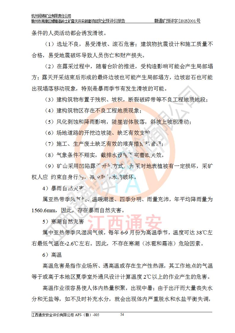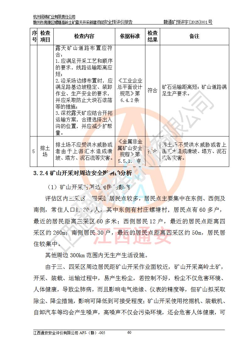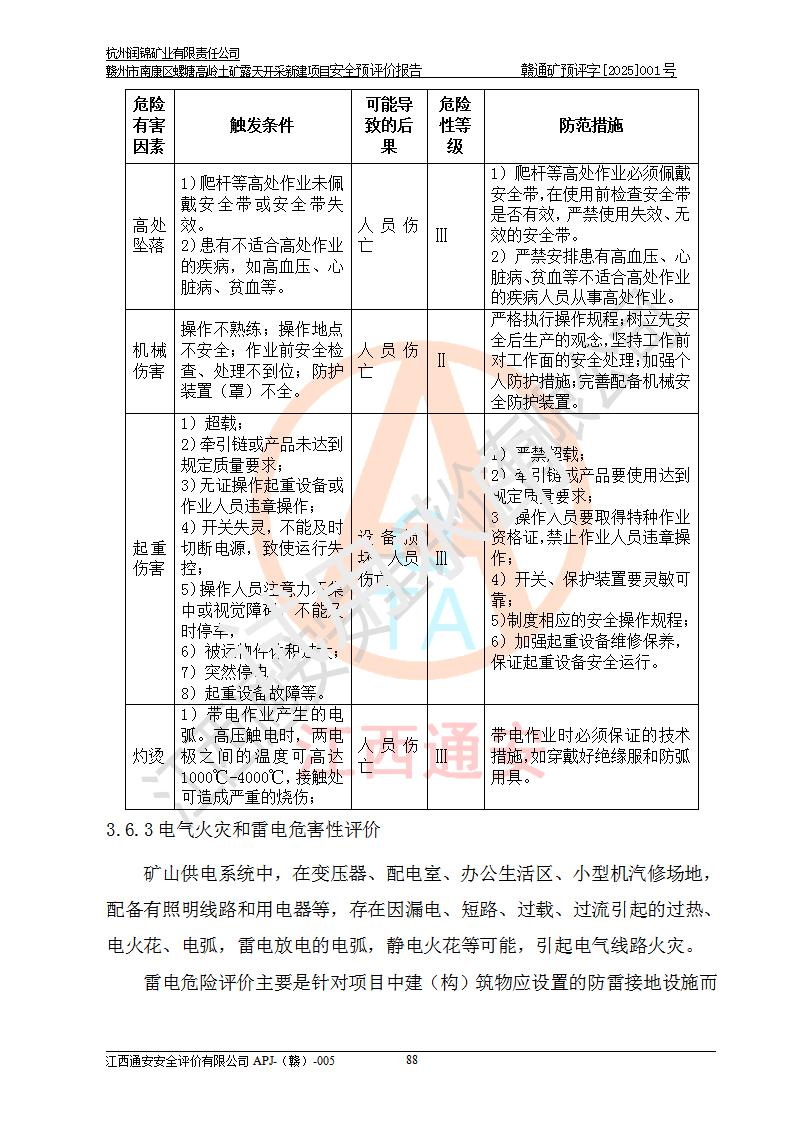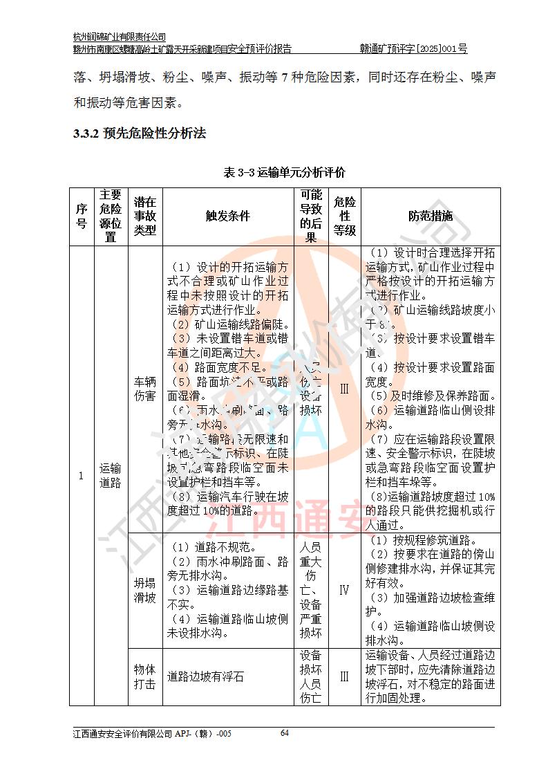 其它 | 评价范围为该新建项目《采矿许可证》划定范围内(平面范围面积:0.0839km2,垂直范围:标高+355m~+285m)拟选用的生产系统(设备设施、采矿工艺)和辅助设施的安全设施、总平面布置(包括项目选址、与周边环境的相互影响)等安全生产管理。 该公司的**问题、产品的厂外运输等不在本次评价范围内。 运用模拟法和类推原理对企业在建设、生产活动中可能存在的危险有害因素进行了辨识。 选用了安全检查表分析和预先危险性分析两种评价方法,进行定性定量的分析评价。 针对评价结果提出相应的对策措施和建议, 针对该项目在今后生产中存在的危险、危害因素,在下一步进行的《安全设施设计》中应充分采纳《三合一报告》及《安全预评价报告》中提出的安全对策措施,严格遵守《金属非金属矿山安全规程》的要求,杭州润锦矿业有限责任公司赣州市南康区螺塘高岭土矿露天开采新建项目可以满足安全生产法律法规和技术规程、标准和规范的要求,风险处在可控范围。 | ||||