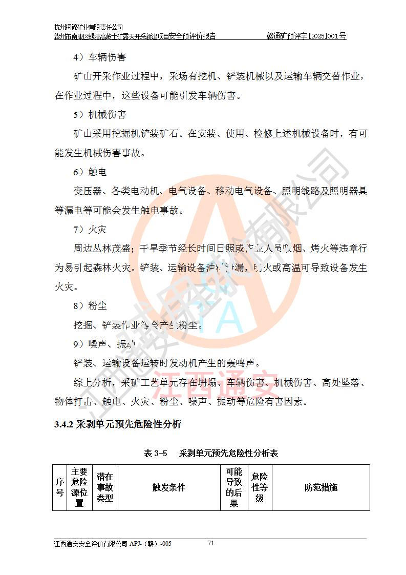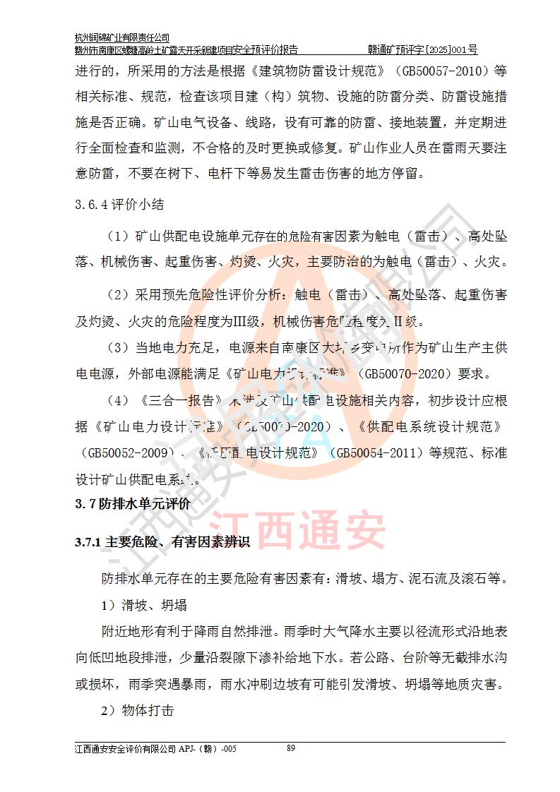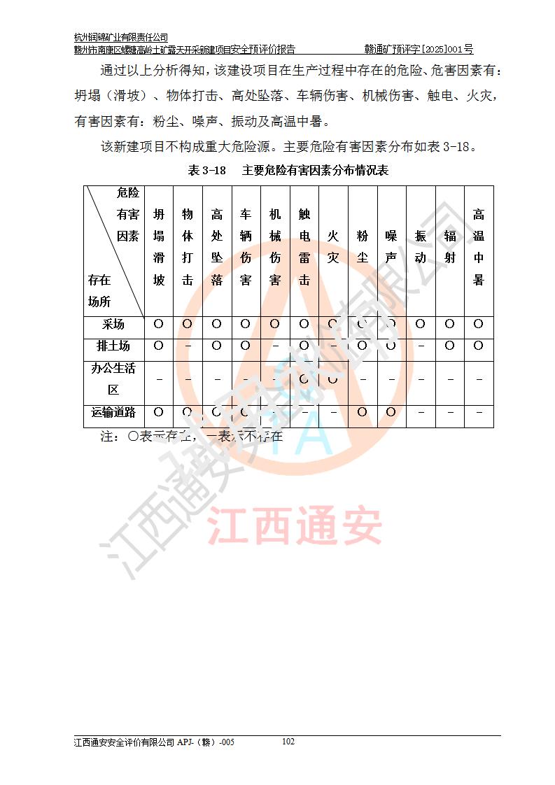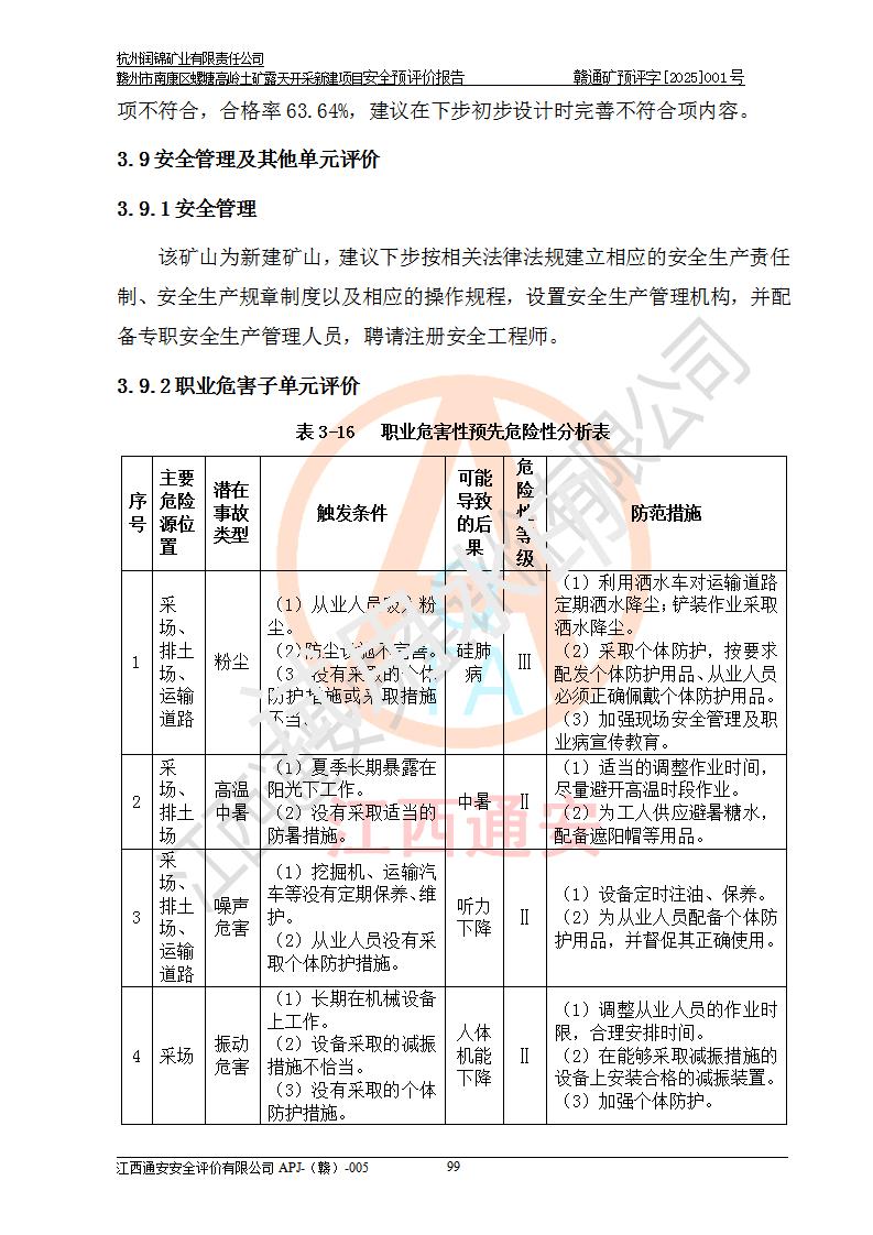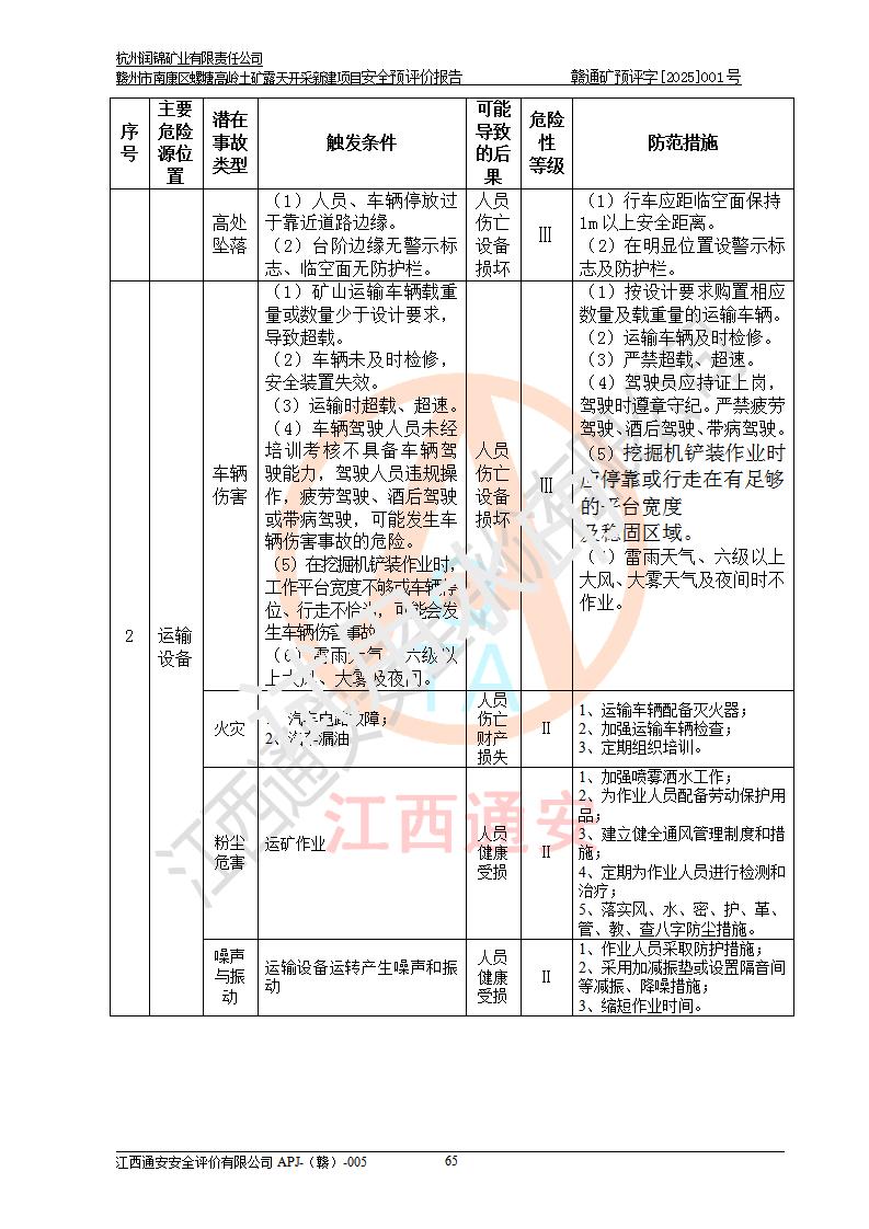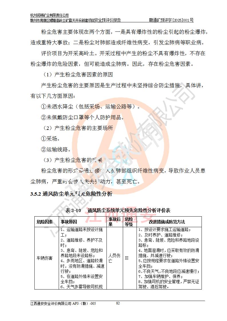 其它 | 评价范围为该新建项目《采矿许可证》划定范围内(平面范围面积:0.0839km2,垂直范围:标高+355m~+285m)拟选用的生产系统(设备设施、采矿工艺)和辅助设施的安全设施、总平面布置(包括项目选址、与周边环境的相互影响)等安全生产管理。 该公司的**问题、产品的厂外运输等不在本次评价范围内。 运用模拟法和类推原理对企业在建设、生产活动中可能存在的危险有害因素进行了辨识。 选用了安全检查表分析和预先危险性分析两种评价方法,进行定性定量的分析评价。 针对评价结果提出相应的对策措施和建议, 针对该项目在今后生产中存在的危险、危害因素,在下一步进行的《安全设施设计》中应充分采纳《三合一报告》及《安全预评价报告》中提出的安全对策措施,严格遵守《金属非金属矿山安全规程》的要求,杭州润锦矿业有限责任公司赣州市南康区螺塘高岭土矿露天开采新建项目可以满足安全生产法律法规和技术规程、标准和规范的要求,风险处在可控范围。 | ||||