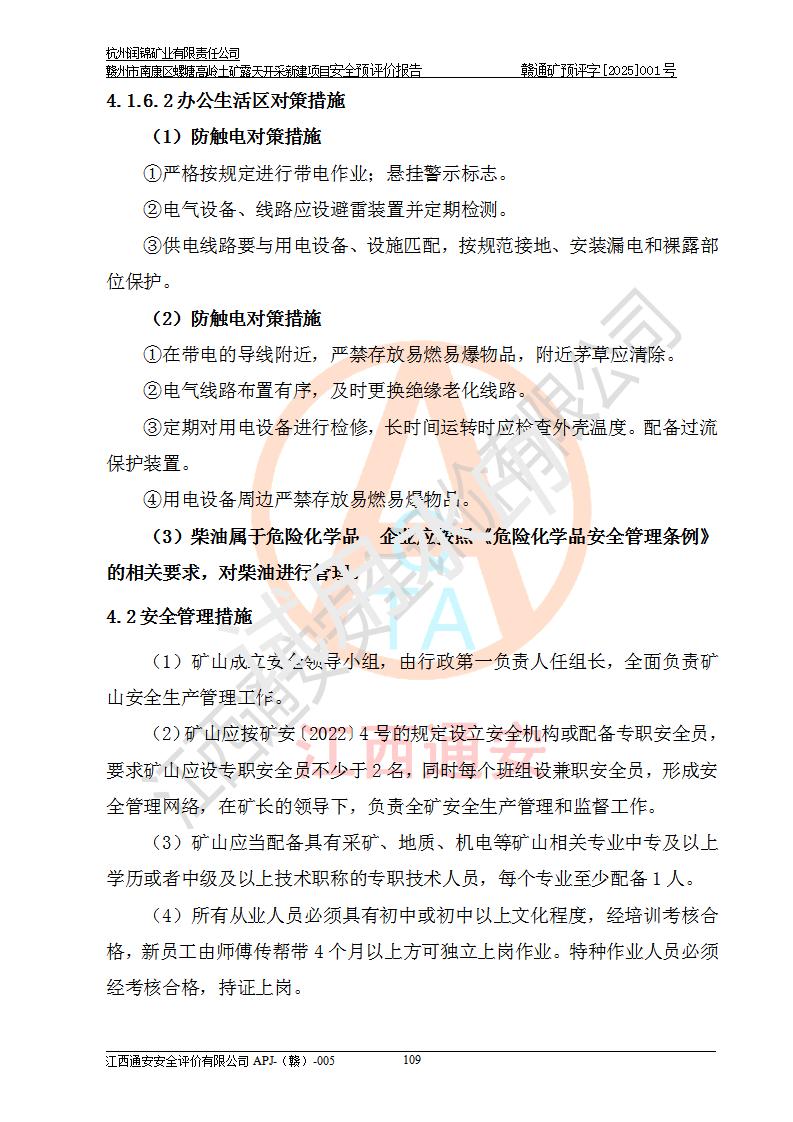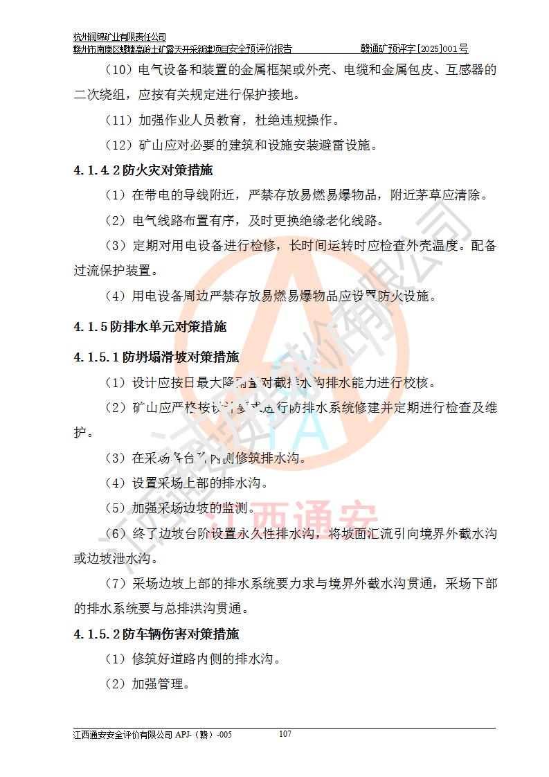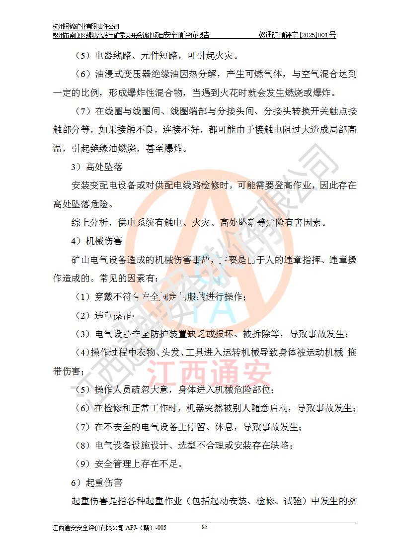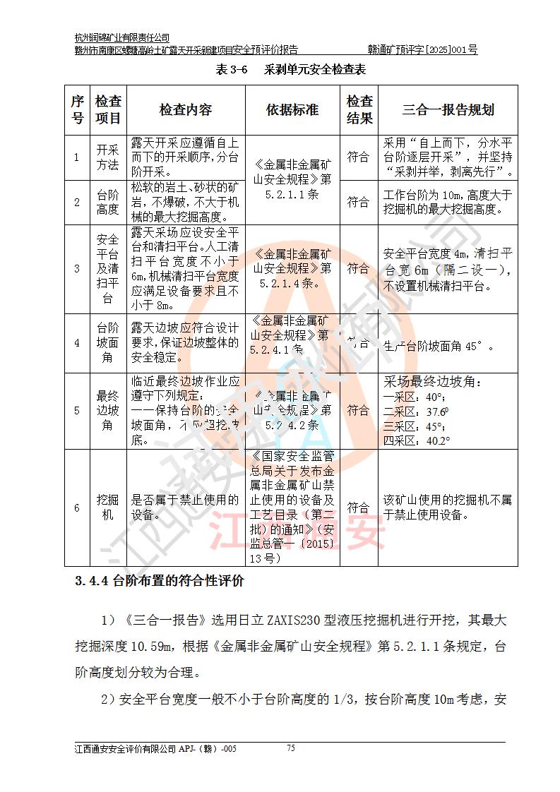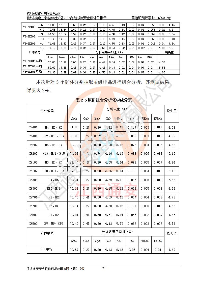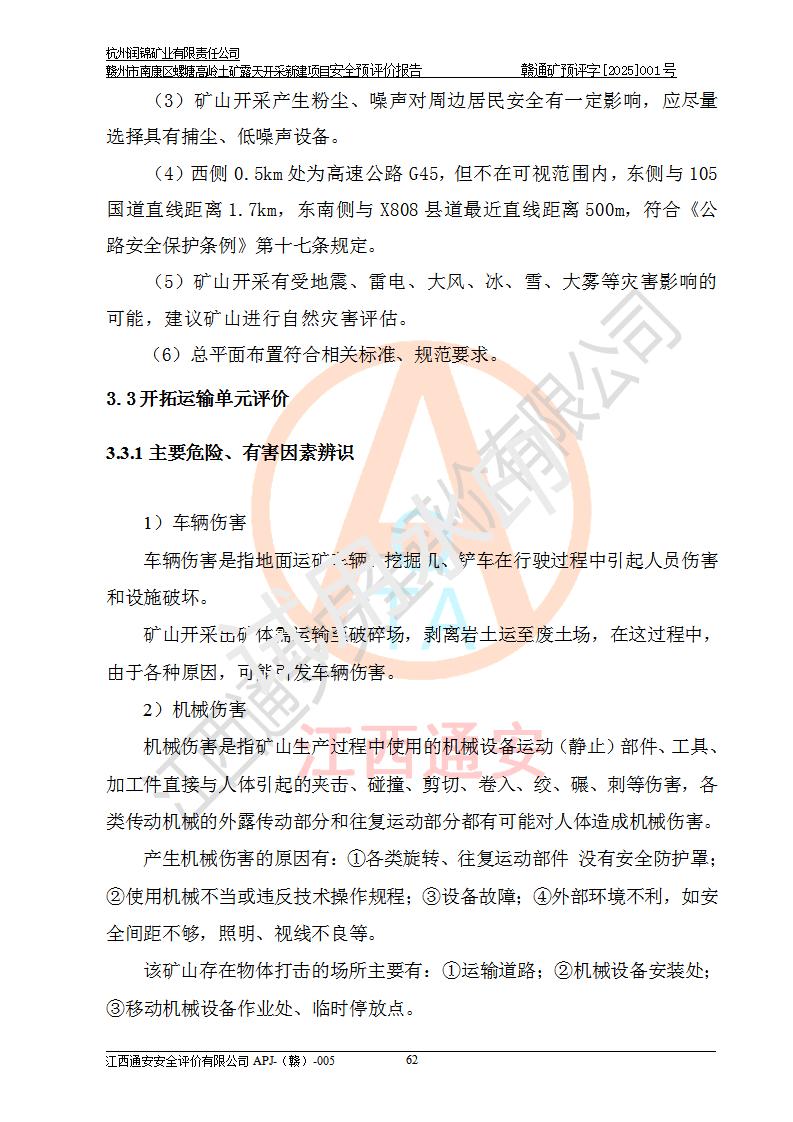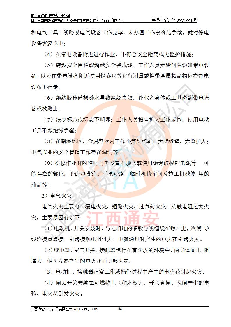 其它 | 评价范围为该新建项目《采矿许可证》划定范围内(平面范围面积:0.0839km2,垂直范围:标高+355m~+285m)拟选用的生产系统(设备设施、采矿工艺)和辅助设施的安全设施、总平面布置(包括项目选址、与周边环境的相互影响)等安全生产管理。 该公司的**问题、产品的厂外运输等不在本次评价范围内。 运用模拟法和类推原理对企业在建设、生产活动中可能存在的危险有害因素进行了辨识。 选用了安全检查表分析和预先危险性分析两种评价方法,进行定性定量的分析评价。 针对评价结果提出相应的对策措施和建议, 针对该项目在今后生产中存在的危险、危害因素,在下一步进行的《安全设施设计》中应充分采纳《三合一报告》及《安全预评价报告》中提出的安全对策措施,严格遵守《金属非金属矿山安全规程》的要求,杭州润锦矿业有限责任公司赣州市南康区螺塘高岭土矿露天开采新建项目可以满足安全生产法律法规和技术规程、标准和规范的要求,风险处在可控范围。 | ||||