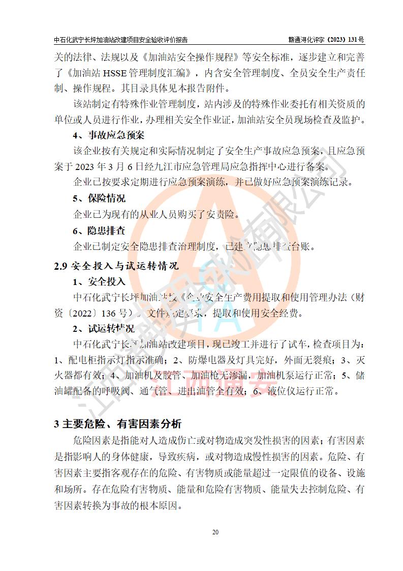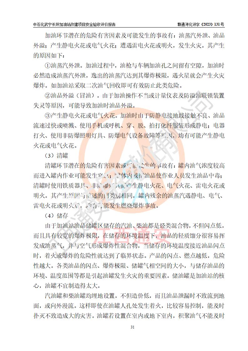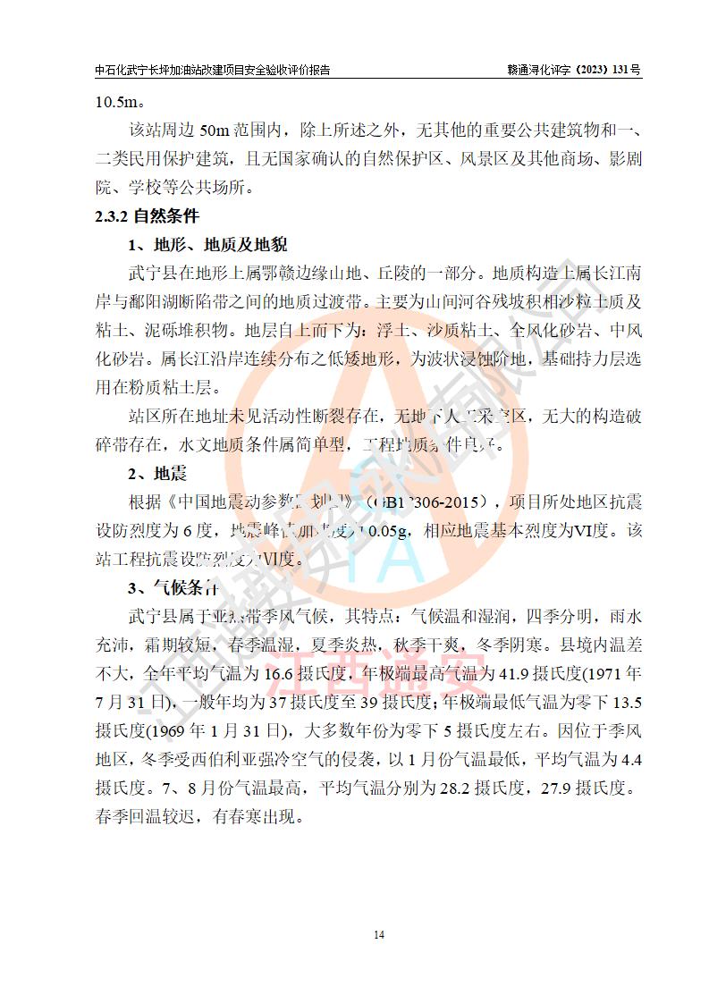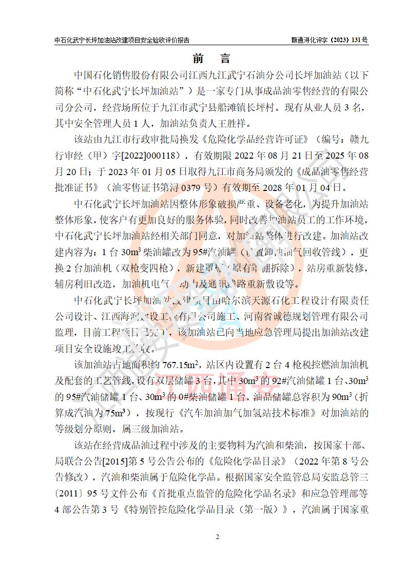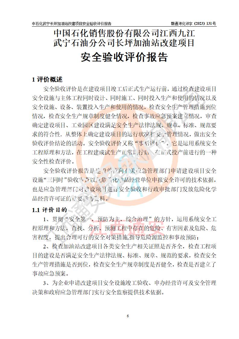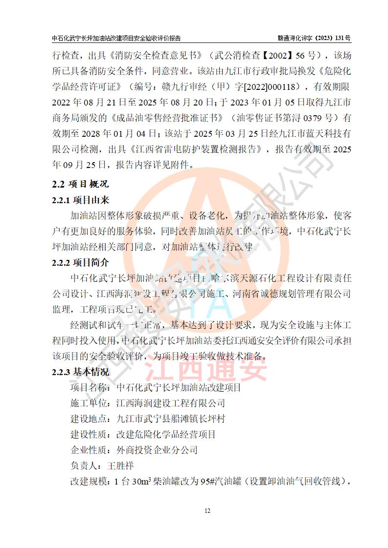评价报告名称 | 中国石化销售股份有限公司江西九江武宁石油分公司长坪加油站改建项目安全验收评价报告 | |||