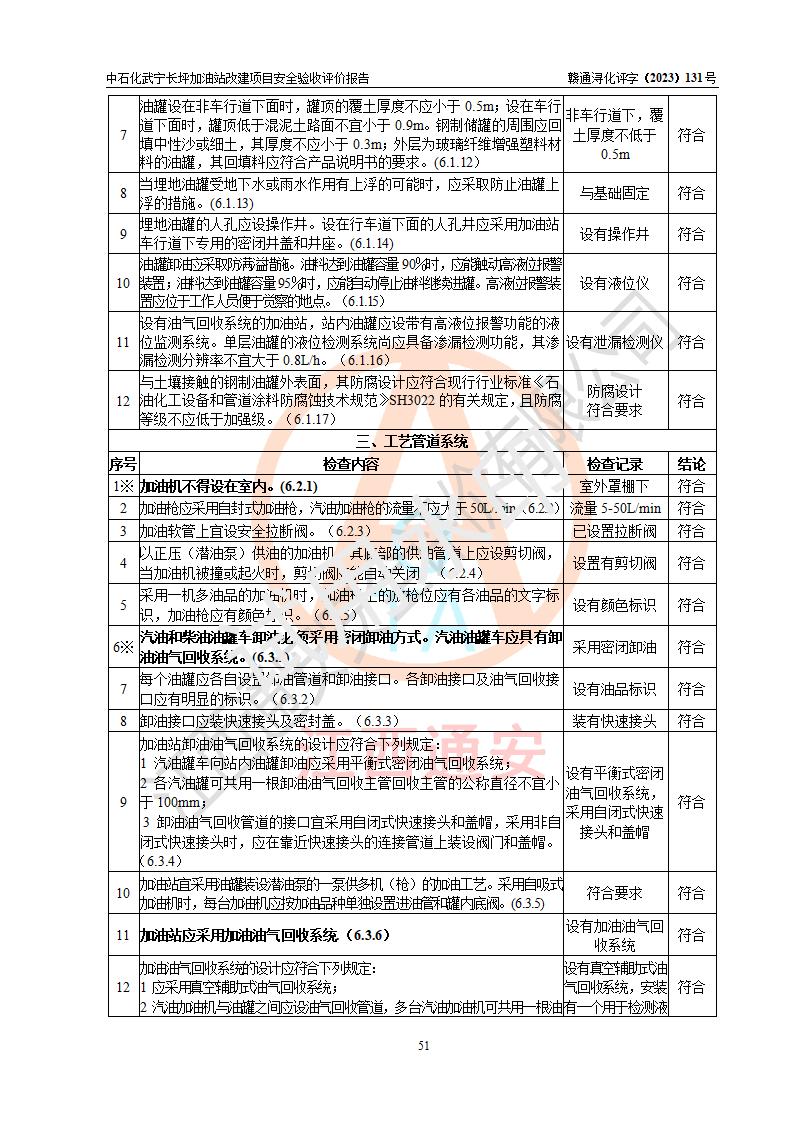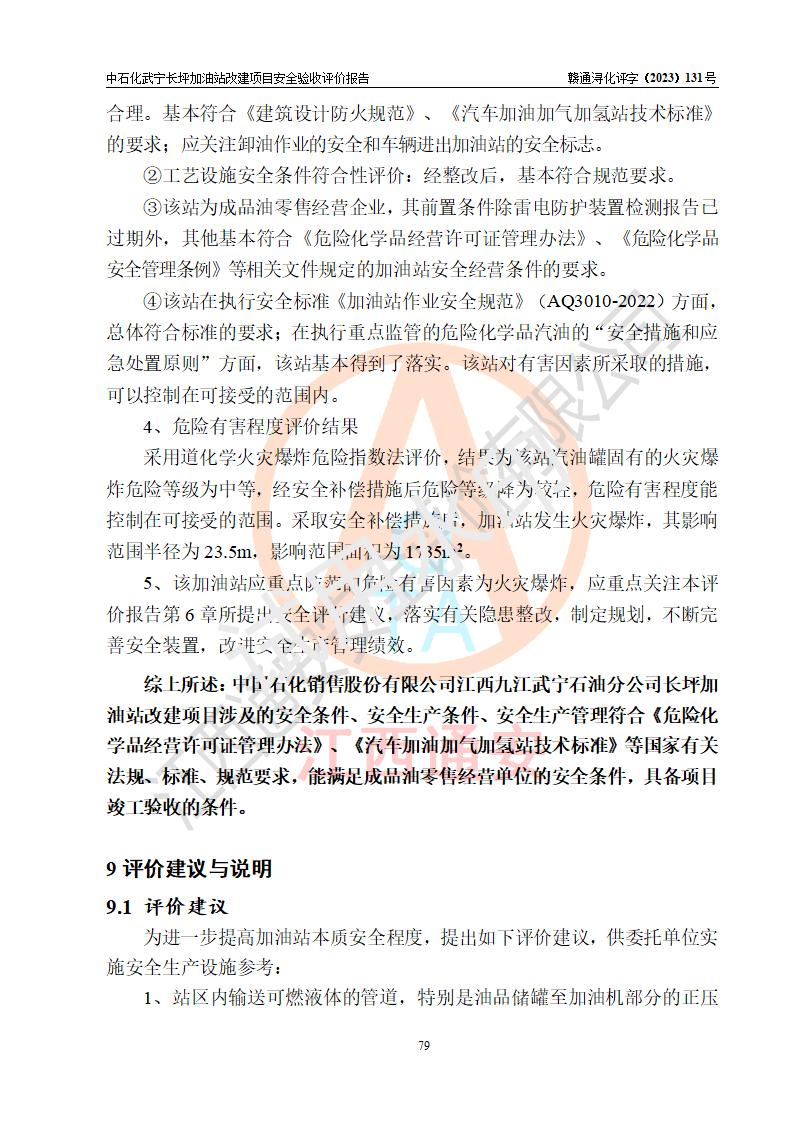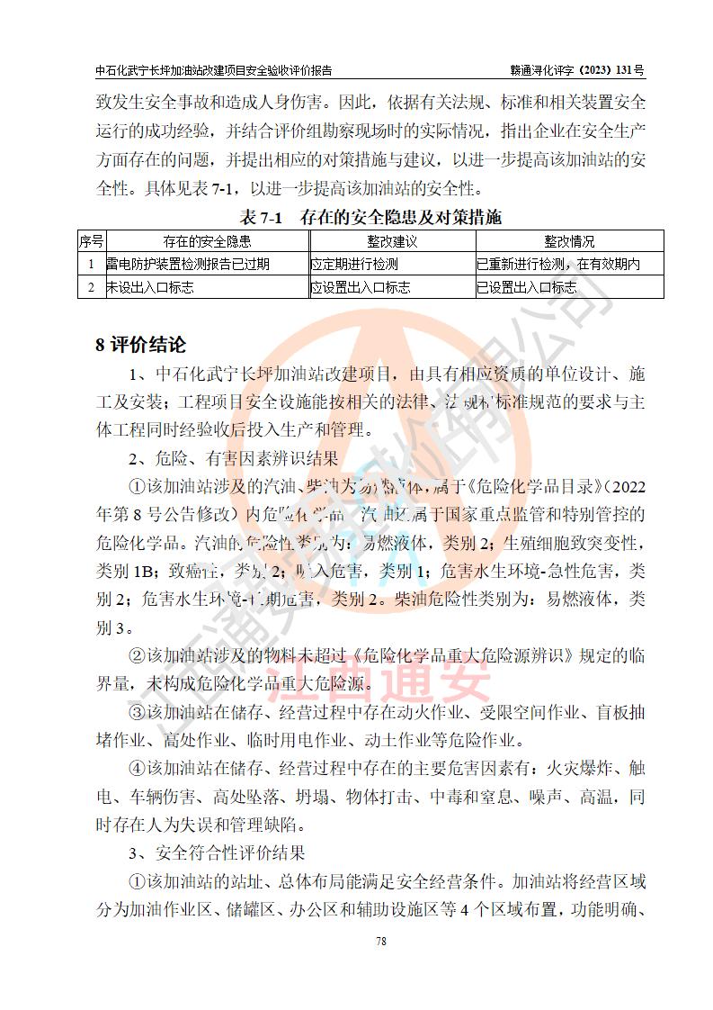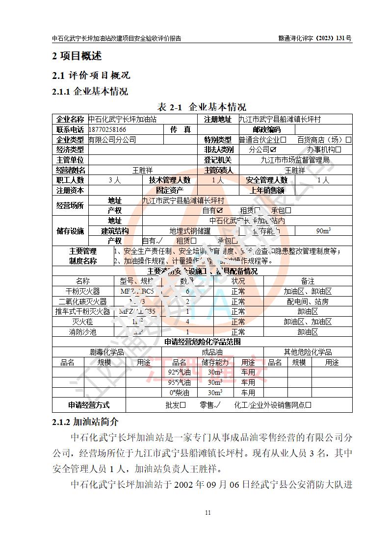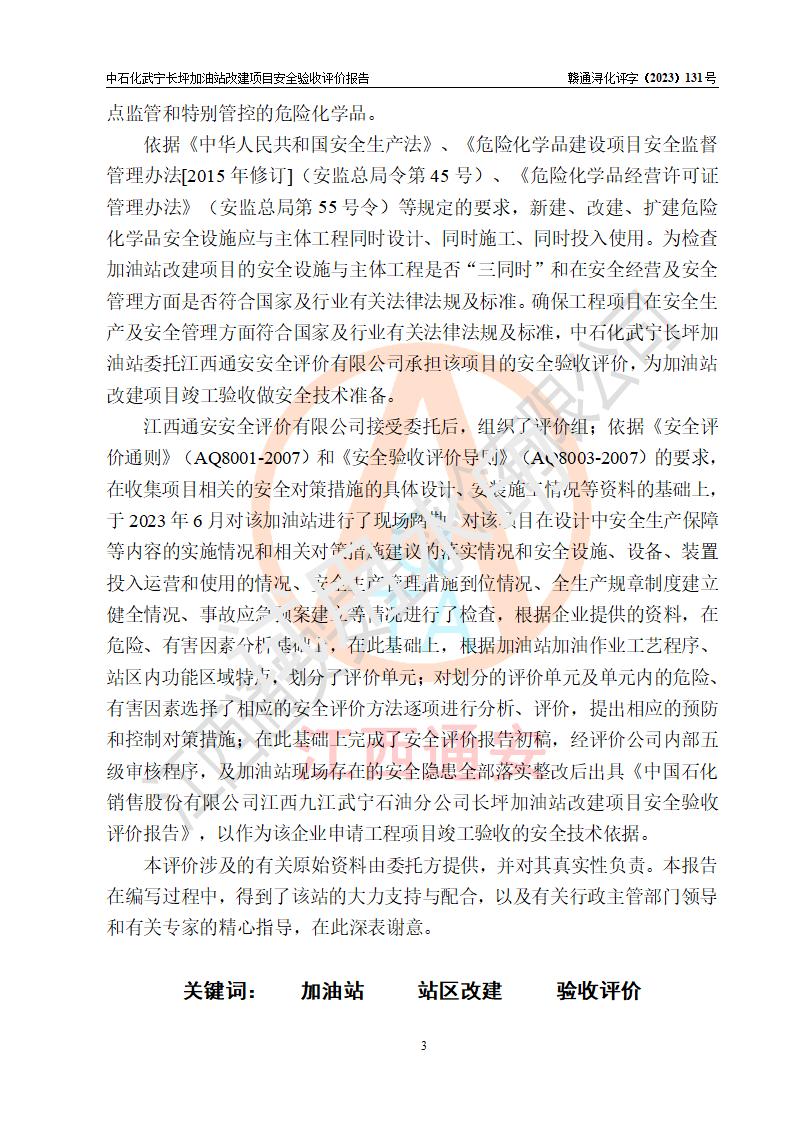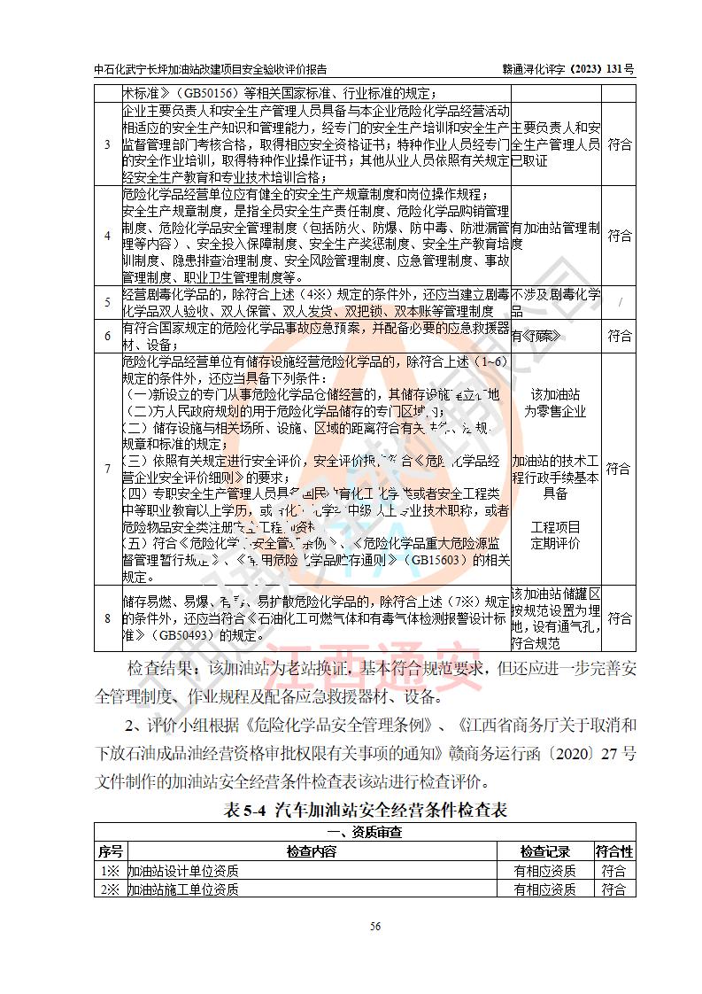 评价结论 | 中国石化销售股份有限公司江西九江武宁石油分公司长坪加油站改建项目涉及的安全条件、安全生产条件、安全生产管理符合《危险化学品经营许可证管理办法》、《汽车加油加气加氢站技术标准》等**有关法规、标准、规范要求,能满足成品油零售经营单位的安全条件,具备项目竣工验收的条件。 | |||
