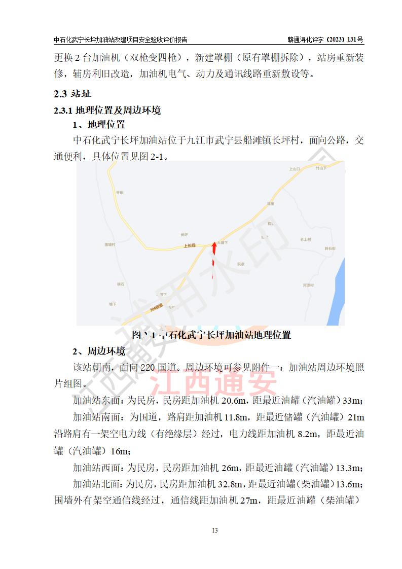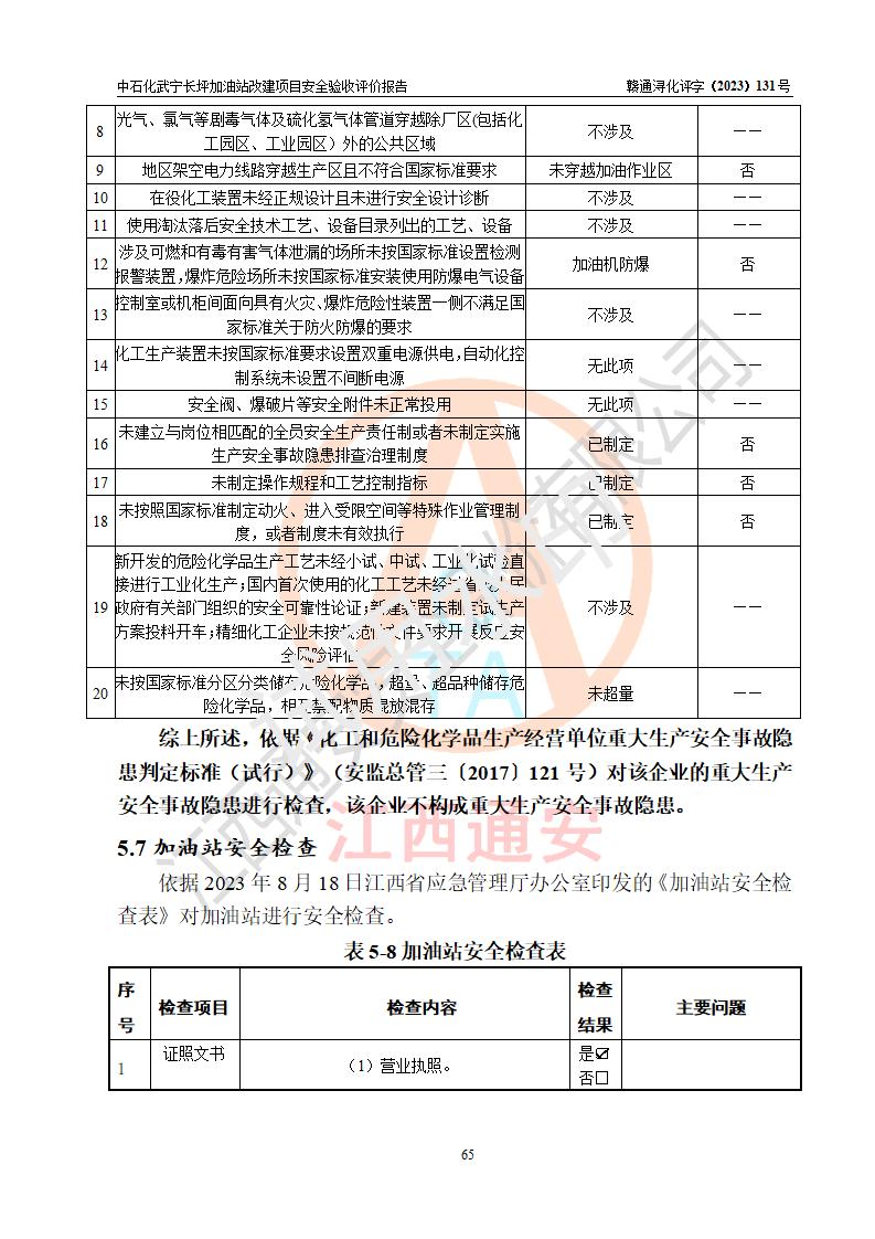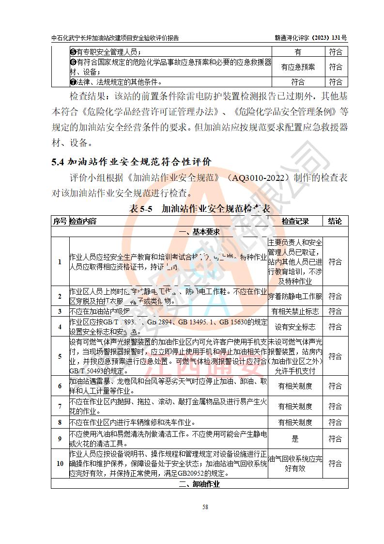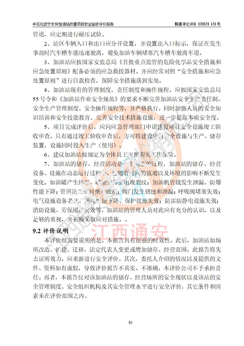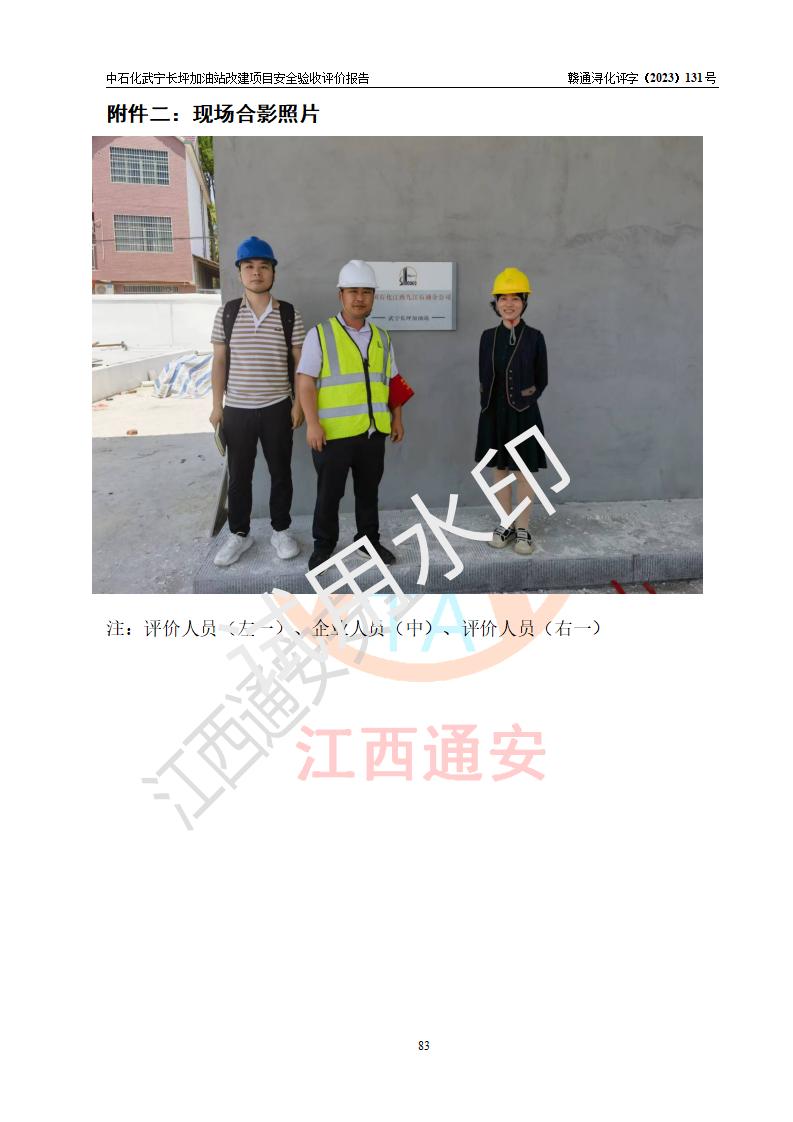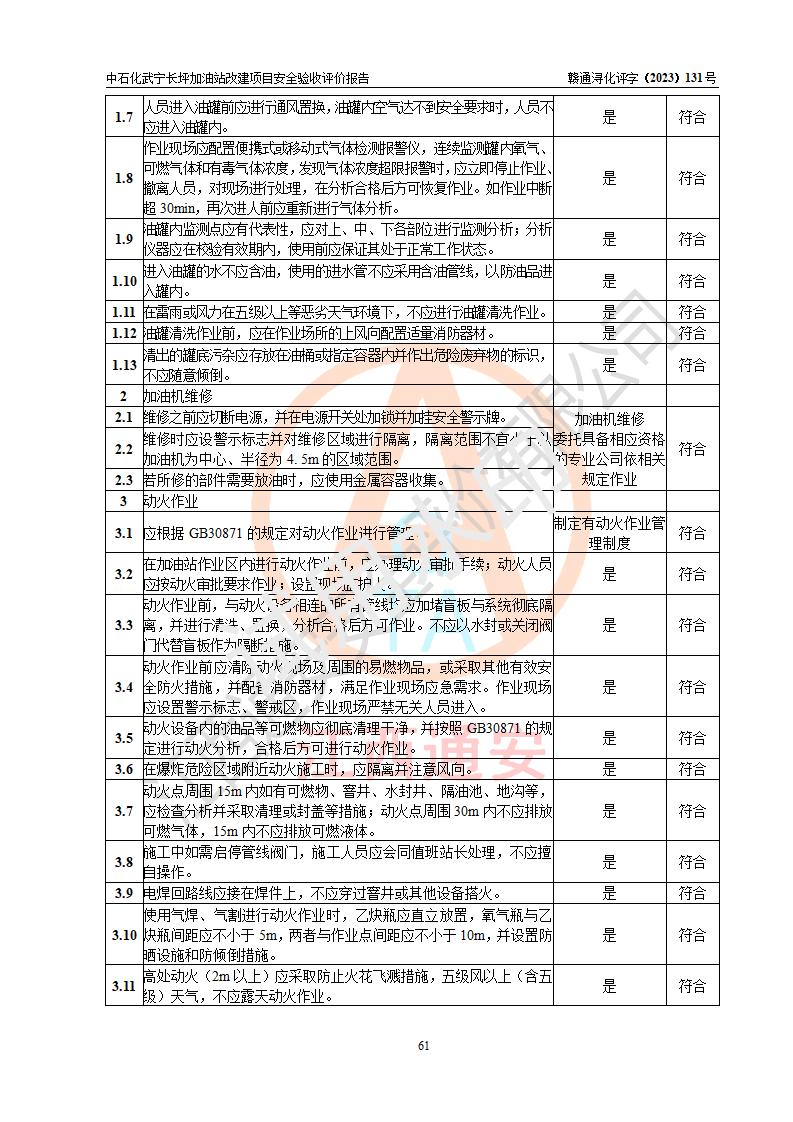 评价结论 | 中国石化销售股份有限公司江西九江武宁石油分公司长坪加油站改建项目涉及的安全条件、安全生产条件、安全生产管理符合《危险化学品经营许可证管理办法》、《汽车加油加气加氢站技术标准》等**有关法规、标准、规范要求,能满足成品油零售经营单位的安全条件,具备项目竣工验收的条件。 | |||