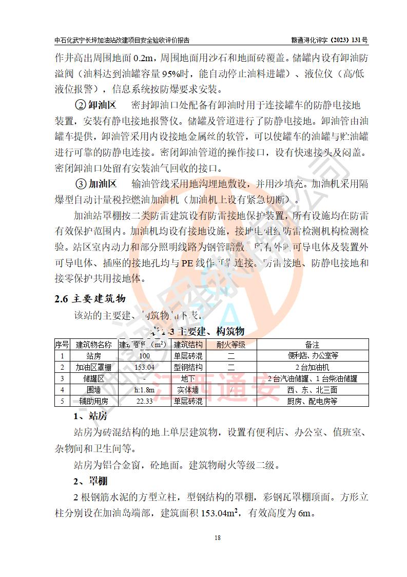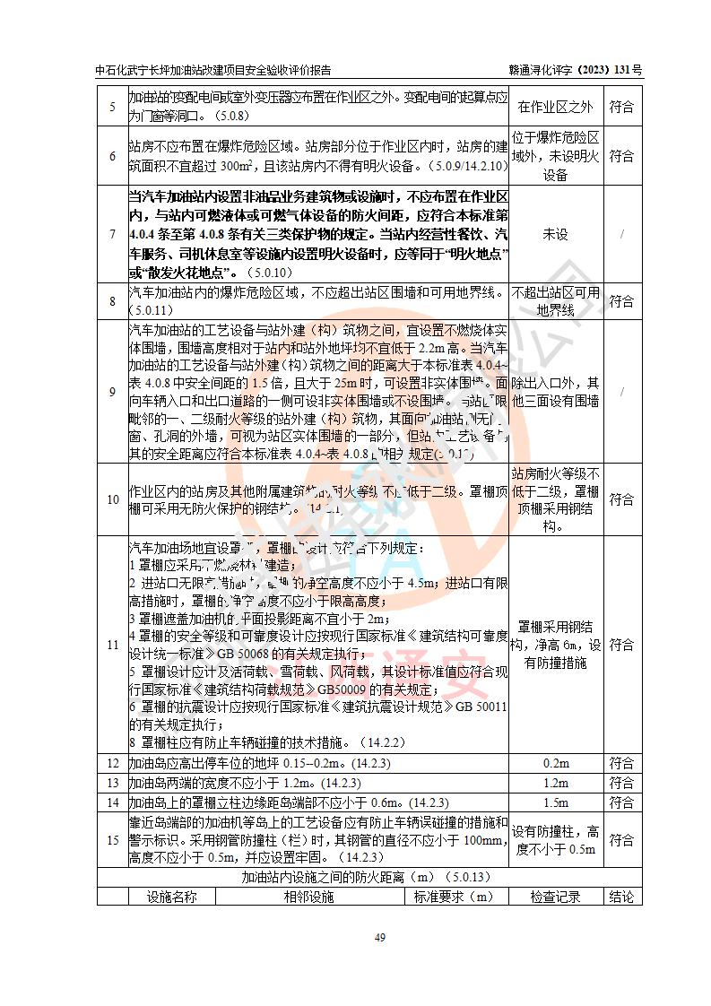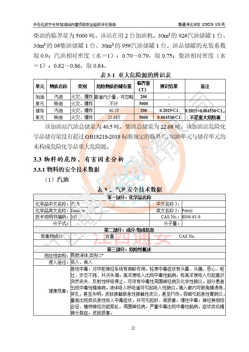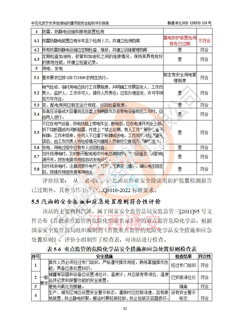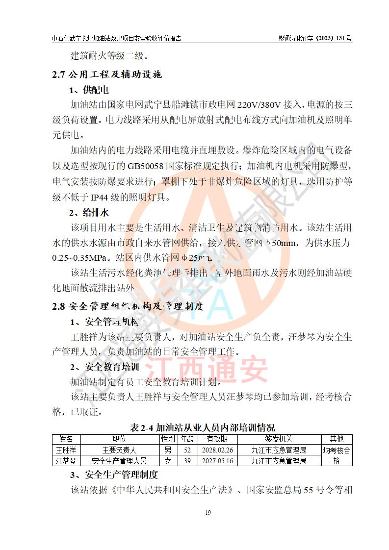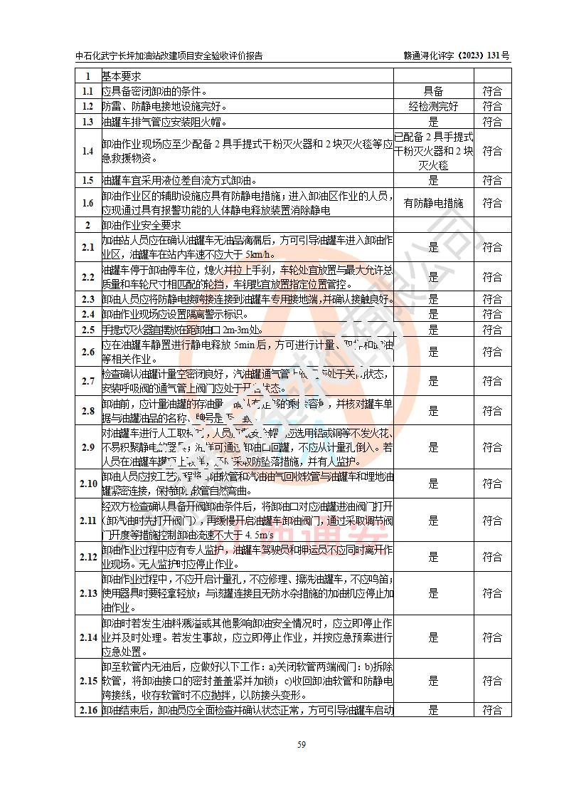 评价结论 | 中国石化销售股份有限公司江西九江武宁石油分公司长坪加油站改建项目涉及的安全条件、安全生产条件、安全生产管理符合《危险化学品经营许可证管理办法》、《汽车加油加气加氢站技术标准》等**有关法规、标准、规范要求,能满足成品油零售经营单位的安全条件,具备项目竣工验收的条件。 | |||