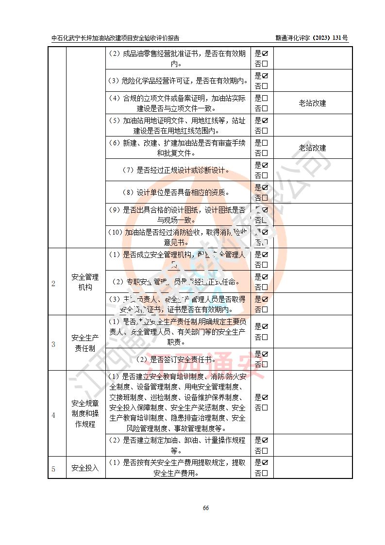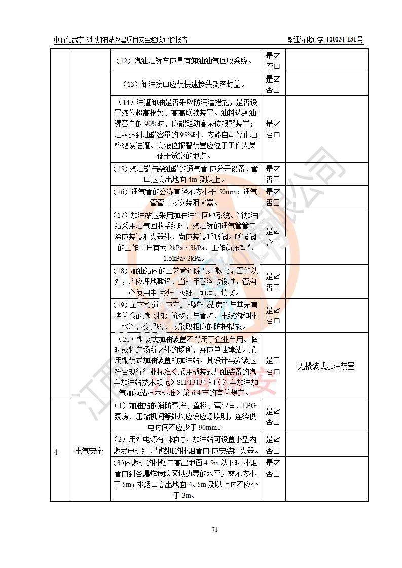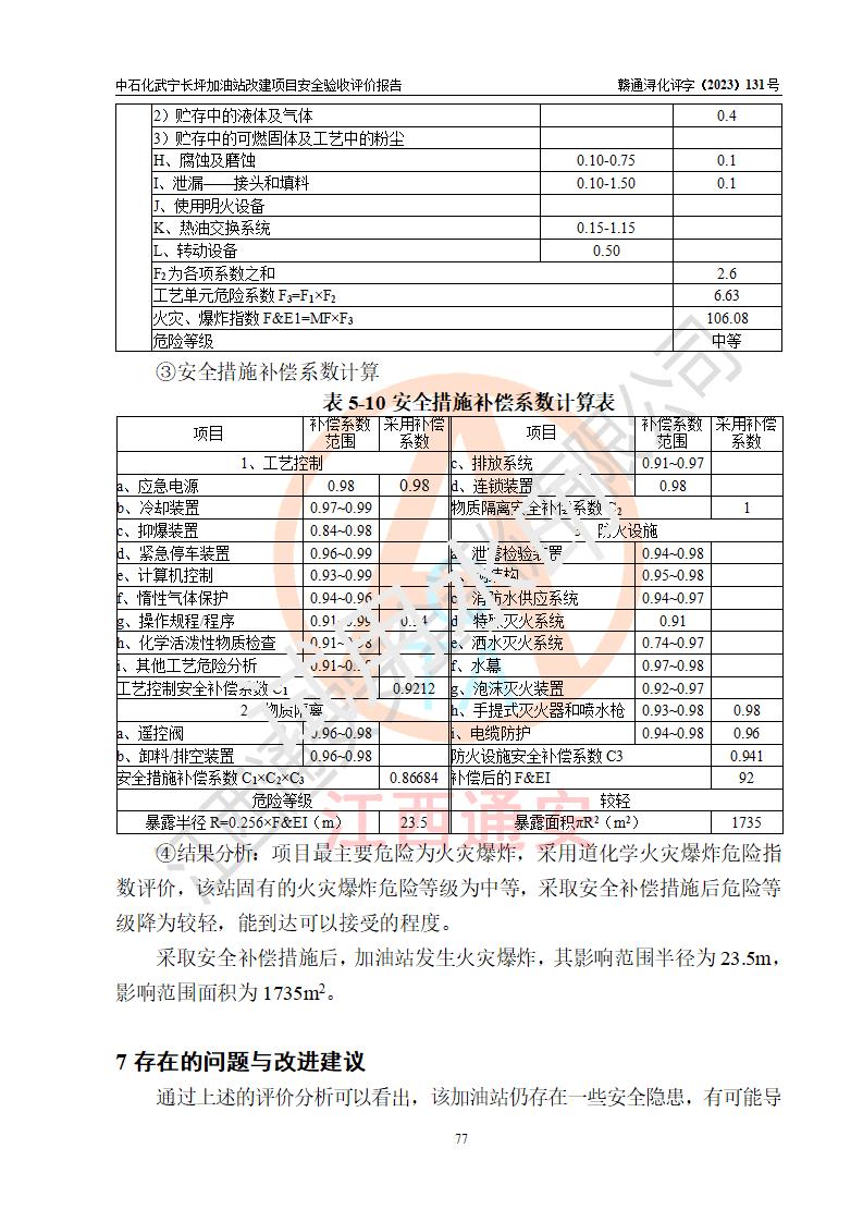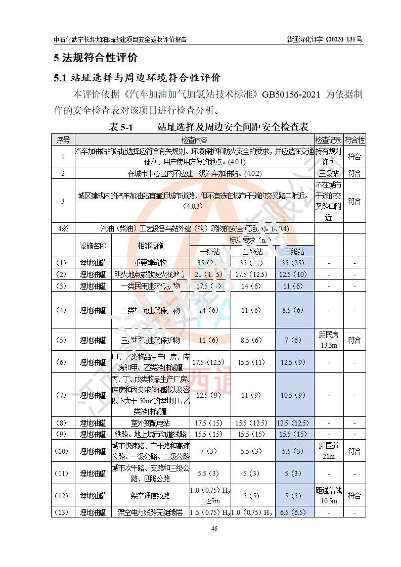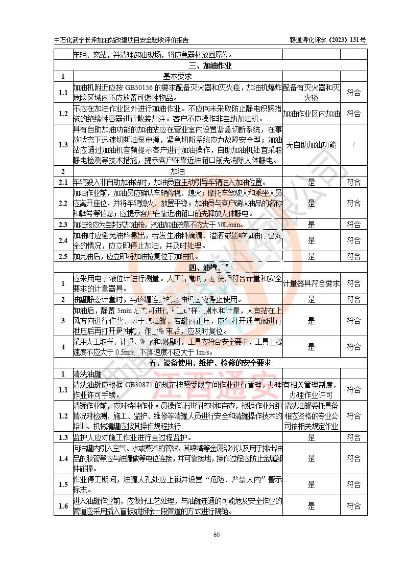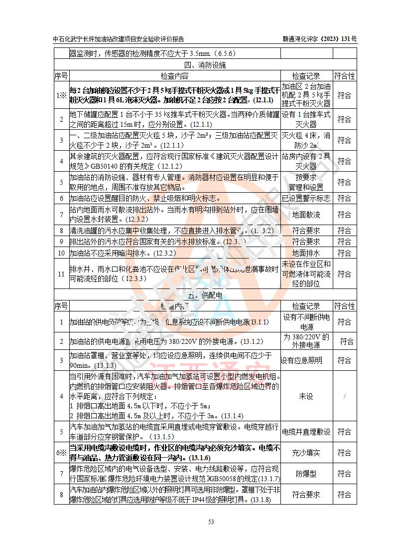 评价结论 | 中国石化销售股份有限公司江西九江武宁石油分公司长坪加油站改建项目涉及的安全条件、安全生产条件、安全生产管理符合《危险化学品经营许可证管理办法》、《汽车加油加气加氢站技术标准》等**有关法规、标准、规范要求,能满足成品油零售经营单位的安全条件,具备项目竣工验收的条件。 | |||