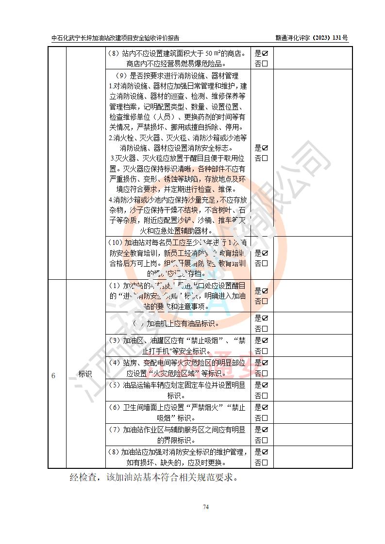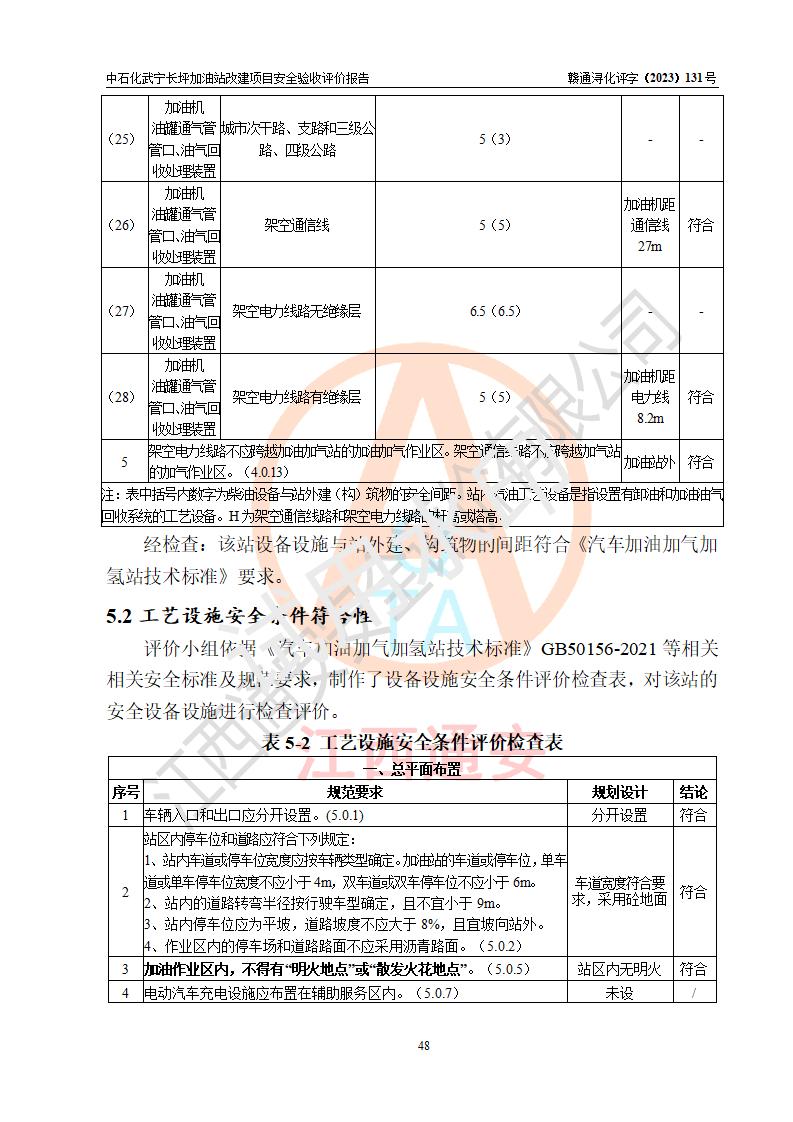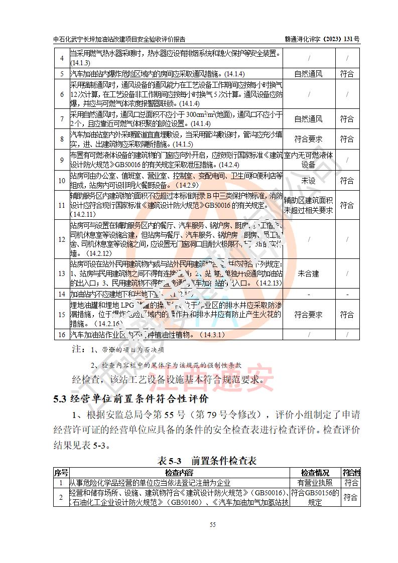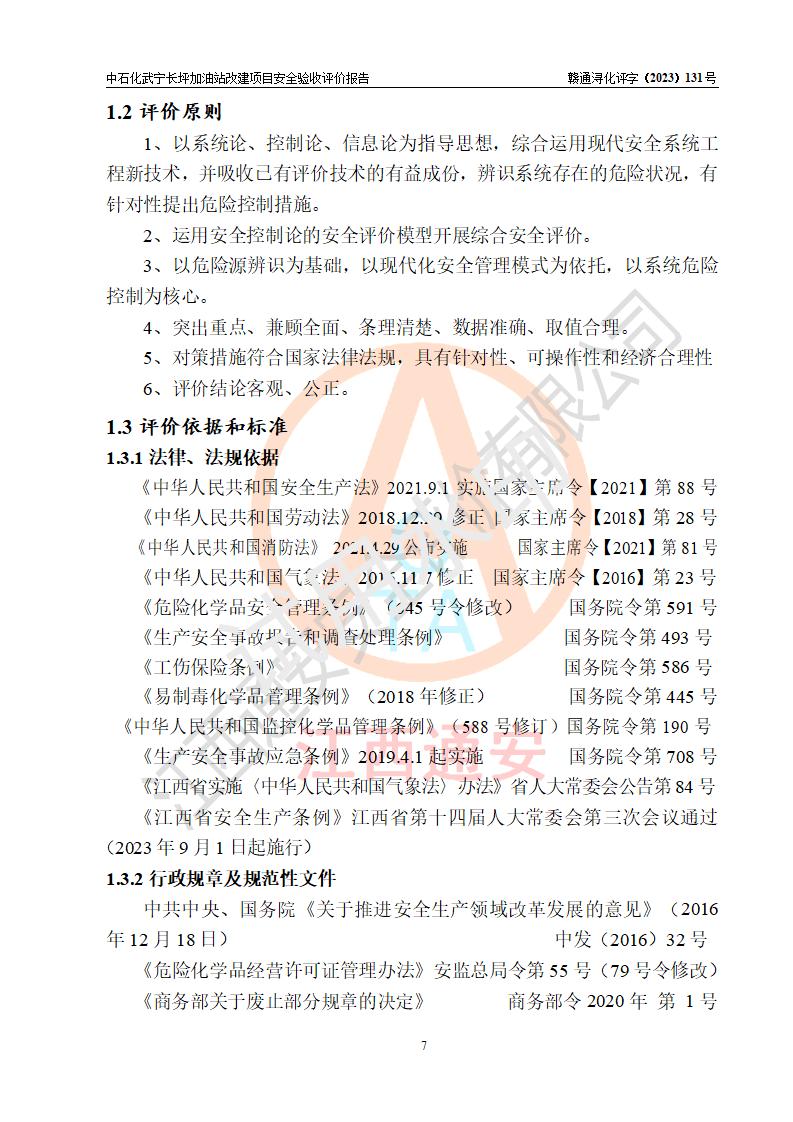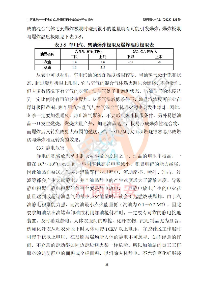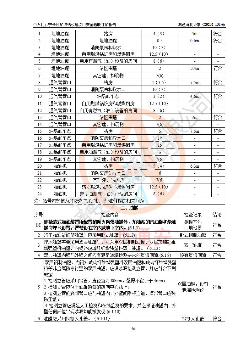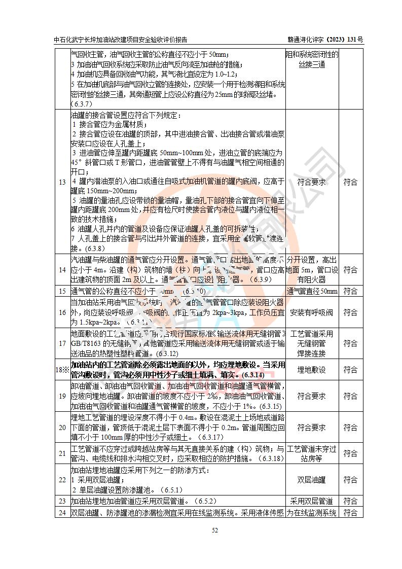 评价结论 | 中国石化销售股份有限公司江西九江武宁石油分公司长坪加油站改建项目涉及的安全条件、安全生产条件、安全生产管理符合《危险化学品经营许可证管理办法》、《汽车加油加气加氢站技术标准》等**有关法规、标准、规范要求,能满足成品油零售经营单位的安全条件,具备项目竣工验收的条件。 | |||