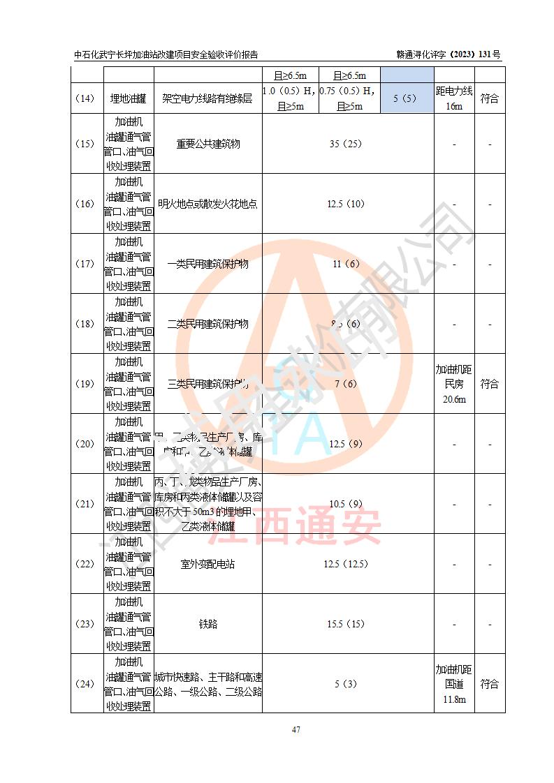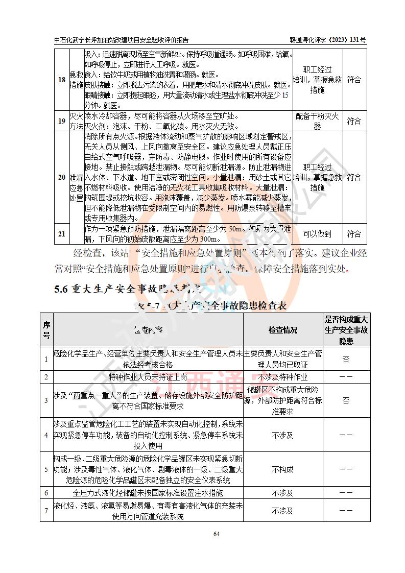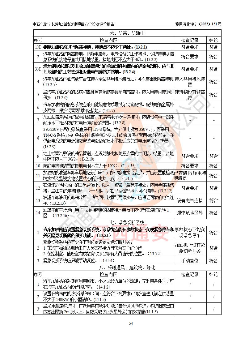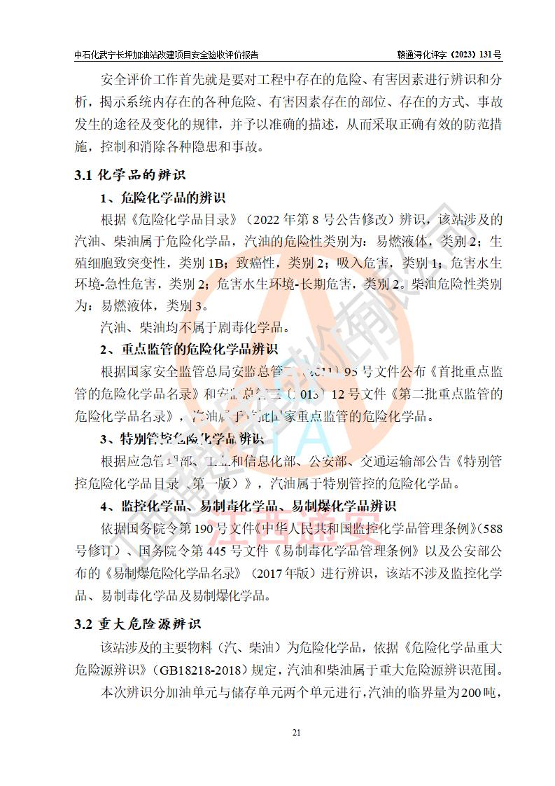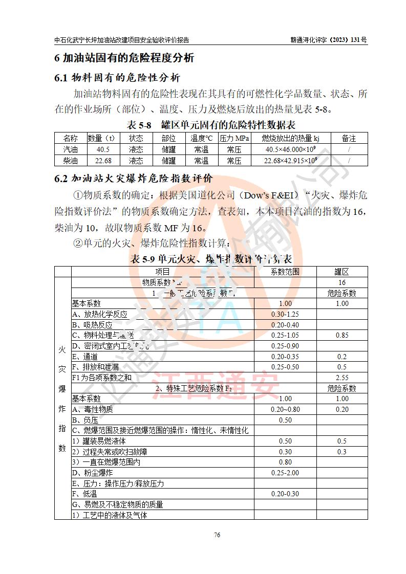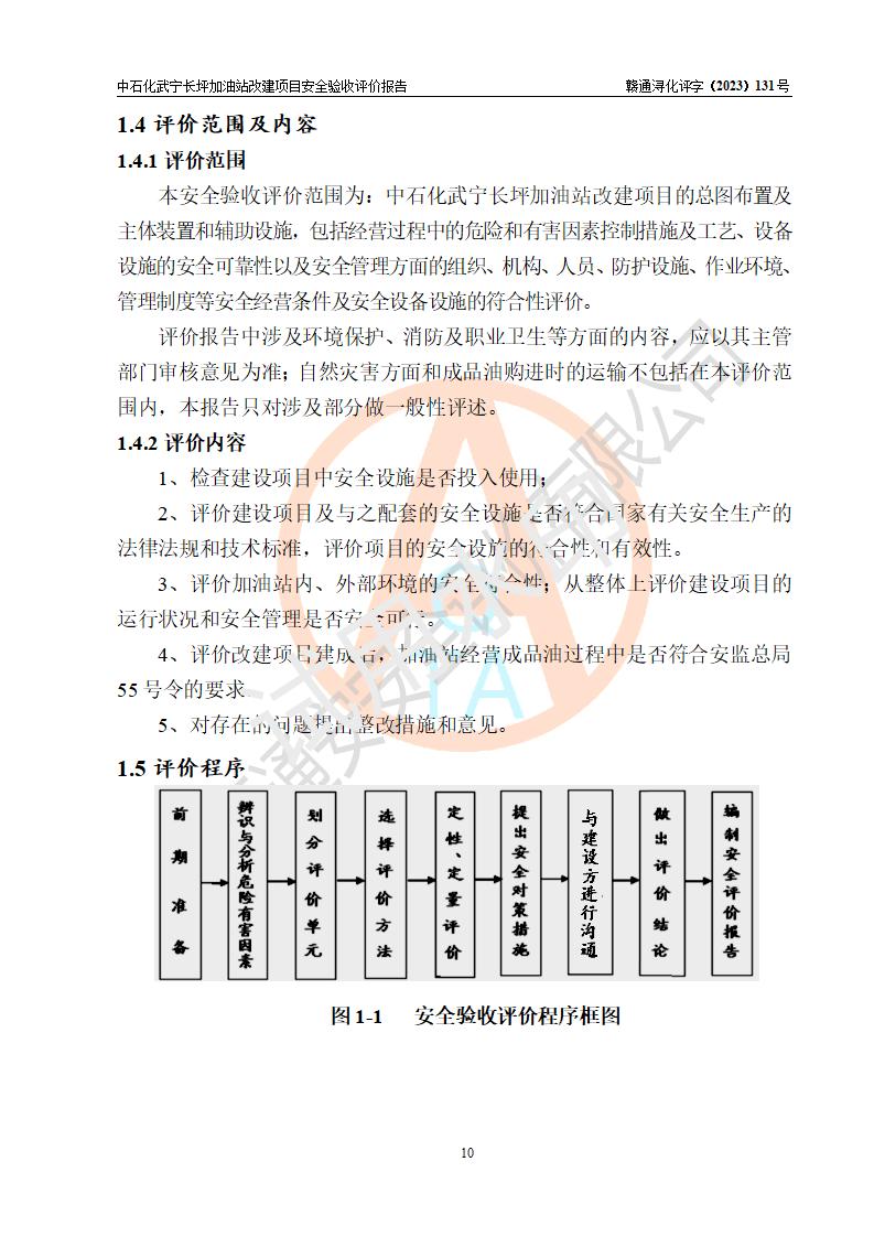 评价结论 | 中国石化销售股份有限公司江西九江武宁石油分公司长坪加油站改建项目涉及的安全条件、安全生产条件、安全生产管理符合《危险化学品经营许可证管理办法》、《汽车加油加气加氢站技术标准》等**有关法规、标准、规范要求,能满足成品油零售经营单位的安全条件,具备项目竣工验收的条件。 | |||