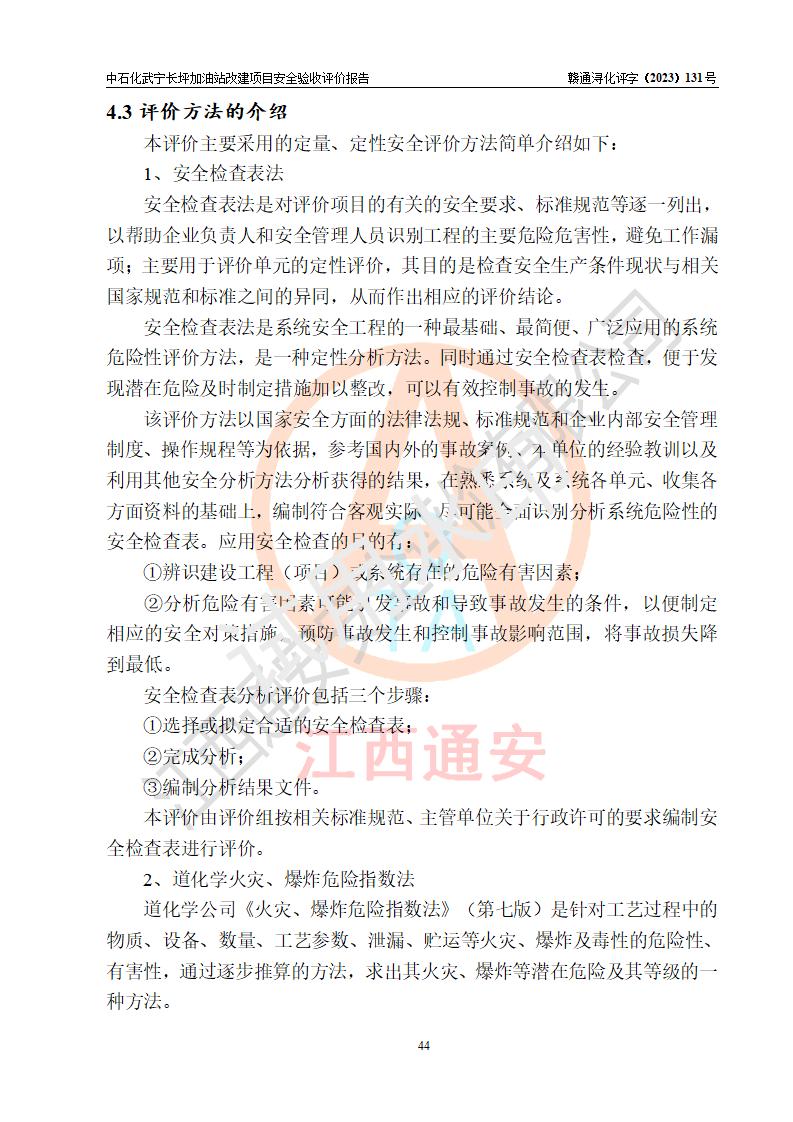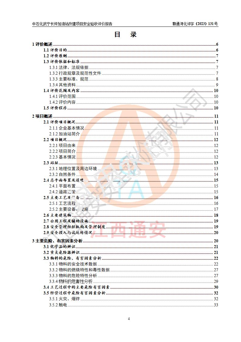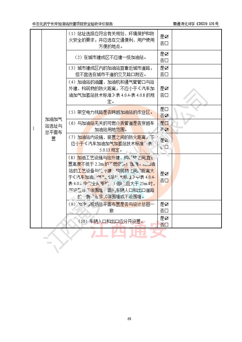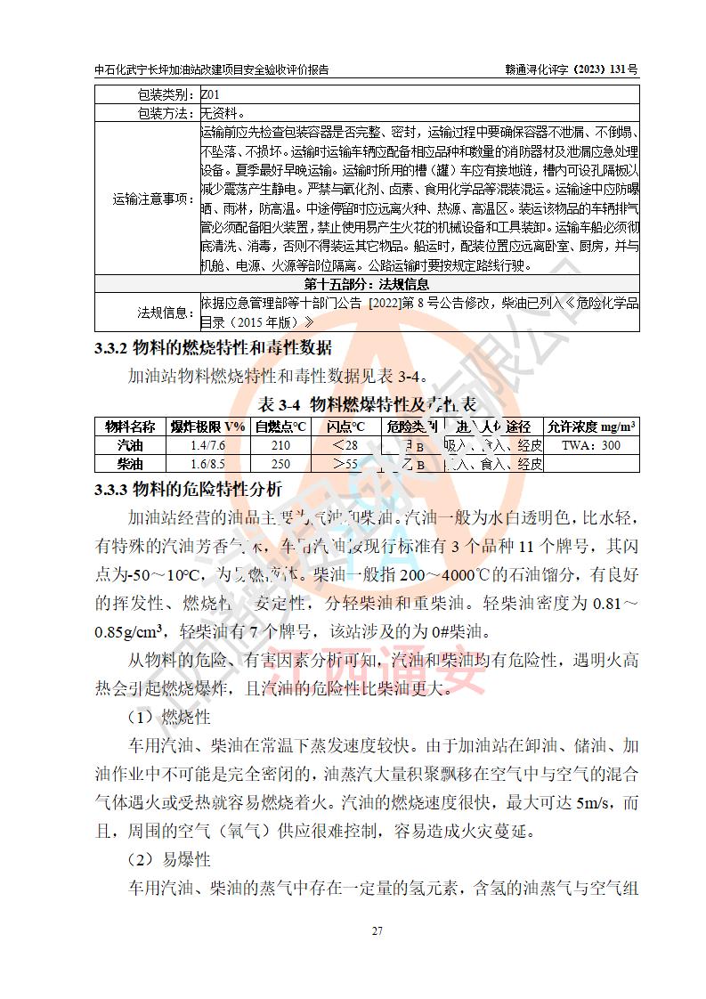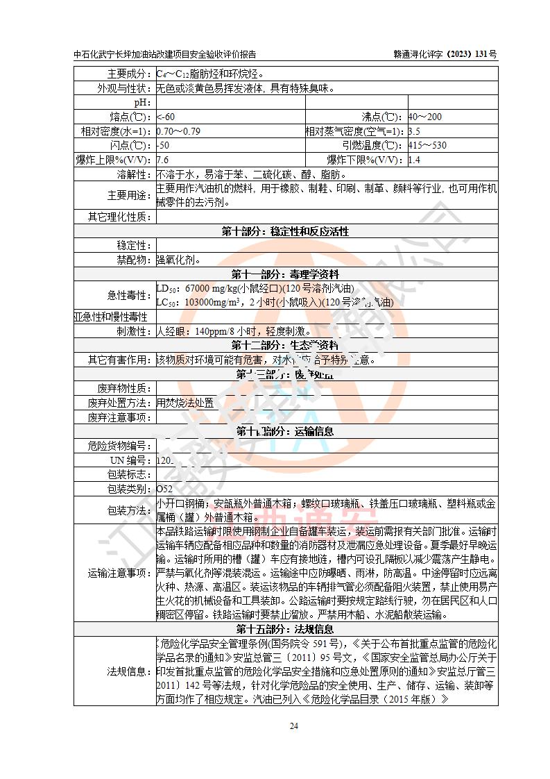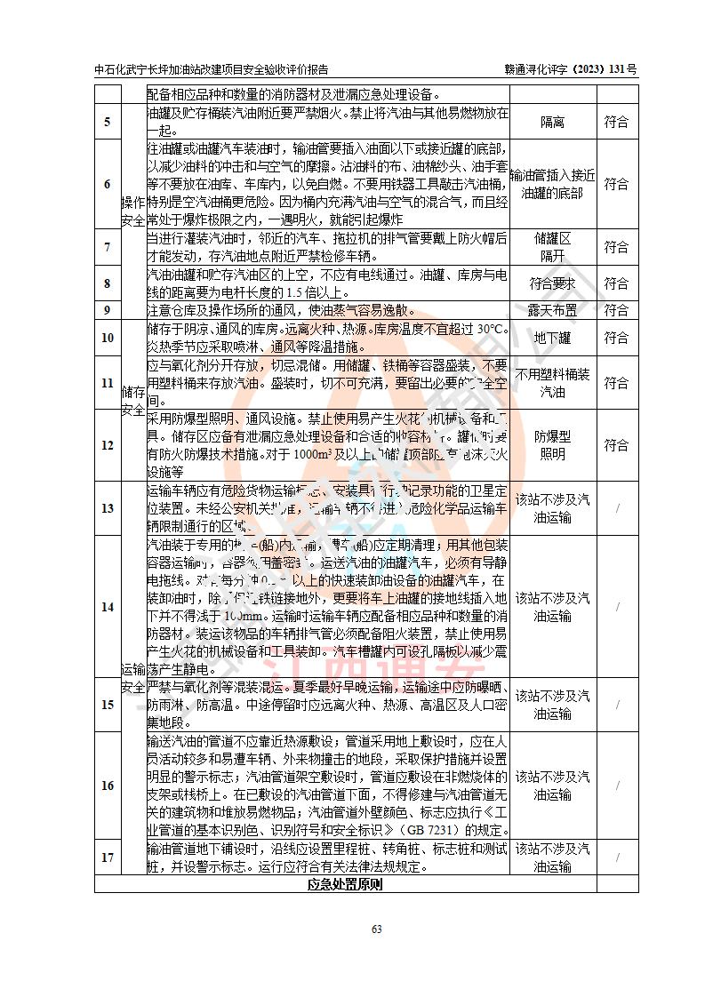 评价结论 | 中国石化销售股份有限公司江西九江武宁石油分公司长坪加油站改建项目涉及的安全条件、安全生产条件、安全生产管理符合《危险化学品经营许可证管理办法》、《汽车加油加气加氢站技术标准》等**有关法规、标准、规范要求,能满足成品油零售经营单位的安全条件,具备项目竣工验收的条件。 | |||