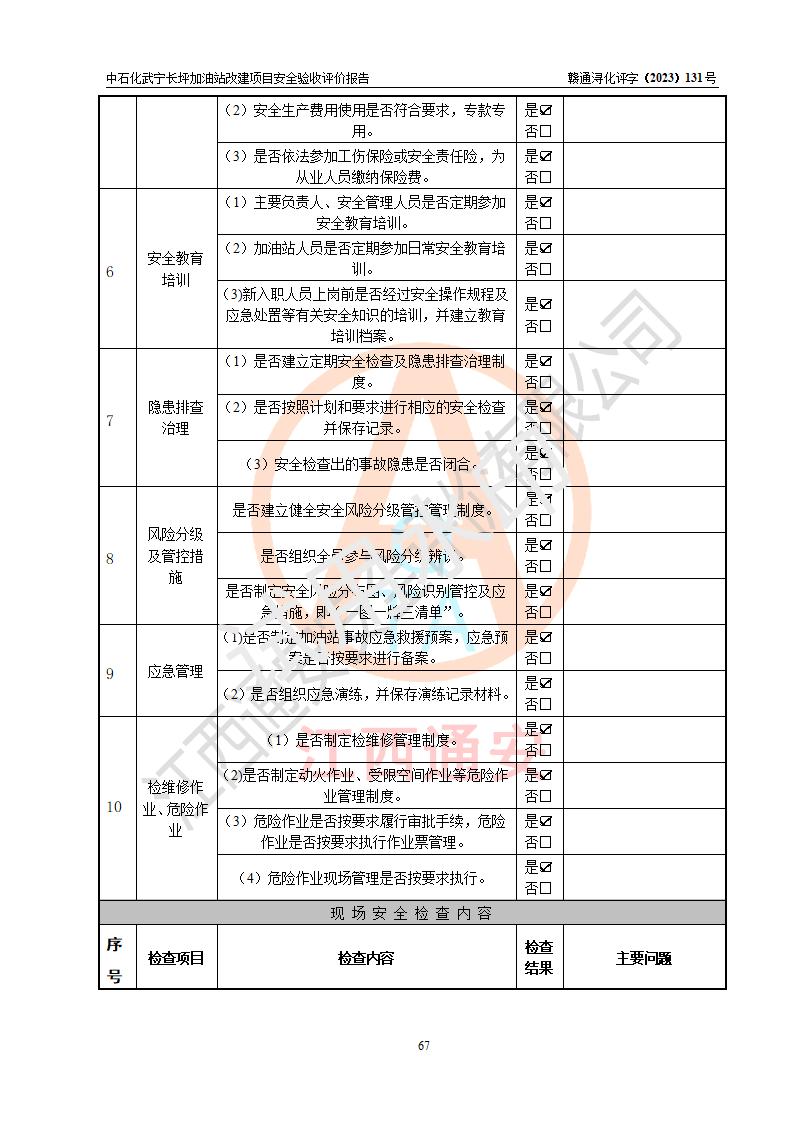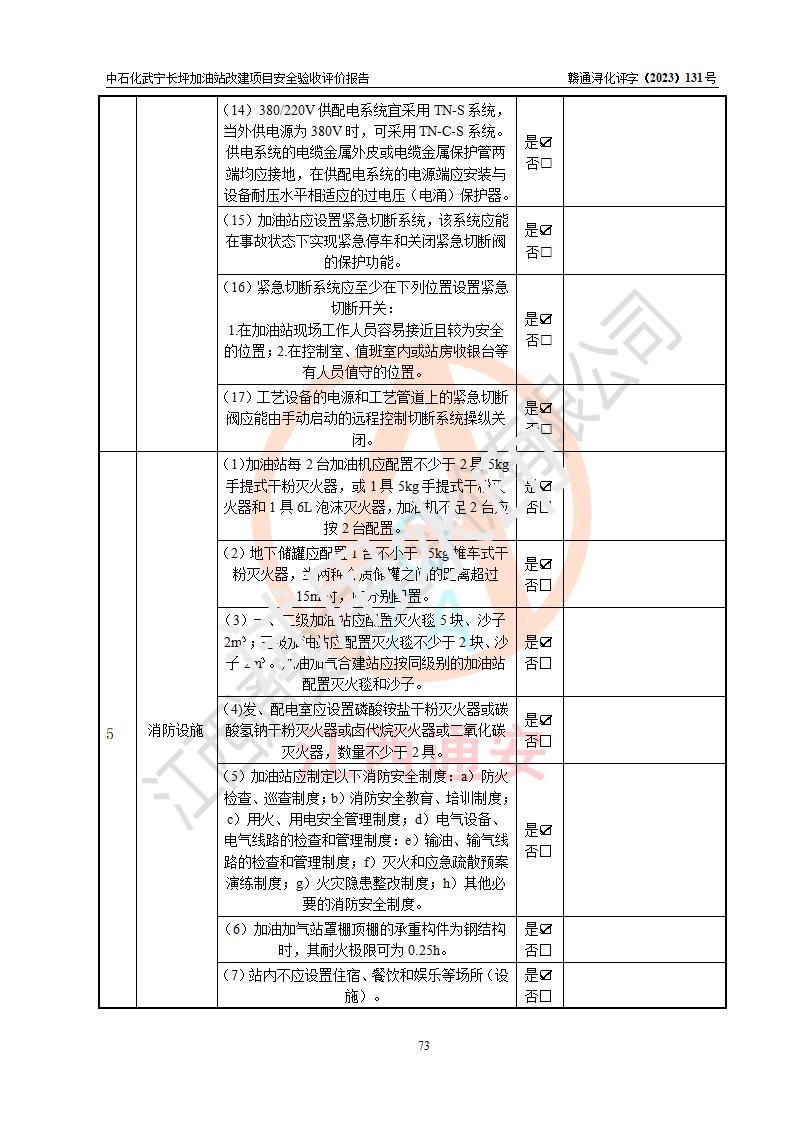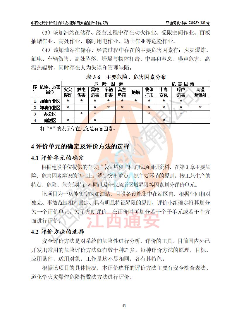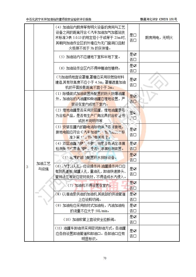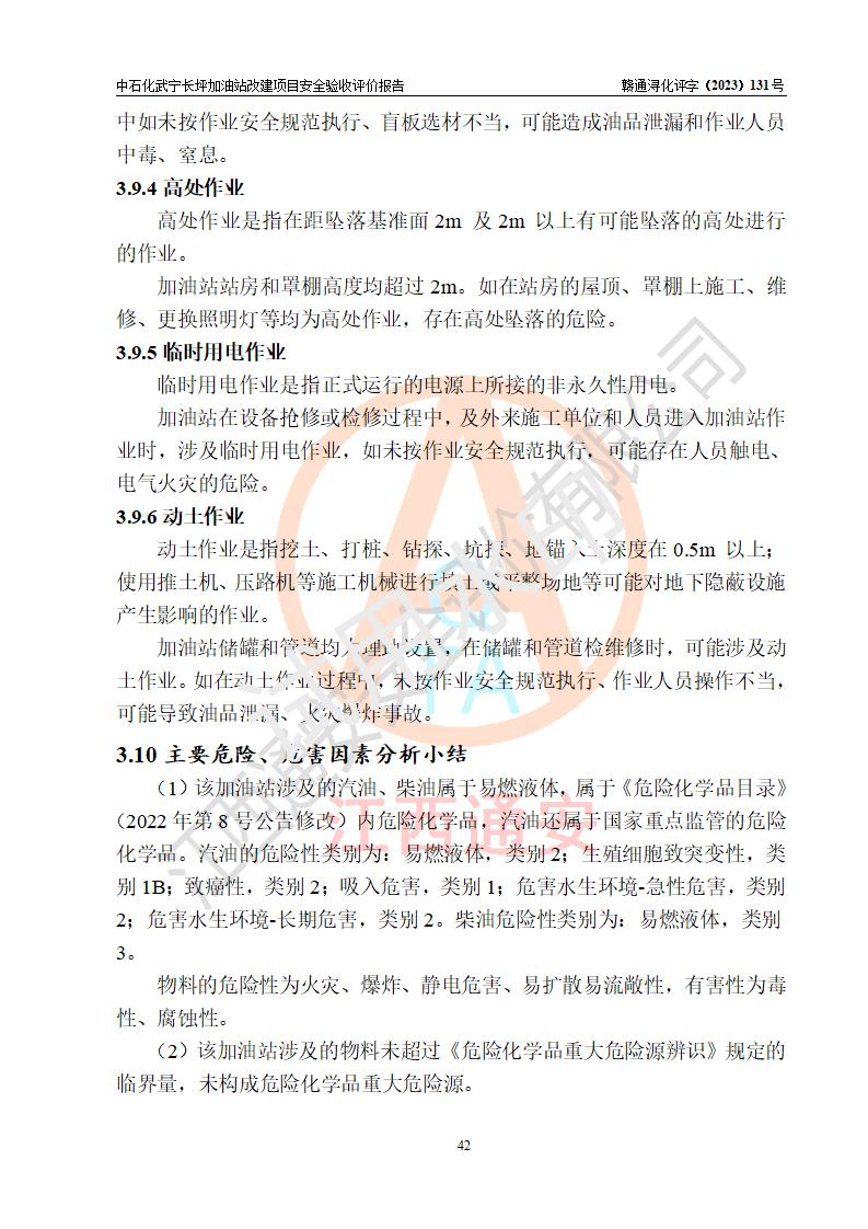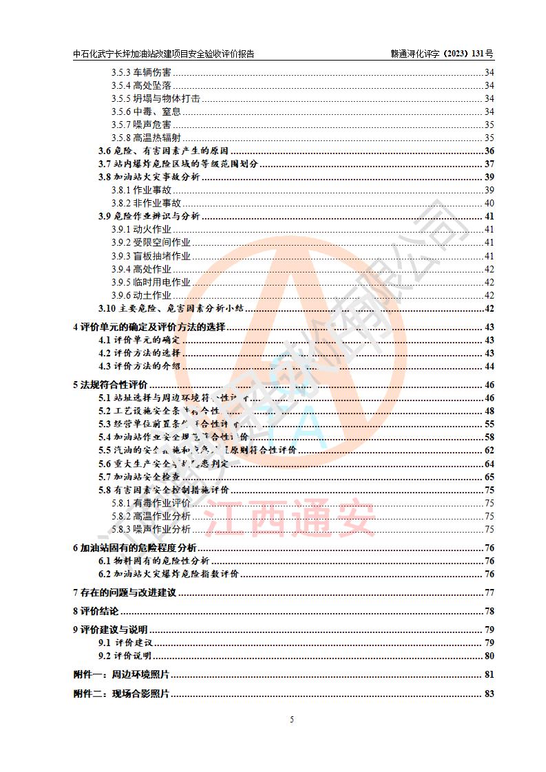评价结论 | 中国石化销售股份有限公司江西九江武宁石油分公司长坪加油站改建项目涉及的安全条件、安全生产条件、安全生产管理符合《危险化学品经营许可证管理办法》、《汽车加油加气加氢站技术标准》等**有关法规、标准、规范要求,能满足成品油零售经营单位的安全条件,具备项目竣工验收的条件。 | |||