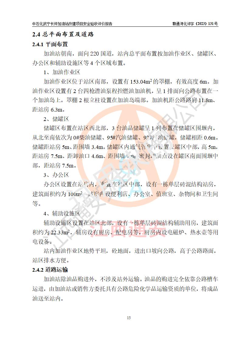 项目简介 | 中国石化销售股份有限公司江西九江武宁石油分公司长坪加油站是一家专门从事成品油零售经营的有限公司分公司,经营场所位于九江市武宁县船滩镇长坪村。现有从业人员3名,其中安全管理人员1人,加油站负责人王胜祥。 该站由九江市行政审批局换发《危险化学品经营许可证》(编号:赣九行审经(甲)字[2022]000118),**期限2022年08月21日至2025年08月20日;于2023年01月05日取得九江市商务局颁发的《成品油零售经营批准证书》(油零售证书第浔0379号)**期至2028年01月04日。 中石化武宁长坪加油站因整体形象破损严重、设备老化,为提升加油站整体形象,使客户有更加良好的服务体验,同时改善加油站员工的工作环境,中石化武宁长坪加油站经相关部门同意,对加油站整体进行改建。加油站改建内容为:1台30m3柴油罐改为95#汽油罐(设置卸油油气回收管线),更换2台加油机(双枪变四枪),新建罩棚(原有罩棚拆除),站房重新装修,辅房利旧改造,加油机电气、动力及通讯线路重新敷设等。 该加油站占地面积约767.15m2,站区内设置有2台4枪税控燃油加油机及配套的工艺管线,设有双层储罐3台,其中30m3的92#汽油储罐1台、30m3的95#汽油储罐1台、30m3的0#柴油储罐1台,油品储罐总容积为90m3(折算成汽油为75m3),按现行《汽车加油加气加氢站技术标准》对加油站的等级划分原则,属三级加油站 | |||