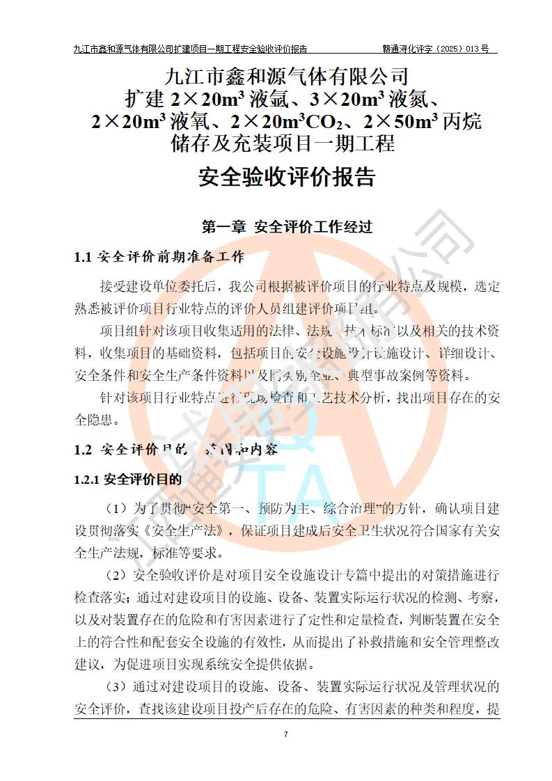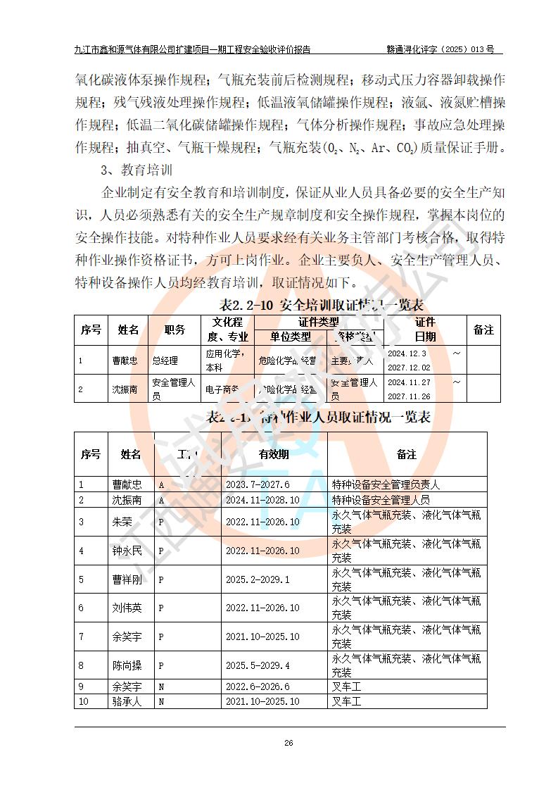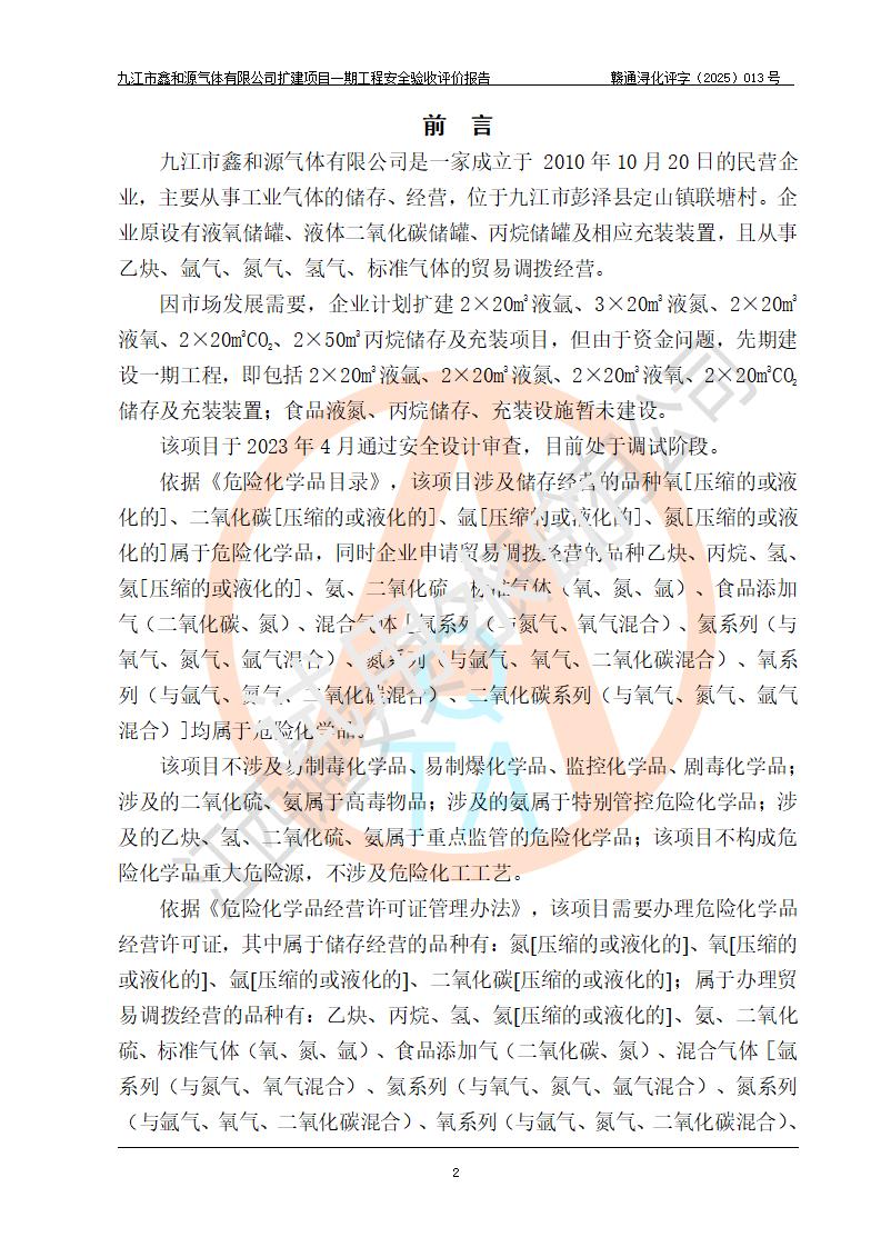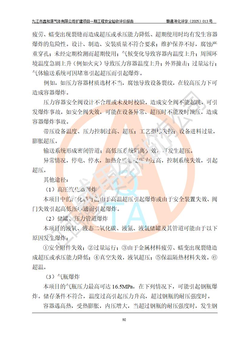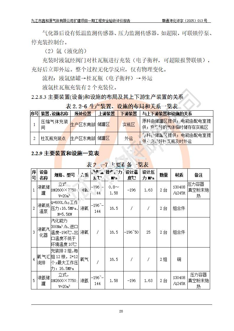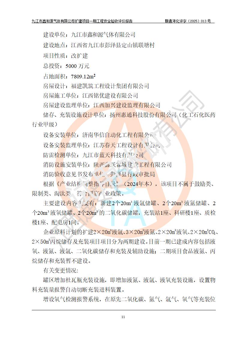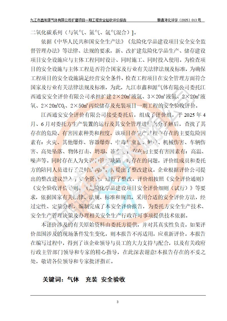 评价报告名称 | 九江市鑫和源气体有限公司扩建2×20m3液氩、3×20m3液氮、2×20m3液氧、2×20m3CO2、2×50m3丙烷储存及充装项目一期工程安全验收评价报告 | |||||