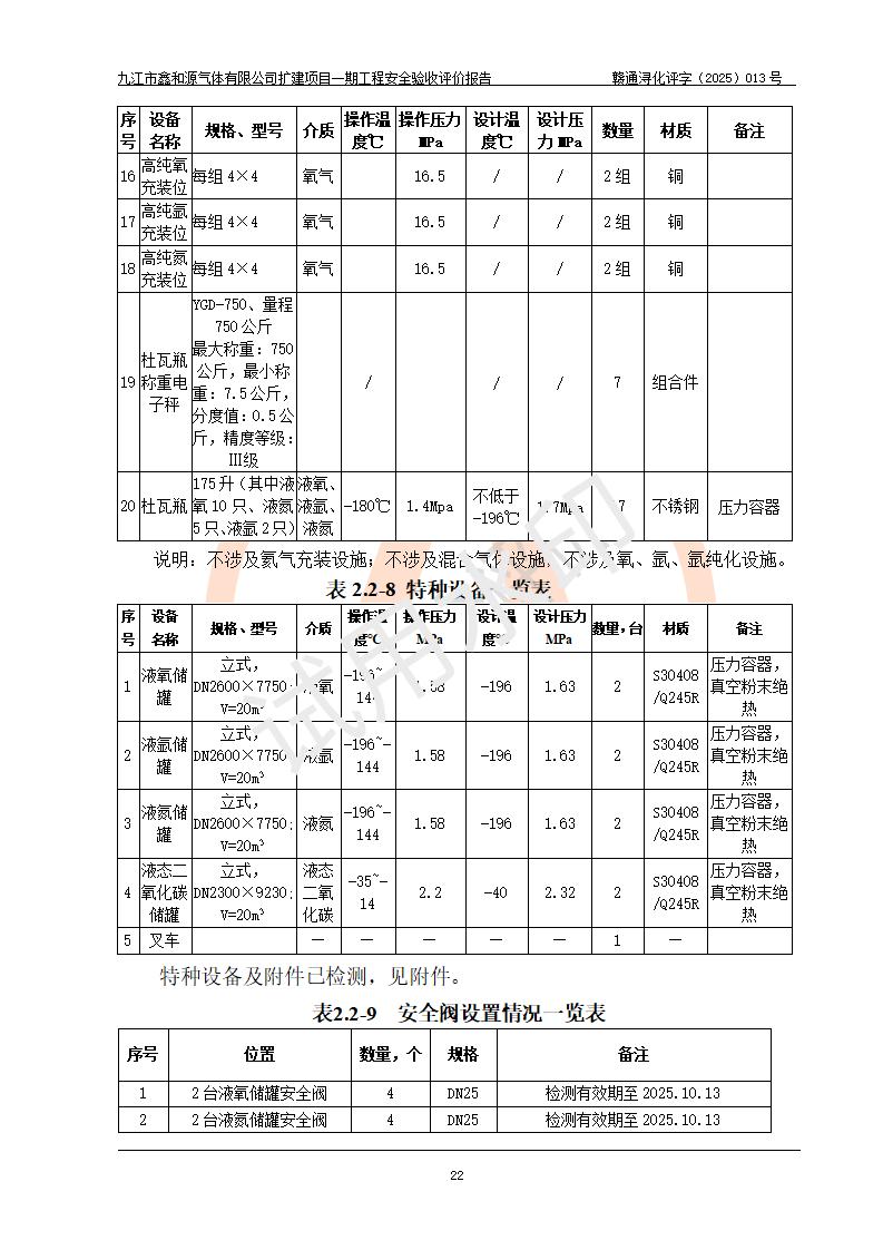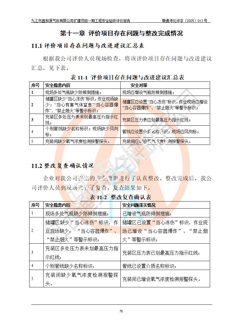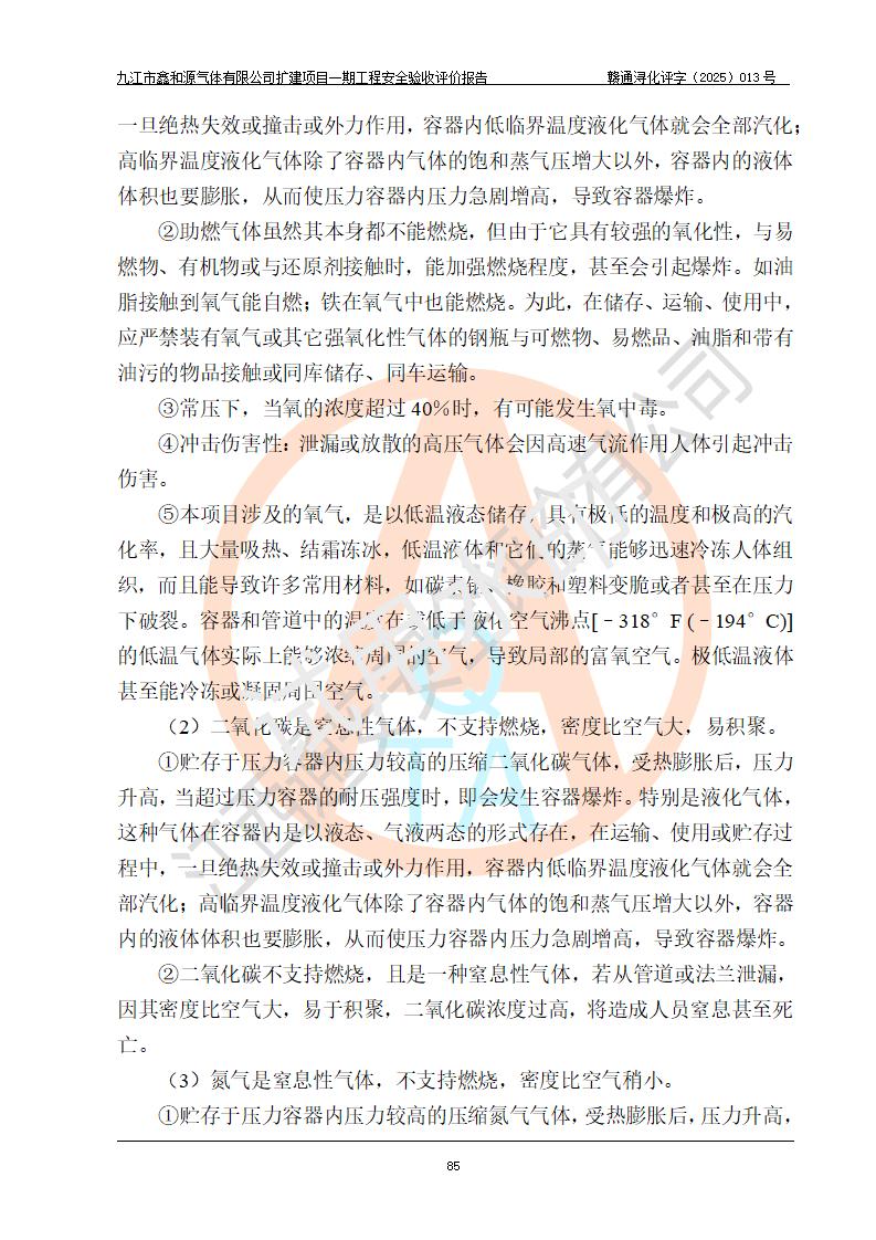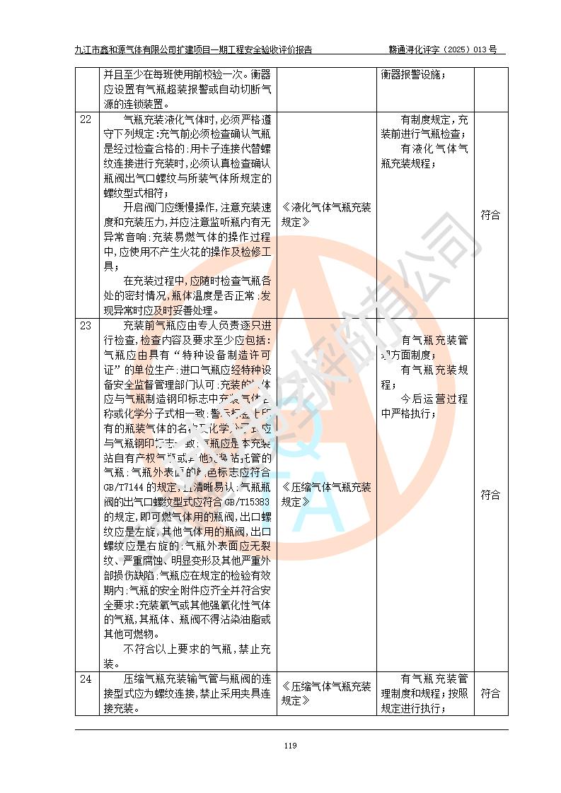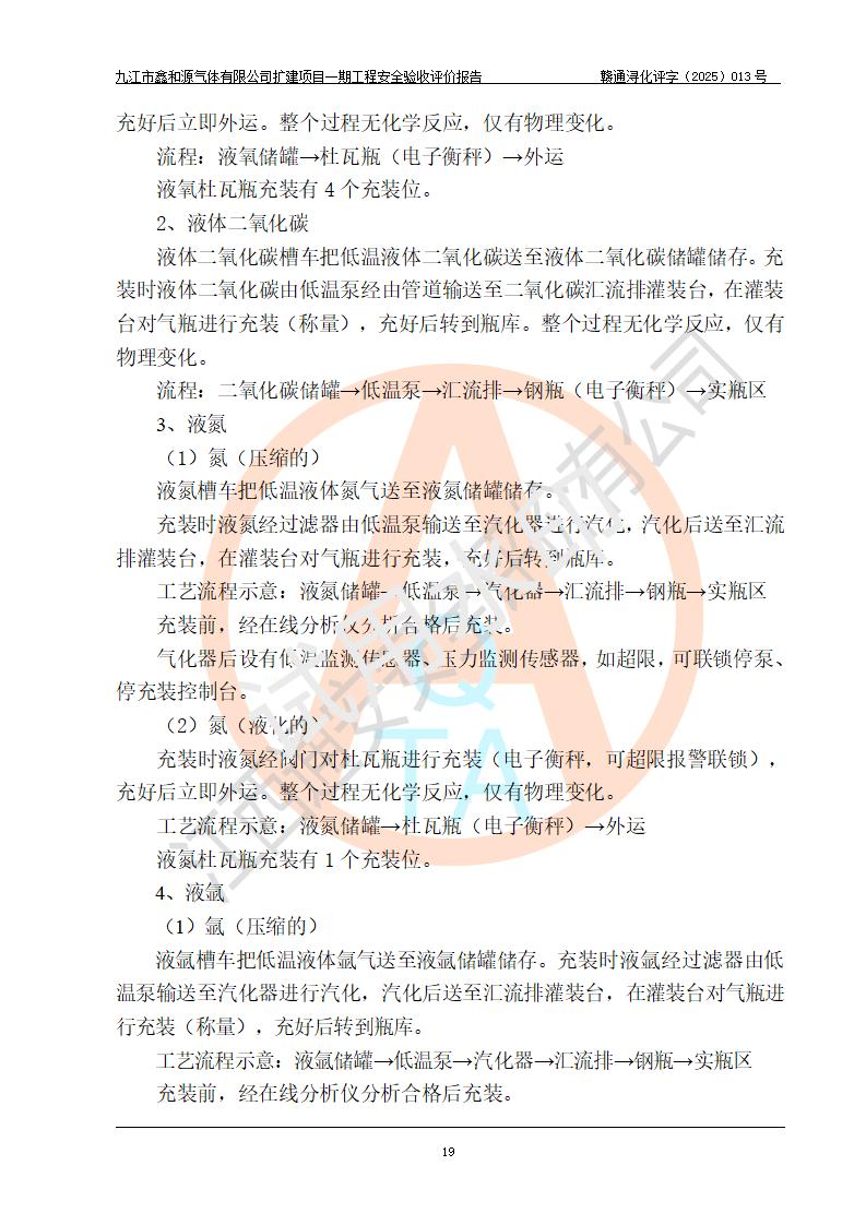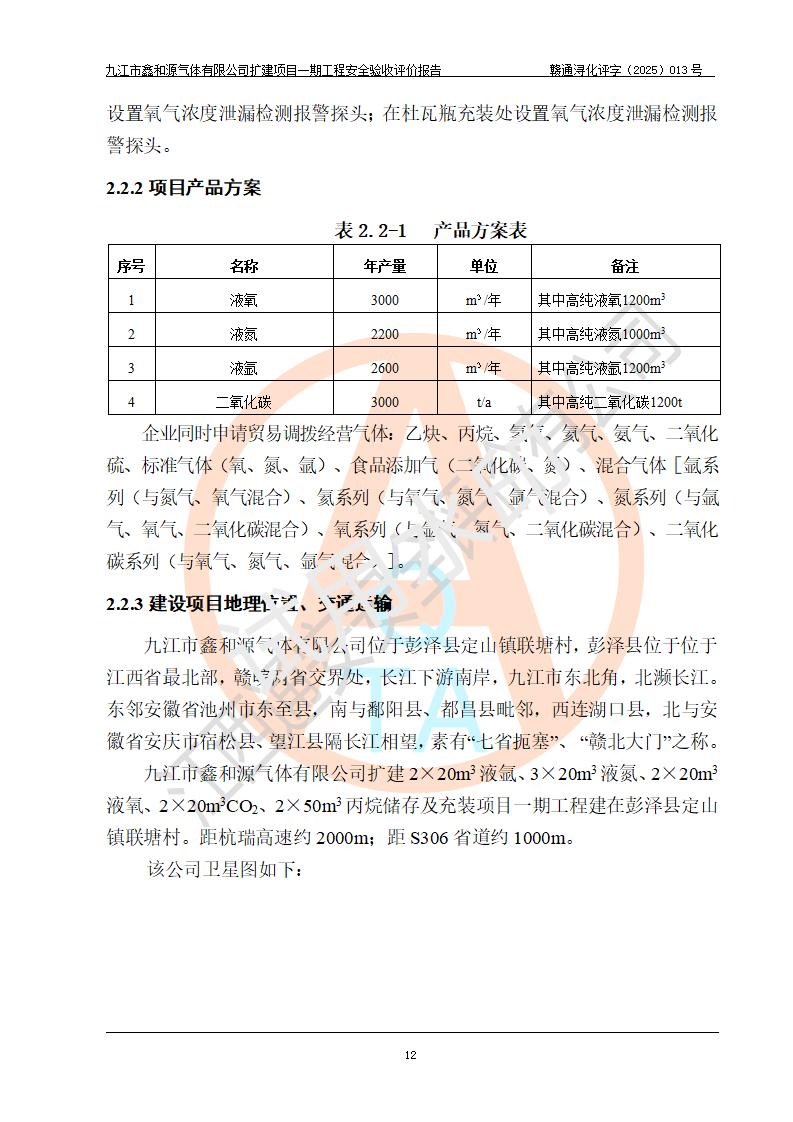 评价报告名称 | 九江市鑫和源气体有限公司扩建2×20m3液氩、3×20m3液氮、2×20m3液氧、2×20m3CO2、2×50m3丙烷储存及充装项目一期工程安全验收评价报告 | |||||