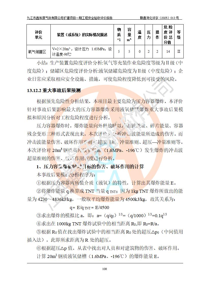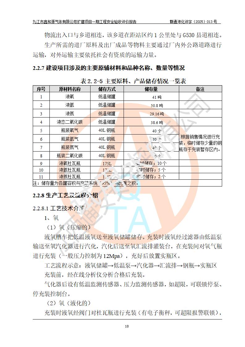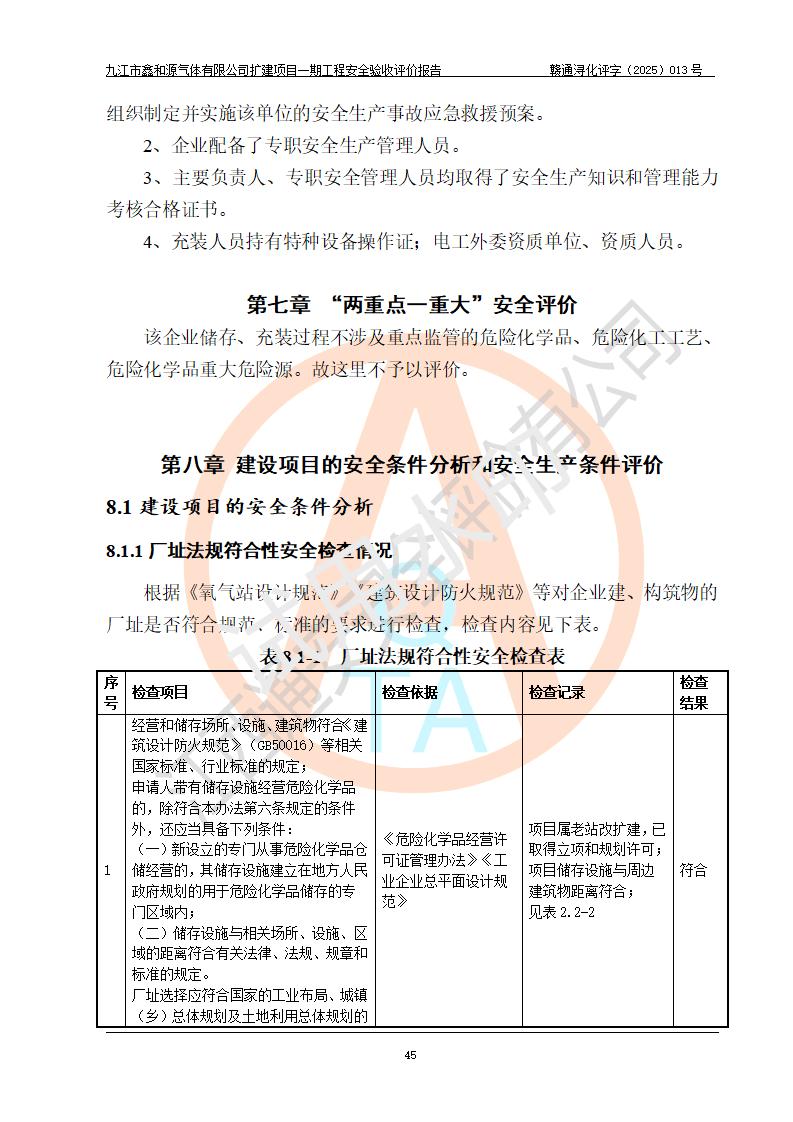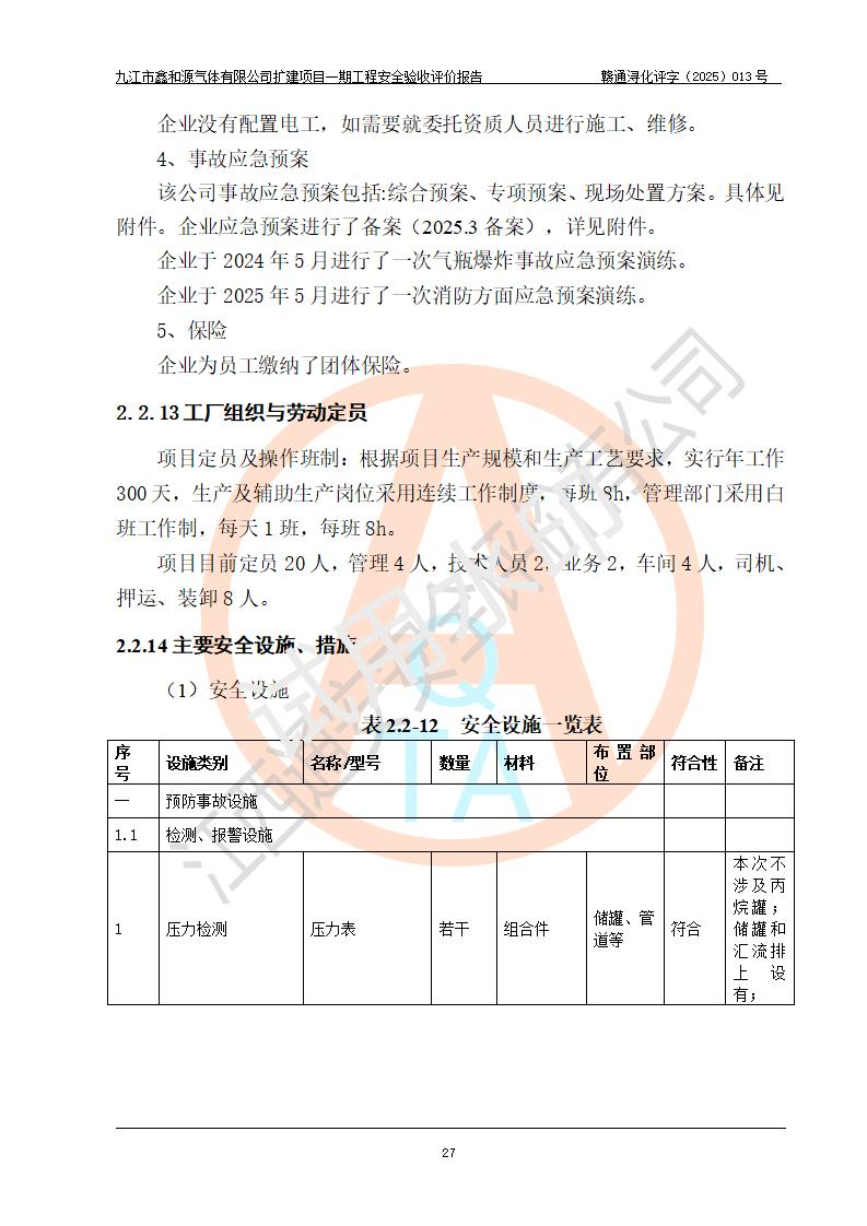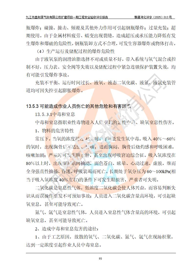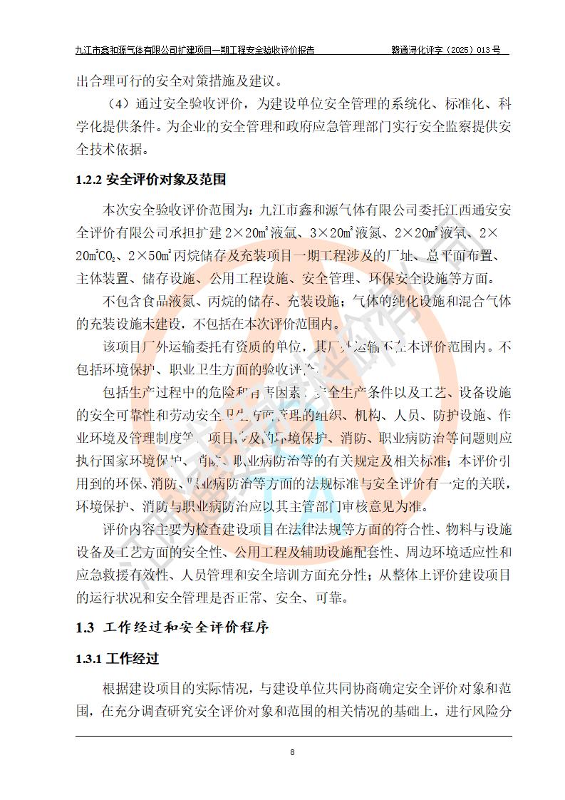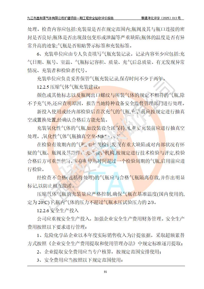 评价报告名称 | 九江市鑫和源气体有限公司扩建2×20m3液氩、3×20m3液氮、2×20m3液氧、2×20m3CO2、2×50m3丙烷储存及充装项目一期工程安全验收评价报告 | |||||