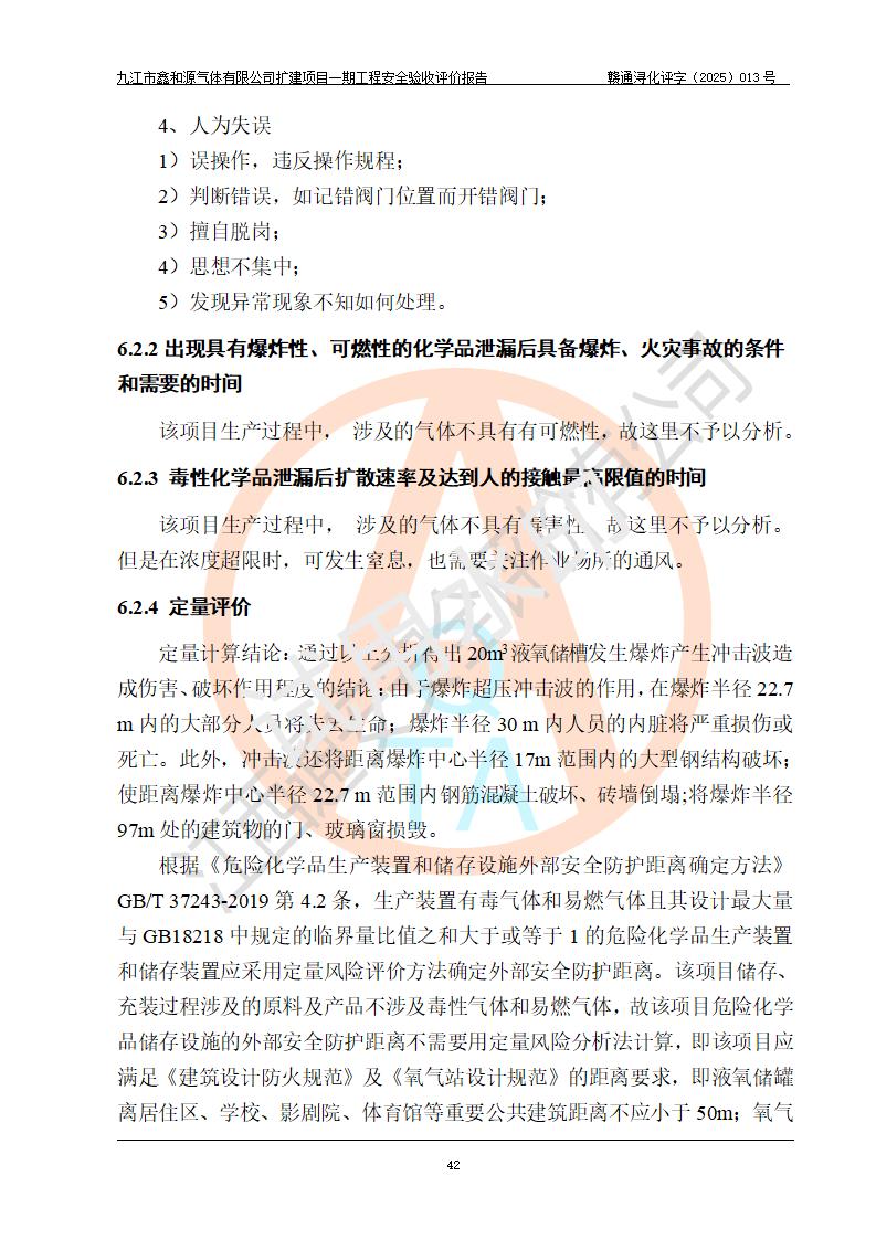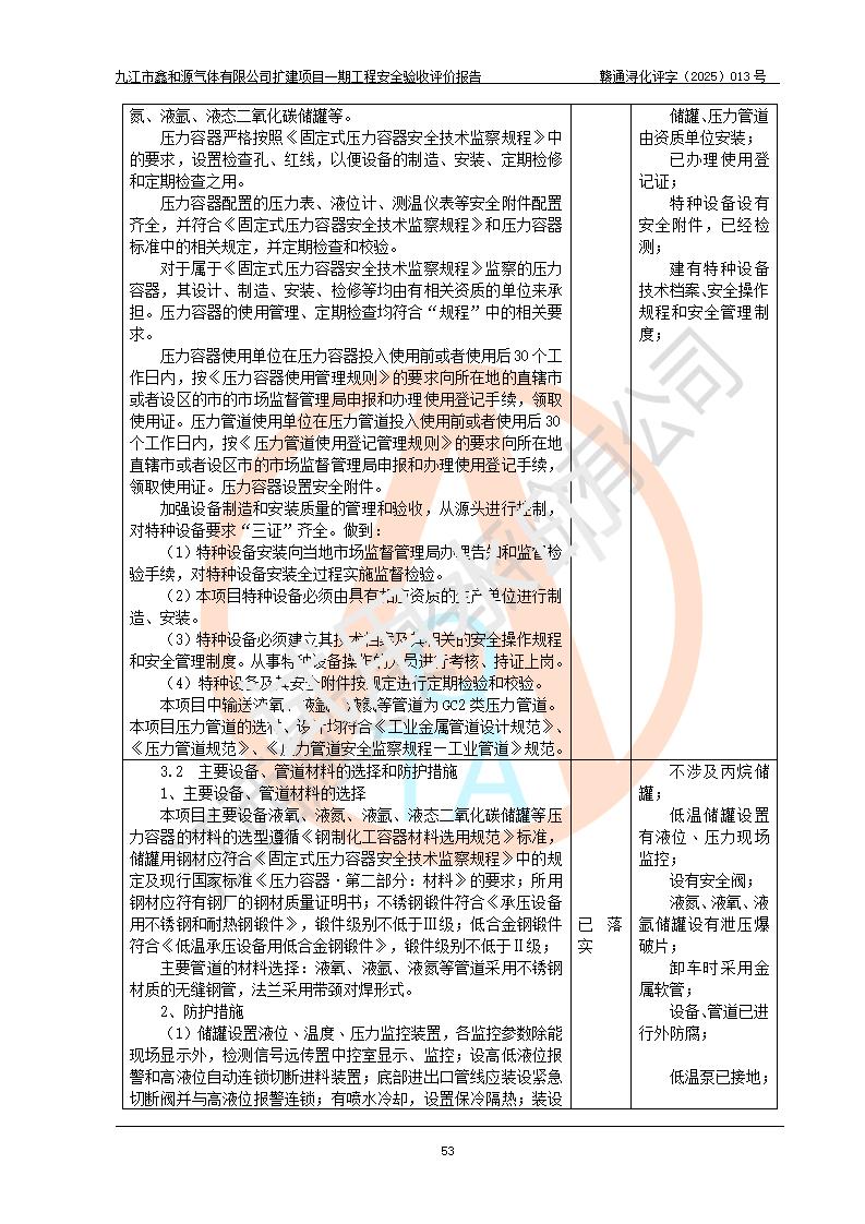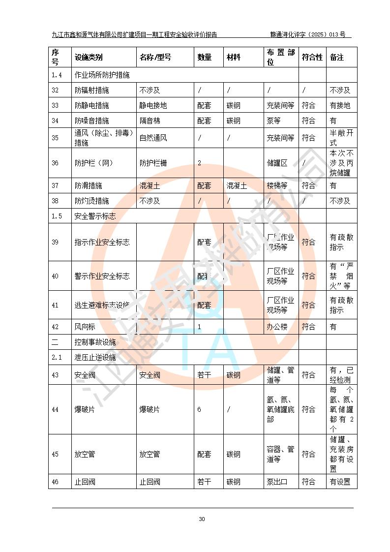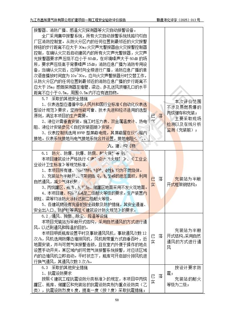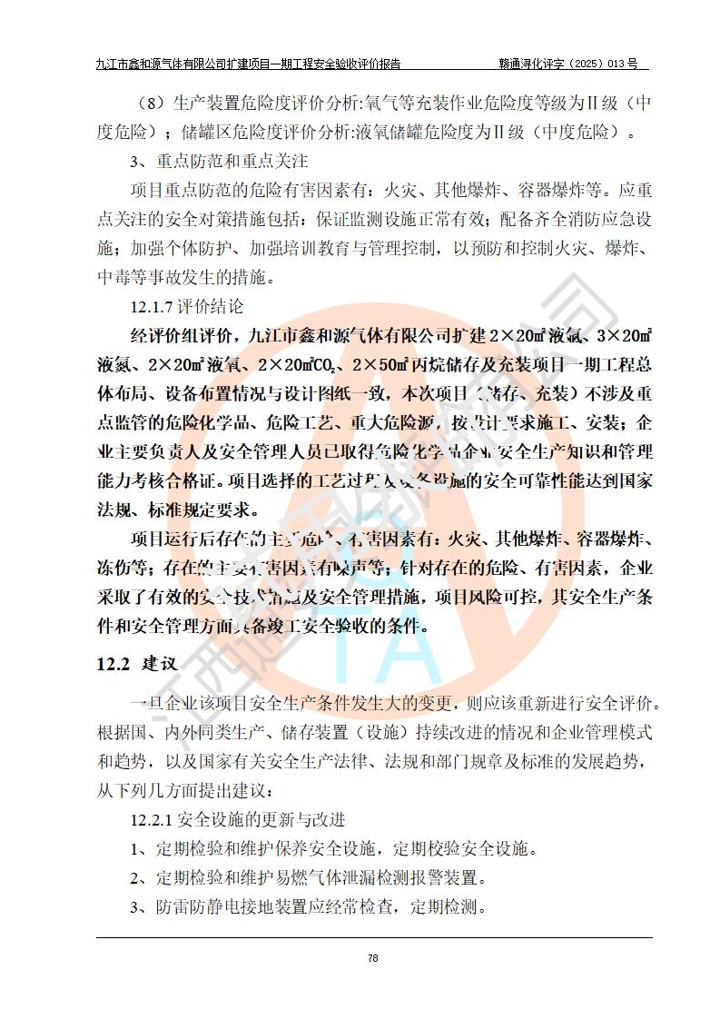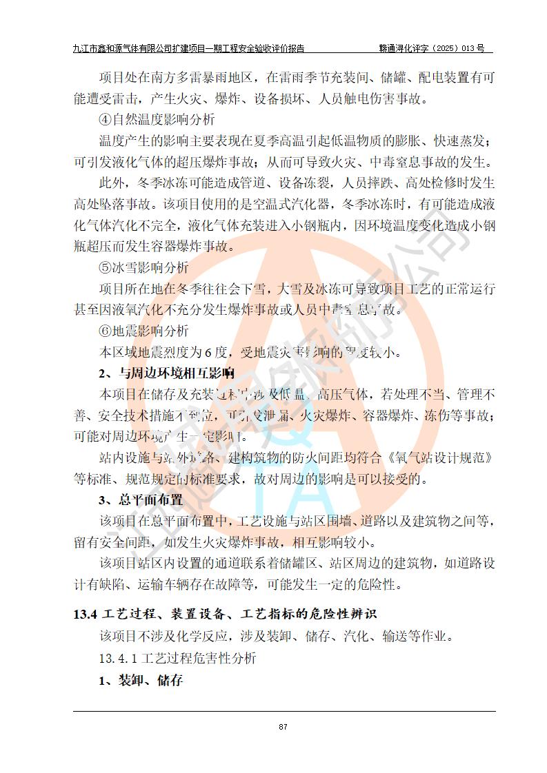 评价结论 | 经评价组评价,九江市鑫和源气体有限公司扩建2×20m3液氩、3×20m3液氮、2×20m3液氧、2×20m3CO2、2×50m3丙烷储存及充装项目一期工程总体布局、设备布置情况与设计图纸一致,本次项目(储存、充装)不涉及重点监管的危险化学品、危险工艺、重大危险源,按设计要求施工、安装;企业主要负责人及安全管理人员已取得危险化学品企业安全生产知识和管理能力考核合格证。项目选择的工艺过程及设备设施的安全可靠性能达到**法规、标准规定要求。 项目运行后存在的主要危险、有害因素有:火灾、其他爆炸、容器爆炸、冻伤等;存在的主要有害因素有噪声等;针对存在的危险、有害因素,企业采取了**的安全技术措施及安全管理措施,项目风险可控,其安全生产条件和安全管理方面具备竣工安全验收的条件。 | |||||