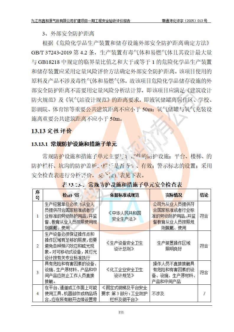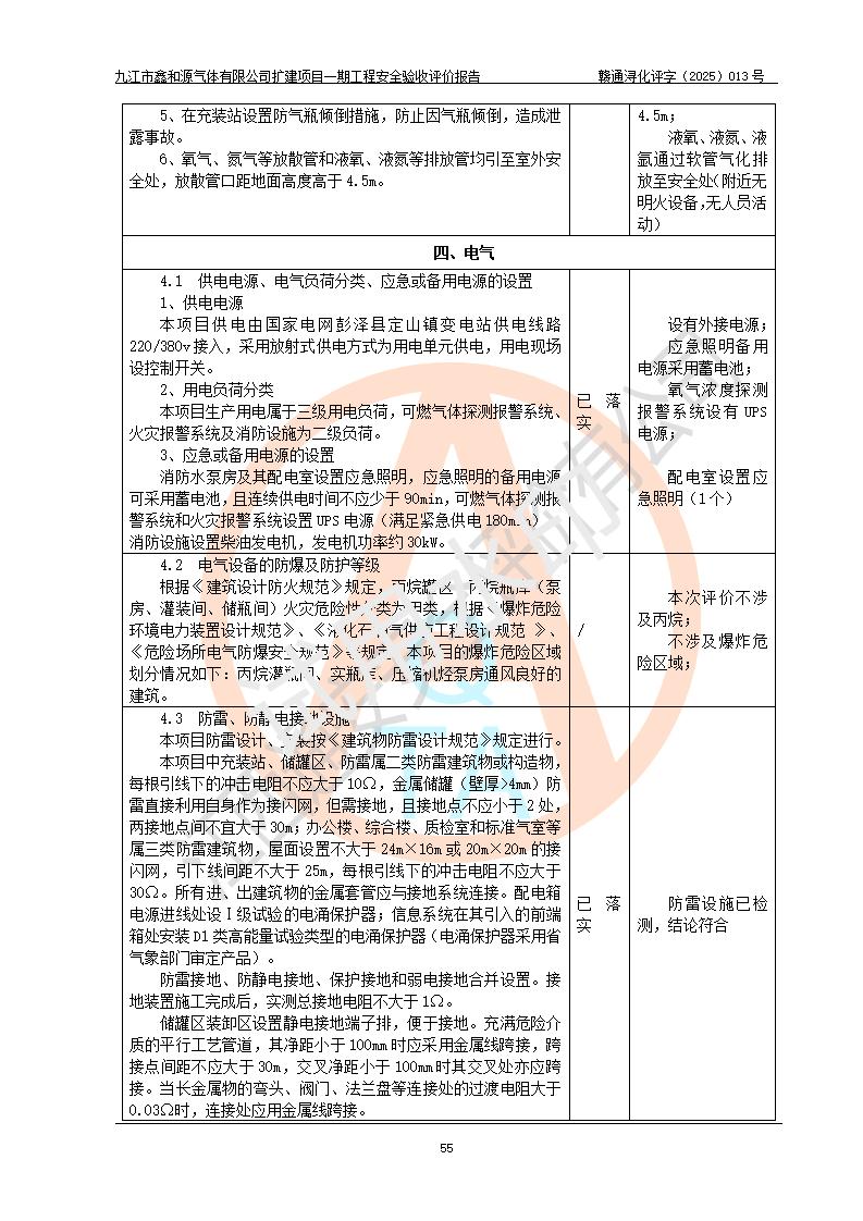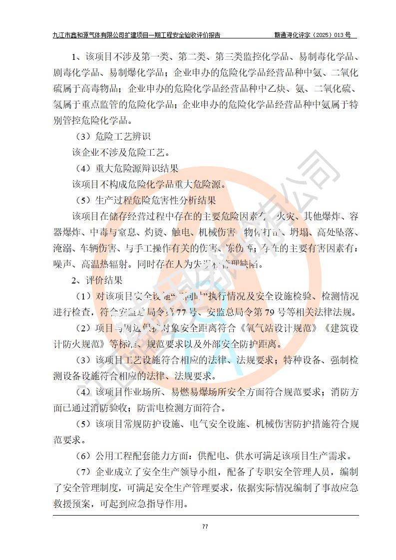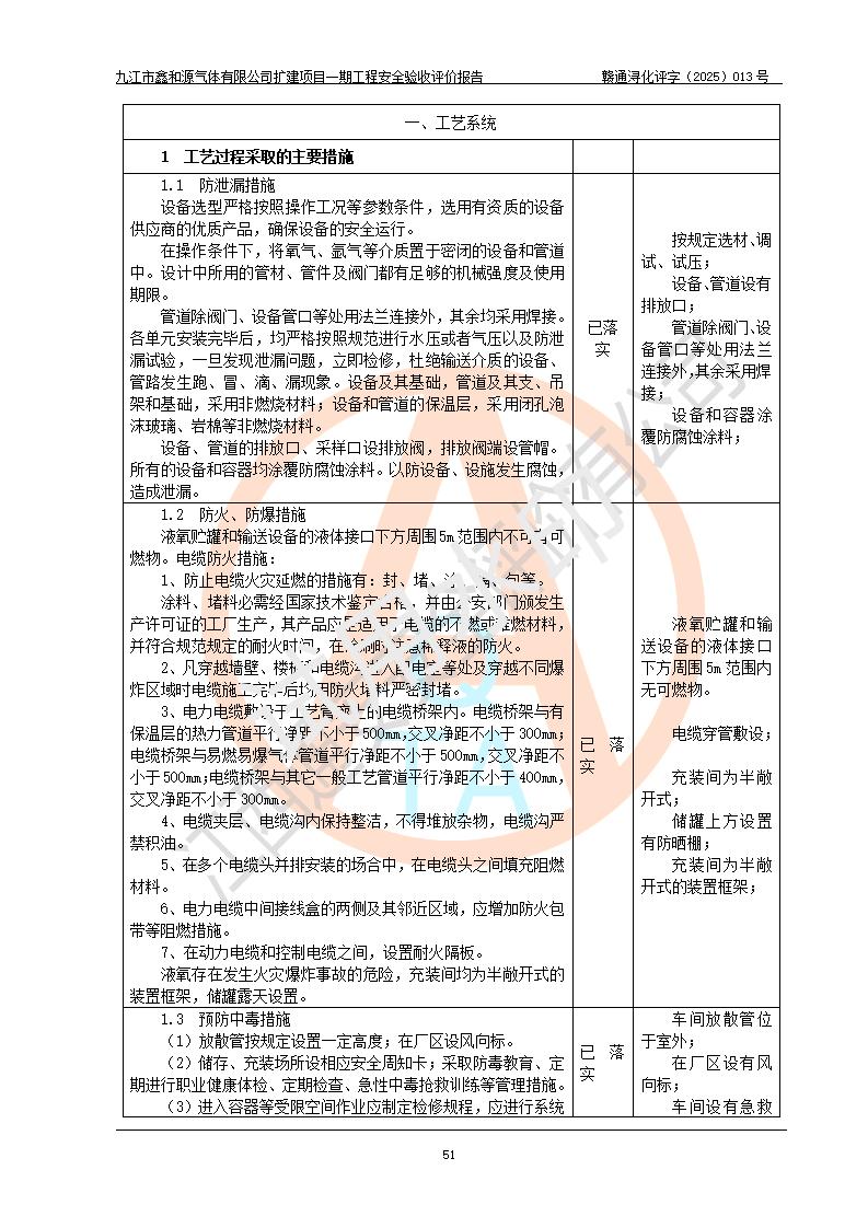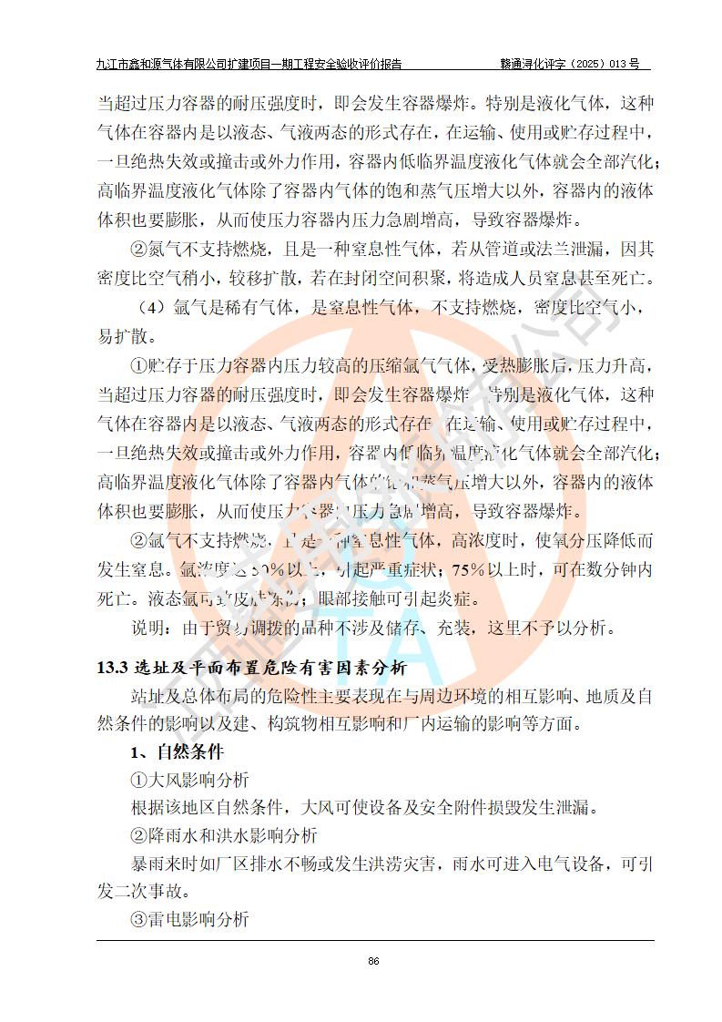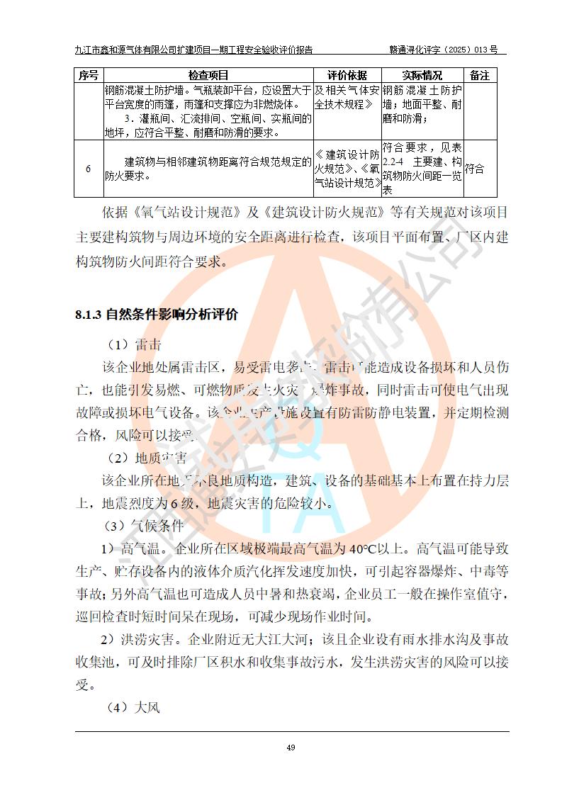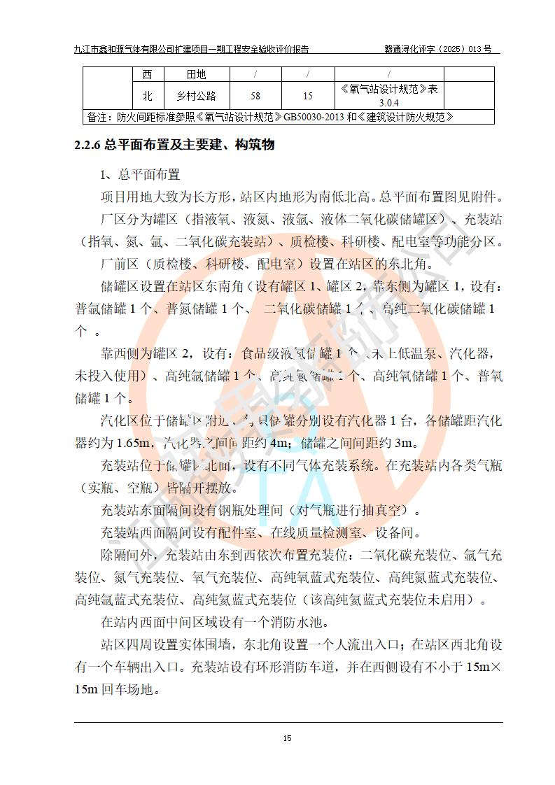 评价结论 | 经评价组评价,九江市鑫和源气体有限公司扩建2×20m3液氩、3×20m3液氮、2×20m3液氧、2×20m3CO2、2×50m3丙烷储存及充装项目一期工程总体布局、设备布置情况与设计图纸一致,本次项目(储存、充装)不涉及重点监管的危险化学品、危险工艺、重大危险源,按设计要求施工、安装;企业主要负责人及安全管理人员已取得危险化学品企业安全生产知识和管理能力考核合格证。项目选择的工艺过程及设备设施的安全可靠性能达到**法规、标准规定要求。 项目运行后存在的主要危险、有害因素有:火灾、其他爆炸、容器爆炸、冻伤等;存在的主要有害因素有噪声等;针对存在的危险、有害因素,企业采取了**的安全技术措施及安全管理措施,项目风险可控,其安全生产条件和安全管理方面具备竣工安全验收的条件。 | |||||