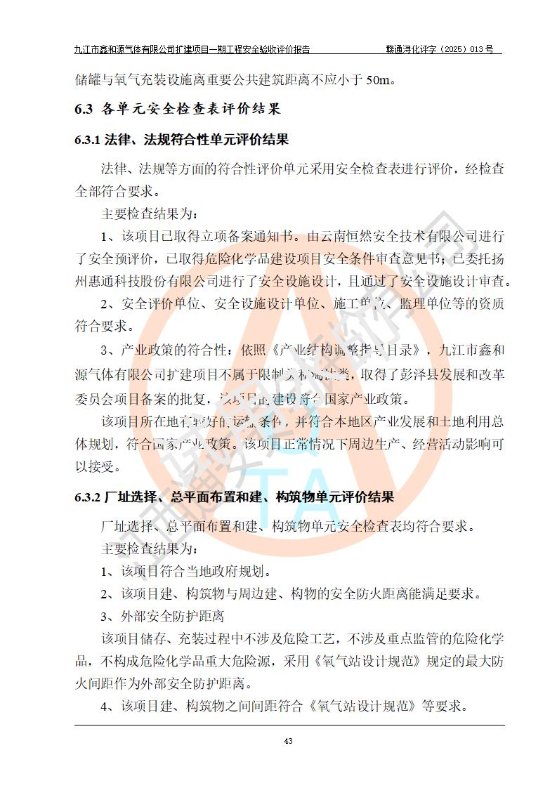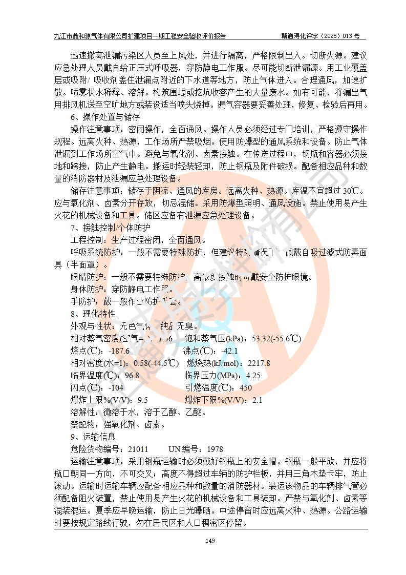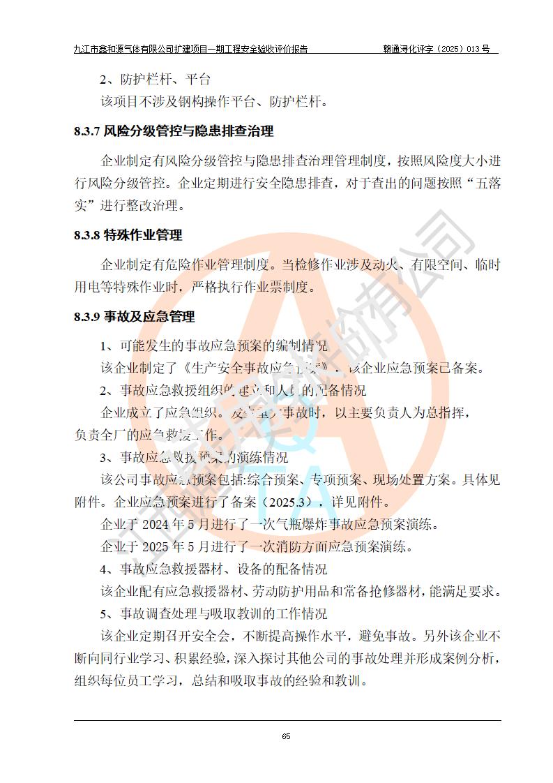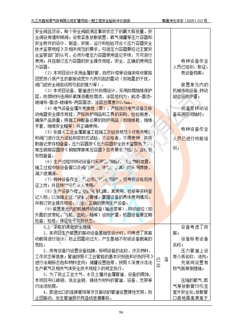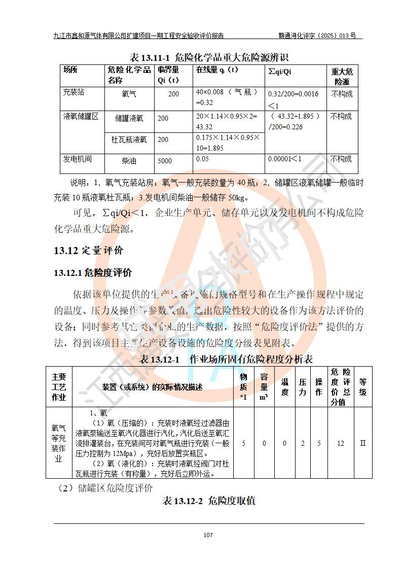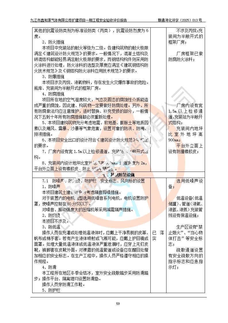 评价结论 | 经评价组评价,九江市鑫和源气体有限公司扩建2×20m3液氩、3×20m3液氮、2×20m3液氧、2×20m3CO2、2×50m3丙烷储存及充装项目一期工程总体布局、设备布置情况与设计图纸一致,本次项目(储存、充装)不涉及重点监管的危险化学品、危险工艺、重大危险源,按设计要求施工、安装;企业主要负责人及安全管理人员已取得危险化学品企业安全生产知识和管理能力考核合格证。项目选择的工艺过程及设备设施的安全可靠性能达到**法规、标准规定要求。 项目运行后存在的主要危险、有害因素有:火灾、其他爆炸、容器爆炸、冻伤等;存在的主要有害因素有噪声等;针对存在的危险、有害因素,企业采取了**的安全技术措施及安全管理措施,项目风险可控,其安全生产条件和安全管理方面具备竣工安全验收的条件。 | |||||