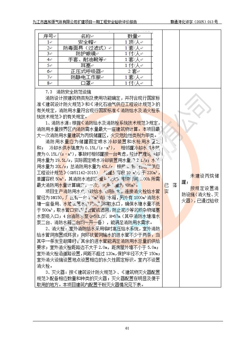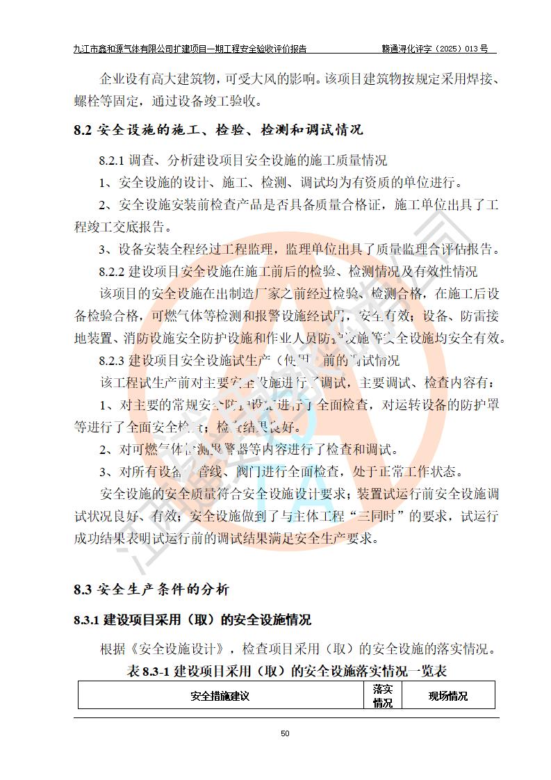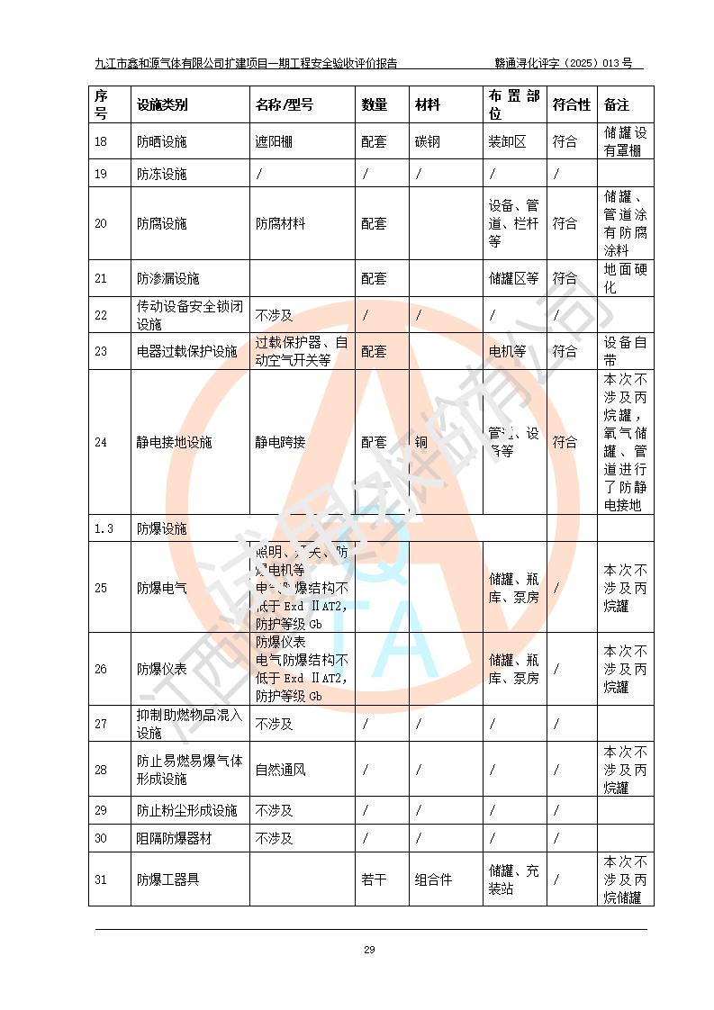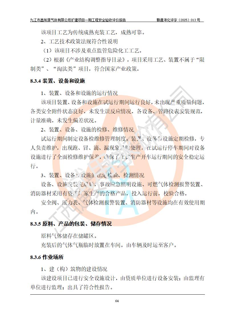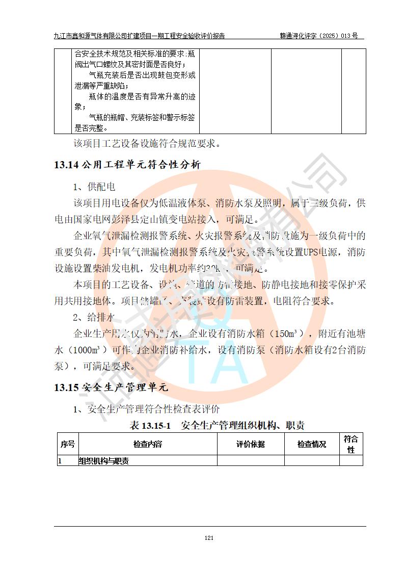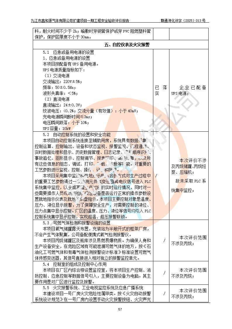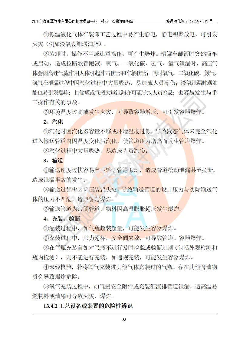 评价结论 | 经评价组评价,九江市鑫和源气体有限公司扩建2×20m3液氩、3×20m3液氮、2×20m3液氧、2×20m3CO2、2×50m3丙烷储存及充装项目一期工程总体布局、设备布置情况与设计图纸一致,本次项目(储存、充装)不涉及重点监管的危险化学品、危险工艺、重大危险源,按设计要求施工、安装;企业主要负责人及安全管理人员已取得危险化学品企业安全生产知识和管理能力考核合格证。项目选择的工艺过程及设备设施的安全可靠性能达到**法规、标准规定要求。 项目运行后存在的主要危险、有害因素有:火灾、其他爆炸、容器爆炸、冻伤等;存在的主要有害因素有噪声等;针对存在的危险、有害因素,企业采取了**的安全技术措施及安全管理措施,项目风险可控,其安全生产条件和安全管理方面具备竣工安全验收的条件。 | |||||