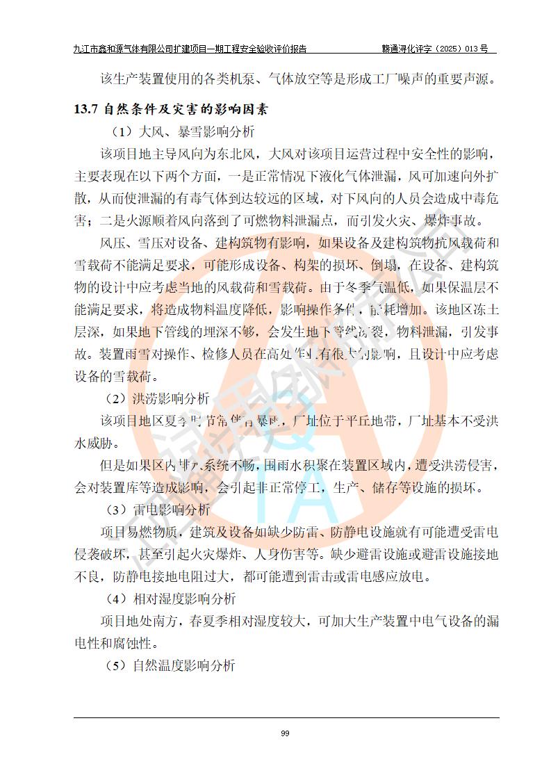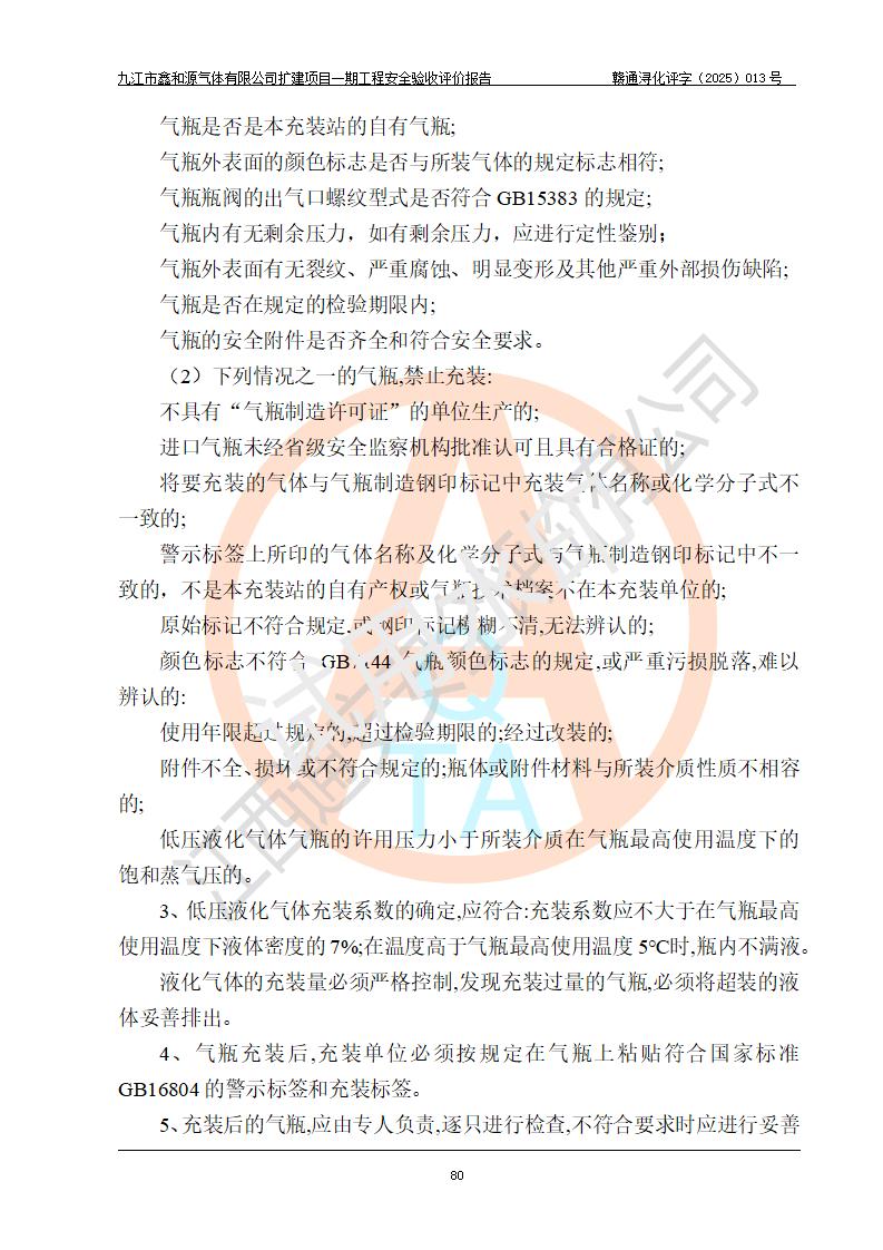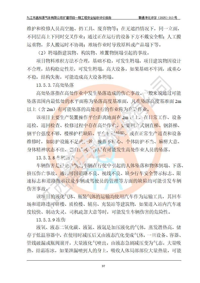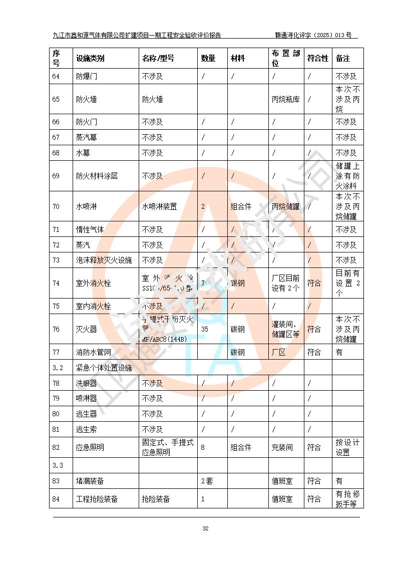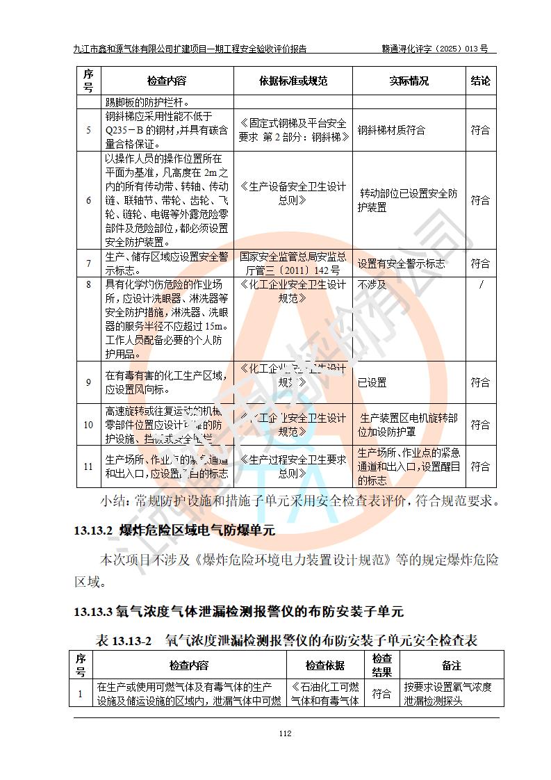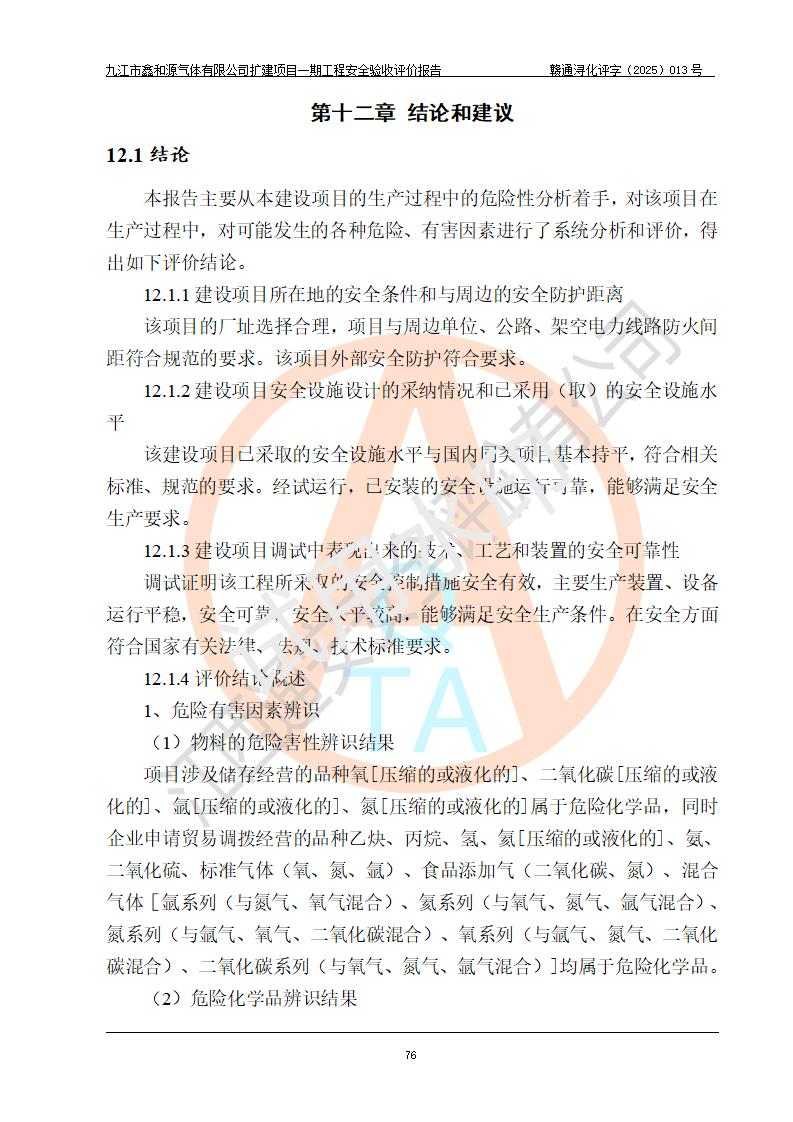 评价结论 | 经评价组评价,九江市鑫和源气体有限公司扩建2×20m3液氩、3×20m3液氮、2×20m3液氧、2×20m3CO2、2×50m3丙烷储存及充装项目一期工程总体布局、设备布置情况与设计图纸一致,本次项目(储存、充装)不涉及重点监管的危险化学品、危险工艺、重大危险源,按设计要求施工、安装;企业主要负责人及安全管理人员已取得危险化学品企业安全生产知识和管理能力考核合格证。项目选择的工艺过程及设备设施的安全可靠性能达到**法规、标准规定要求。 项目运行后存在的主要危险、有害因素有:火灾、其他爆炸、容器爆炸、冻伤等;存在的主要有害因素有噪声等;针对存在的危险、有害因素,企业采取了**的安全技术措施及安全管理措施,项目风险可控,其安全生产条件和安全管理方面具备竣工安全验收的条件。 | |||||