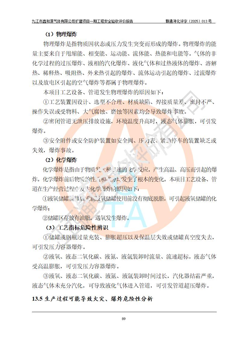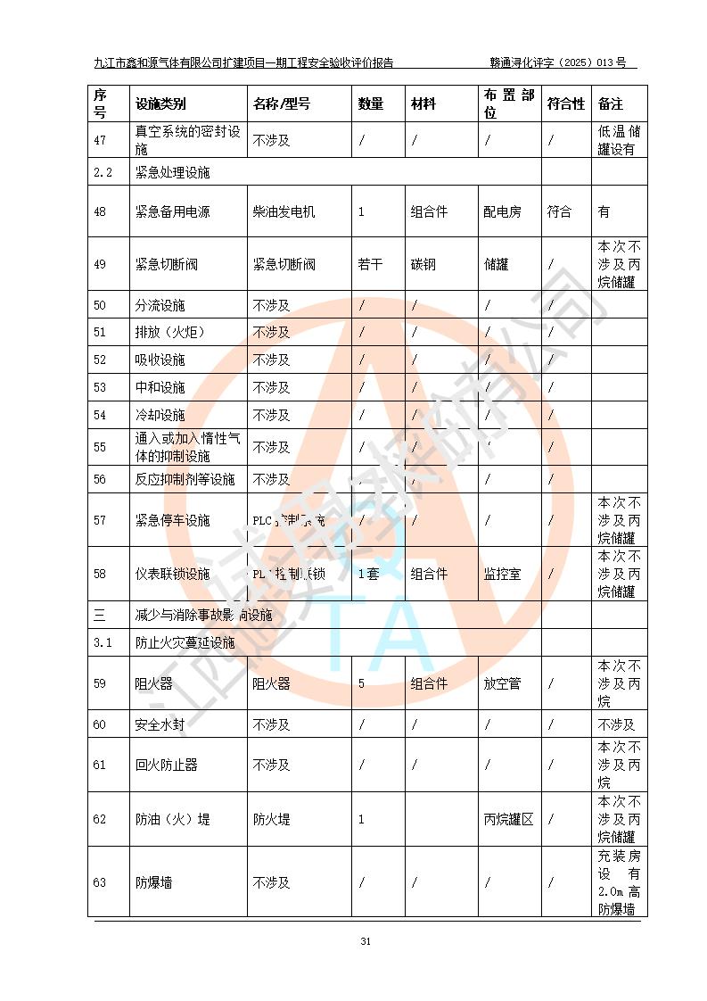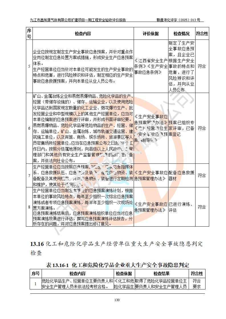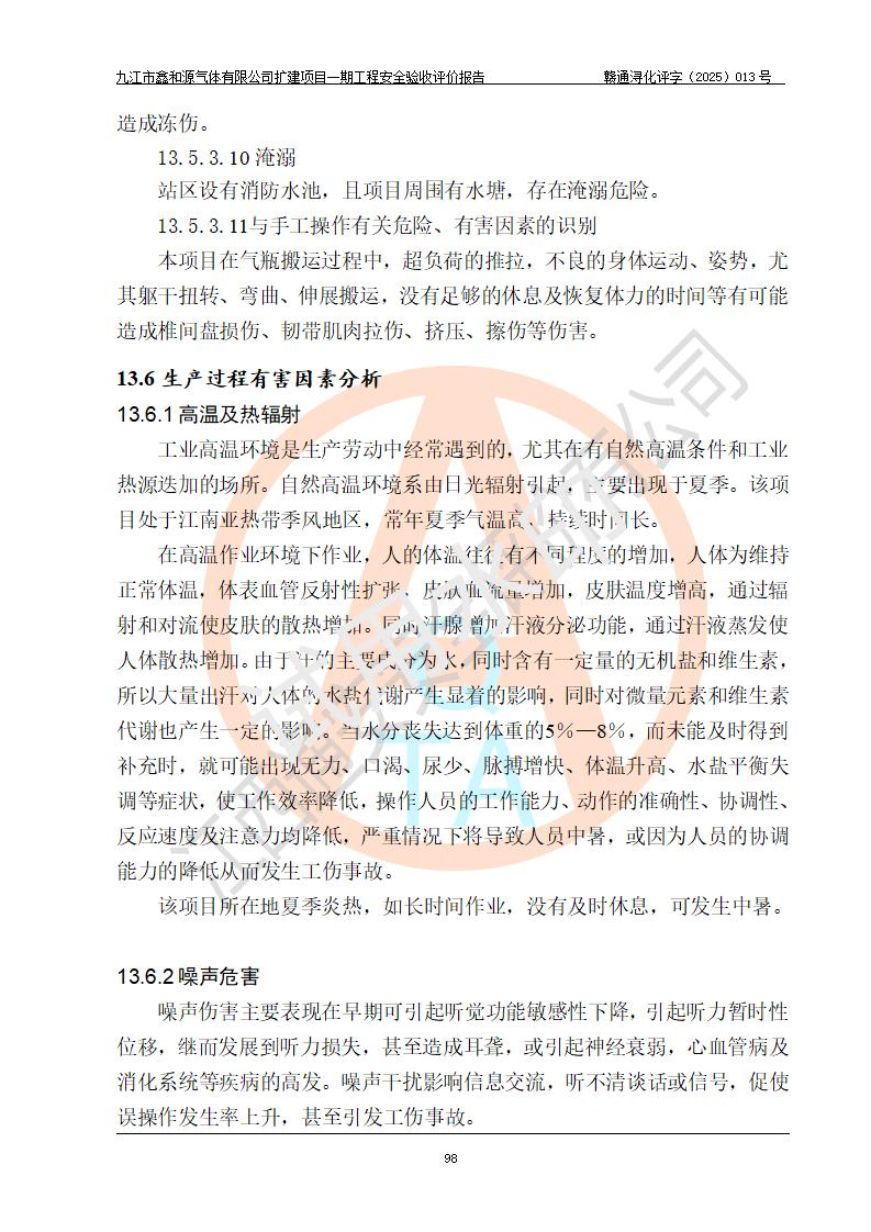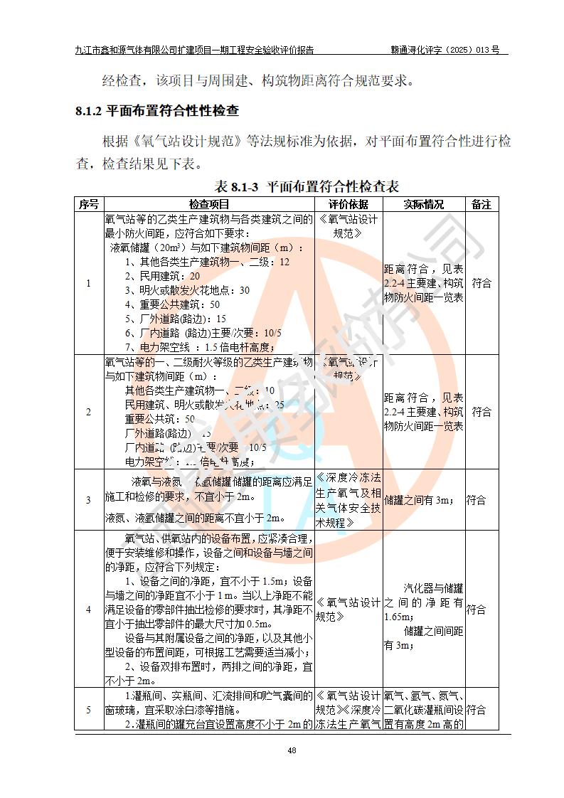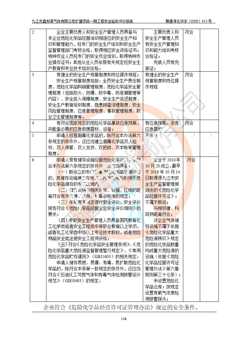 评价结论 | 经评价组评价,九江市鑫和源气体有限公司扩建2×20m3液氩、3×20m3液氮、2×20m3液氧、2×20m3CO2、2×50m3丙烷储存及充装项目一期工程总体布局、设备布置情况与设计图纸一致,本次项目(储存、充装)不涉及重点监管的危险化学品、危险工艺、重大危险源,按设计要求施工、安装;企业主要负责人及安全管理人员已取得危险化学品企业安全生产知识和管理能力考核合格证。项目选择的工艺过程及设备设施的安全可靠性能达到**法规、标准规定要求。 项目运行后存在的主要危险、有害因素有:火灾、其他爆炸、容器爆炸、冻伤等;存在的主要有害因素有噪声等;针对存在的危险、有害因素,企业采取了**的安全技术措施及安全管理措施,项目风险可控,其安全生产条件和安全管理方面具备竣工安全验收的条件。 | |||||