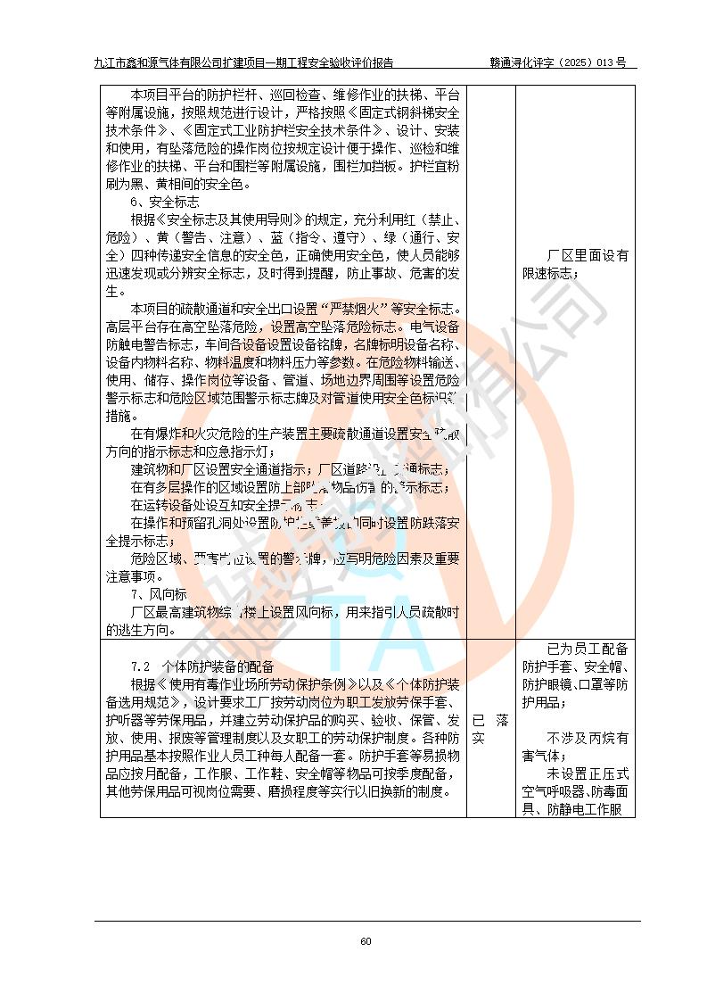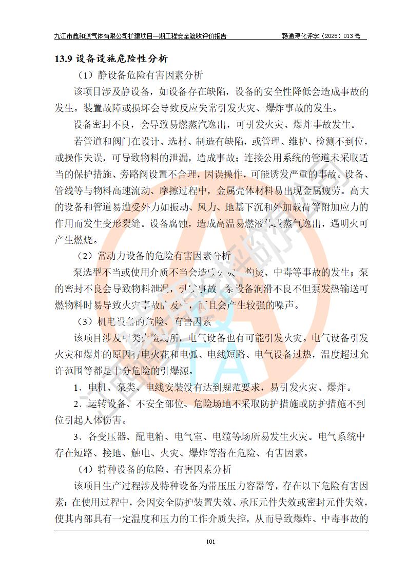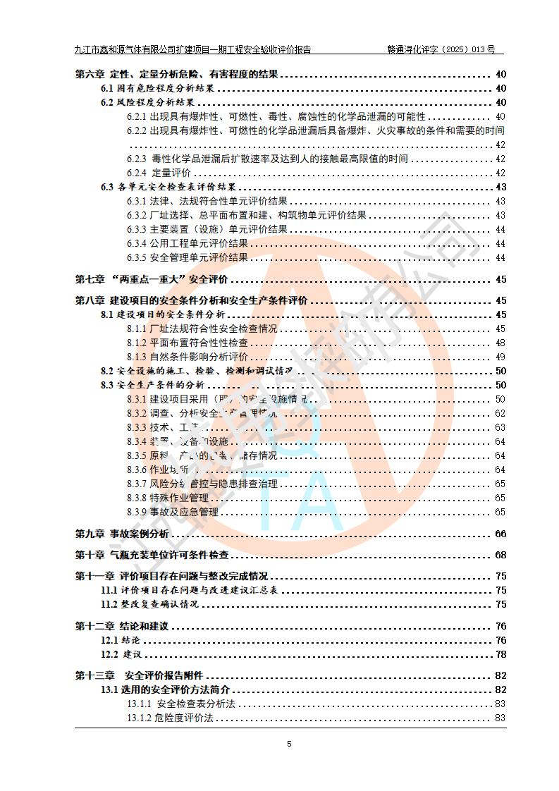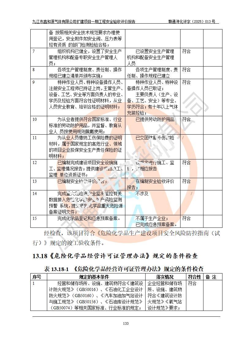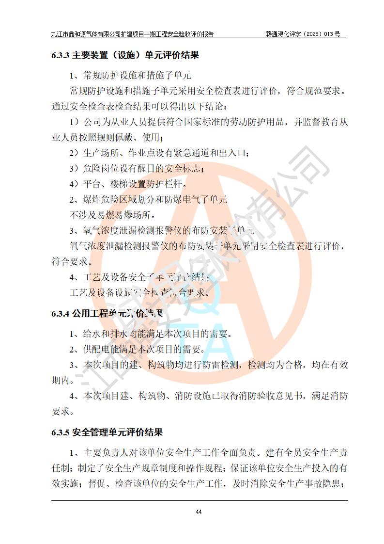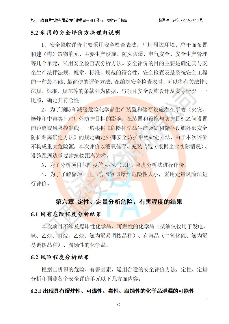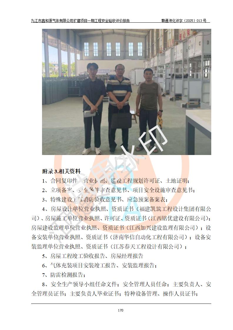 评价结论 | 经评价组评价,九江市鑫和源气体有限公司扩建2×20m3液氩、3×20m3液氮、2×20m3液氧、2×20m3CO2、2×50m3丙烷储存及充装项目一期工程总体布局、设备布置情况与设计图纸一致,本次项目(储存、充装)不涉及重点监管的危险化学品、危险工艺、重大危险源,按设计要求施工、安装;企业主要负责人及安全管理人员已取得危险化学品企业安全生产知识和管理能力考核合格证。项目选择的工艺过程及设备设施的安全可靠性能达到**法规、标准规定要求。 项目运行后存在的主要危险、有害因素有:火灾、其他爆炸、容器爆炸、冻伤等;存在的主要有害因素有噪声等;针对存在的危险、有害因素,企业采取了**的安全技术措施及安全管理措施,项目风险可控,其安全生产条件和安全管理方面具备竣工安全验收的条件。 | |||||