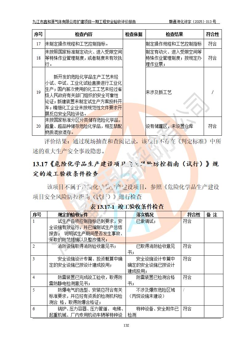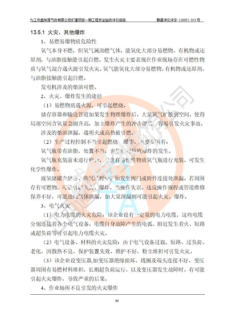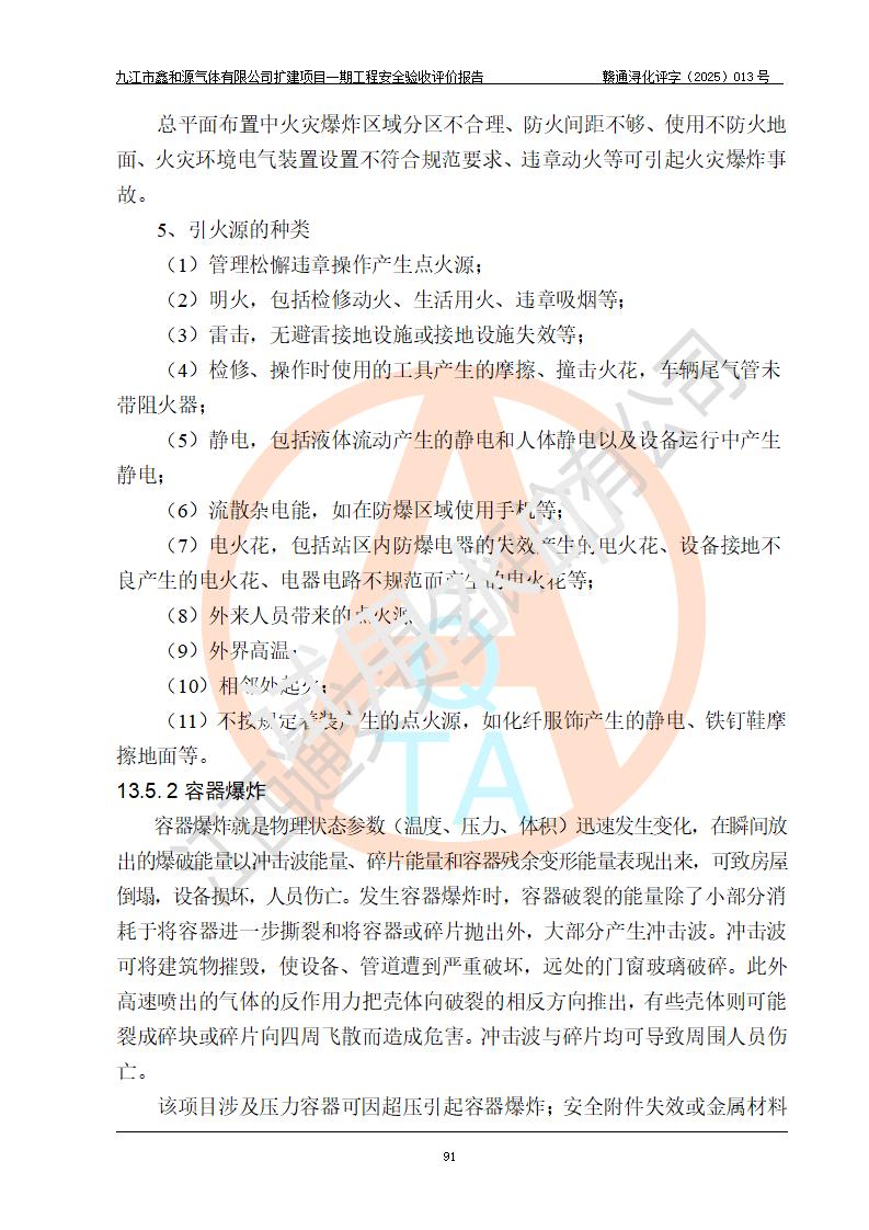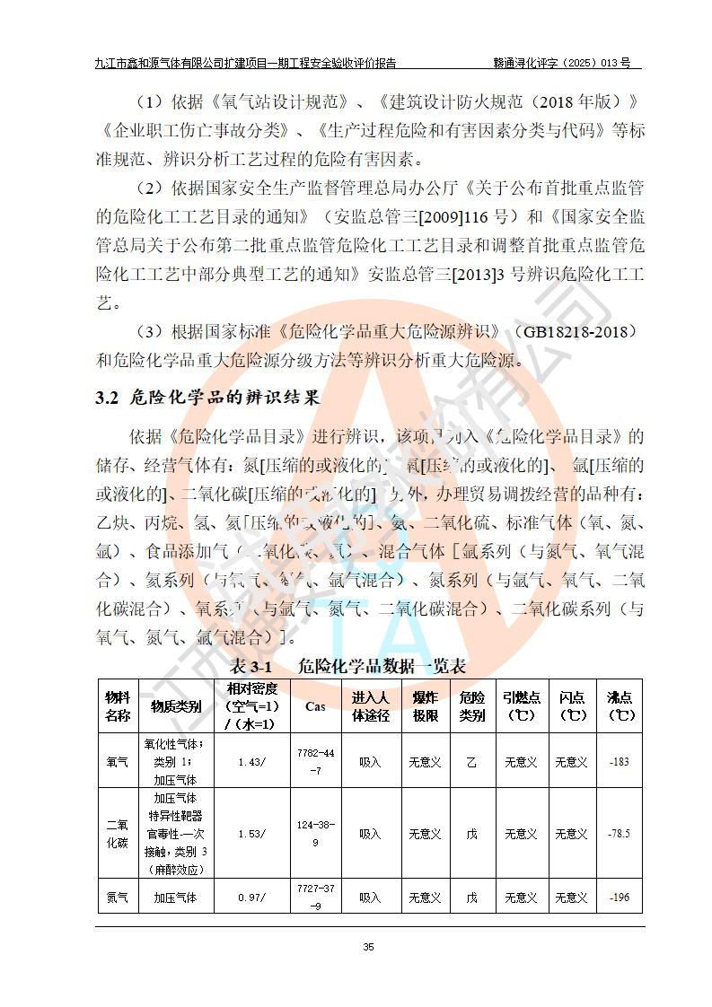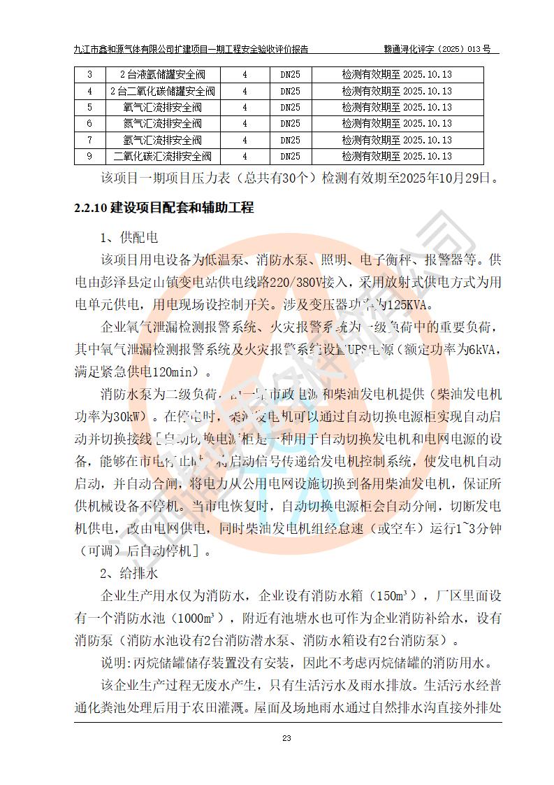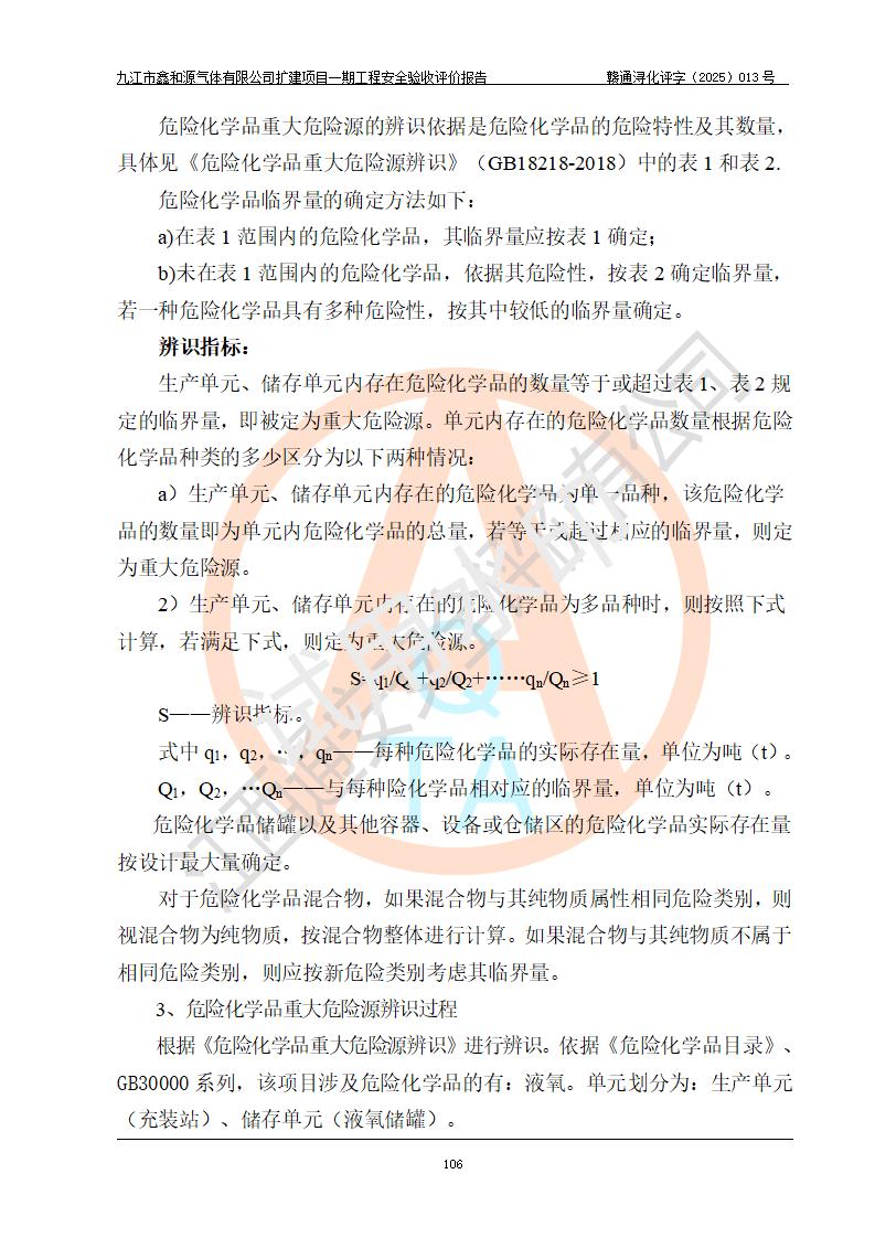 评价结论 | 经评价组评价,九江市鑫和源气体有限公司扩建2×20m3液氩、3×20m3液氮、2×20m3液氧、2×20m3CO2、2×50m3丙烷储存及充装项目一期工程总体布局、设备布置情况与设计图纸一致,本次项目(储存、充装)不涉及重点监管的危险化学品、危险工艺、重大危险源,按设计要求施工、安装;企业主要负责人及安全管理人员已取得危险化学品企业安全生产知识和管理能力考核合格证。项目选择的工艺过程及设备设施的安全可靠性能达到**法规、标准规定要求。 项目运行后存在的主要危险、有害因素有:火灾、其他爆炸、容器爆炸、冻伤等;存在的主要有害因素有噪声等;针对存在的危险、有害因素,企业采取了**的安全技术措施及安全管理措施,项目风险可控,其安全生产条件和安全管理方面具备竣工安全验收的条件。 | |||||