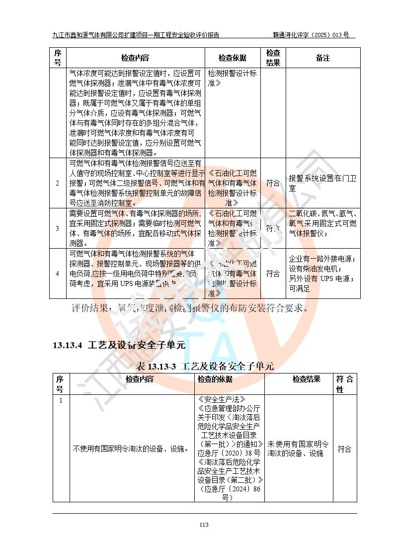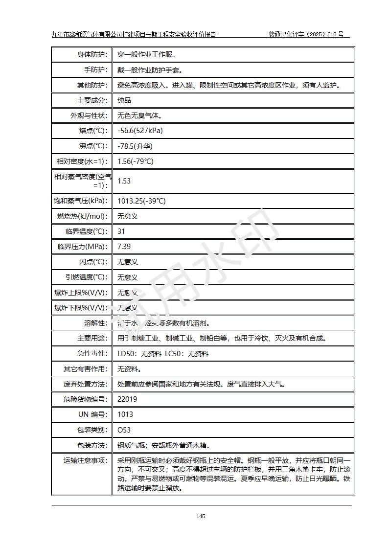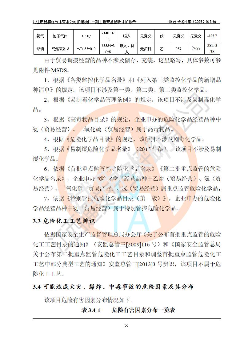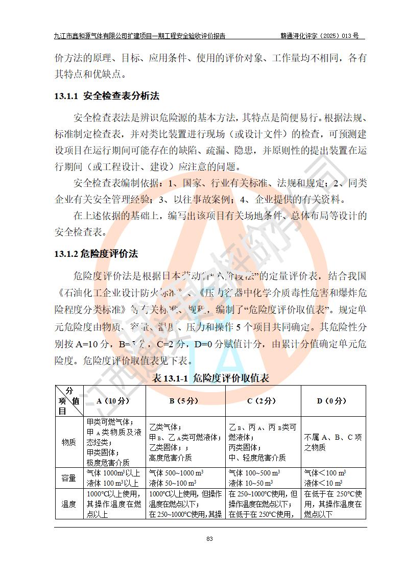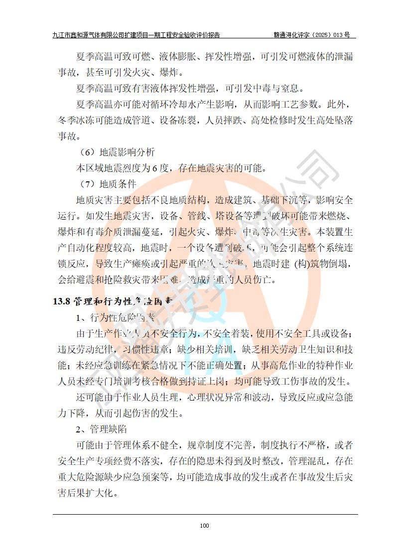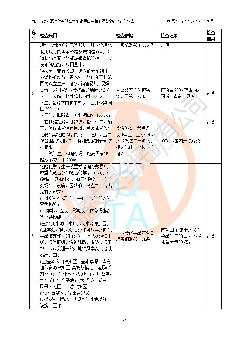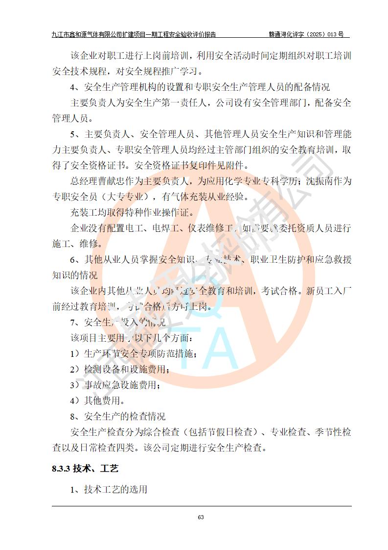 评价结论 | 经评价组评价,九江市鑫和源气体有限公司扩建2×20m3液氩、3×20m3液氮、2×20m3液氧、2×20m3CO2、2×50m3丙烷储存及充装项目一期工程总体布局、设备布置情况与设计图纸一致,本次项目(储存、充装)不涉及重点监管的危险化学品、危险工艺、重大危险源,按设计要求施工、安装;企业主要负责人及安全管理人员已取得危险化学品企业安全生产知识和管理能力考核合格证。项目选择的工艺过程及设备设施的安全可靠性能达到**法规、标准规定要求。 项目运行后存在的主要危险、有害因素有:火灾、其他爆炸、容器爆炸、冻伤等;存在的主要有害因素有噪声等;针对存在的危险、有害因素,企业采取了**的安全技术措施及安全管理措施,项目风险可控,其安全生产条件和安全管理方面具备竣工安全验收的条件。 | |||||