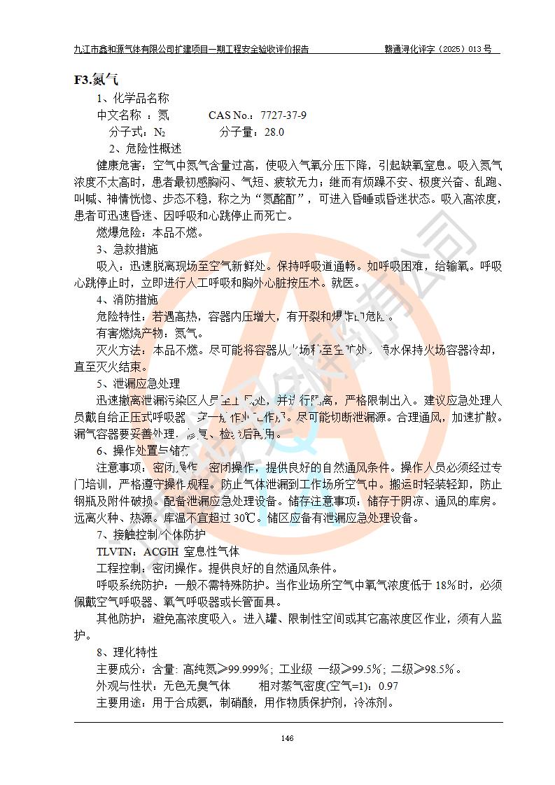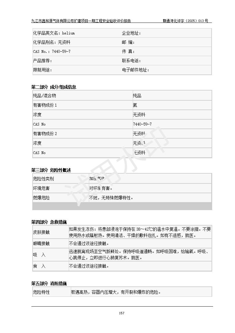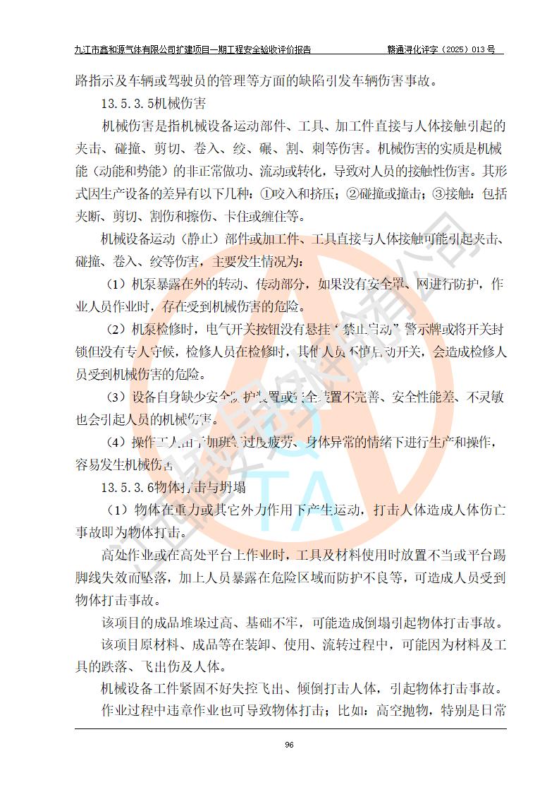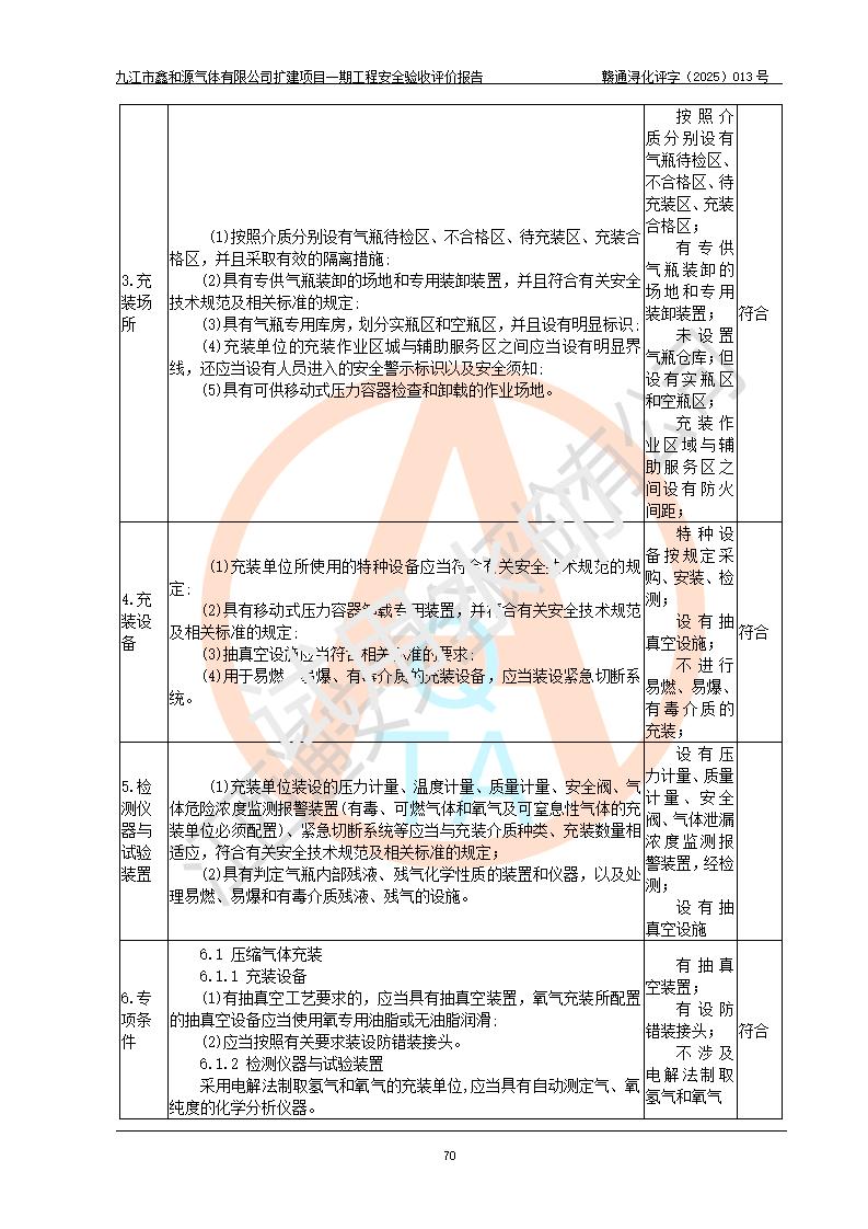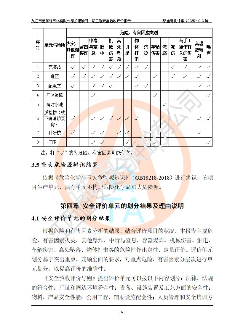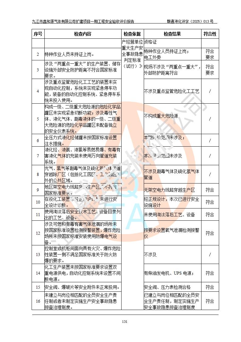 评价结论 | 经评价组评价,九江市鑫和源气体有限公司扩建2×20m3液氩、3×20m3液氮、2×20m3液氧、2×20m3CO2、2×50m3丙烷储存及充装项目一期工程总体布局、设备布置情况与设计图纸一致,本次项目(储存、充装)不涉及重点监管的危险化学品、危险工艺、重大危险源,按设计要求施工、安装;企业主要负责人及安全管理人员已取得危险化学品企业安全生产知识和管理能力考核合格证。项目选择的工艺过程及设备设施的安全可靠性能达到**法规、标准规定要求。 项目运行后存在的主要危险、有害因素有:火灾、其他爆炸、容器爆炸、冻伤等;存在的主要有害因素有噪声等;针对存在的危险、有害因素,企业采取了**的安全技术措施及安全管理措施,项目风险可控,其安全生产条件和安全管理方面具备竣工安全验收的条件。 | |||||