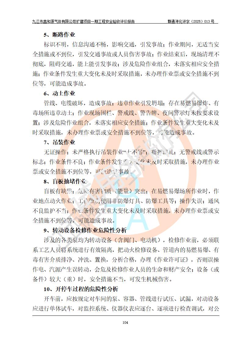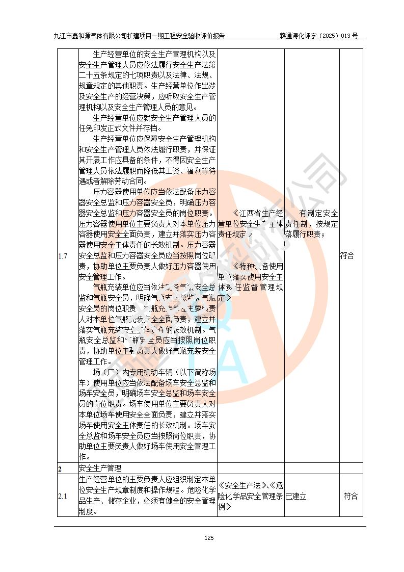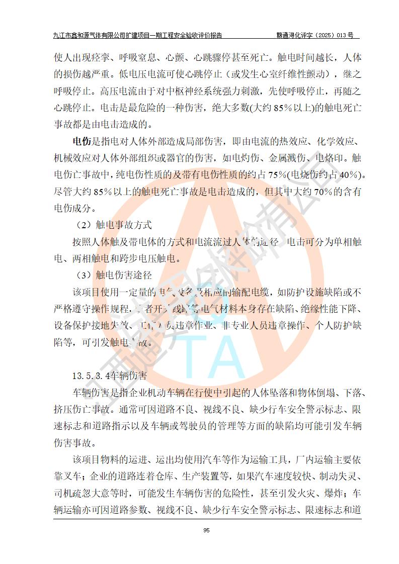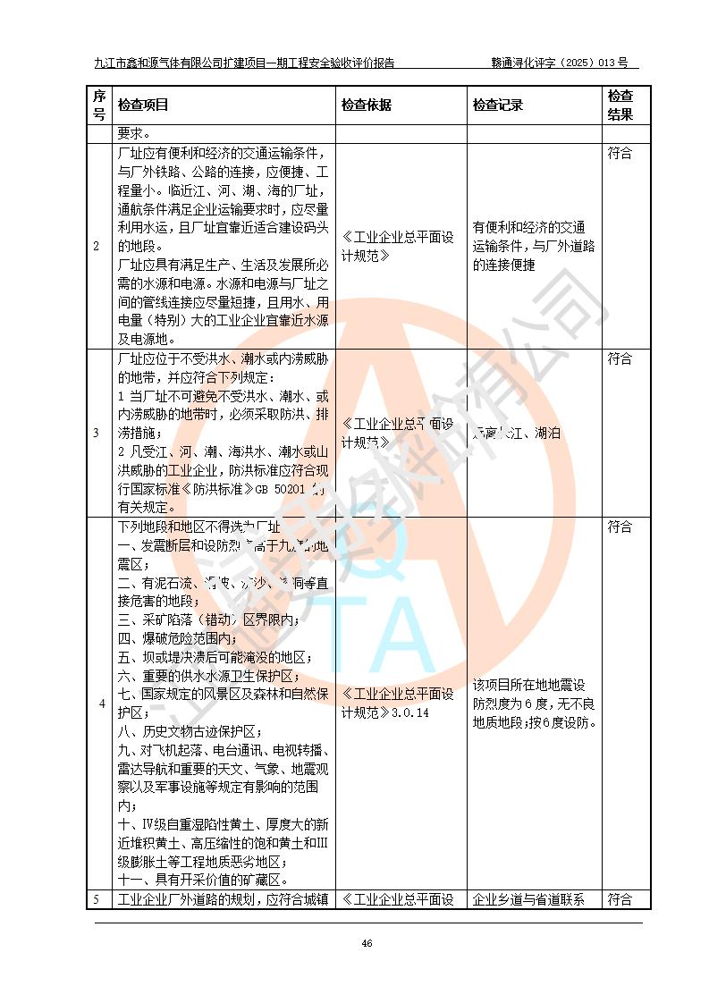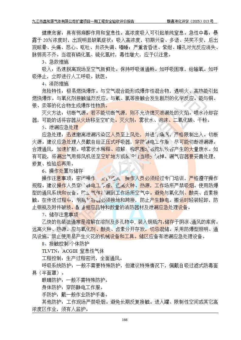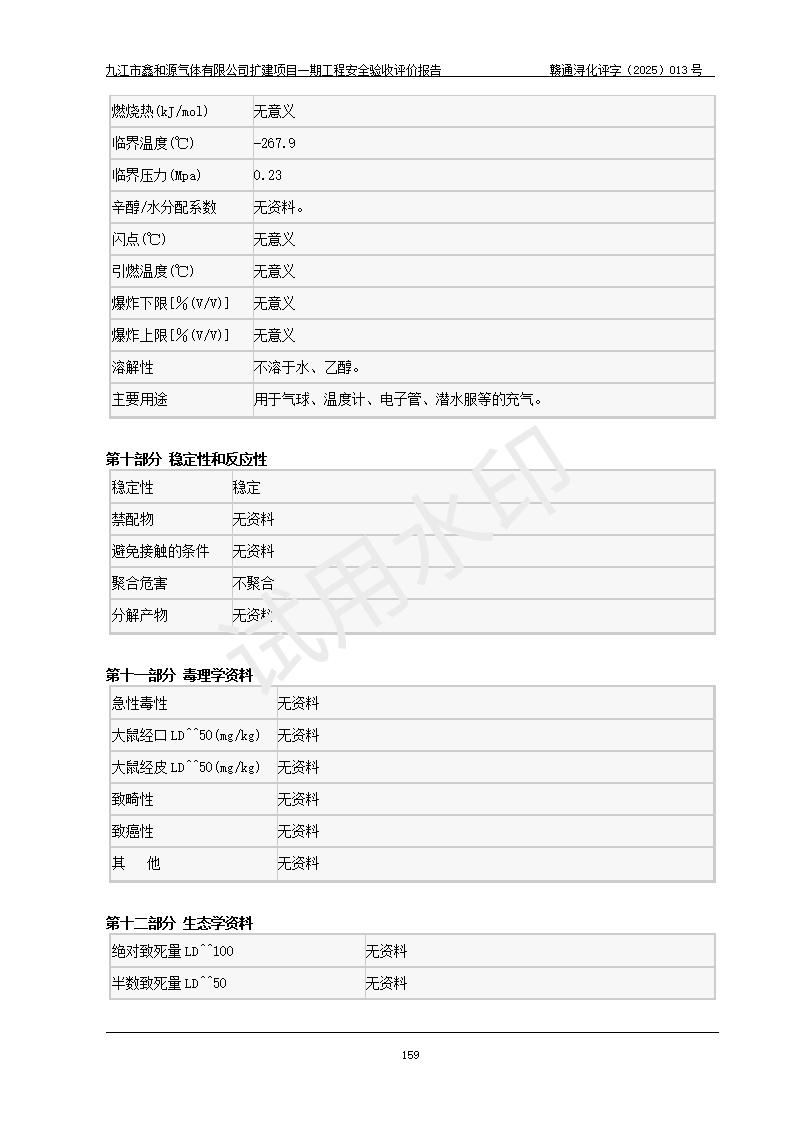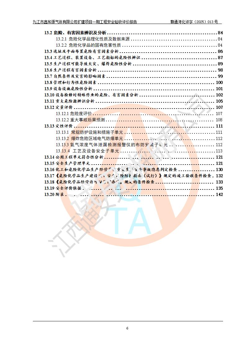 评价结论 | 经评价组评价,九江市鑫和源气体有限公司扩建2×20m3液氩、3×20m3液氮、2×20m3液氧、2×20m3CO2、2×50m3丙烷储存及充装项目一期工程总体布局、设备布置情况与设计图纸一致,本次项目(储存、充装)不涉及重点监管的危险化学品、危险工艺、重大危险源,按设计要求施工、安装;企业主要负责人及安全管理人员已取得危险化学品企业安全生产知识和管理能力考核合格证。项目选择的工艺过程及设备设施的安全可靠性能达到**法规、标准规定要求。 项目运行后存在的主要危险、有害因素有:火灾、其他爆炸、容器爆炸、冻伤等;存在的主要有害因素有噪声等;针对存在的危险、有害因素,企业采取了**的安全技术措施及安全管理措施,项目风险可控,其安全生产条件和安全管理方面具备竣工安全验收的条件。 | |||||
