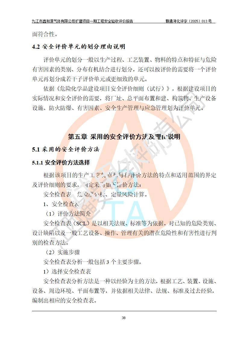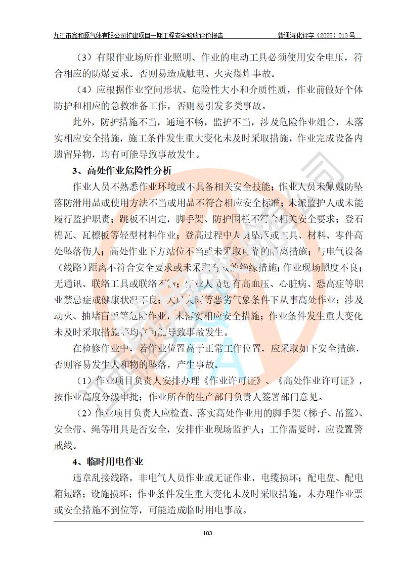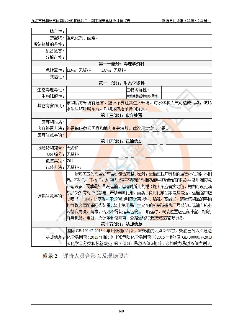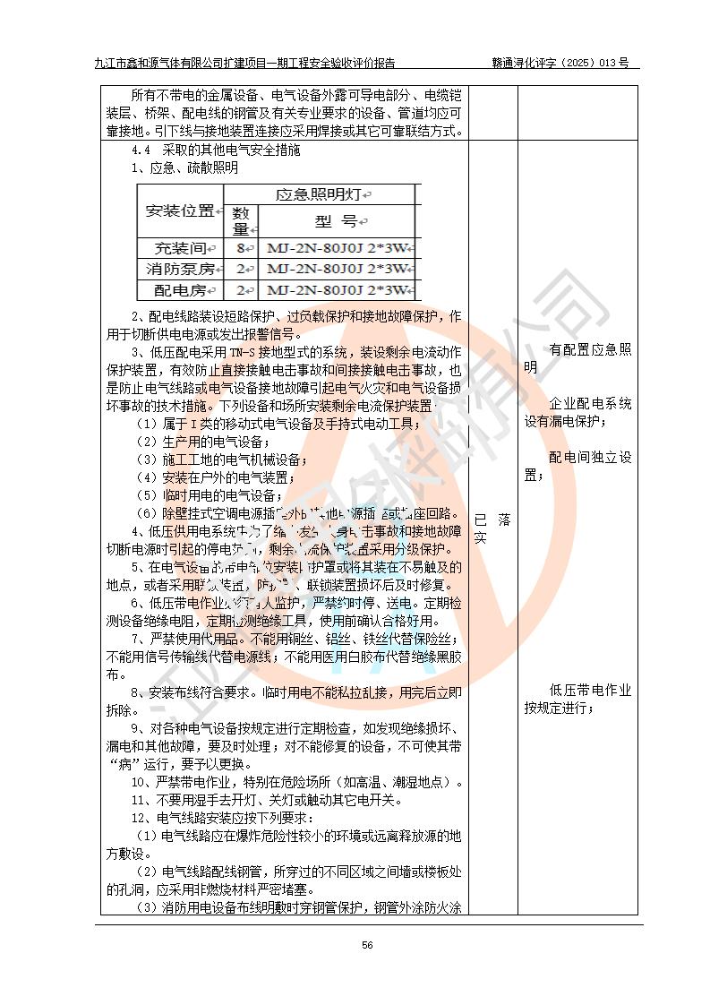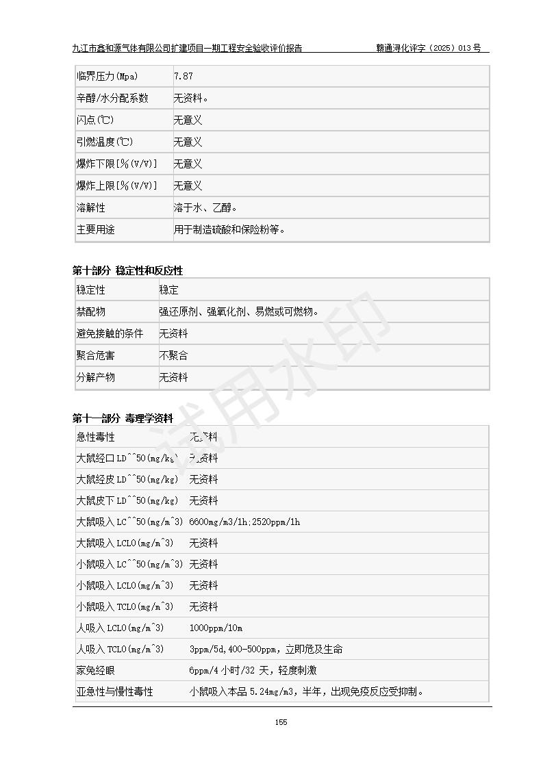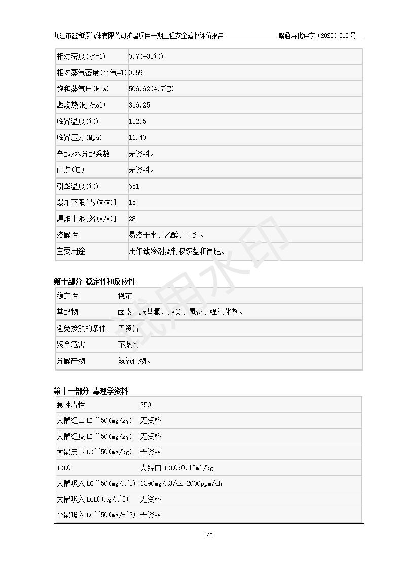 评价结论 | 经评价组评价,九江市鑫和源气体有限公司扩建2×20m3液氩、3×20m3液氮、2×20m3液氧、2×20m3CO2、2×50m3丙烷储存及充装项目一期工程总体布局、设备布置情况与设计图纸一致,本次项目(储存、充装)不涉及重点监管的危险化学品、危险工艺、重大危险源,按设计要求施工、安装;企业主要负责人及安全管理人员已取得危险化学品企业安全生产知识和管理能力考核合格证。项目选择的工艺过程及设备设施的安全可靠性能达到**法规、标准规定要求。 项目运行后存在的主要危险、有害因素有:火灾、其他爆炸、容器爆炸、冻伤等;存在的主要有害因素有噪声等;针对存在的危险、有害因素,企业采取了**的安全技术措施及安全管理措施,项目风险可控,其安全生产条件和安全管理方面具备竣工安全验收的条件。 | |||||