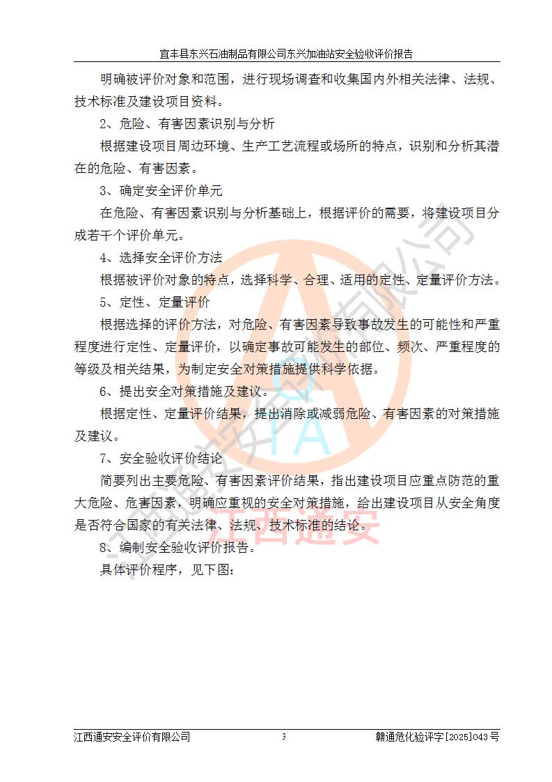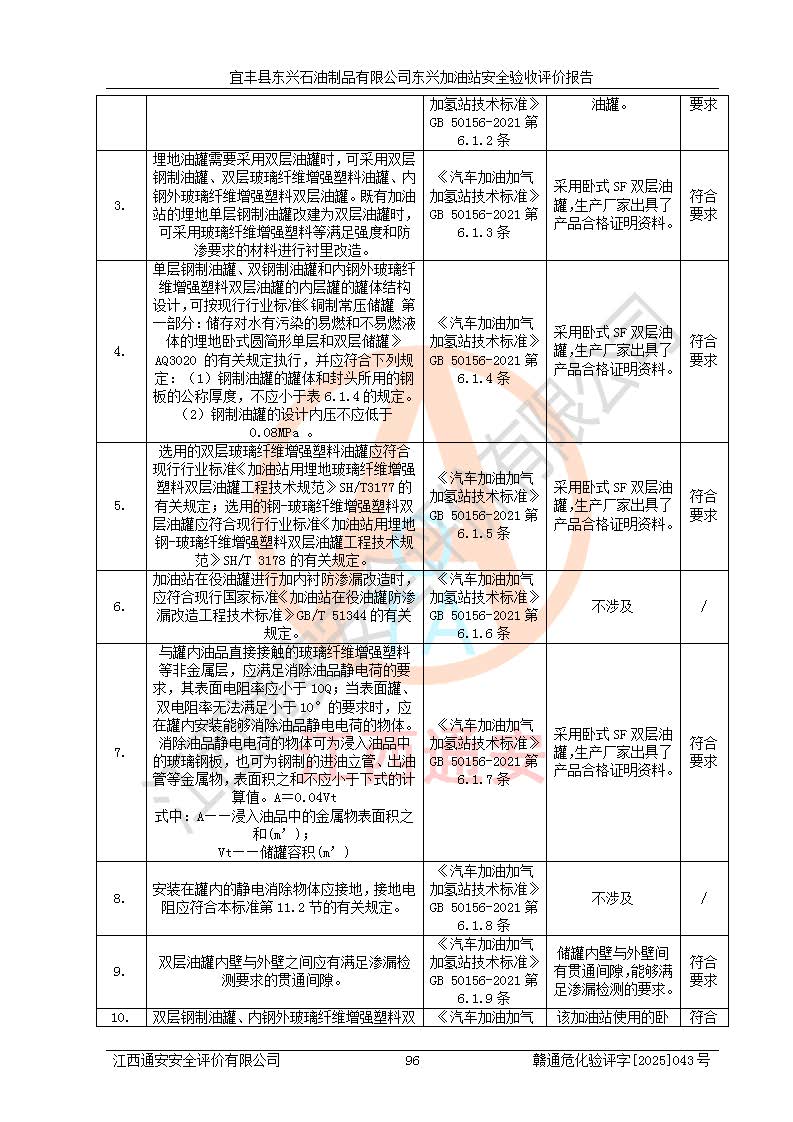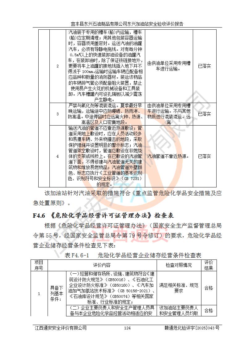 主要任务 | 本评价报告主要针对评价范围内汽油、柴油储存经营过程所涉及的危险、有害因素及重大危险源等进行辨识与分析,根据相应法律、法规、标准的要求检查安全设施的配置及相关检测检验情况及其符合性,检查公用工程及辅助设施的配套性,审核安全生产管理机构、制度、人员培训、设备管理、操作规程、应急预案及劳动防护用品的配备等,对该项目安全设施及安全措施进行符合性评价,并在此基础上提出相应的安全对策措施及建议。 | ||||