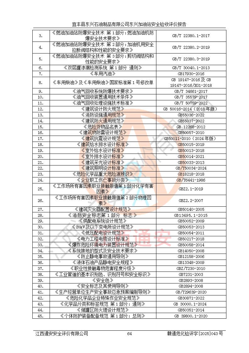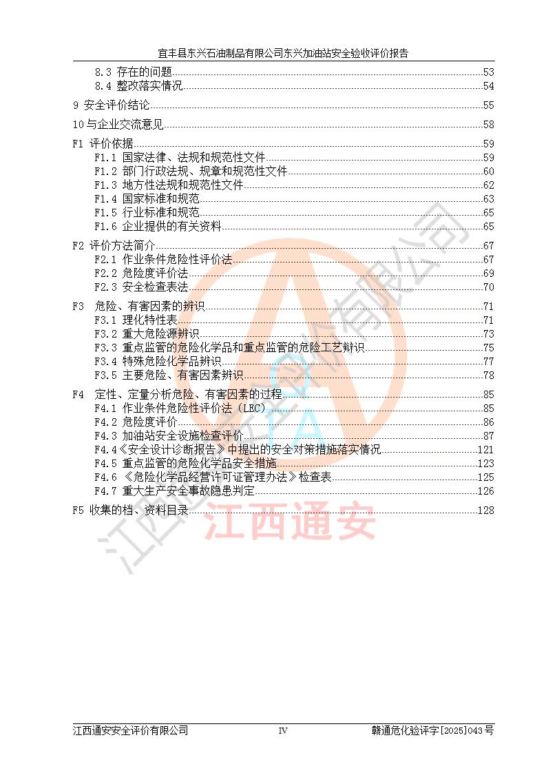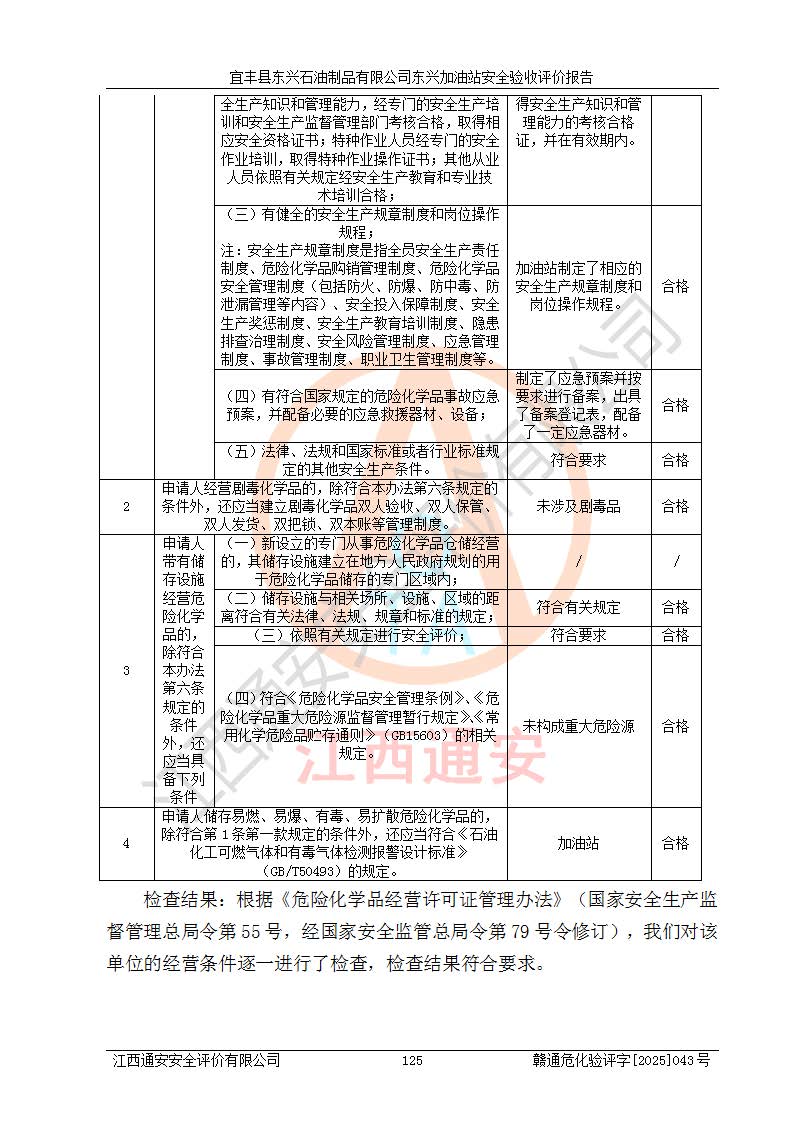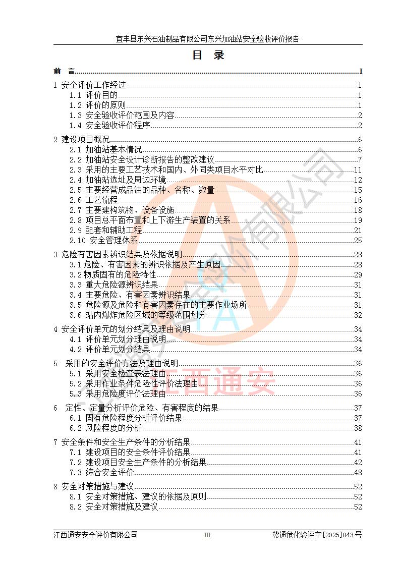 主要任务 | 本评价报告主要针对评价范围内汽油、柴油储存经营过程所涉及的危险、有害因素及重大危险源等进行辨识与分析,根据相应法律、法规、标准的要求检查安全设施的配置及相关检测检验情况及其符合性,检查公用工程及辅助设施的配套性,审核安全生产管理机构、制度、人员培训、设备管理、操作规程、应急预案及劳动防护用品的配备等,对该项目安全设施及安全措施进行符合性评价,并在此基础上提出相应的安全对策措施及建议。 | ||||