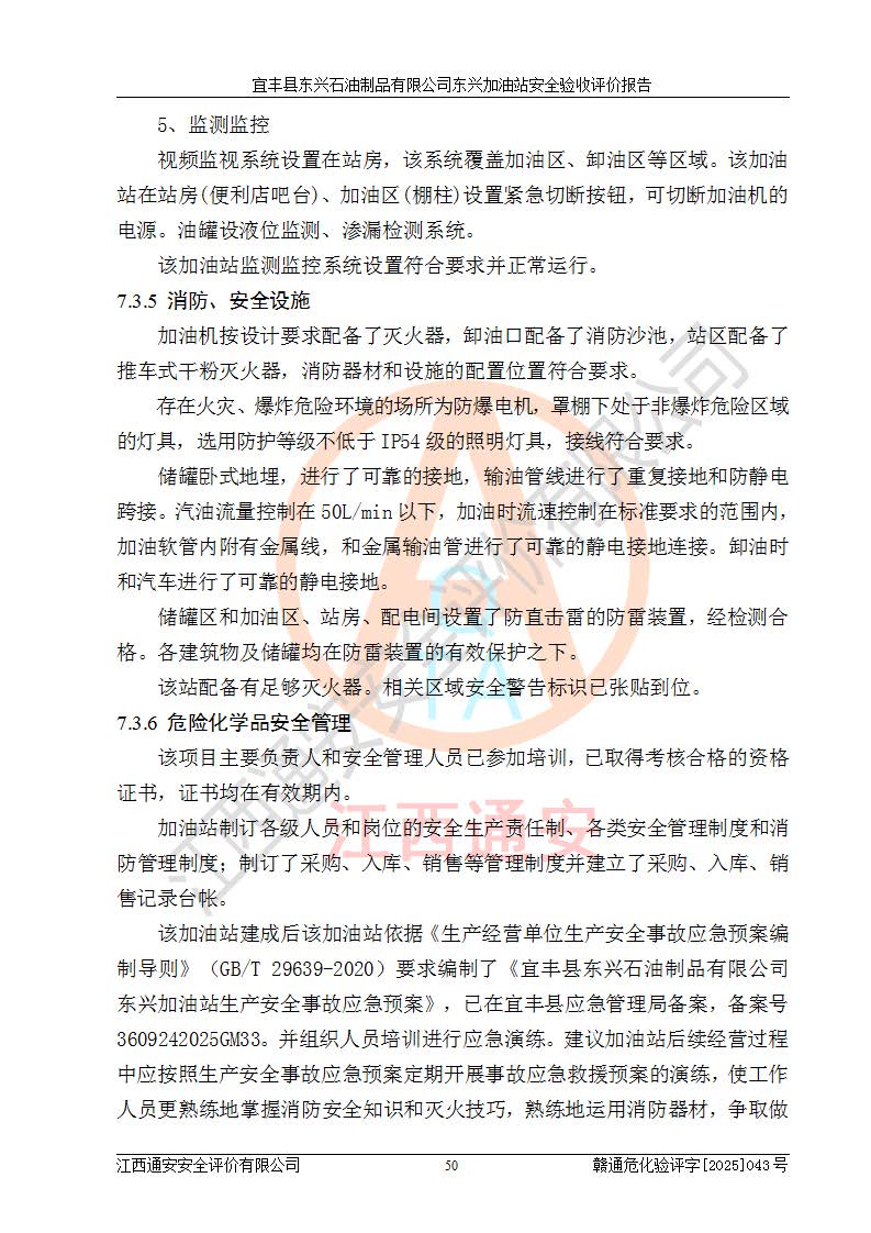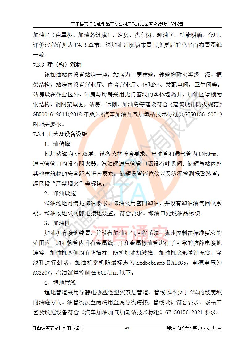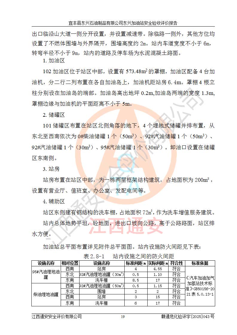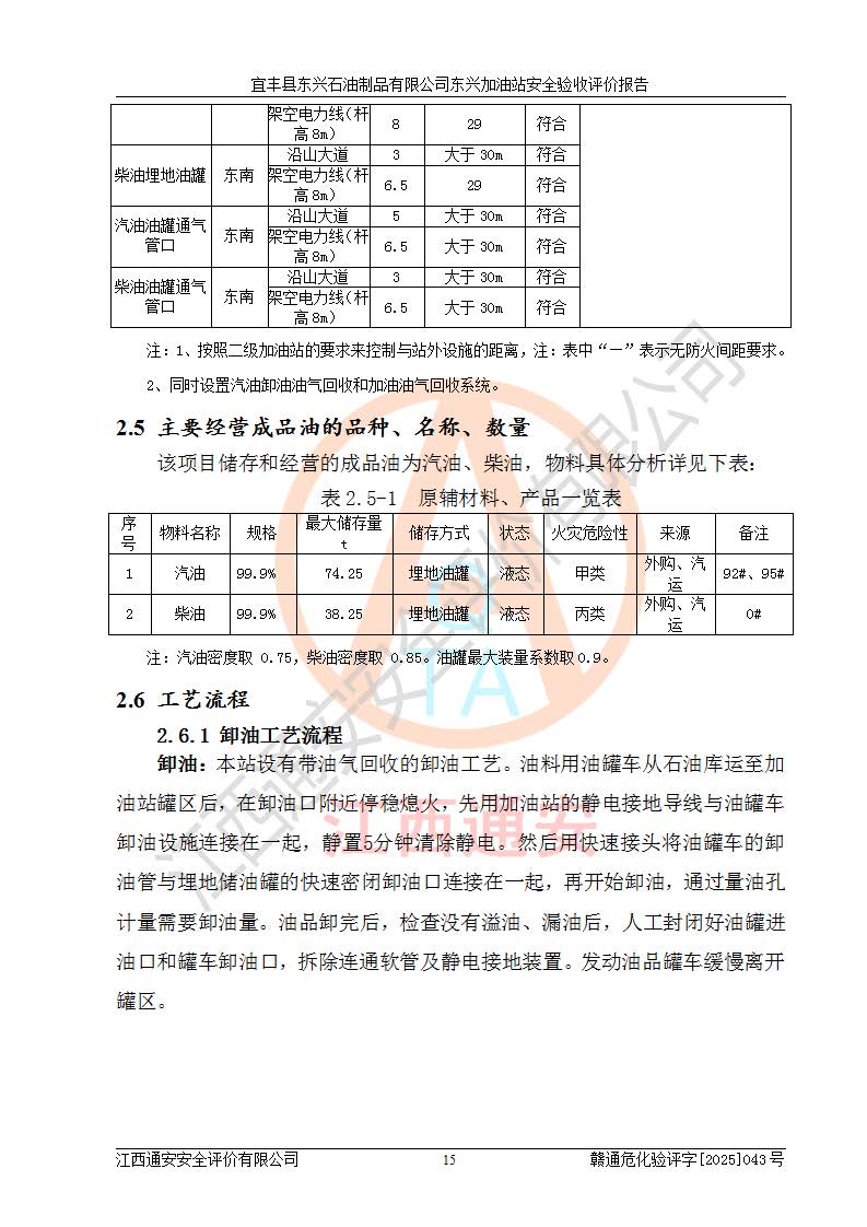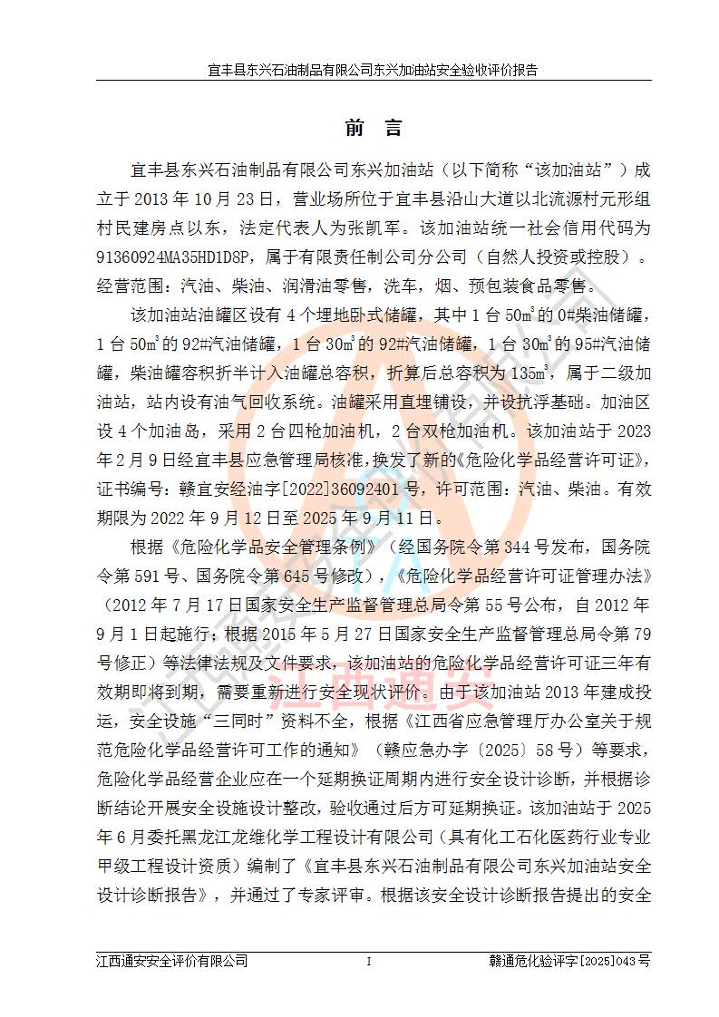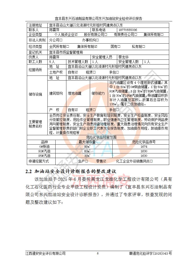 项目简介 | 宜丰县东兴石油制品有限公司东兴加油站(以下简称“该加油站”)成立于2013年10月23日,营业场所位于宜丰县沿山大道以北流源村元形组村民建房点以东,法定**人为张凯军。该加油站统一社会信用代码为91360924MA35HD1D8P,属于有限责任制公司分公司(自然人投资或控股)。经营范围:汽油、柴油、润滑油零售,洗车,烟、预包装食品零售。 该加油站油罐区设有4个埋地卧式储罐,其中1台50m3的0#柴油储罐,1台50m3的92#汽油储罐,1台30m3的92#汽油储罐,1台30m3的95#汽油储罐,柴油罐容积折半计入油罐总容积,折算后总容积为135m3,属于二级加油站,站内设有油气回收系统。油罐采用直埋铺设,并设抗浮基础。加油区设4个加油岛,采用2台四枪加油机,2台双枪加油机。该加油站于2023年2月9日经宜丰县应急管理局核准,换发了新的《危险化学品经营许可证》,证书编号:赣宜安经油字[2022]36092401号,许可范围:汽油、柴油。**期限为2022年9月12日至2025年9月11日。 根据《危险化学品安全管理条例》(经***令第344号发布,***令第591号、***令第645号修改),《危险化学品经营许可证管理办法》(2012年7月17日**安全生产监督管理总局令第55号公布,自2012年9月1日起施行;根据2015年5月27日**安全生产监督管理总局令第79号修正)等法律法规及文件要求,该加油站的危险化学品经营许可证三年**期即将到期,需要重新进行安全现状评价。由于该加油站2013年建成投运,安全设施“三同时”资料不全,根据《江西省应急管理厅办公室关于规范危险化学品经营许可工作的通知》(赣应急办字〔2025〕58号)等要求,危险化学品经营企业应在一个延期换证周期内进行安全设计诊断,并根据诊断结论开展安全设施设计整改,验收通过后方可延期换证。该加油站于2025年6月委托黑龙江龙维化学工程设计有限公司(具有化工石化医药行业专业**工程设计资质)编制了《宜丰县东兴石油制品有限公司东兴加油站安全设计诊断报告》,并通过了专家评审。根据该安全设计诊断报告提出的安全隐患及整改建议,该加油站及时进行了整改,目前已整改到位,具备安全设施验收条件。 | ||||