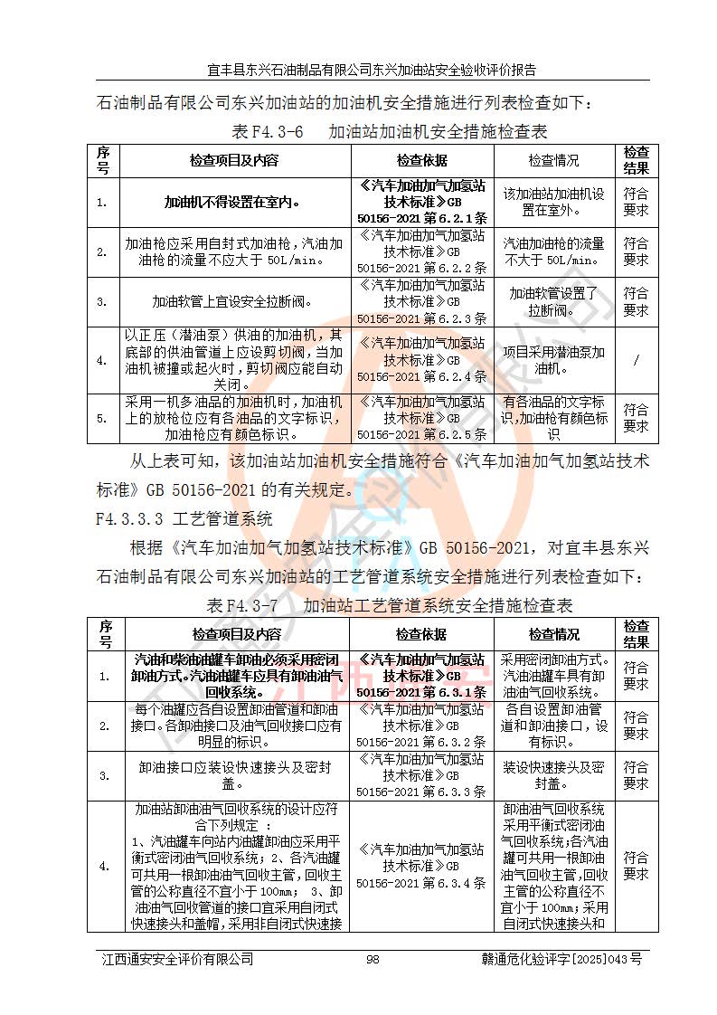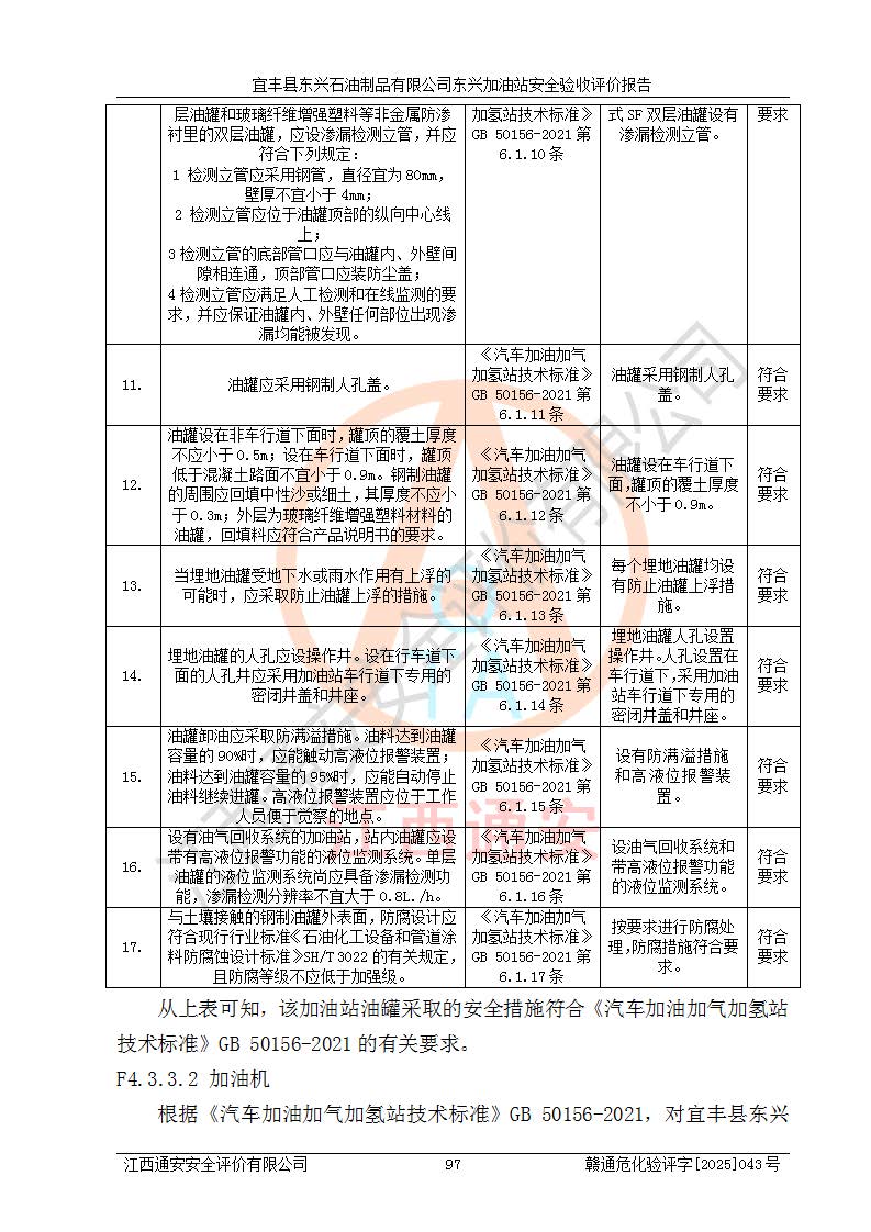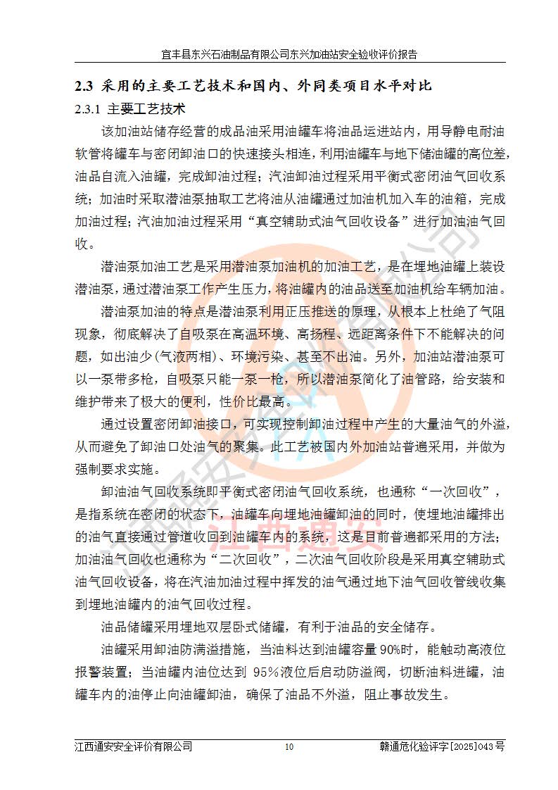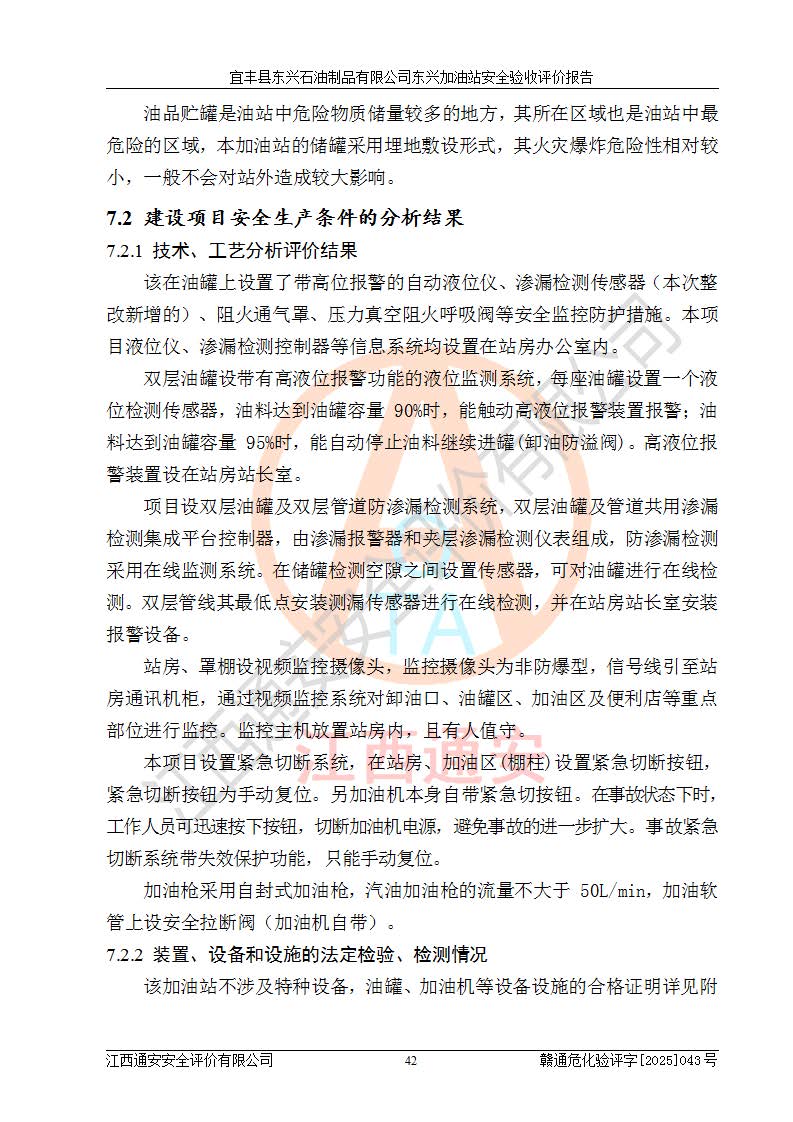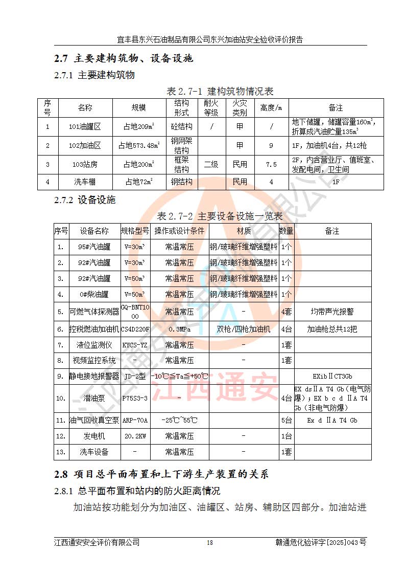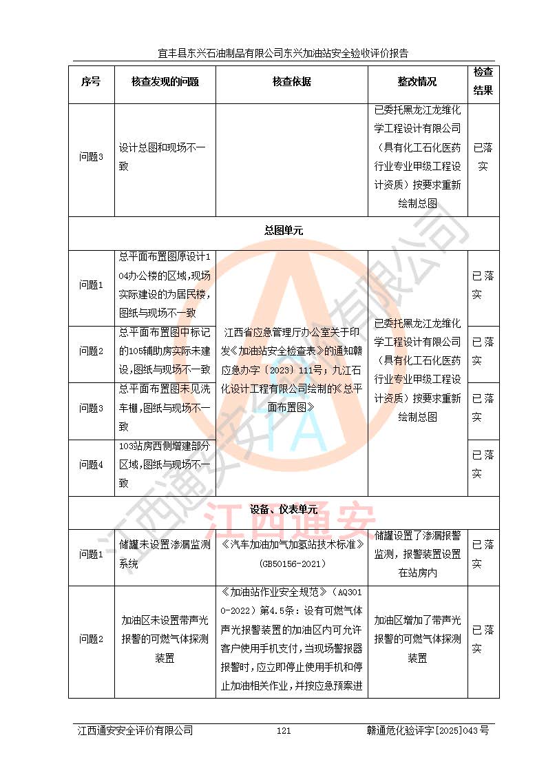 项目简介 | 宜丰县东兴石油制品有限公司东兴加油站(以下简称“该加油站”)成立于2013年10月23日,营业场所位于宜丰县沿山大道以北流源村元形组村民建房点以东,法定**人为张凯军。该加油站统一社会信用代码为91360924MA35HD1D8P,属于有限责任制公司分公司(自然人投资或控股)。经营范围:汽油、柴油、润滑油零售,洗车,烟、预包装食品零售。 该加油站油罐区设有4个埋地卧式储罐,其中1台50m3的0#柴油储罐,1台50m3的92#汽油储罐,1台30m3的92#汽油储罐,1台30m3的95#汽油储罐,柴油罐容积折半计入油罐总容积,折算后总容积为135m3,属于二级加油站,站内设有油气回收系统。油罐采用直埋铺设,并设抗浮基础。加油区设4个加油岛,采用2台四枪加油机,2台双枪加油机。该加油站于2023年2月9日经宜丰县应急管理局核准,换发了新的《危险化学品经营许可证》,证书编号:赣宜安经油字[2022]36092401号,许可范围:汽油、柴油。**期限为2022年9月12日至2025年9月11日。 根据《危险化学品安全管理条例》(经***令第344号发布,***令第591号、***令第645号修改),《危险化学品经营许可证管理办法》(2012年7月17日**安全生产监督管理总局令第55号公布,自2012年9月1日起施行;根据2015年5月27日**安全生产监督管理总局令第79号修正)等法律法规及文件要求,该加油站的危险化学品经营许可证三年**期即将到期,需要重新进行安全现状评价。由于该加油站2013年建成投运,安全设施“三同时”资料不全,根据《江西省应急管理厅办公室关于规范危险化学品经营许可工作的通知》(赣应急办字〔2025〕58号)等要求,危险化学品经营企业应在一个延期换证周期内进行安全设计诊断,并根据诊断结论开展安全设施设计整改,验收通过后方可延期换证。该加油站于2025年6月委托黑龙江龙维化学工程设计有限公司(具有化工石化医药行业专业**工程设计资质)编制了《宜丰县东兴石油制品有限公司东兴加油站安全设计诊断报告》,并通过了专家评审。根据该安全设计诊断报告提出的安全隐患及整改建议,该加油站及时进行了整改,目前已整改到位,具备安全设施验收条件。 | ||||