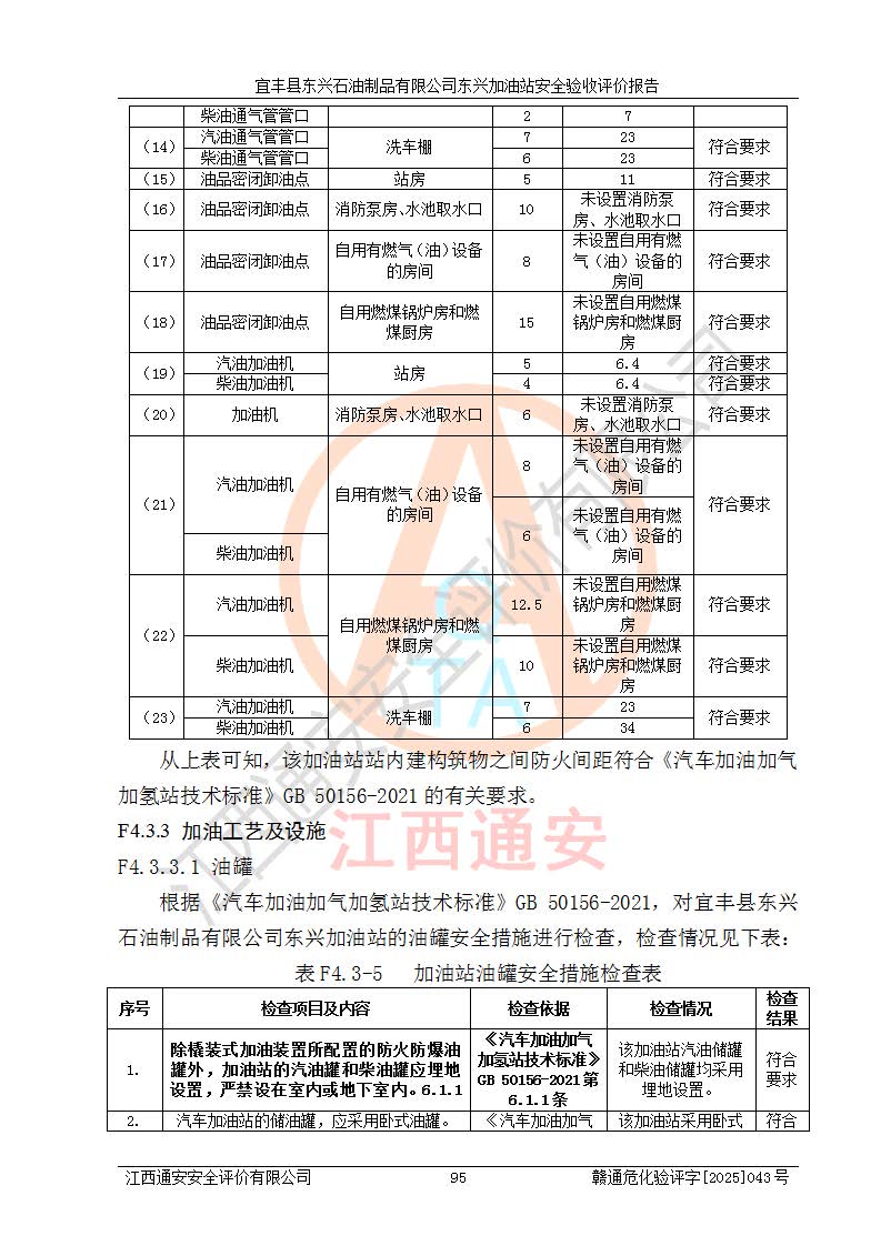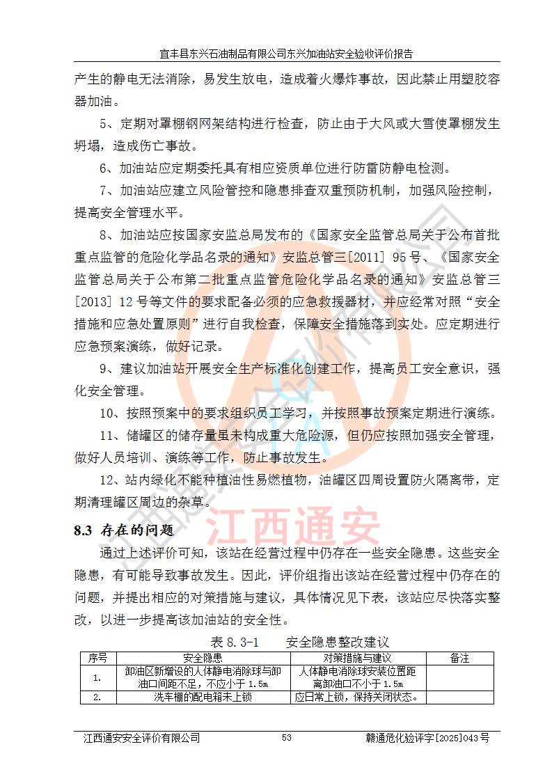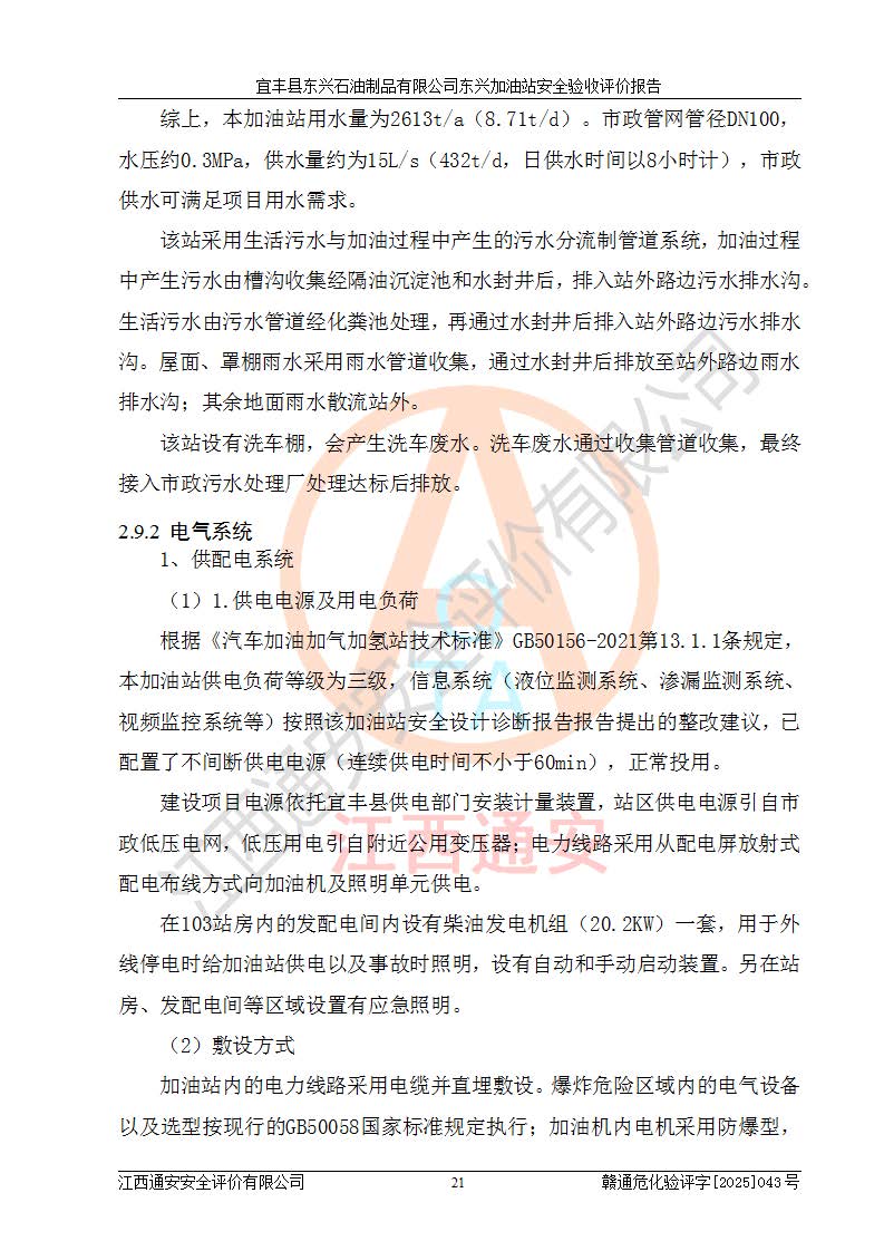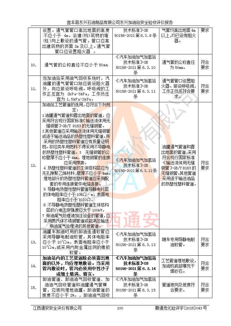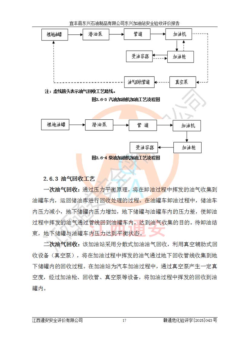 项目简介 | 宜丰县东兴石油制品有限公司东兴加油站(以下简称“该加油站”)成立于2013年10月23日,营业场所位于宜丰县沿山大道以北流源村元形组村民建房点以东,法定**人为张凯军。该加油站统一社会信用代码为91360924MA35HD1D8P,属于有限责任制公司分公司(自然人投资或控股)。经营范围:汽油、柴油、润滑油零售,洗车,烟、预包装食品零售。 该加油站油罐区设有4个埋地卧式储罐,其中1台50m3的0#柴油储罐,1台50m3的92#汽油储罐,1台30m3的92#汽油储罐,1台30m3的95#汽油储罐,柴油罐容积折半计入油罐总容积,折算后总容积为135m3,属于二级加油站,站内设有油气回收系统。油罐采用直埋铺设,并设抗浮基础。加油区设4个加油岛,采用2台四枪加油机,2台双枪加油机。该加油站于2023年2月9日经宜丰县应急管理局核准,换发了新的《危险化学品经营许可证》,证书编号:赣宜安经油字[2022]36092401号,许可范围:汽油、柴油。**期限为2022年9月12日至2025年9月11日。 根据《危险化学品安全管理条例》(经***令第344号发布,***令第591号、***令第645号修改),《危险化学品经营许可证管理办法》(2012年7月17日**安全生产监督管理总局令第55号公布,自2012年9月1日起施行;根据2015年5月27日**安全生产监督管理总局令第79号修正)等法律法规及文件要求,该加油站的危险化学品经营许可证三年**期即将到期,需要重新进行安全现状评价。由于该加油站2013年建成投运,安全设施“三同时”资料不全,根据《江西省应急管理厅办公室关于规范危险化学品经营许可工作的通知》(赣应急办字〔2025〕58号)等要求,危险化学品经营企业应在一个延期换证周期内进行安全设计诊断,并根据诊断结论开展安全设施设计整改,验收通过后方可延期换证。该加油站于2025年6月委托黑龙江龙维化学工程设计有限公司(具有化工石化医药行业专业**工程设计资质)编制了《宜丰县东兴石油制品有限公司东兴加油站安全设计诊断报告》,并通过了专家评审。根据该安全设计诊断报告提出的安全隐患及整改建议,该加油站及时进行了整改,目前已整改到位,具备安全设施验收条件。 | ||||