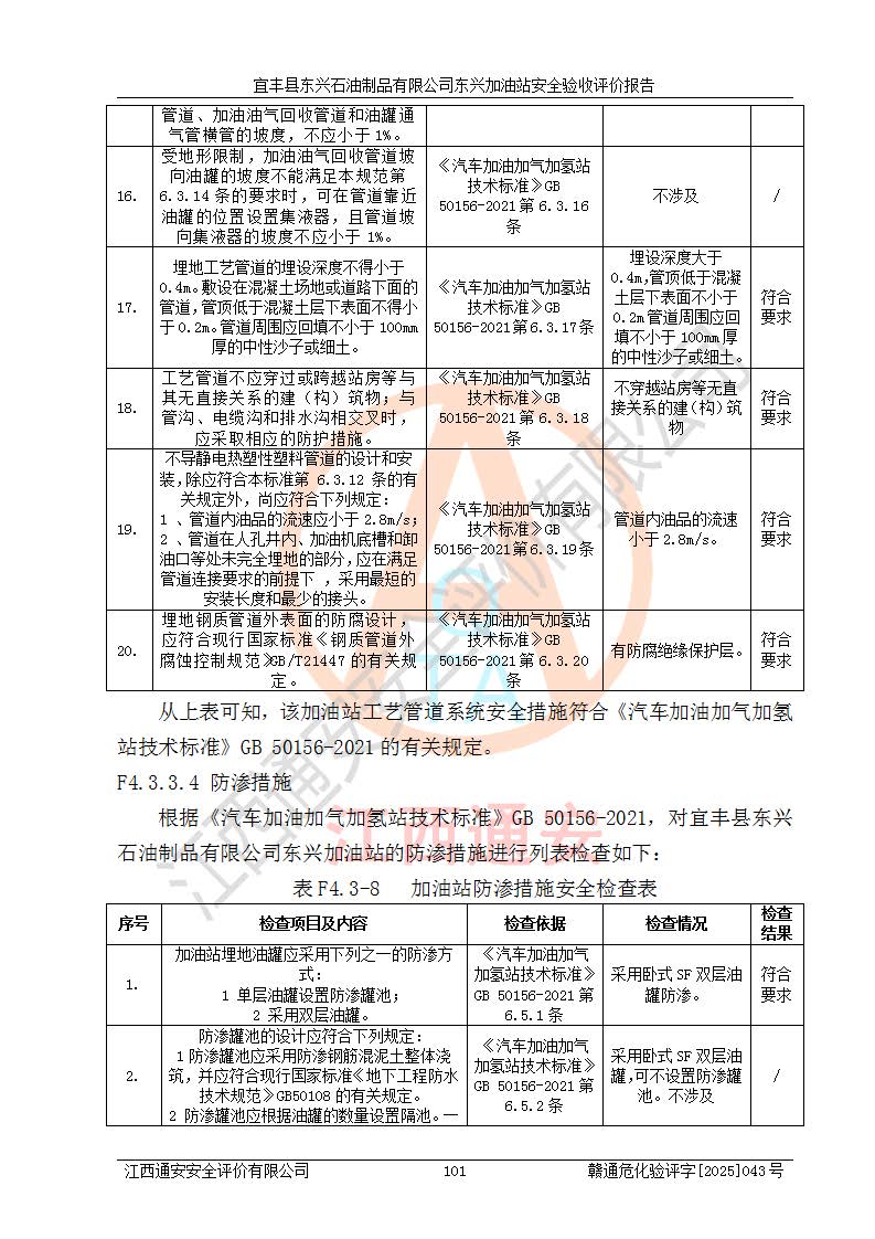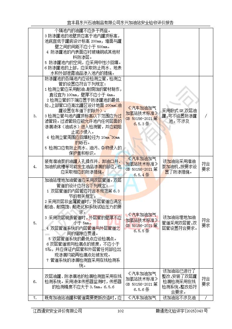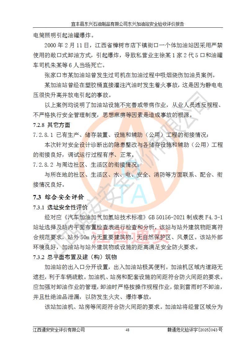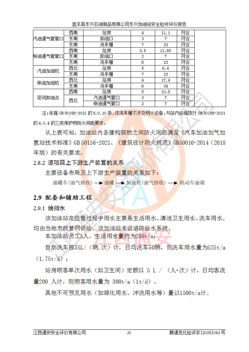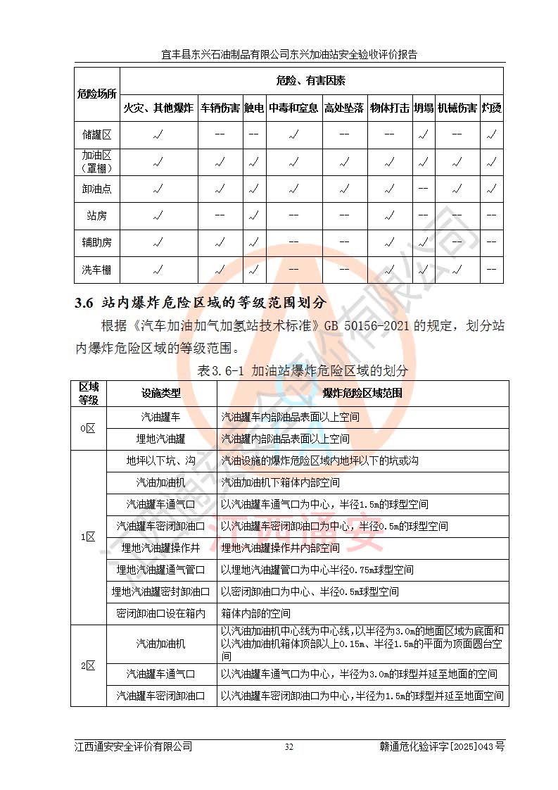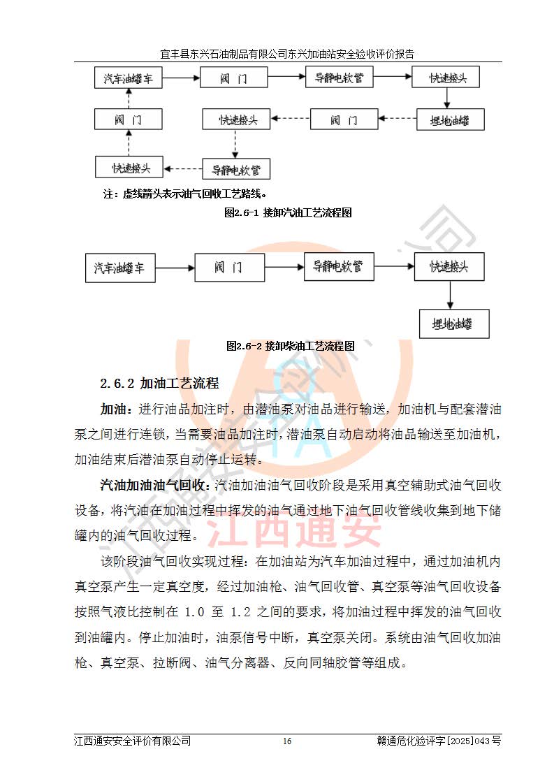 项目简介 | 宜丰县东兴石油制品有限公司东兴加油站(以下简称“该加油站”)成立于2013年10月23日,营业场所位于宜丰县沿山大道以北流源村元形组村民建房点以东,法定**人为张凯军。该加油站统一社会信用代码为91360924MA35HD1D8P,属于有限责任制公司分公司(自然人投资或控股)。经营范围:汽油、柴油、润滑油零售,洗车,烟、预包装食品零售。 该加油站油罐区设有4个埋地卧式储罐,其中1台50m3的0#柴油储罐,1台50m3的92#汽油储罐,1台30m3的92#汽油储罐,1台30m3的95#汽油储罐,柴油罐容积折半计入油罐总容积,折算后总容积为135m3,属于二级加油站,站内设有油气回收系统。油罐采用直埋铺设,并设抗浮基础。加油区设4个加油岛,采用2台四枪加油机,2台双枪加油机。该加油站于2023年2月9日经宜丰县应急管理局核准,换发了新的《危险化学品经营许可证》,证书编号:赣宜安经油字[2022]36092401号,许可范围:汽油、柴油。**期限为2022年9月12日至2025年9月11日。 根据《危险化学品安全管理条例》(经***令第344号发布,***令第591号、***令第645号修改),《危险化学品经营许可证管理办法》(2012年7月17日**安全生产监督管理总局令第55号公布,自2012年9月1日起施行;根据2015年5月27日**安全生产监督管理总局令第79号修正)等法律法规及文件要求,该加油站的危险化学品经营许可证三年**期即将到期,需要重新进行安全现状评价。由于该加油站2013年建成投运,安全设施“三同时”资料不全,根据《江西省应急管理厅办公室关于规范危险化学品经营许可工作的通知》(赣应急办字〔2025〕58号)等要求,危险化学品经营企业应在一个延期换证周期内进行安全设计诊断,并根据诊断结论开展安全设施设计整改,验收通过后方可延期换证。该加油站于2025年6月委托黑龙江龙维化学工程设计有限公司(具有化工石化医药行业专业**工程设计资质)编制了《宜丰县东兴石油制品有限公司东兴加油站安全设计诊断报告》,并通过了专家评审。根据该安全设计诊断报告提出的安全隐患及整改建议,该加油站及时进行了整改,目前已整改到位,具备安全设施验收条件。 | ||||