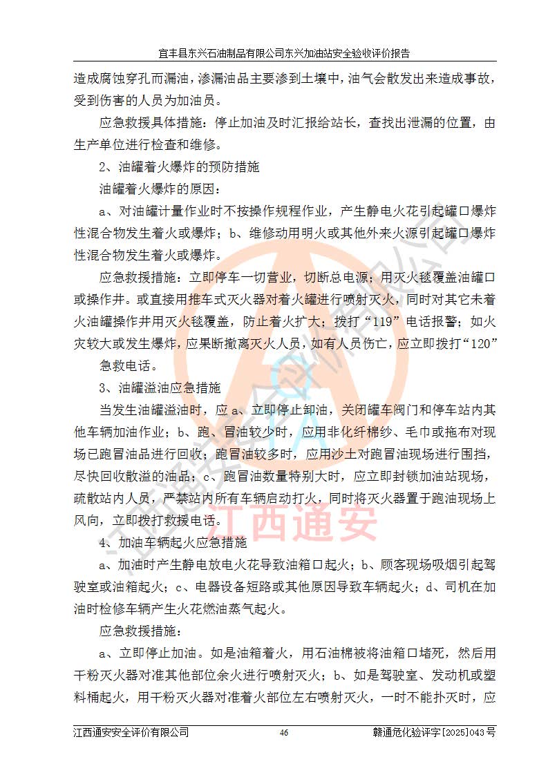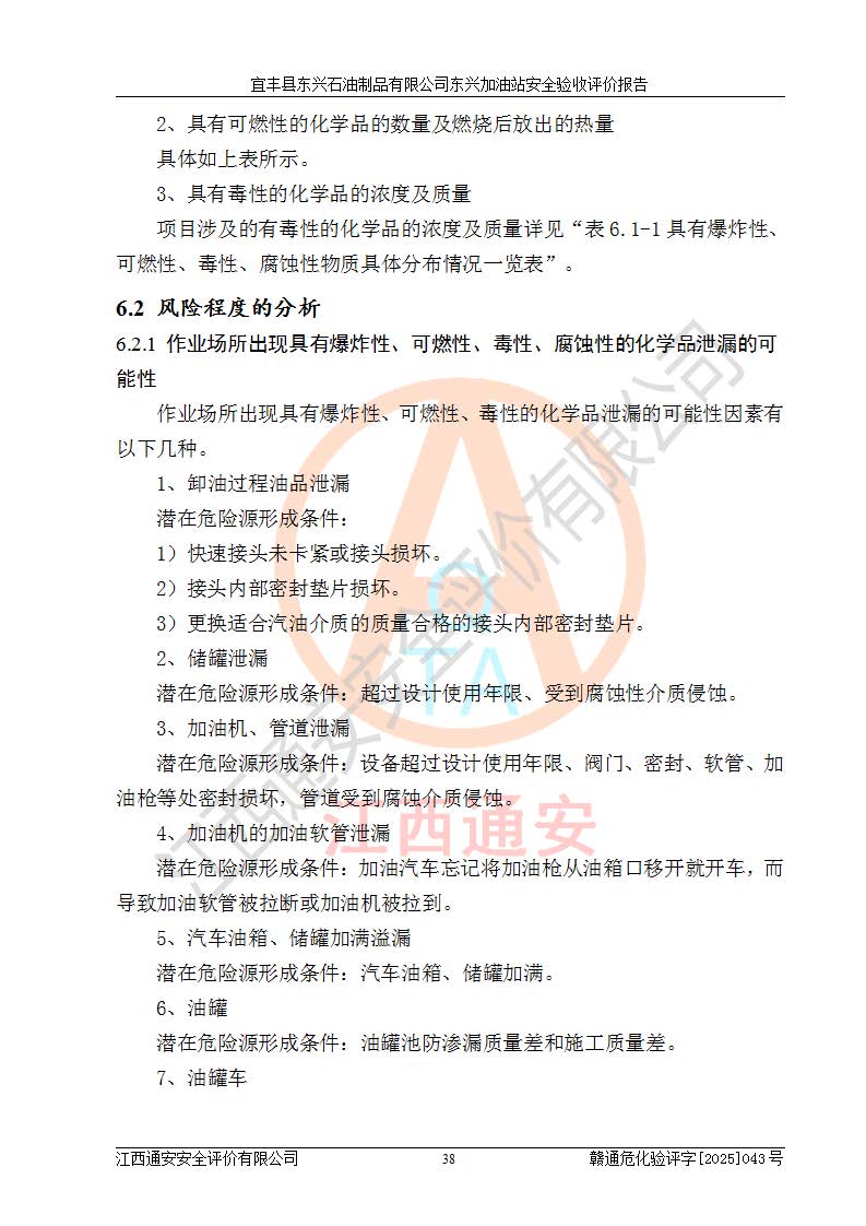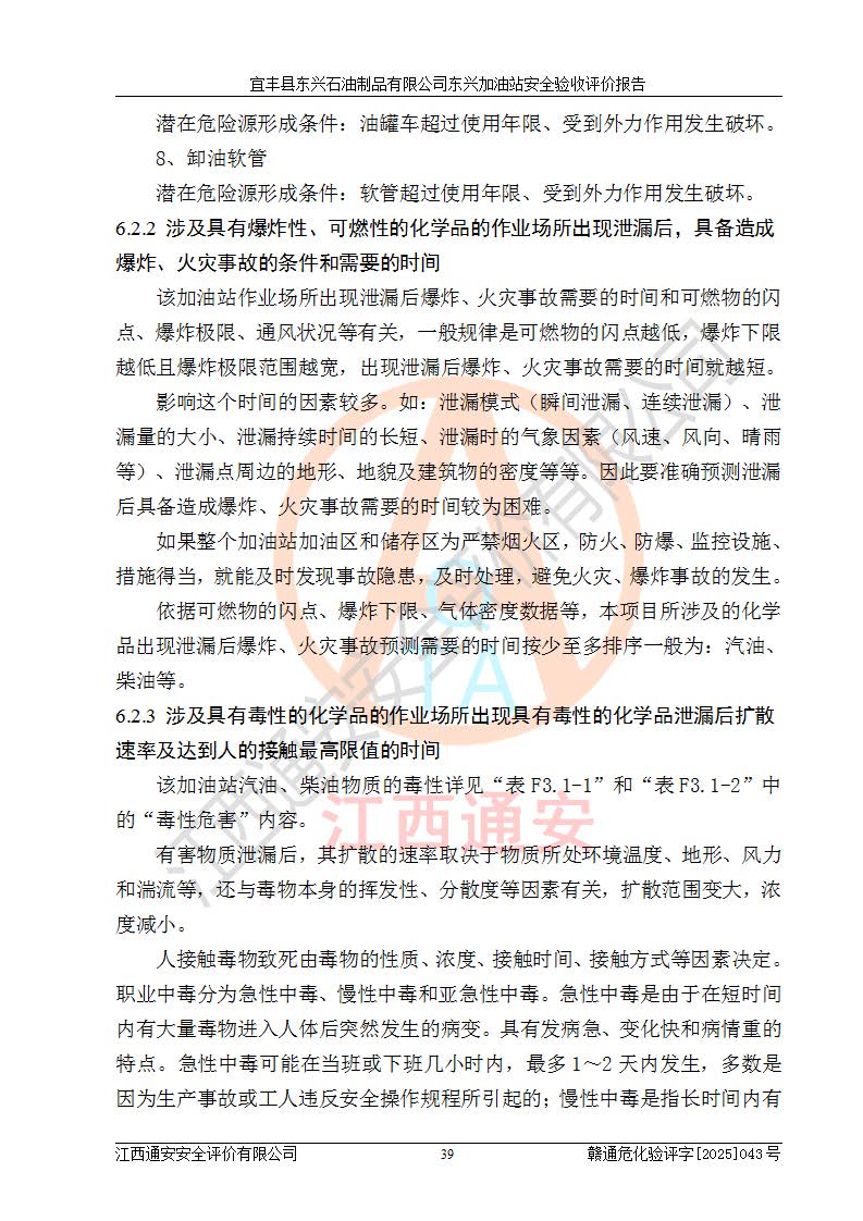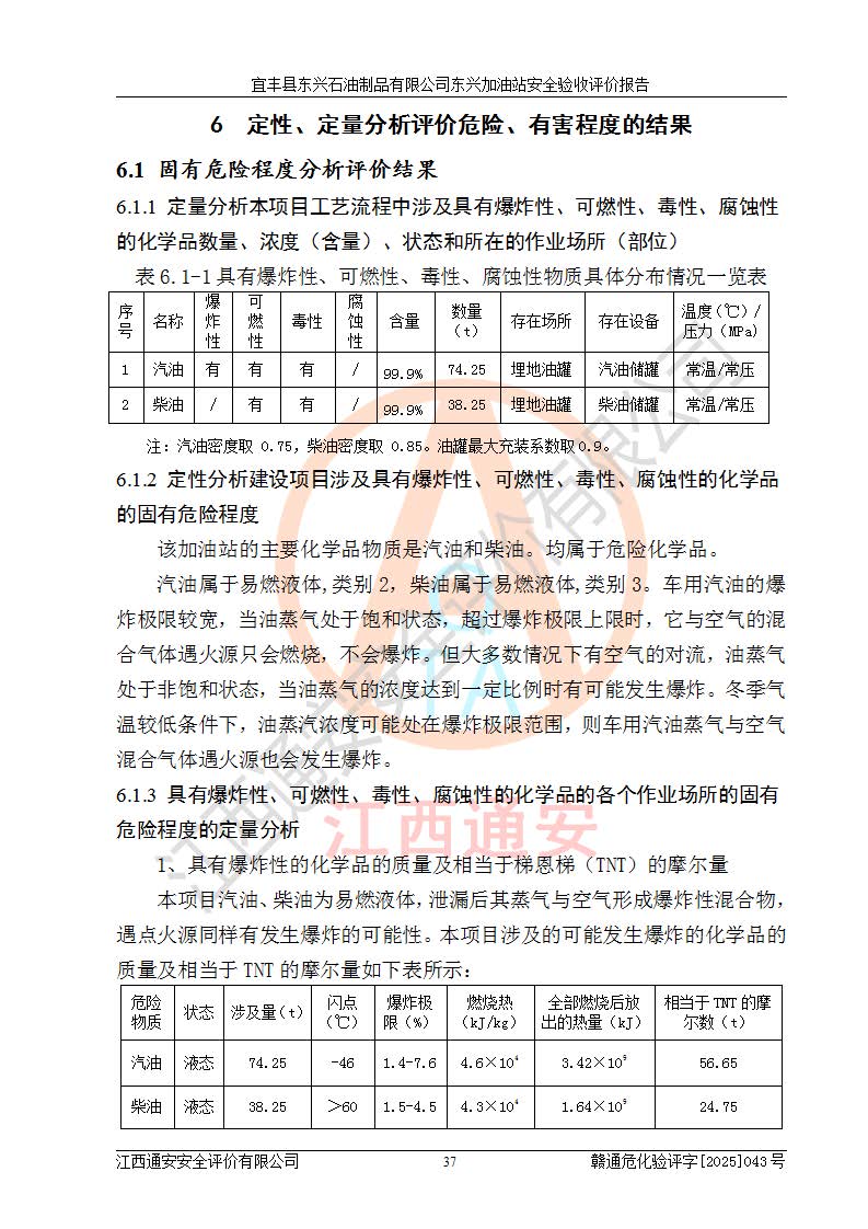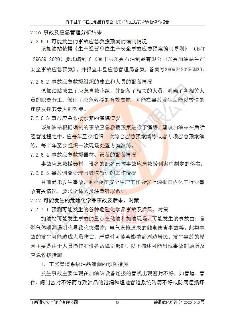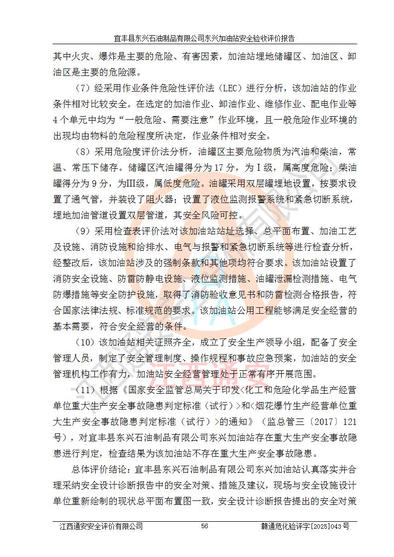 其它 | 一、安全状况综合评述 宜丰县东兴石油制品有限公司东兴加油站位于宜丰县沿山大道以北流源村元形组村民建房点以东,从事成品油(汽油、柴油)零售业务,属二级加油站。 通过对该加油站建设项目安全验收评价,得出以下评价结论: (1)化学品、设备及工艺辨识结果 经辨识,该加油站经营、储存危险化学品为汽油和柴油,其中汽油属于重点监管危险化学品、特别管控危险化学品;该加油站不涉及剧毒化学品、高毒物品、易制毒化学品、监控化学品、易制爆化学品。经营、储存过程中采用的设备及工艺不属于淘汰落后设备及工艺、不涉及危险化工工艺,生产和储存单元均不构成危险化学品重大危险源。 (2)建设项目所在地的安全条件和周边的安全间距 该站东南侧为沿山大道和架空电力线,西南侧和西北侧为居民建筑,北侧为丁类厂房。加油站为二级加油站,设有油气回收系统,站外50米范围内无重要公共建筑物、明火设备和甲、乙类生产及储存设施,站区内加油设施与周边建构筑物之间的距离能够满足《汽车加油加气加氢站技术标准》GB50156-2021 和《建筑设计防火规范》GB50016-2014(2018 年版)以及相关**规范要求。本报告认为该加油站建设项目周边对加油站的影响以及建设项目所在地的自然条件对建设项目投入使用后的影响均较小,该加油站具备标准规范所要求的安全条件。 (3)该项目安全设计诊断报告的采纳情况 该加油站安全设计诊断报告核查的问题(共17项)及整改建议均已采纳,经评价组现场复核,均已整改完成。该加油站整改过程工作进展顺利,处于正常状态。经查阅资料和分析评价,认为本项目技术、工艺和装置、设备(设施)的安全、可靠性和安全水平符合**相应安全标准的要求。 (4)该加油站储存经营的汽油属于重点监管的危险化学品和特别控危险化学品,该加油站在后续的经营中应按照相关规范和要求加强安全管理,要求油品运输单位强化运输管理、自身加强储存定制化管理。 (5)该加油站经营过程中存在的危险有害因素为:①火灾、爆炸;② 中毒和窒息;③**伤害;④触电;⑤高处坠落;⑥物体打击、⑦其他伤害。 其中火灾、爆炸是主要的危险、有害因素,加油站埋地储罐区、加油区、卸 油区是主要的危险源。 (7)经采用作业条件危险性评价法(LEC)进行分析,该加油站的作业条件相对比较安全。在选定的加油作业、卸油作业、维修作业、配电作业等4个单元中均为“一般危险、需要注意”作业环境,且一般危险作业环境的出现均由物料的危险程度所决定,作业条件相对安全。 (8)采用危险度评价法分析,油罐区主要危险物质为汽油和柴油,常温、常压下储存。储罐区汽油罐为Ⅰ级,属高度危险;柴油罐得分为Ⅲ级,属低度危险。油罐采用双层罐埋地设置,按要求设置了通气管,并装设了阻火器;设置了液位监测报警系统和紧急切断系统,埋地加油管道设置双层管道,其安全风险可控。 (9)采用检查表评价法对该加油站站址选择、总平面布置、加油工艺及设施、消防设施和给排水、电气与报警和紧急切断系统等进行检查分析,经整改后,该加油站涉及的强制条款和其他项均符合要求。该加油站设置了消防安全设施、防雷防静电设施、液位监测措施、油罐泄漏检测措施、电气防爆措施等安全防护设施,取得了消防验收意见书和防雷检测合格报告,符合**法律法规、标准规范的要求。该加油站公用工程能够满足安全经营的基本需要,符合安全经营的条件。 (10)该加油站相关证照齐全,成立了安全生产**小组,配备了安全管理人员,制定了安全管理制度、操作规程和事故应急预案,加油站的安全管理机构工作有力,加油站安全经营管理处于正常有序开展范围。 (11)对宜丰县东兴石油制品有限公司东兴加油站存在重大生产安全事故隐患进行判定,检查结果为该加油站不存在重大生产安全事故隐患。 总体评价结论:宜丰县东兴石油制品有限公司东兴加油站认真落实并合理采纳安全设计诊断报告中的安全对策、措施及建议,现场与安全设施设计单位重新绘制的现状总平面布置图一致,安全设计诊断报告提出的安全对策措施已落实到位。对潜在的危险、 有害因素采取了安全对策措施,工程潜在的危险、有害因素可得到**控制, 风险在**控制和可接受范围内。 | ||||