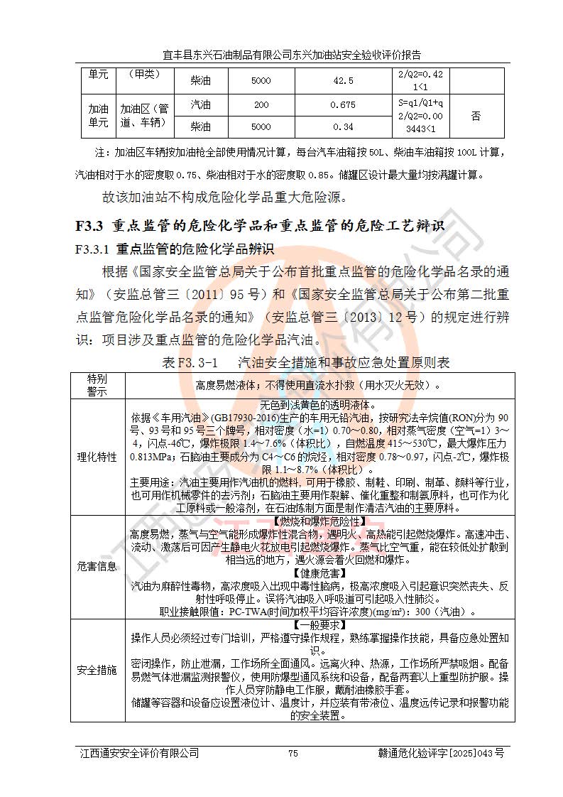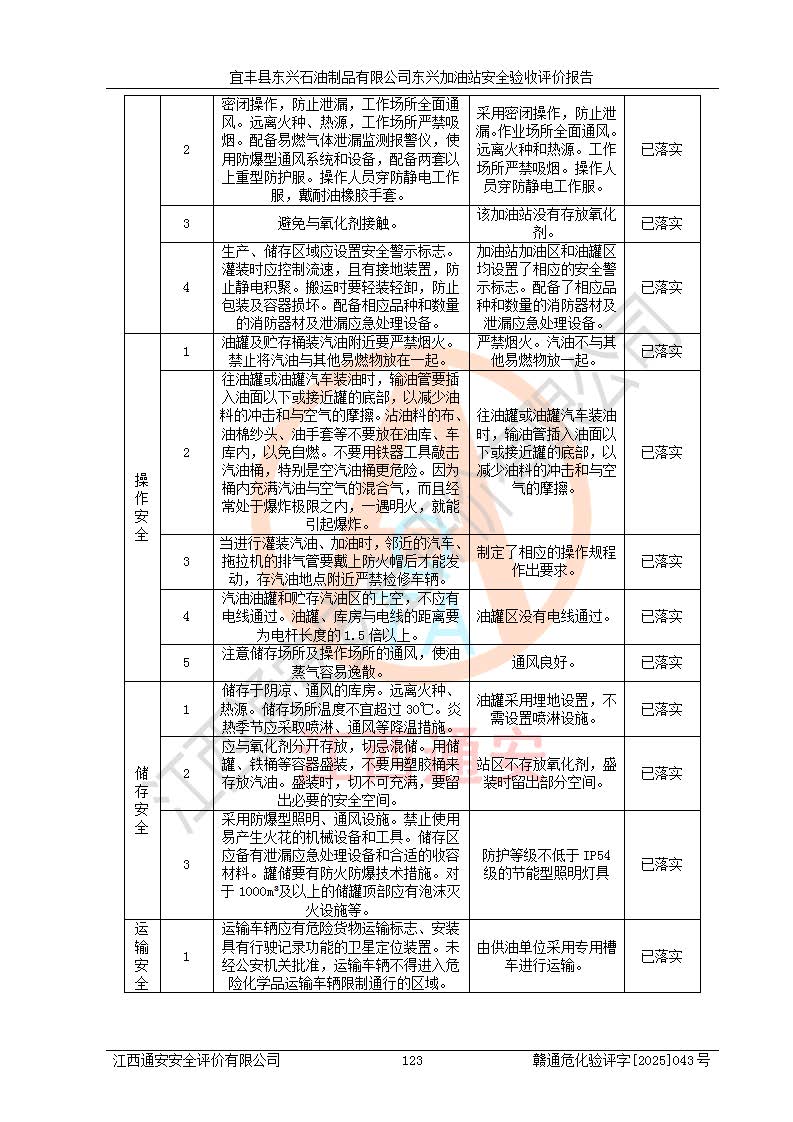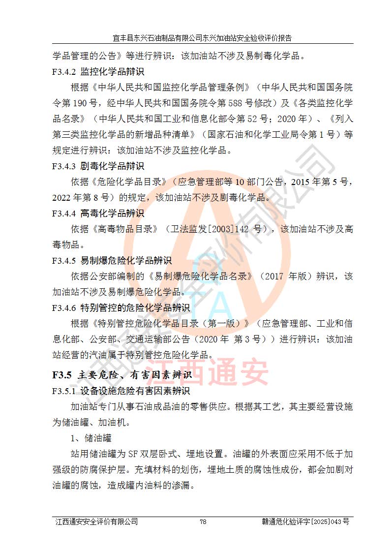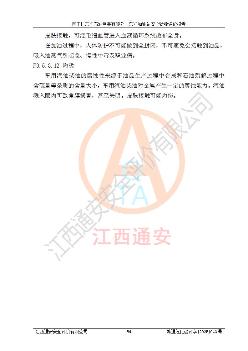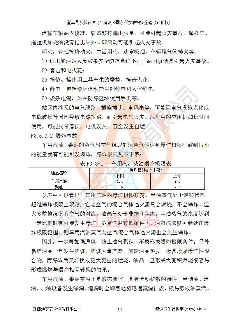 其它 | 一、安全状况综合评述 宜丰县东兴石油制品有限公司东兴加油站位于宜丰县沿山大道以北流源村元形组村民建房点以东,从事成品油(汽油、柴油)零售业务,属二级加油站。 通过对该加油站建设项目安全验收评价,得出以下评价结论: (1)化学品、设备及工艺辨识结果 经辨识,该加油站经营、储存危险化学品为汽油和柴油,其中汽油属于重点监管危险化学品、特别管控危险化学品;该加油站不涉及剧毒化学品、高毒物品、易制毒化学品、监控化学品、易制爆化学品。经营、储存过程中采用的设备及工艺不属于淘汰落后设备及工艺、不涉及危险化工工艺,生产和储存单元均不构成危险化学品重大危险源。 (2)建设项目所在地的安全条件和周边的安全间距 该站东南侧为沿山大道和架空电力线,西南侧和西北侧为居民建筑,北侧为丁类厂房。加油站为二级加油站,设有油气回收系统,站外50米范围内无重要公共建筑物、明火设备和甲、乙类生产及储存设施,站区内加油设施与周边建构筑物之间的距离能够满足《汽车加油加气加氢站技术标准》GB50156-2021 和《建筑设计防火规范》GB50016-2014(2018 年版)以及相关**规范要求。本报告认为该加油站建设项目周边对加油站的影响以及建设项目所在地的自然条件对建设项目投入使用后的影响均较小,该加油站具备标准规范所要求的安全条件。 (3)该项目安全设计诊断报告的采纳情况 该加油站安全设计诊断报告核查的问题(共17项)及整改建议均已采纳,经评价组现场复核,均已整改完成。该加油站整改过程工作进展顺利,处于正常状态。经查阅资料和分析评价,认为本项目技术、工艺和装置、设备(设施)的安全、可靠性和安全水平符合**相应安全标准的要求。 (4)该加油站储存经营的汽油属于重点监管的危险化学品和特别控危险化学品,该加油站在后续的经营中应按照相关规范和要求加强安全管理,要求油品运输单位强化运输管理、自身加强储存定制化管理。 (5)该加油站经营过程中存在的危险有害因素为:①火灾、爆炸;② 中毒和窒息;③**伤害;④触电;⑤高处坠落;⑥物体打击、⑦其他伤害。 其中火灾、爆炸是主要的危险、有害因素,加油站埋地储罐区、加油区、卸 油区是主要的危险源。 (7)经采用作业条件危险性评价法(LEC)进行分析,该加油站的作业条件相对比较安全。在选定的加油作业、卸油作业、维修作业、配电作业等4个单元中均为“一般危险、需要注意”作业环境,且一般危险作业环境的出现均由物料的危险程度所决定,作业条件相对安全。 (8)采用危险度评价法分析,油罐区主要危险物质为汽油和柴油,常温、常压下储存。储罐区汽油罐为Ⅰ级,属高度危险;柴油罐得分为Ⅲ级,属低度危险。油罐采用双层罐埋地设置,按要求设置了通气管,并装设了阻火器;设置了液位监测报警系统和紧急切断系统,埋地加油管道设置双层管道,其安全风险可控。 (9)采用检查表评价法对该加油站站址选择、总平面布置、加油工艺及设施、消防设施和给排水、电气与报警和紧急切断系统等进行检查分析,经整改后,该加油站涉及的强制条款和其他项均符合要求。该加油站设置了消防安全设施、防雷防静电设施、液位监测措施、油罐泄漏检测措施、电气防爆措施等安全防护设施,取得了消防验收意见书和防雷检测合格报告,符合**法律法规、标准规范的要求。该加油站公用工程能够满足安全经营的基本需要,符合安全经营的条件。 (10)该加油站相关证照齐全,成立了安全生产**小组,配备了安全管理人员,制定了安全管理制度、操作规程和事故应急预案,加油站的安全管理机构工作有力,加油站安全经营管理处于正常有序开展范围。 (11)对宜丰县东兴石油制品有限公司东兴加油站存在重大生产安全事故隐患进行判定,检查结果为该加油站不存在重大生产安全事故隐患。 总体评价结论:宜丰县东兴石油制品有限公司东兴加油站认真落实并合理采纳安全设计诊断报告中的安全对策、措施及建议,现场与安全设施设计单位重新绘制的现状总平面布置图一致,安全设计诊断报告提出的安全对策措施已落实到位。对潜在的危险、 有害因素采取了安全对策措施,工程潜在的危险、有害因素可得到**控制, 风险在**控制和可接受范围内。 | ||||